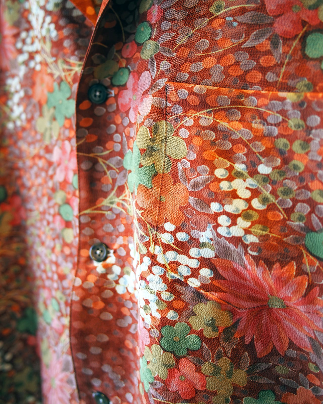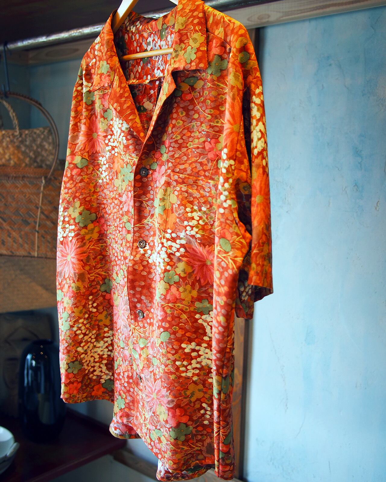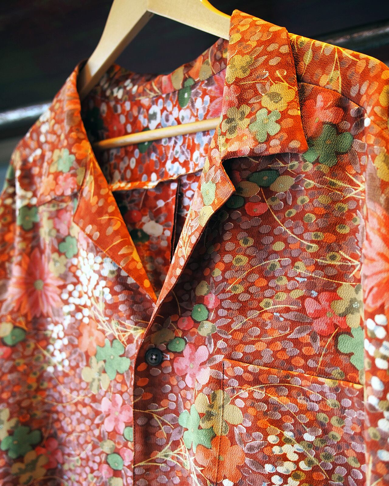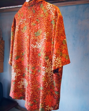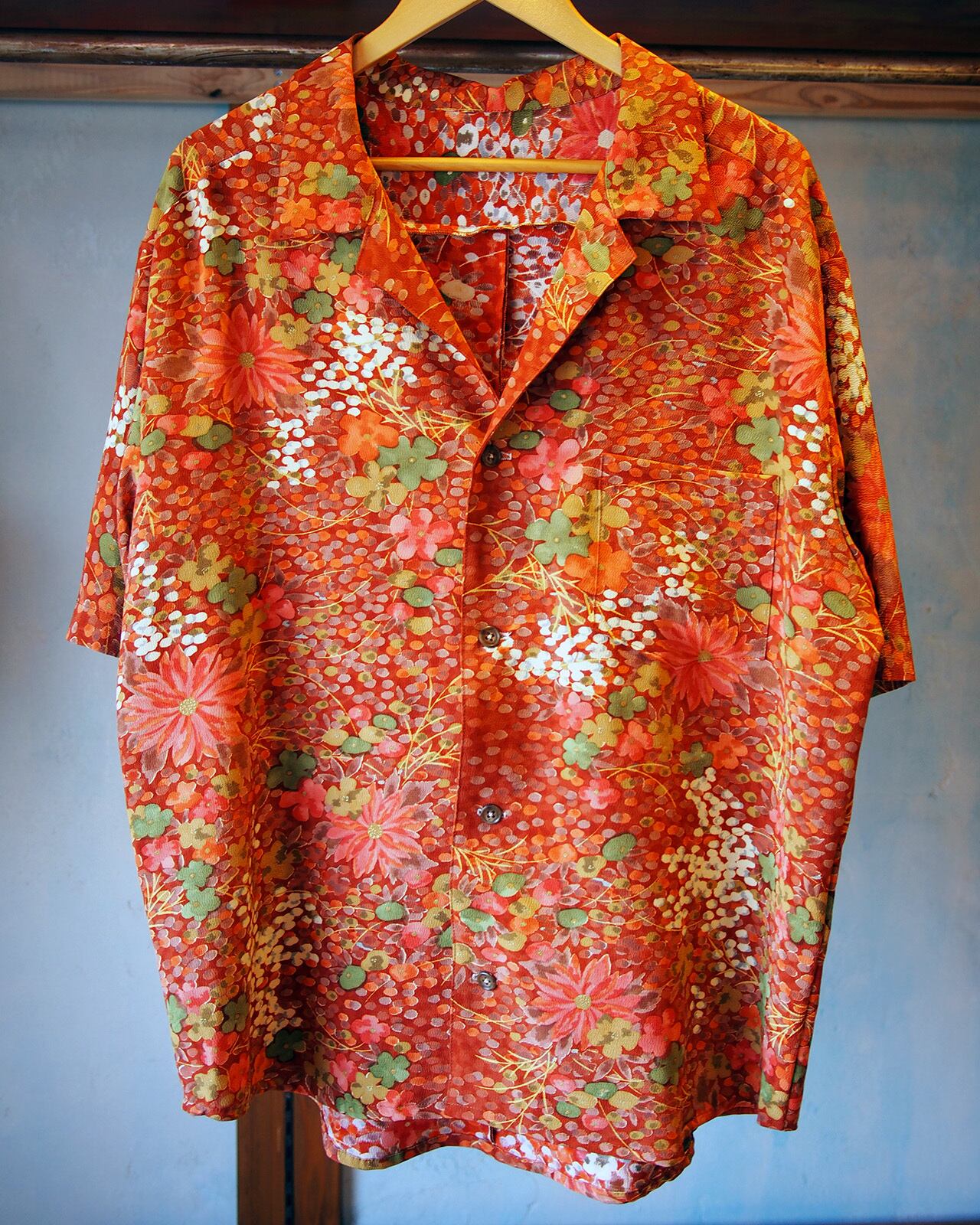 『小紋』のオレンジ色と華やかな花模様が目を引くお着物を選定したアロハシャツ