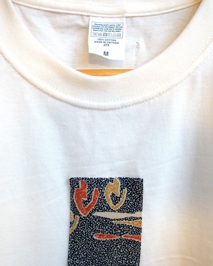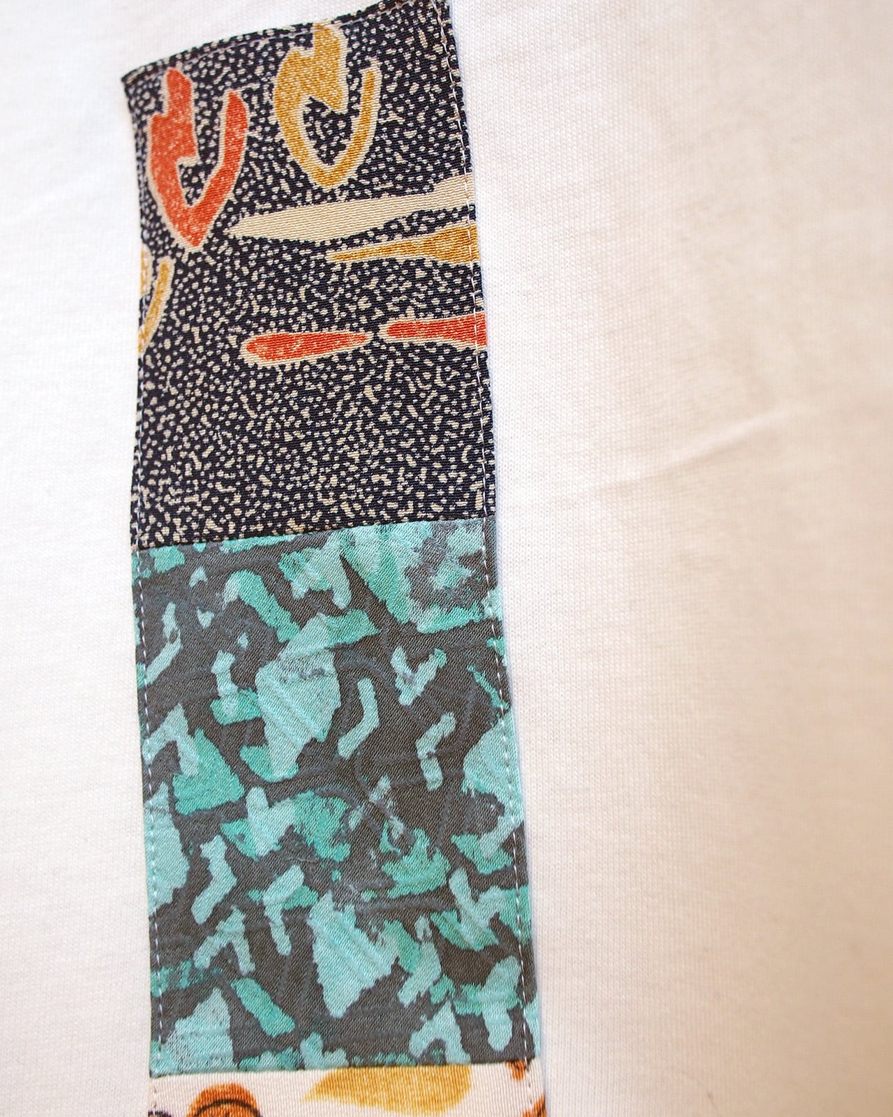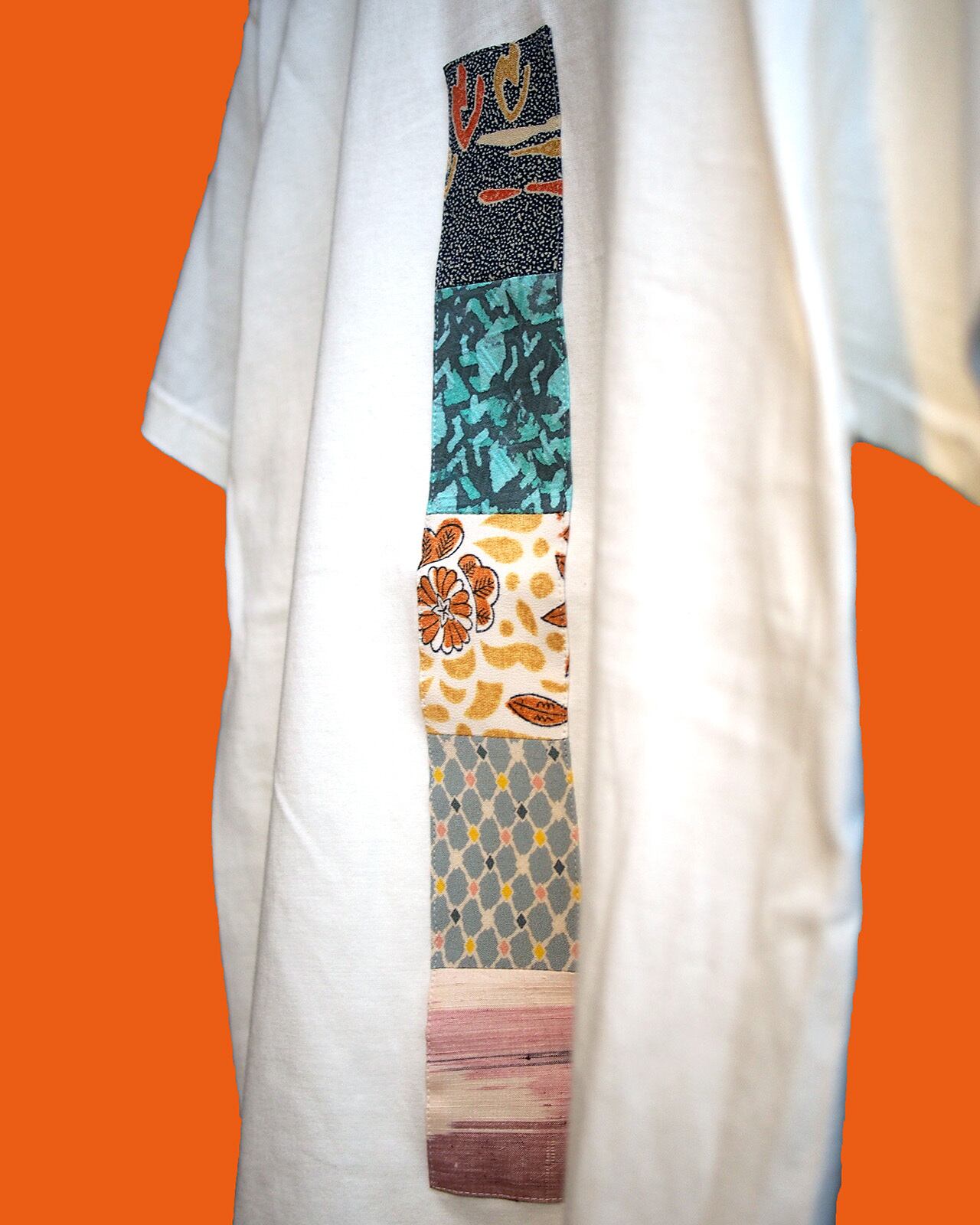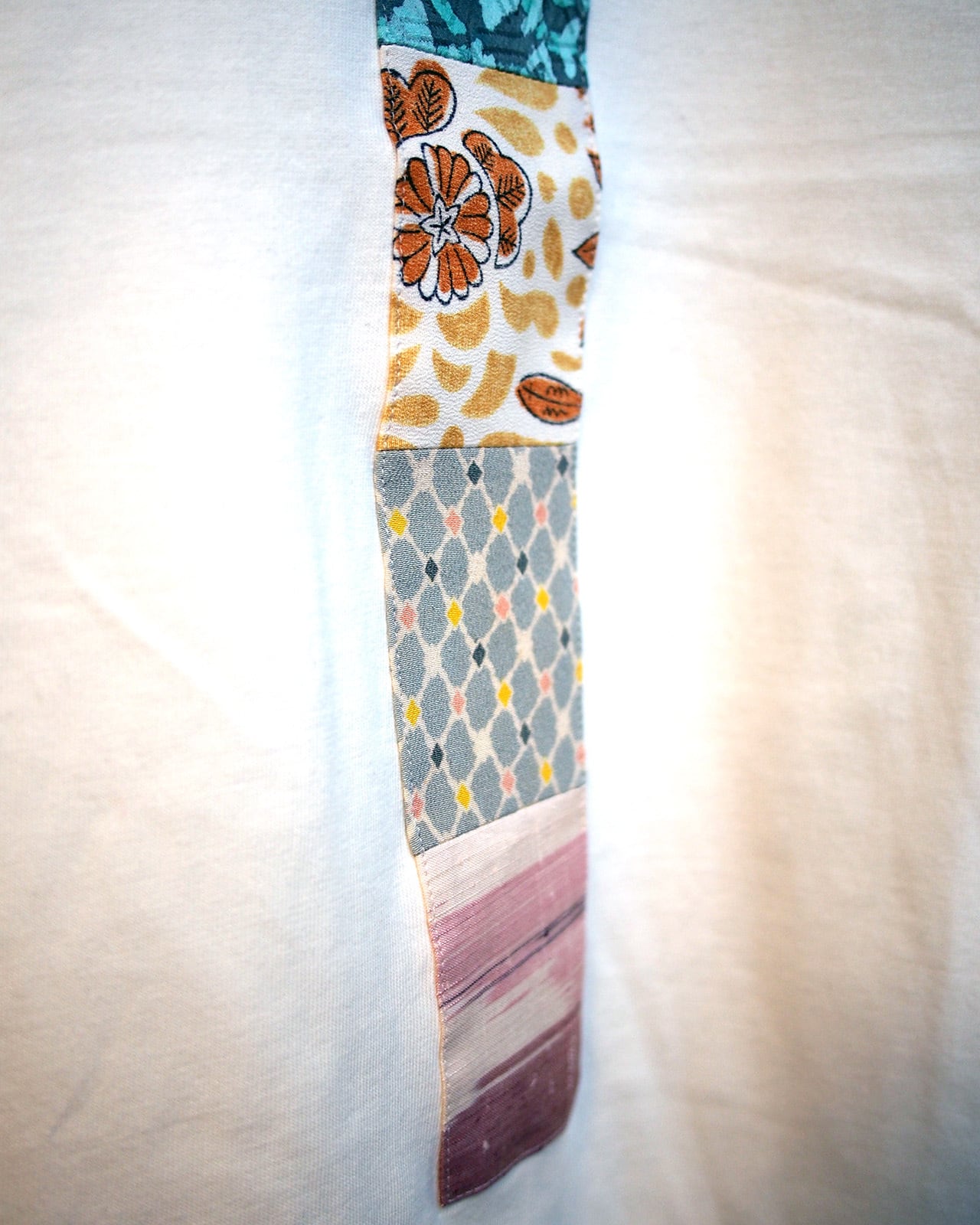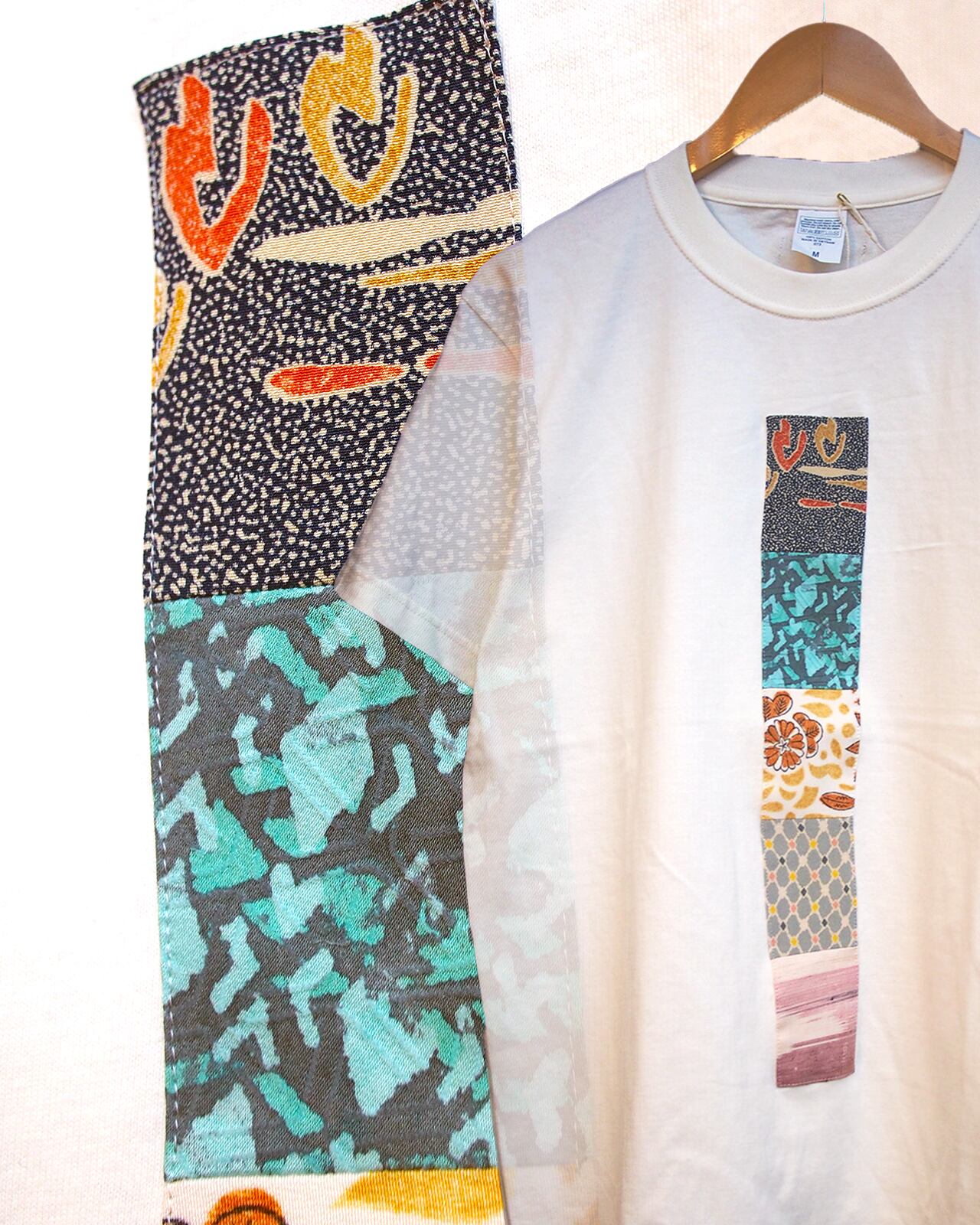 着物生地を贅沢に使用し、パッチワークで構成した印象的な一点ものTシャツです。