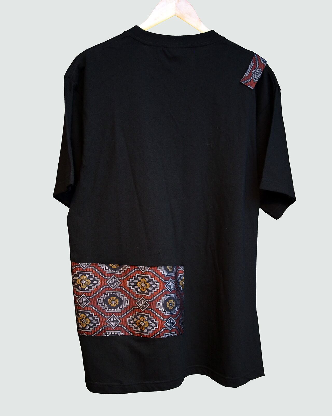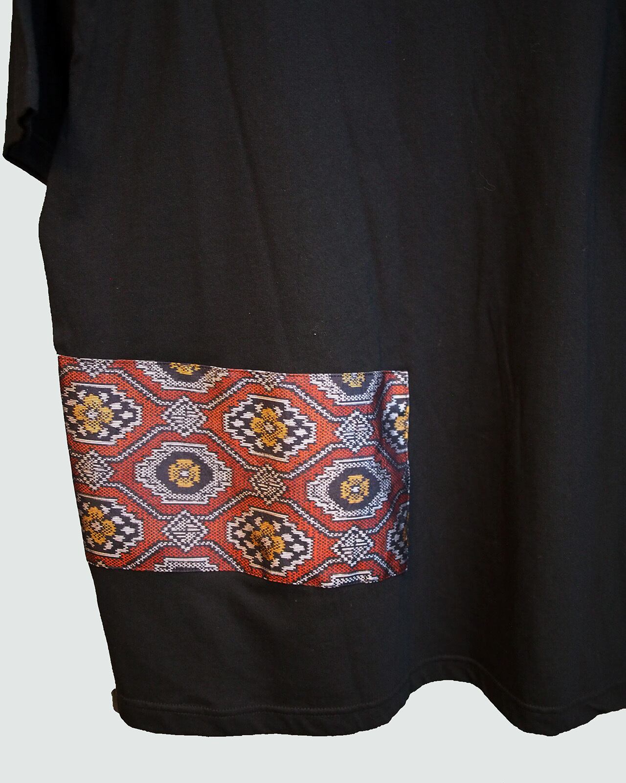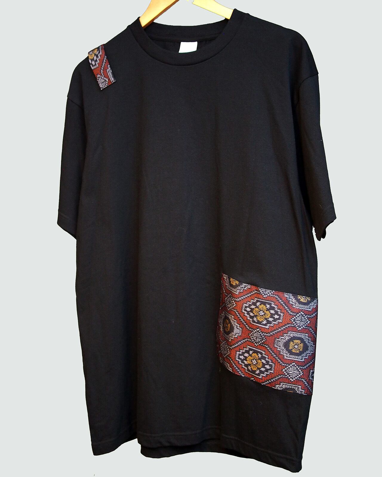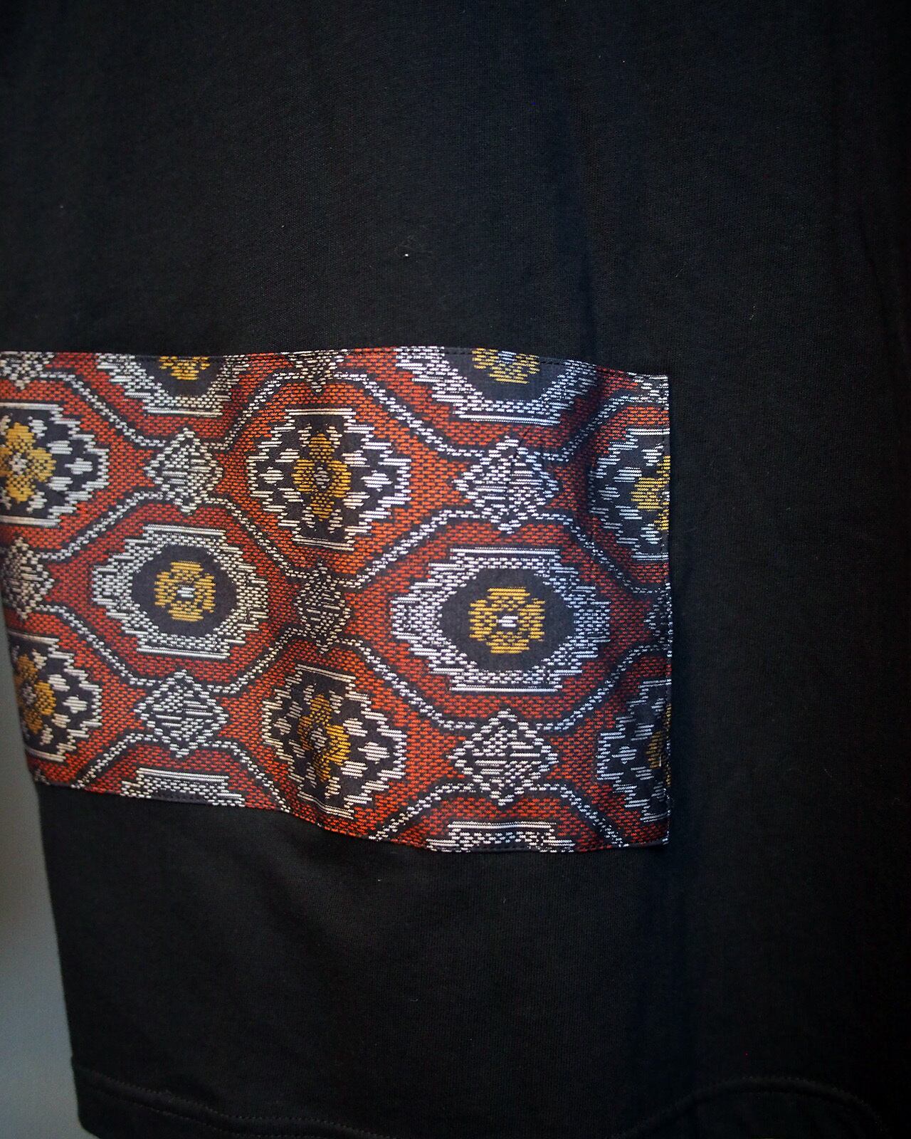 大島紬を贅沢に使用し構成した印象的な一点ものデザインTシャツです。