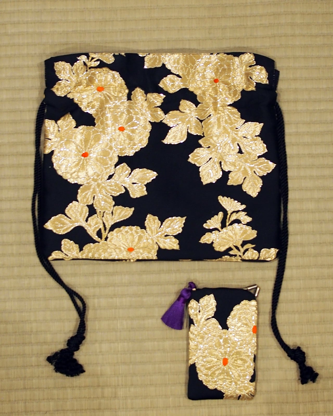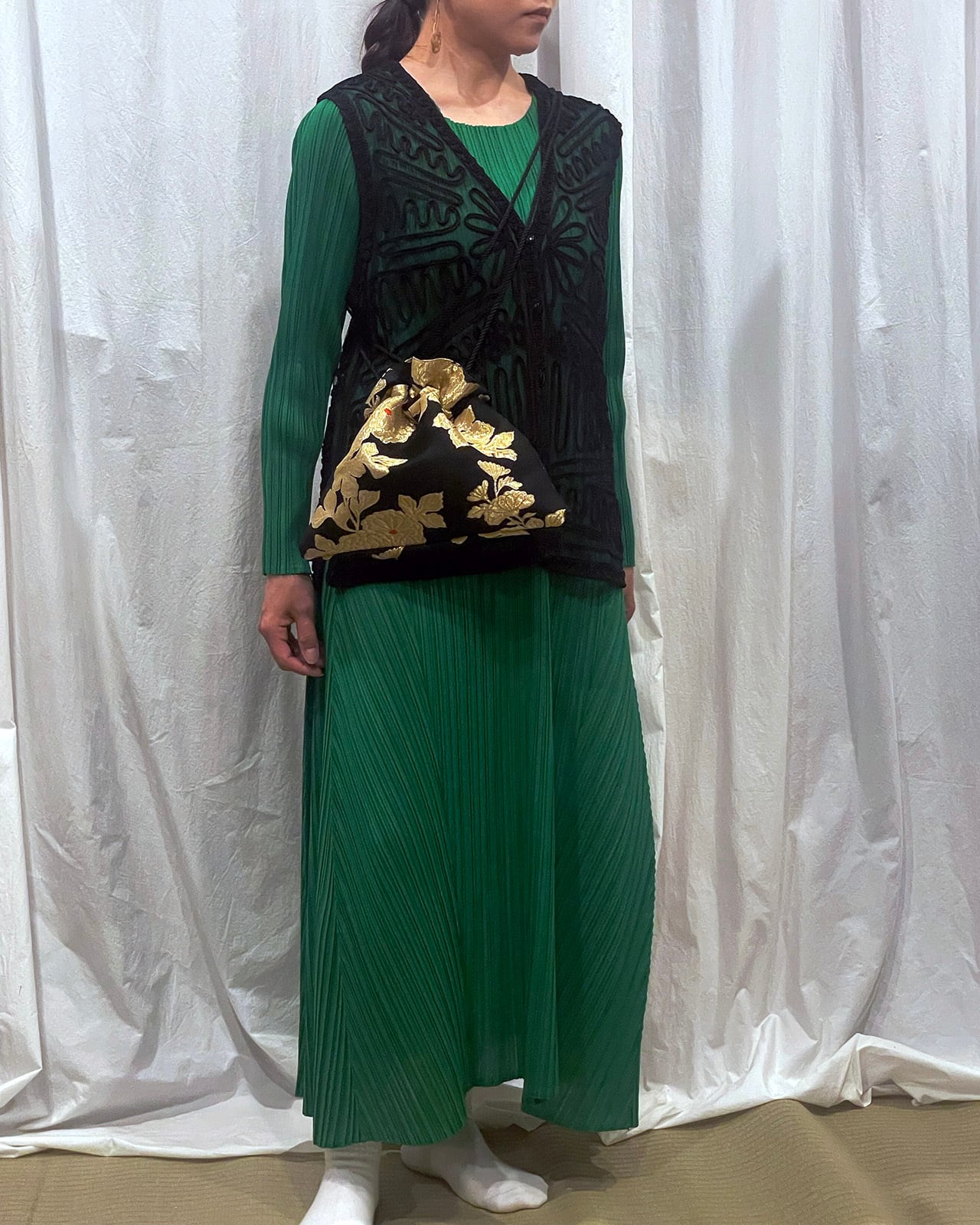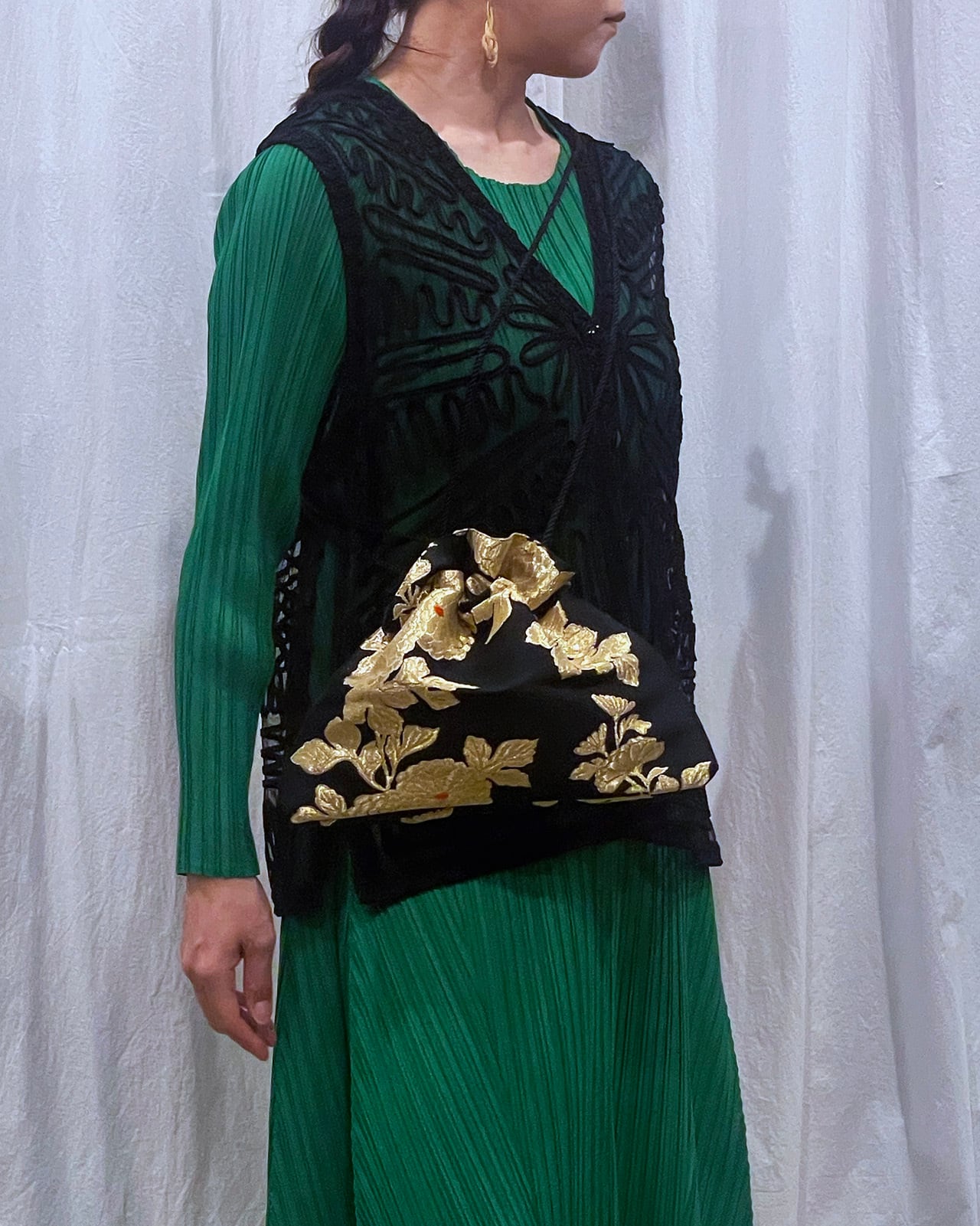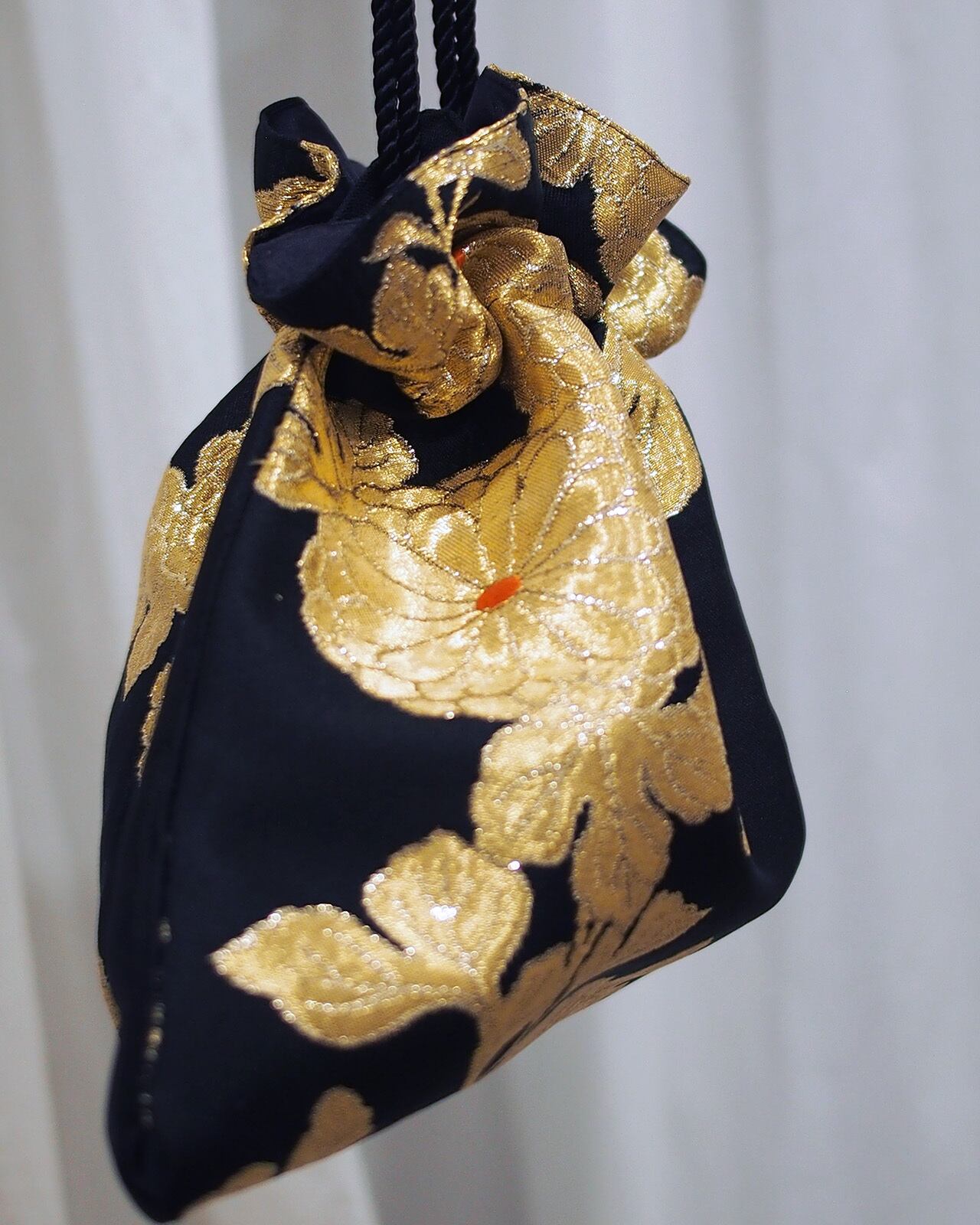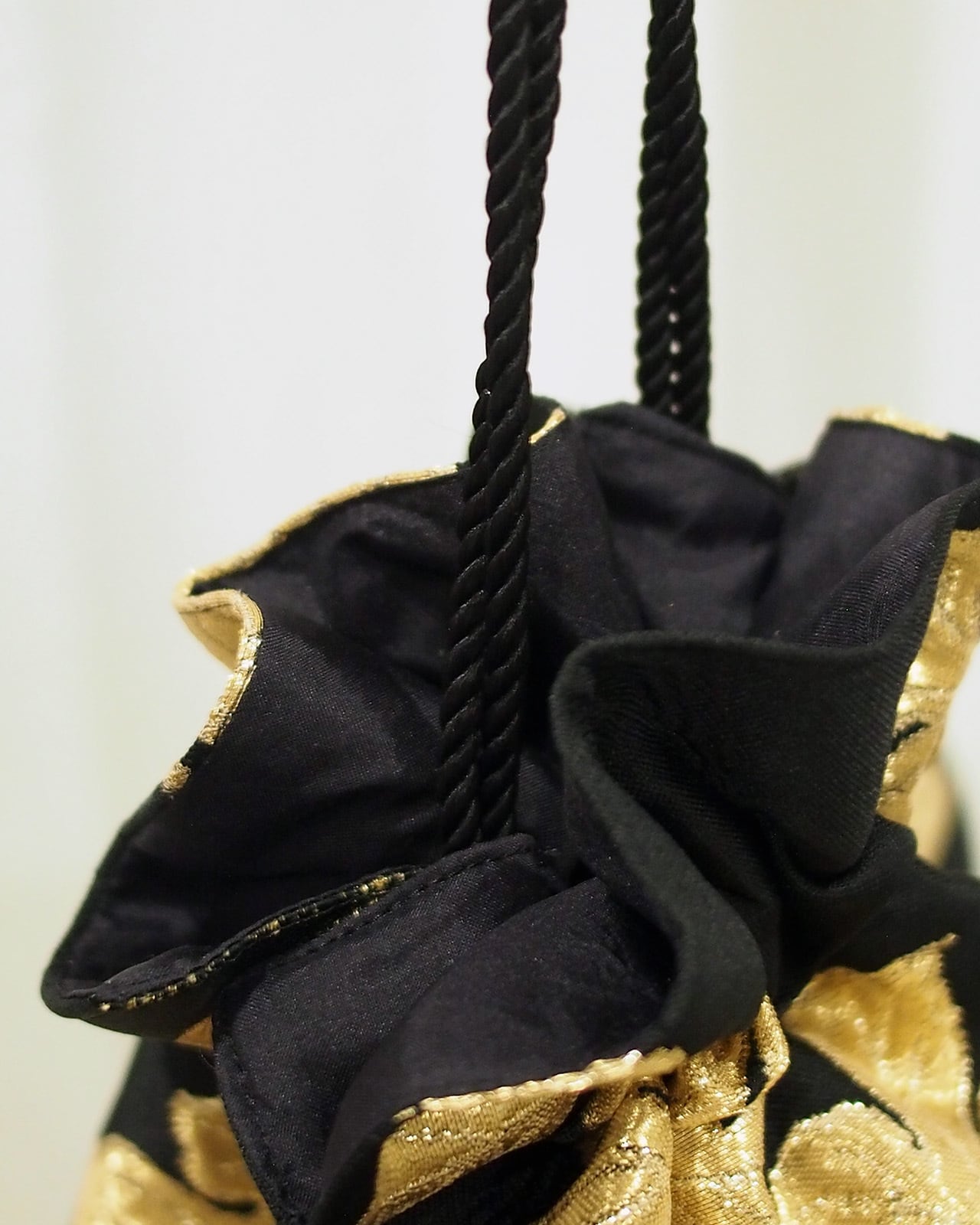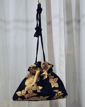 黒の絹帯に金糸で織りなされた花模様が目を引く、洗練された小さな丸いフォルムがなんとも魅力的な、デザインと実用性を兼ね備えた巾着タイプのショルダーバッグです。多機能でスタイリッシュなバッグは、日常使いから特別なシーンまで幅広く活躍します。