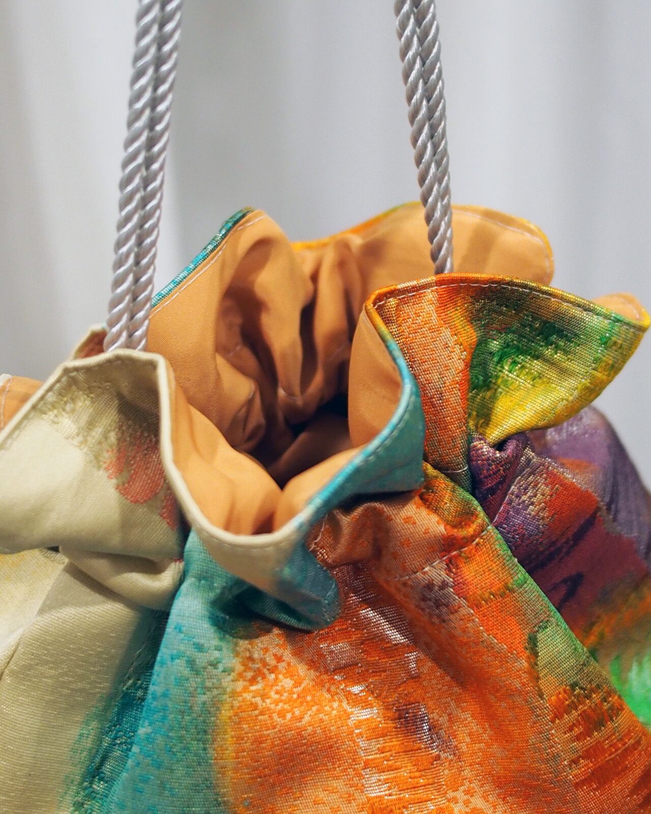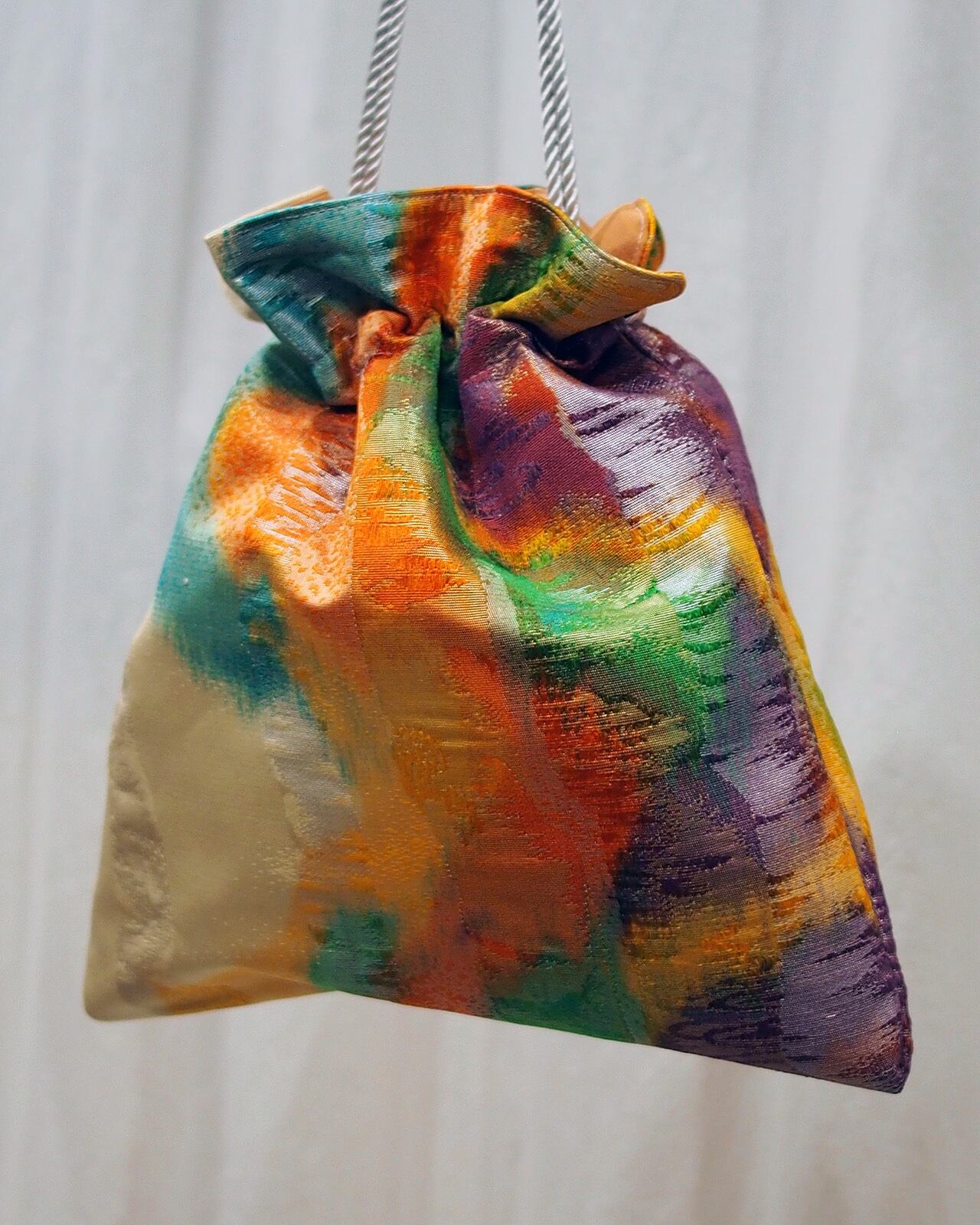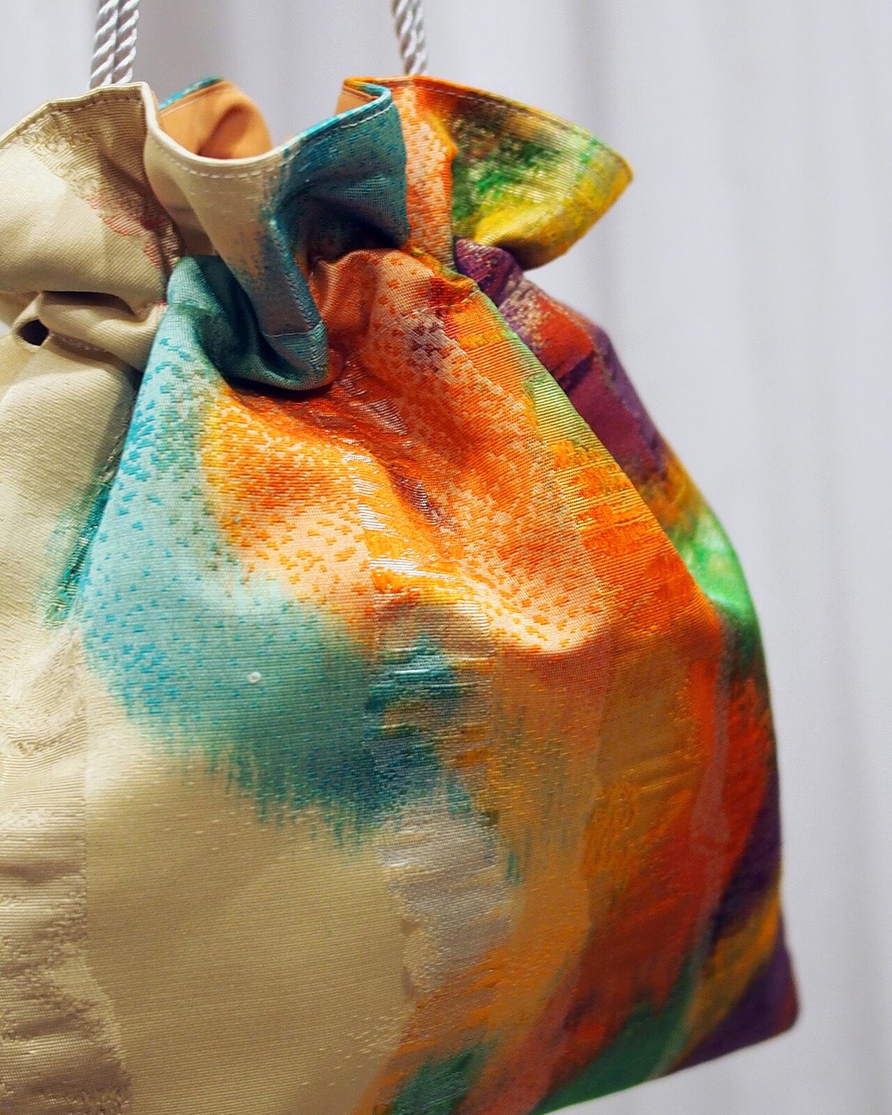 織りなされた虹色模様が目を引く、洗練されたフォルムが魅力的な、デザインと実用性を兼ね備えた巾着タイプのショルダーバッグです。多機能でスタイリッシュなバッグは、日常使いから特別なシーンまで幅広く活躍します。
