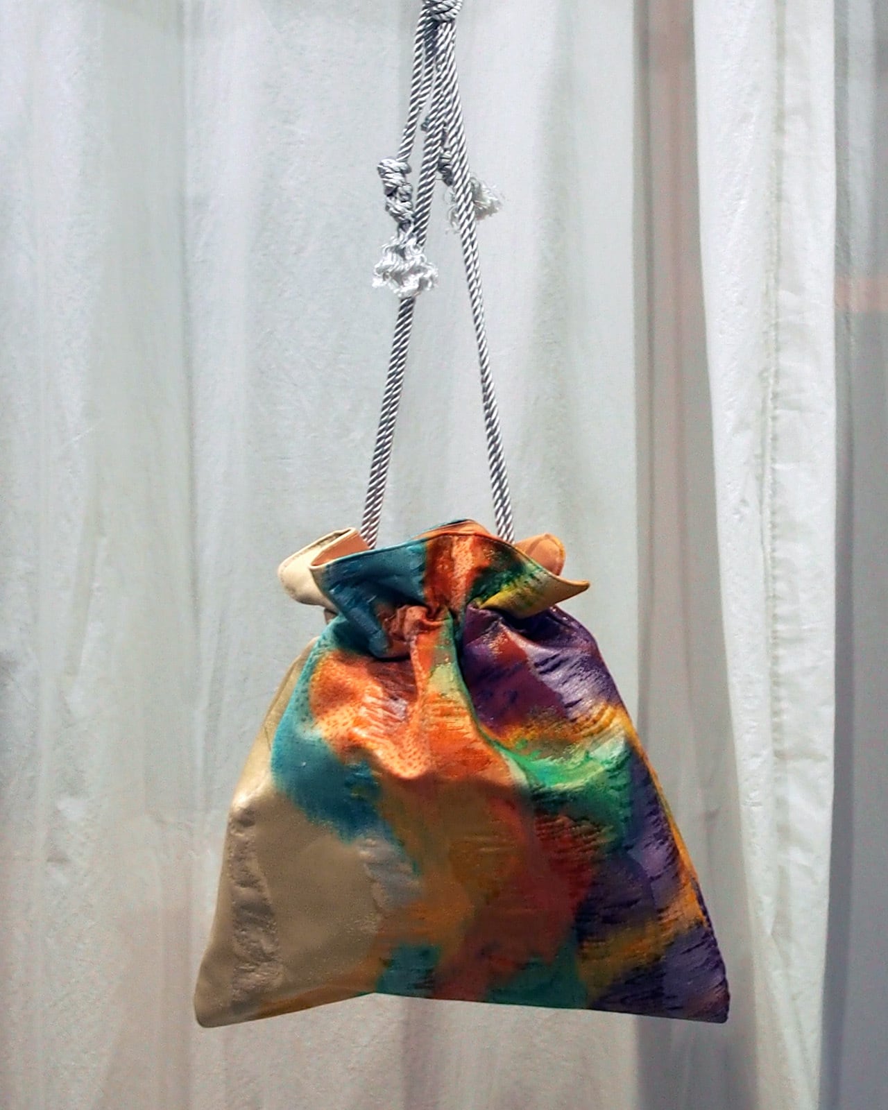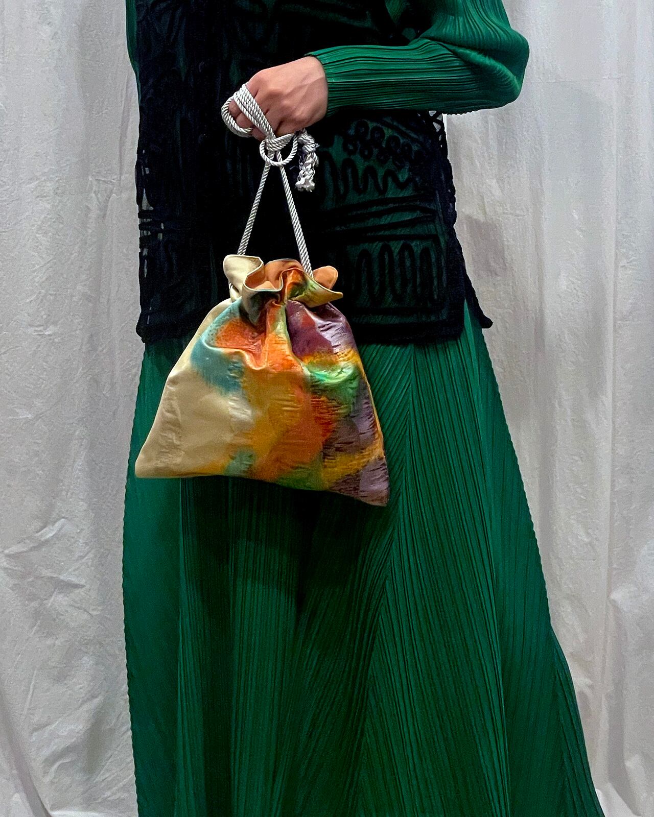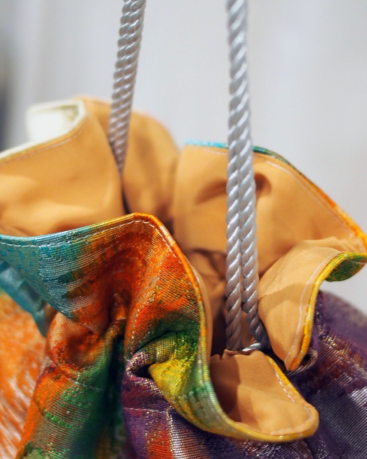 織りなされた虹色模様が目を引く、洗練されたフォルムが魅力的な、デザインと実用性を兼ね備えた巾着タイプのショルダーバッグです。多機能でスタイリッシュなバッグは、日常使いから特別なシーンまで幅広く活躍します。