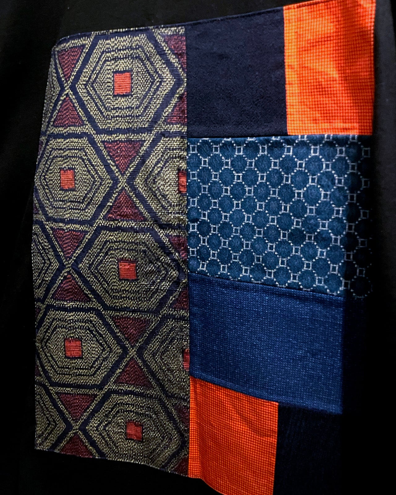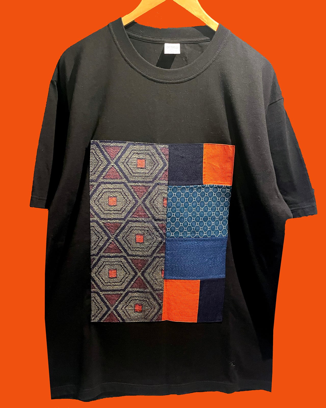 着物生地を贅沢に使用し、パッチワークで構成した印象的な一点ものTシャツです。