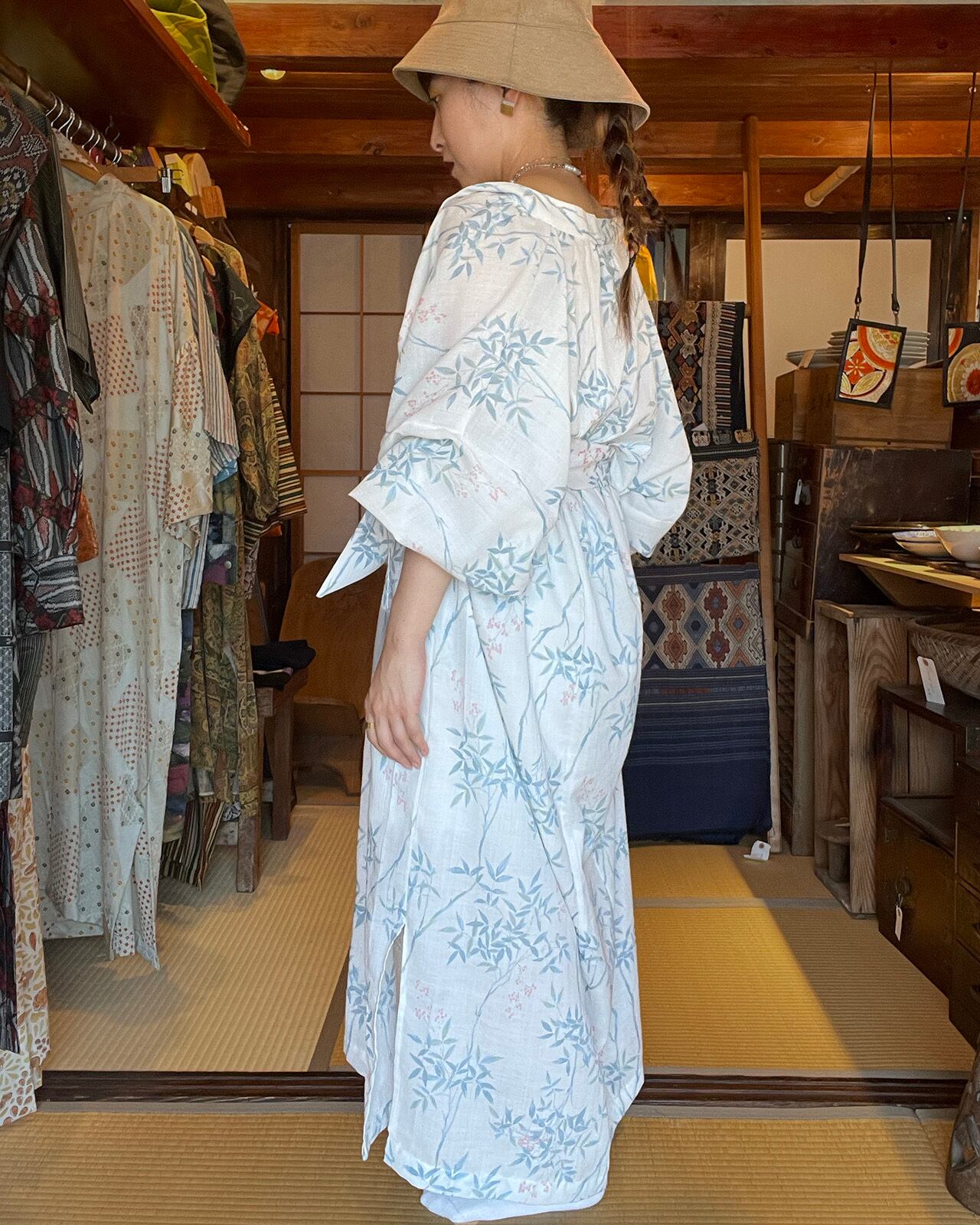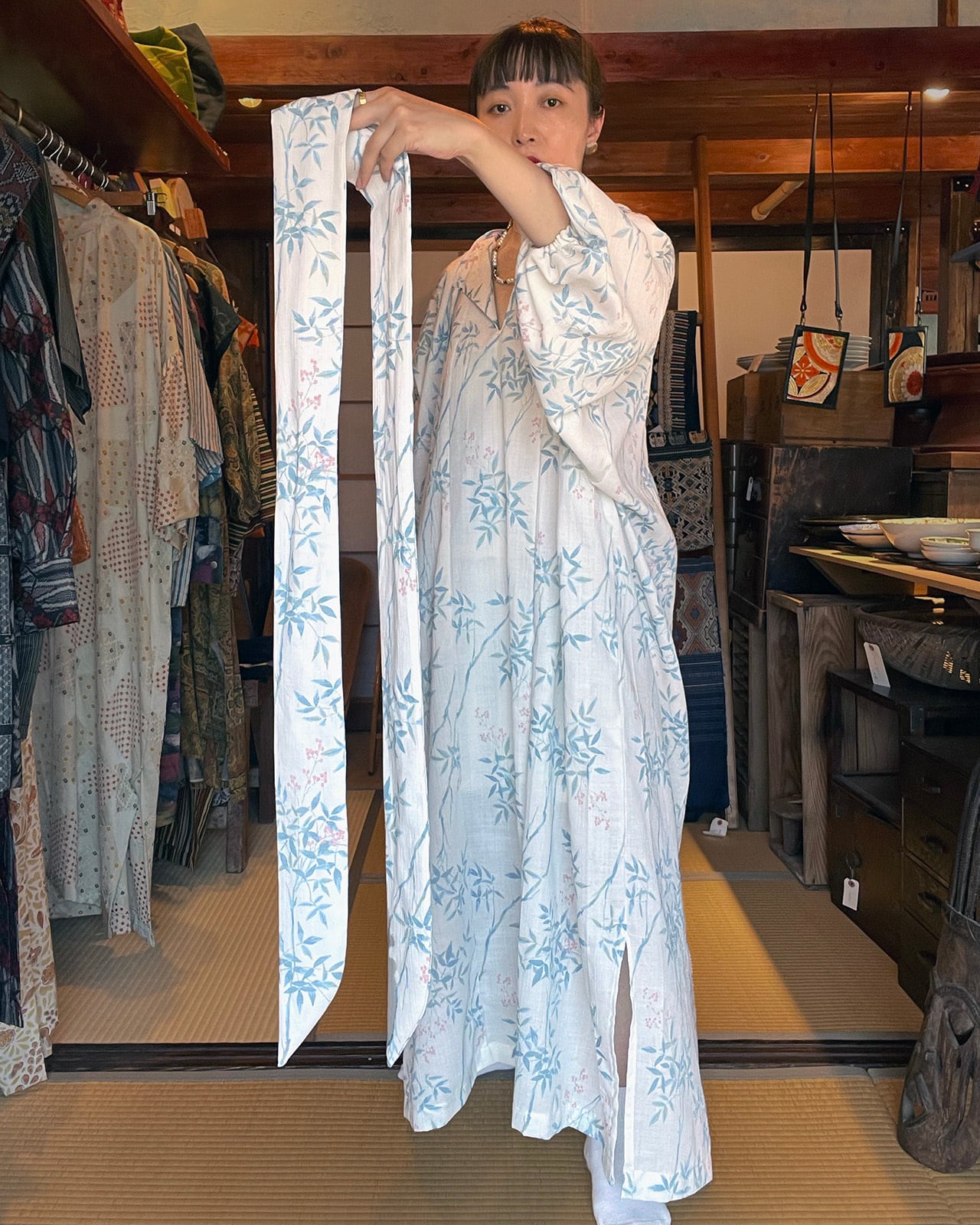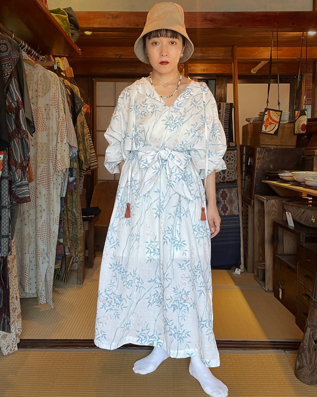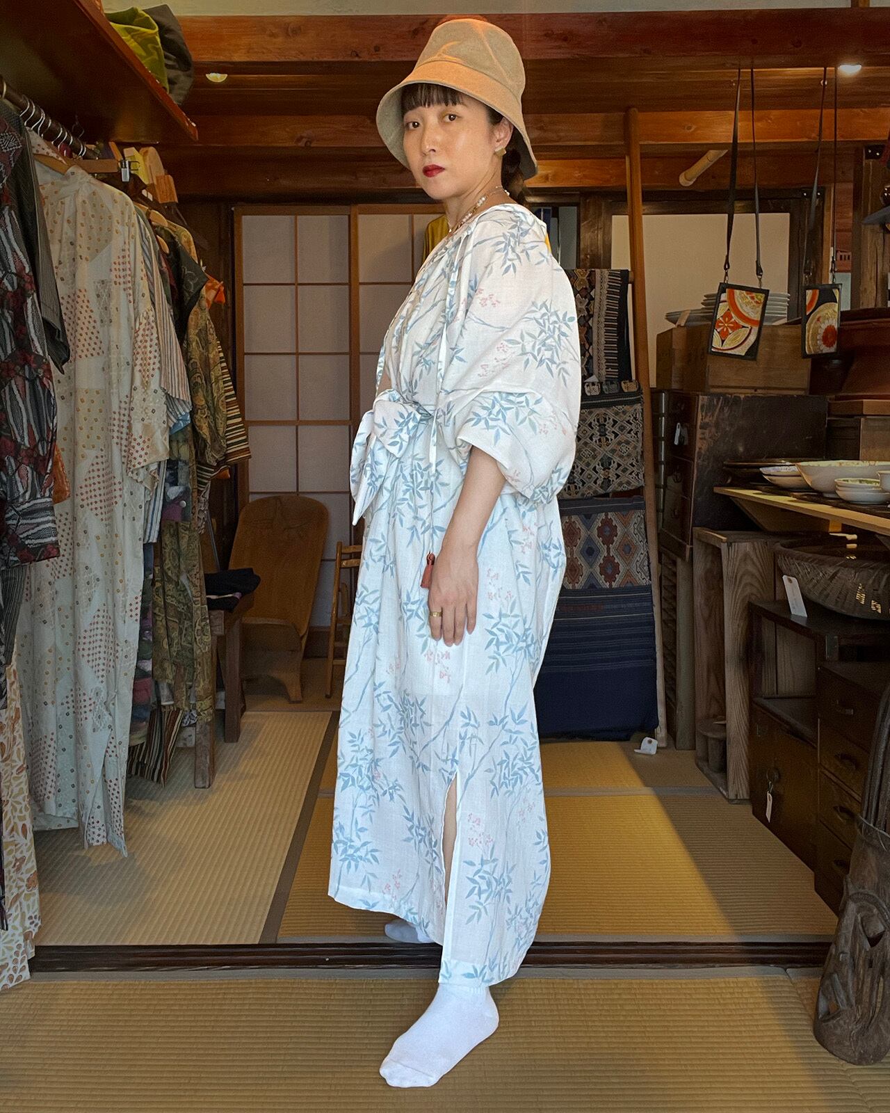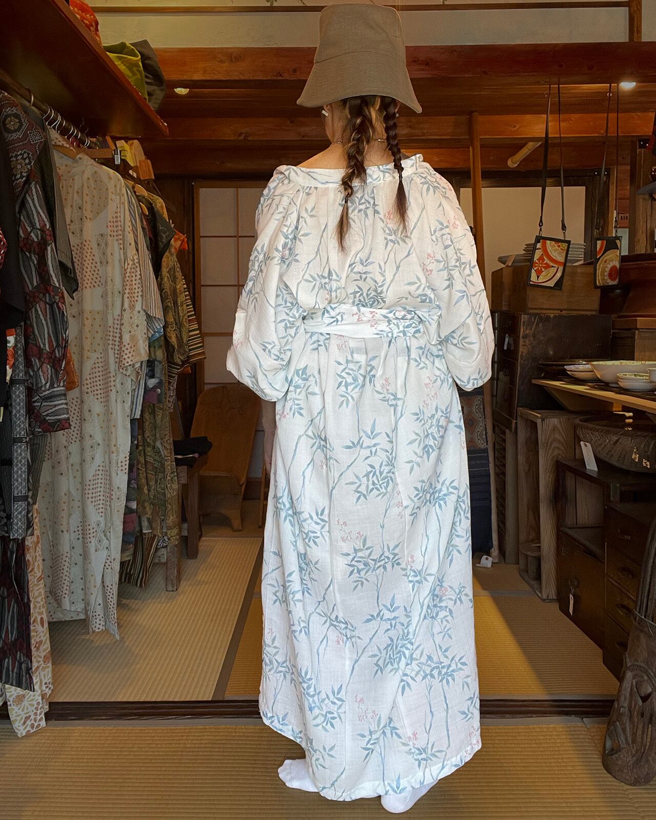 麻素材の夏着物を使用した一点ものシースルーロングドレス。
