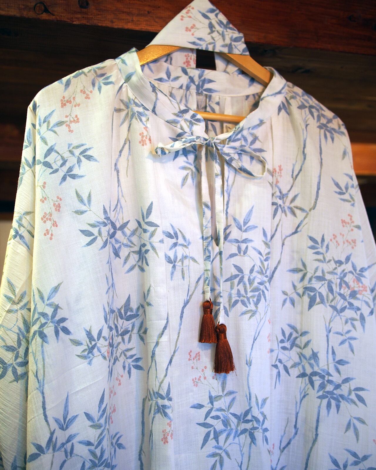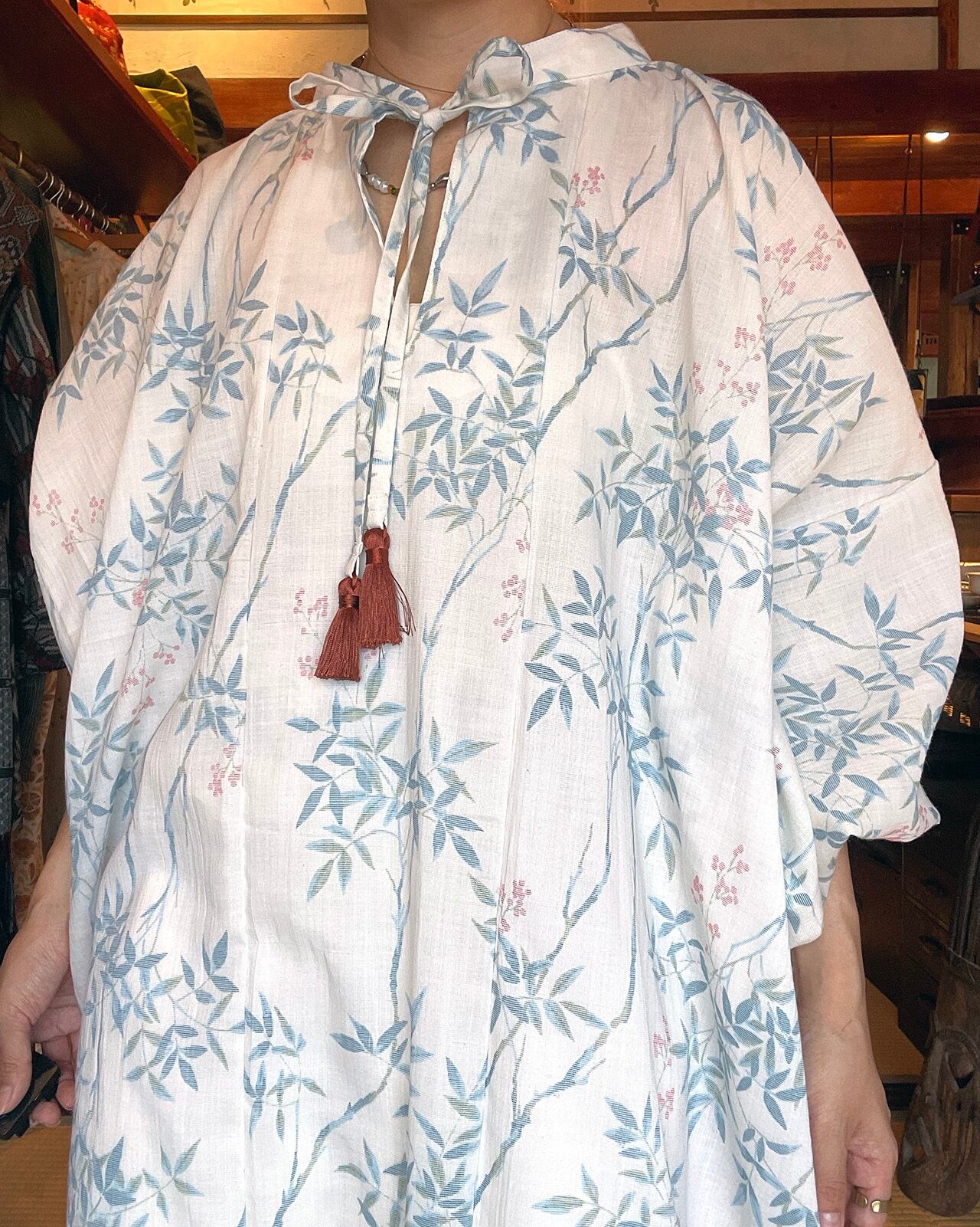 麻の透け感と葉やつぼみ模様が涼しげな雰囲気を演出。