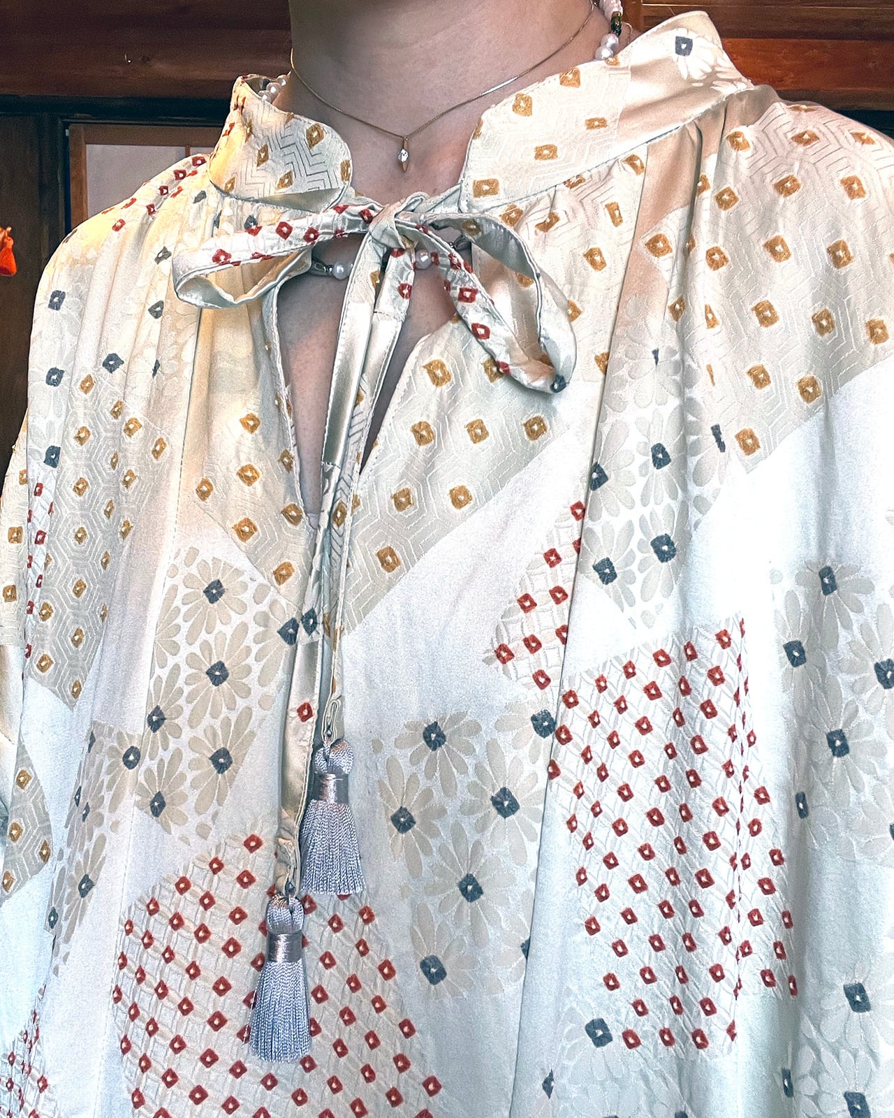 The collar can be worn open or closed, and the waist ribbon can double as a turban or be styled as a scarf around the neck, allowing for versatile styling across various occasions. A truly unique piece that lets you experience the heritage and artistry of Japan simply by wearing it.