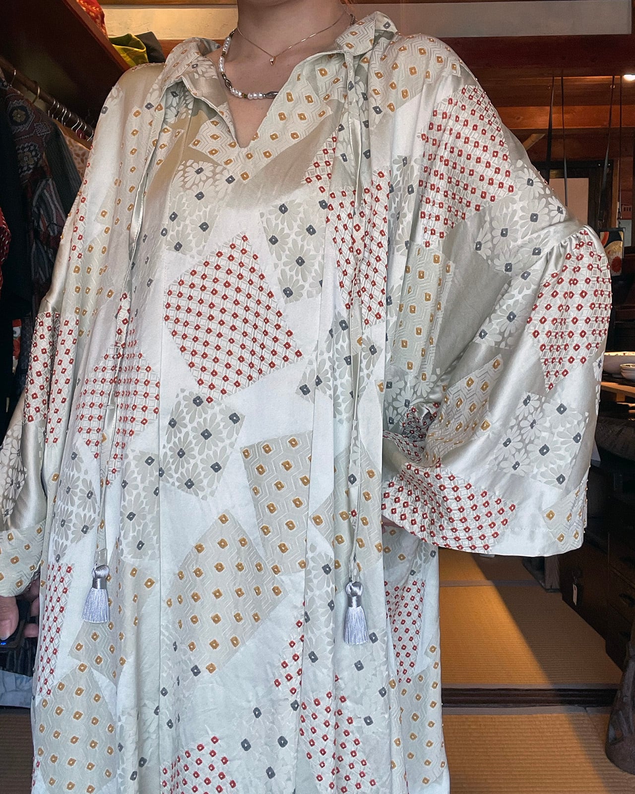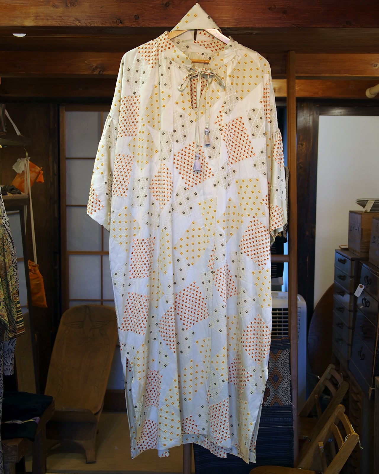 A generously designed long dress, lavishly crafted from an entire kimono.
