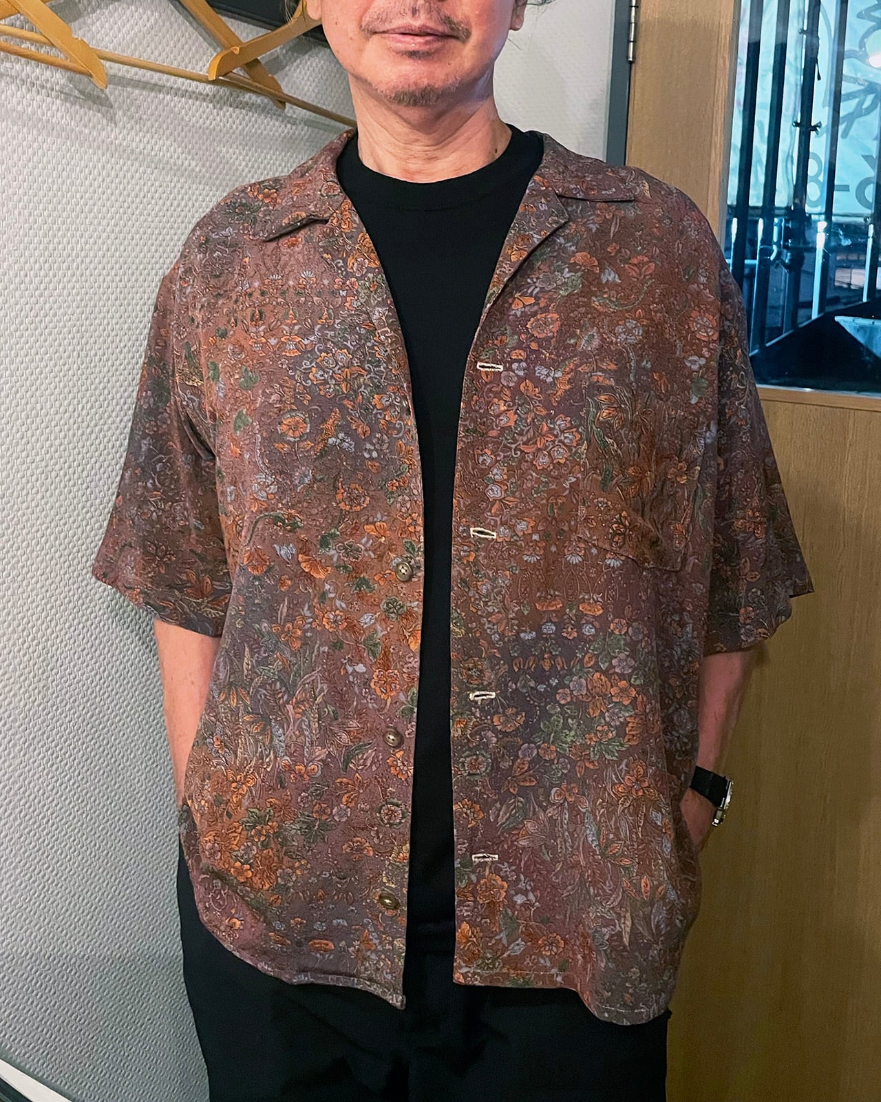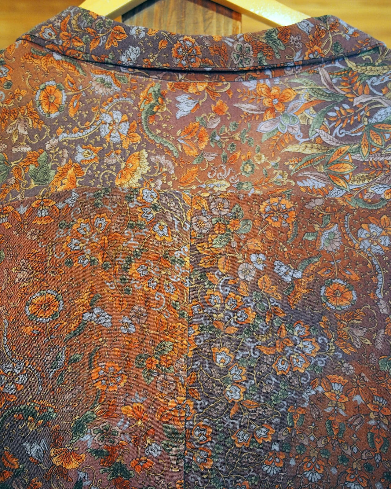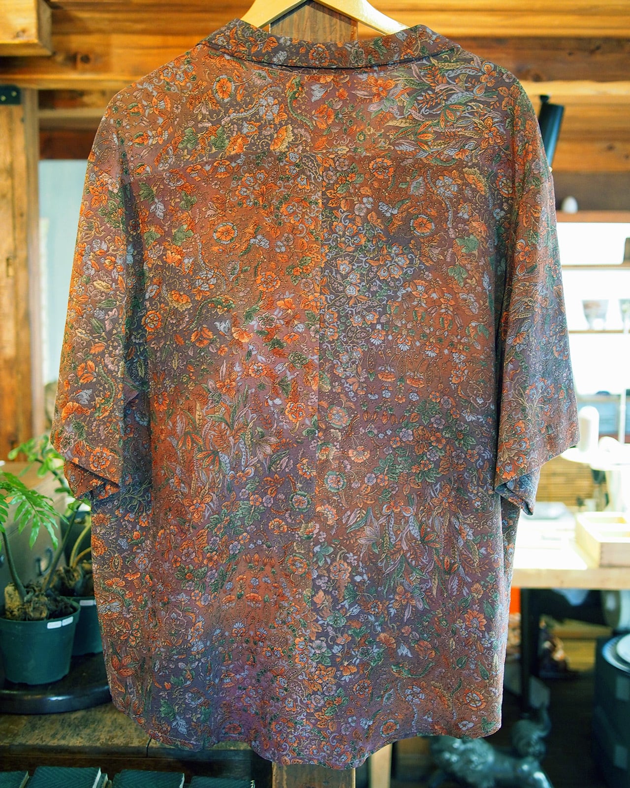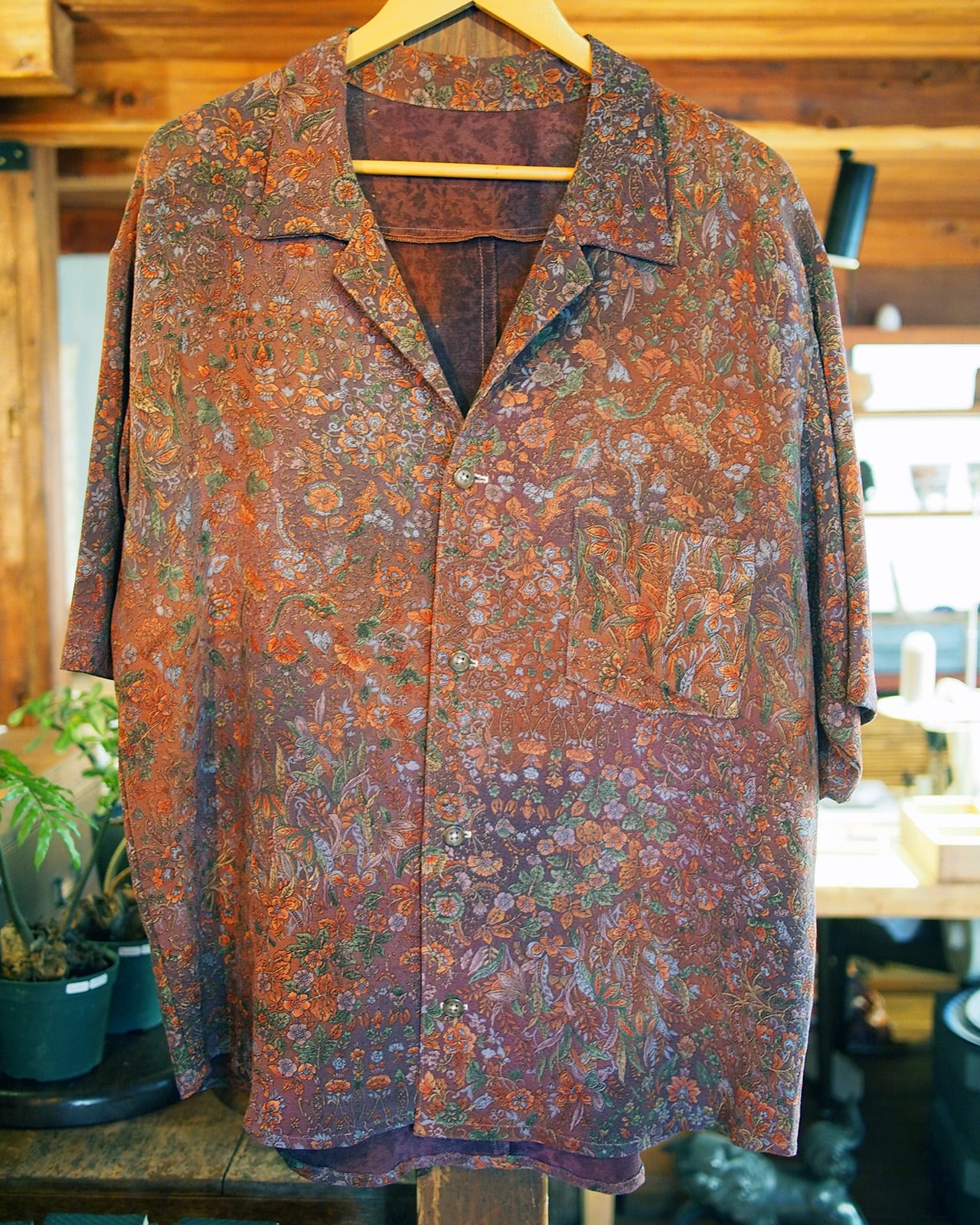 パープルと華やかなオレンジ色のレトロな花模様が目を引くお着物を選定したアロハシャツ