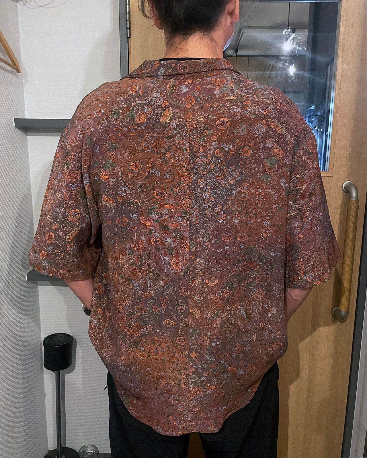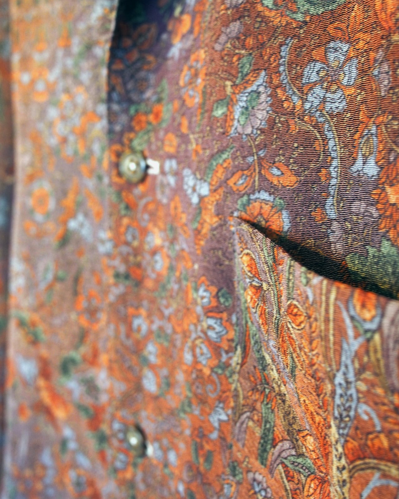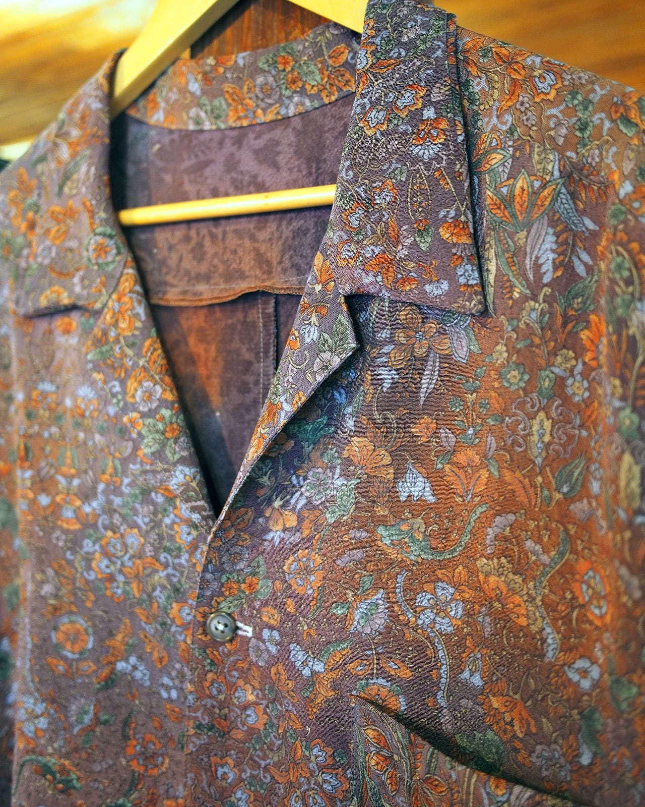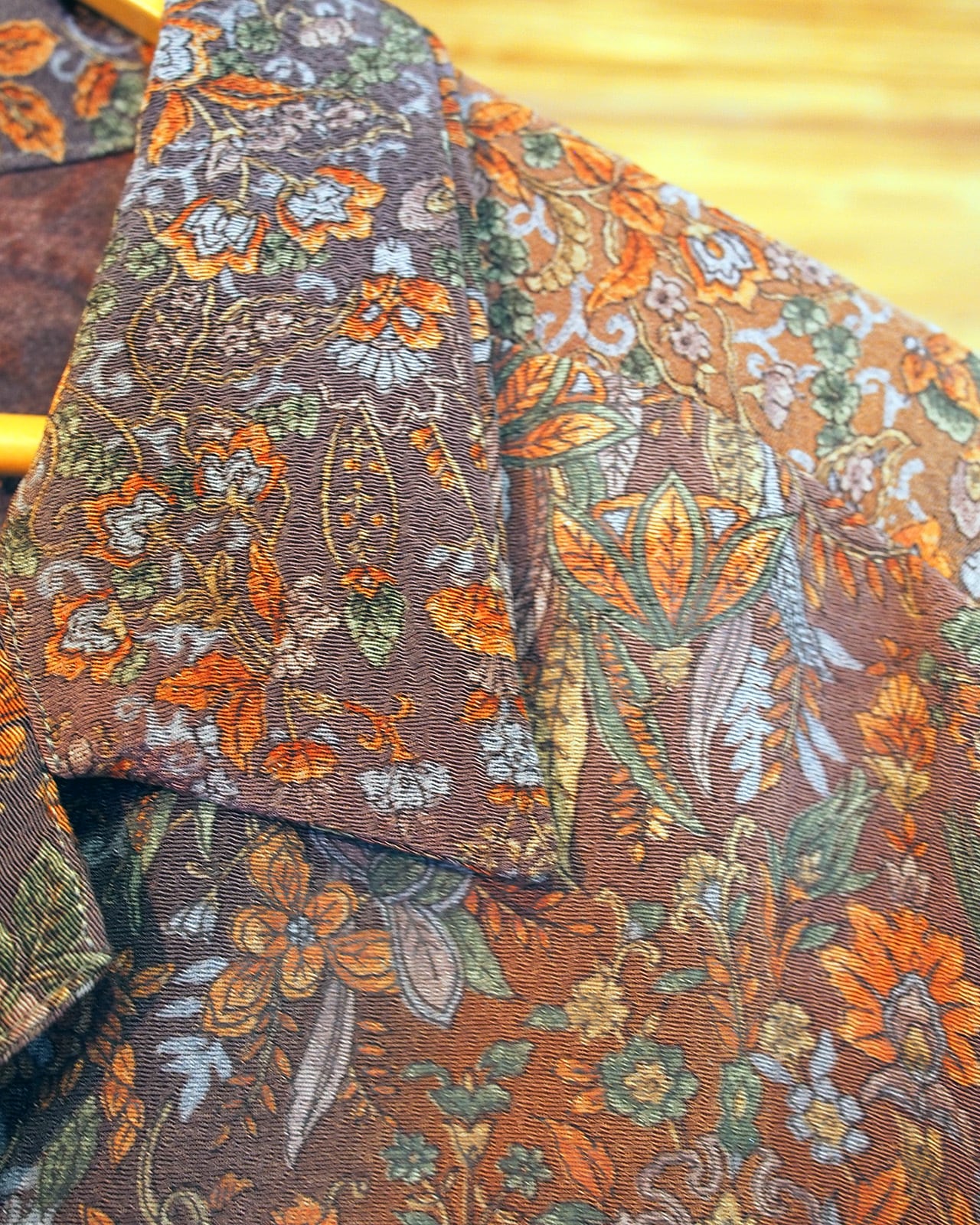 パープルと華やかなオレンジ色のレトロな花模様が目を引くお着物を選定したアロハシャツ