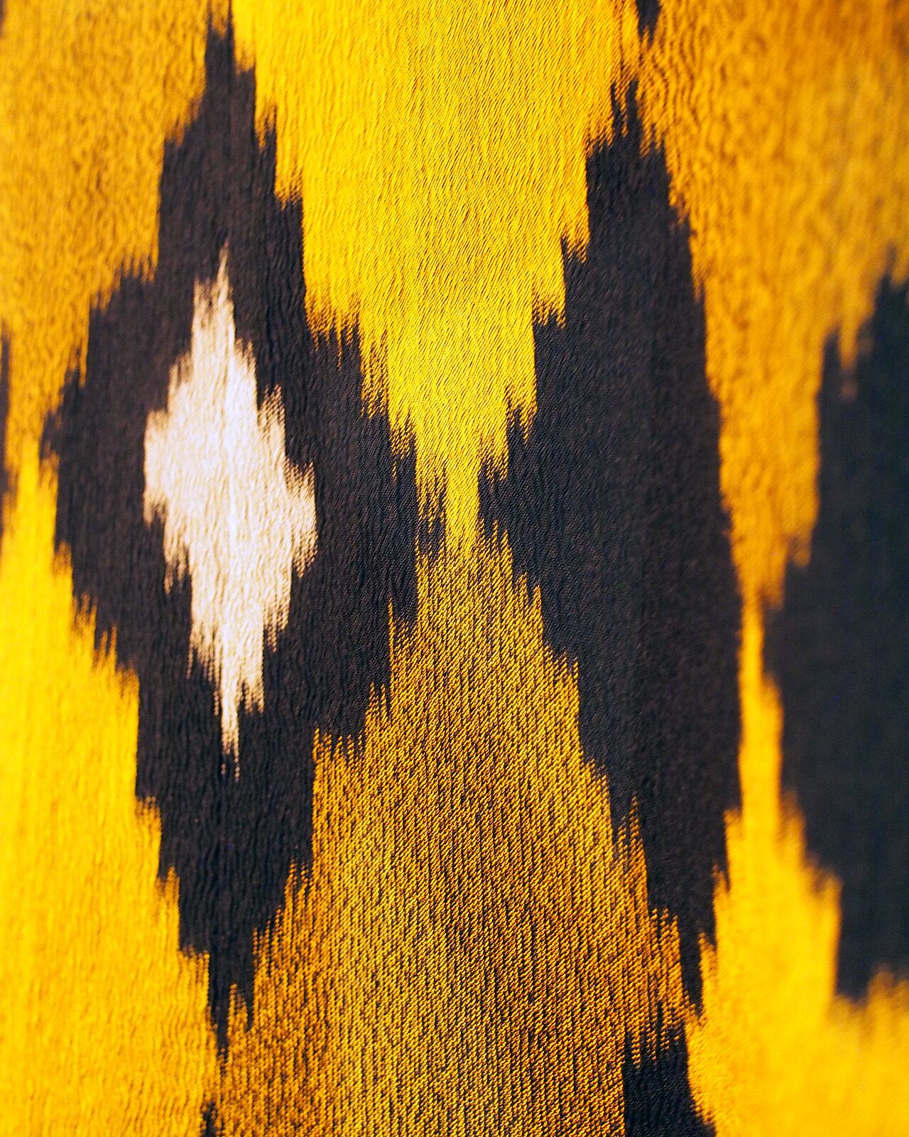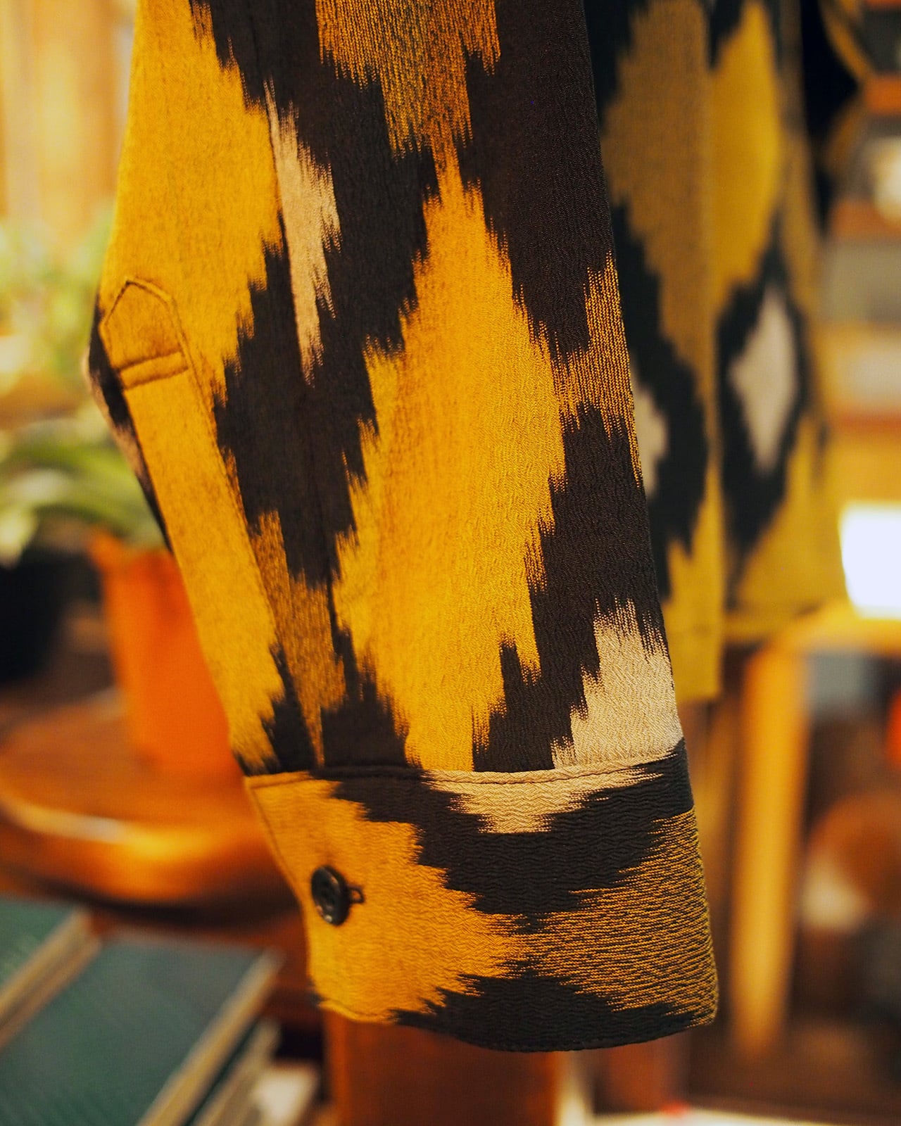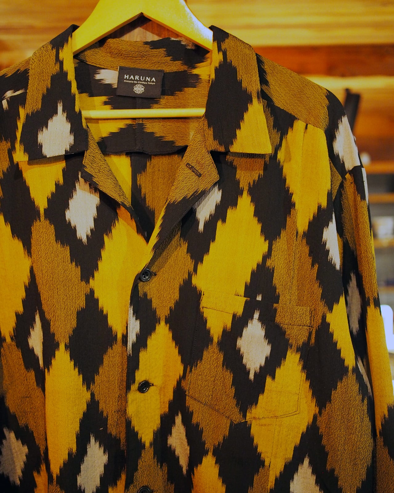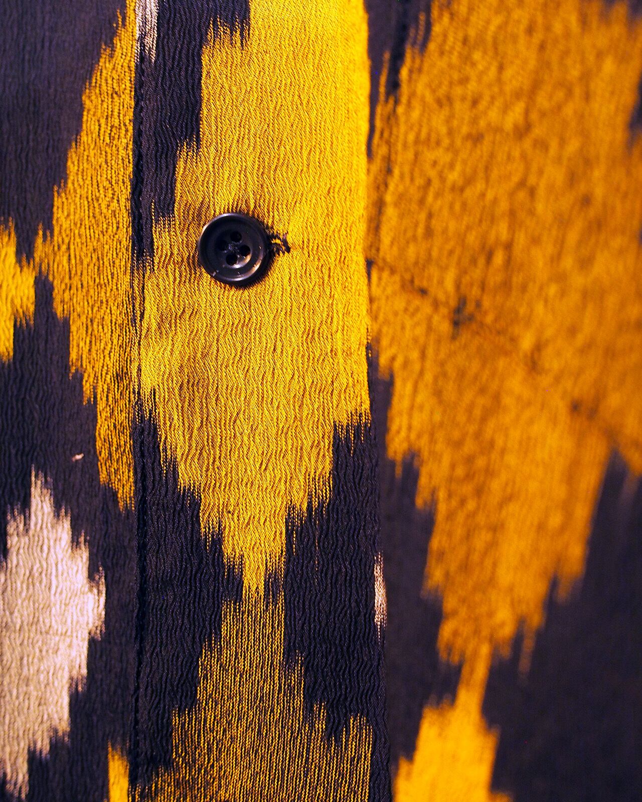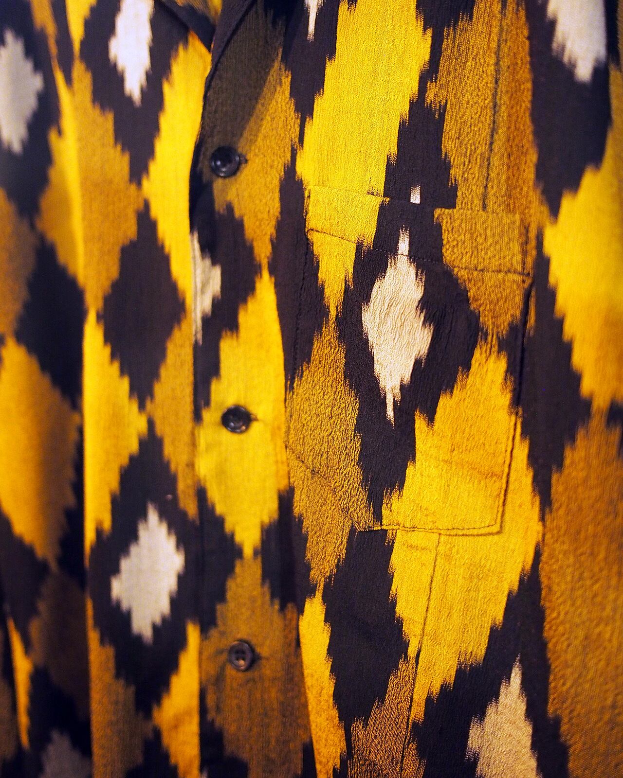 マスタードとブラックで構成された幾何学模様が映えるオープンカラーシャツ。