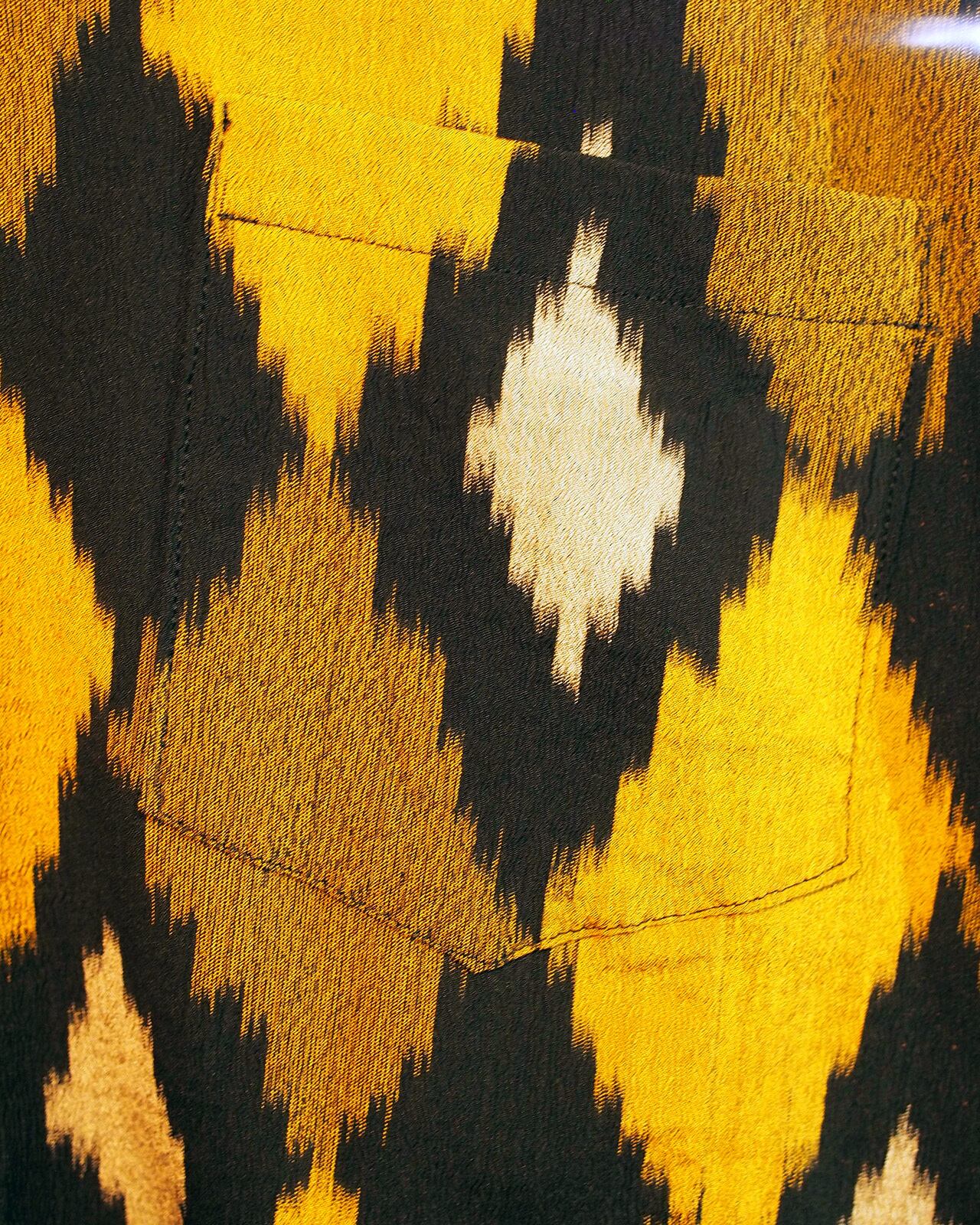 A striking open-collar shirt featuring a bold geometric pattern in mustard and black.