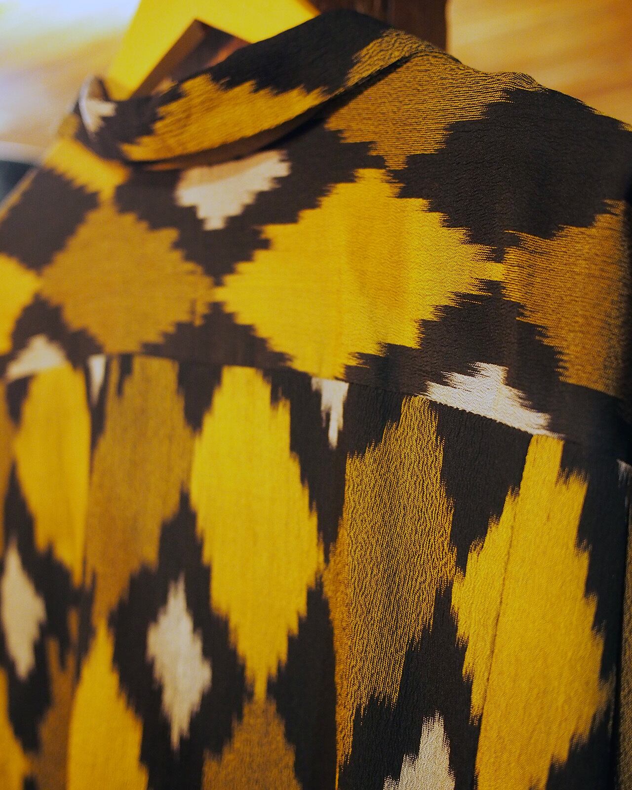 絹の生地には張りと上質な光沢感もあり、渋みのある色の構成からヴィンテージ感も漂う魅惑の一枚です。着るだけで日本ならではの伝統や技術を感じられる唯一無二の逸品です。