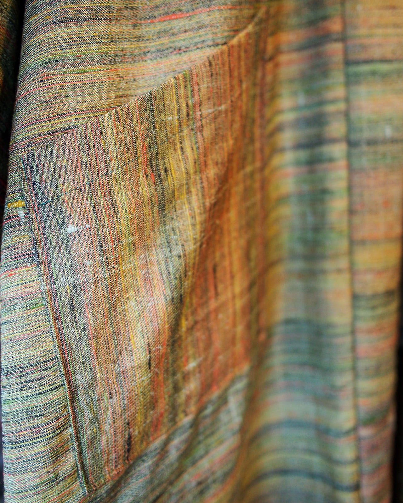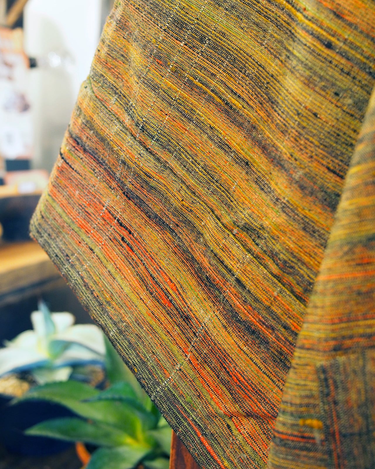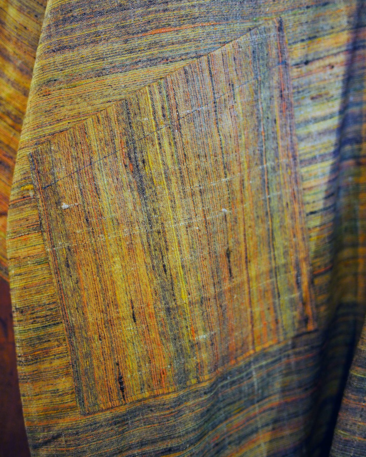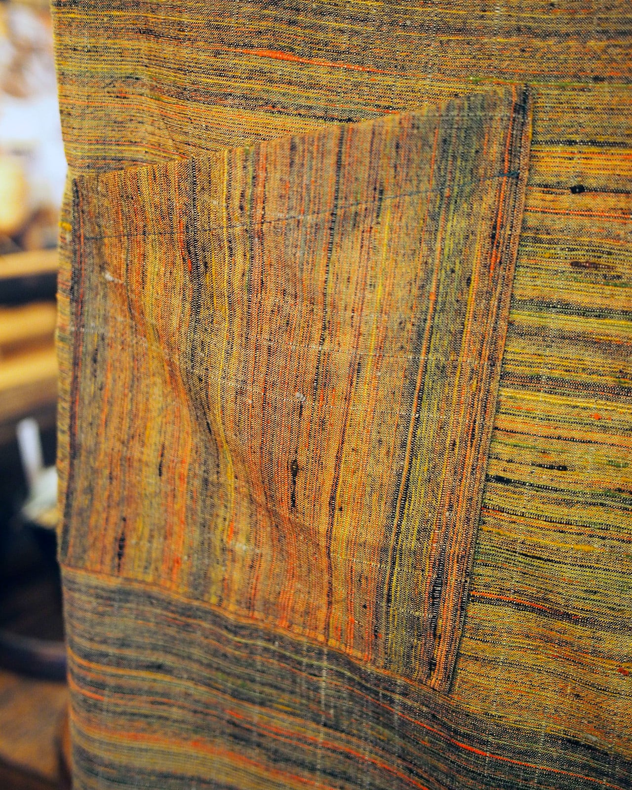 Woven from hand-spun tsumugi yarns made of short or irregular silk fibers,