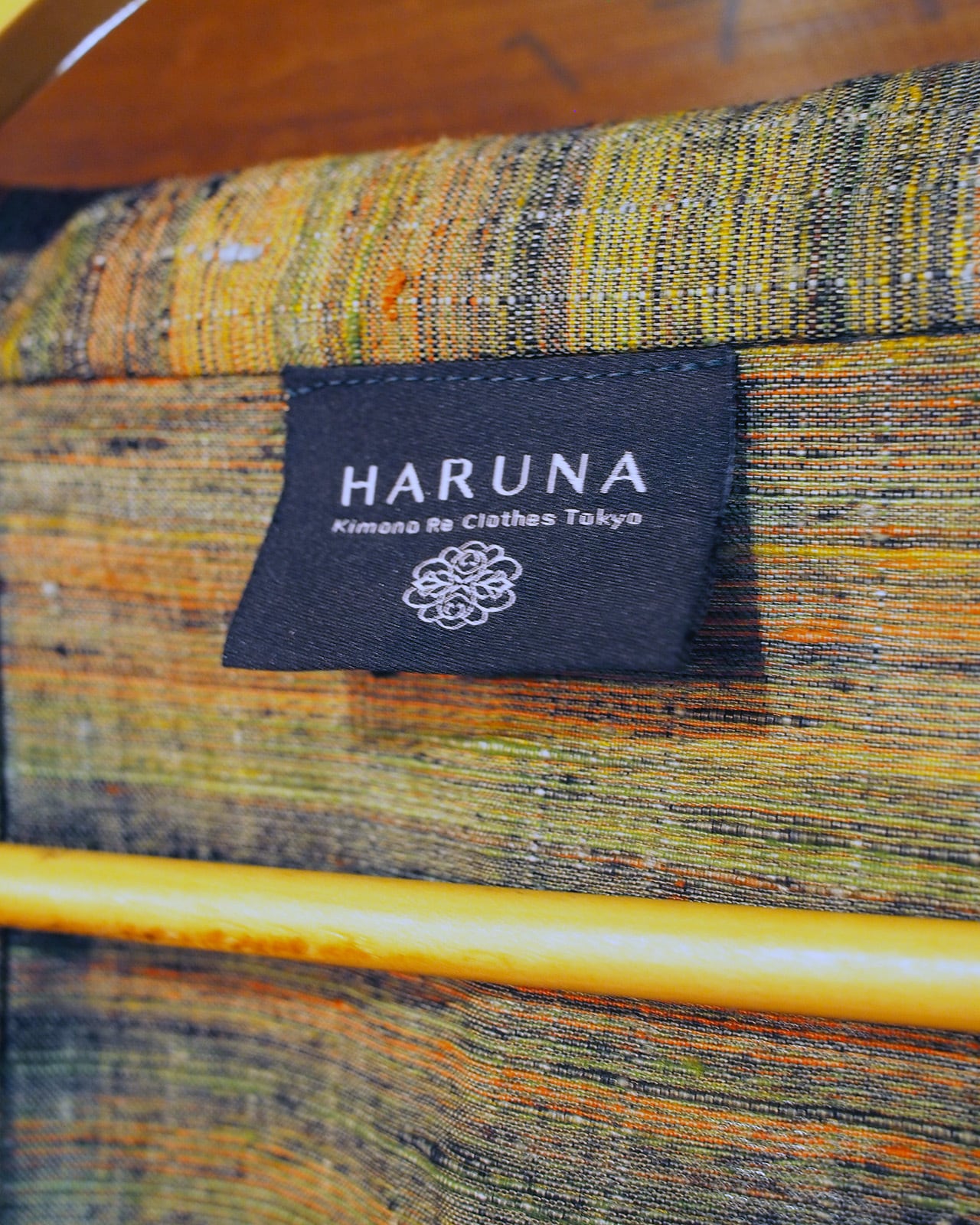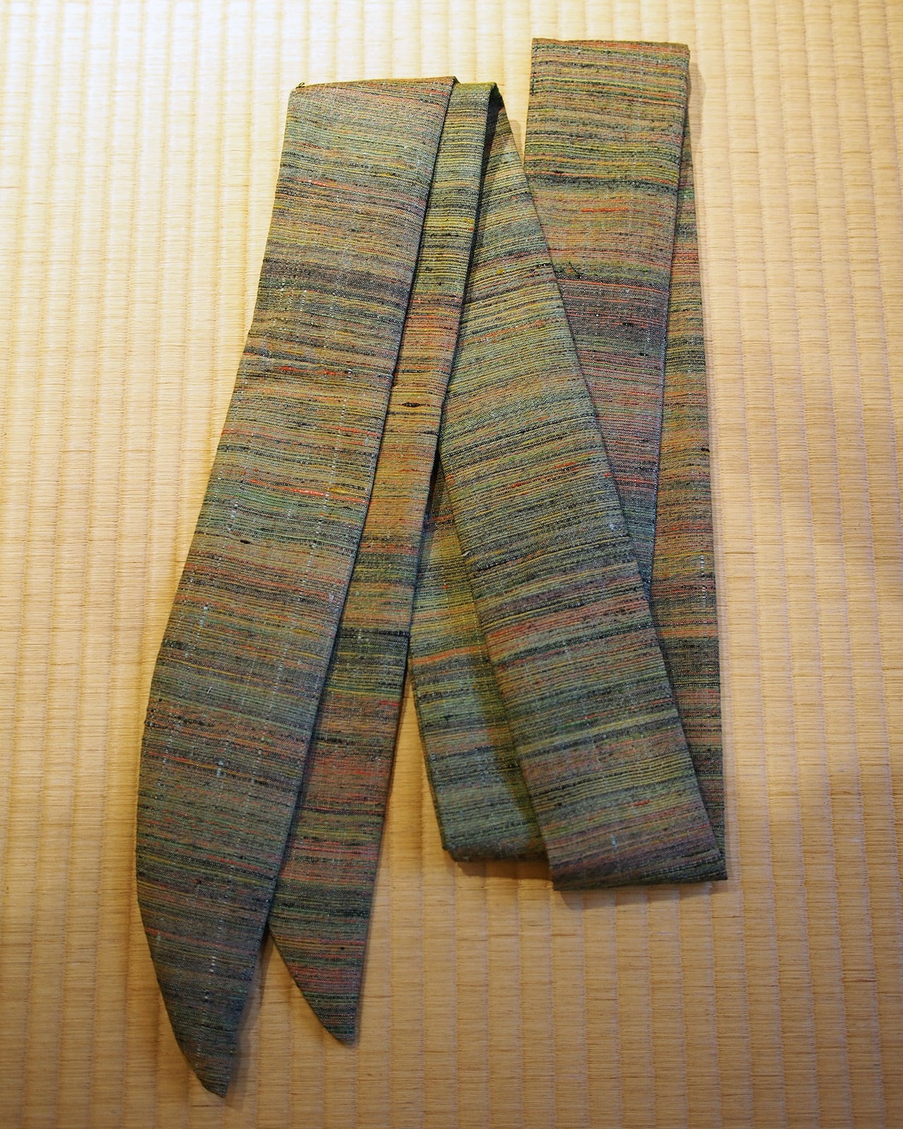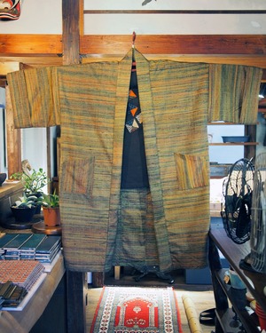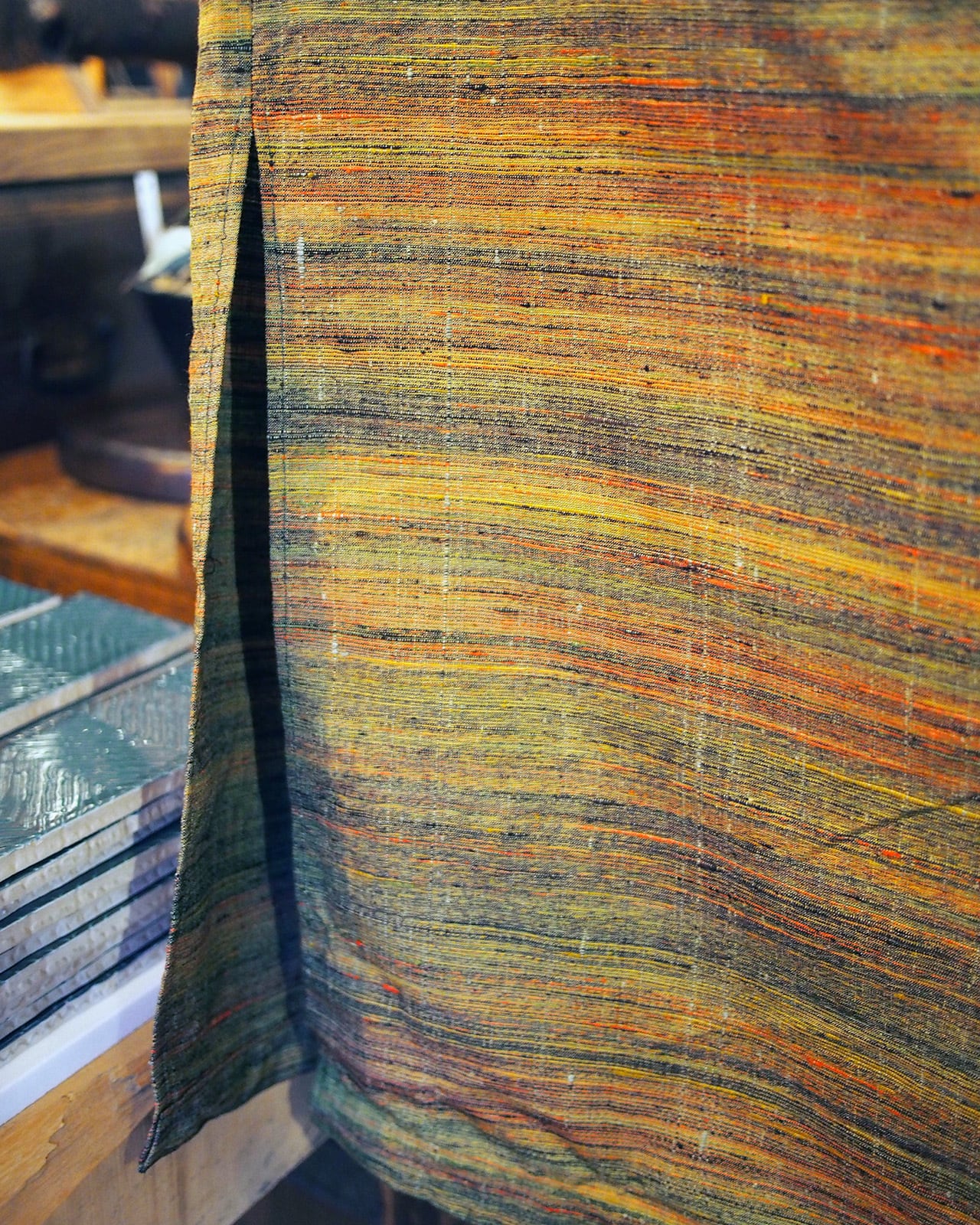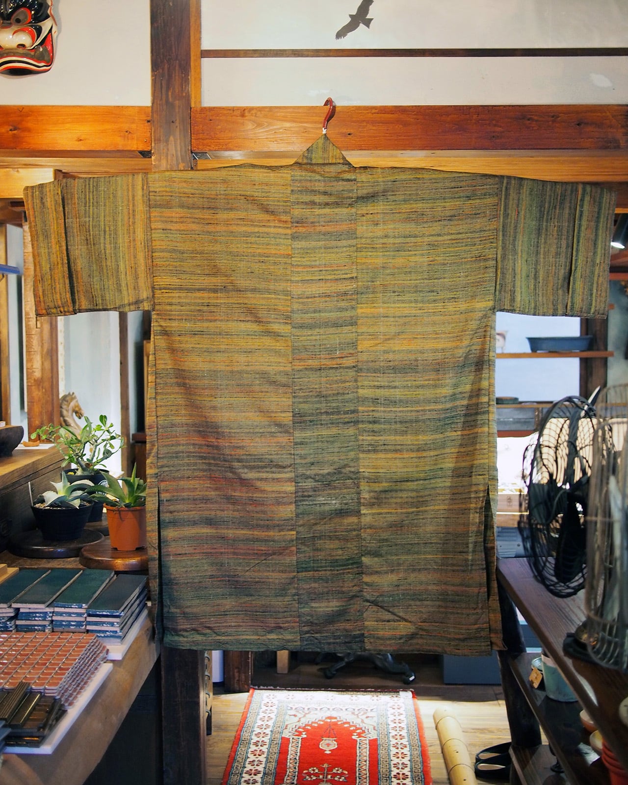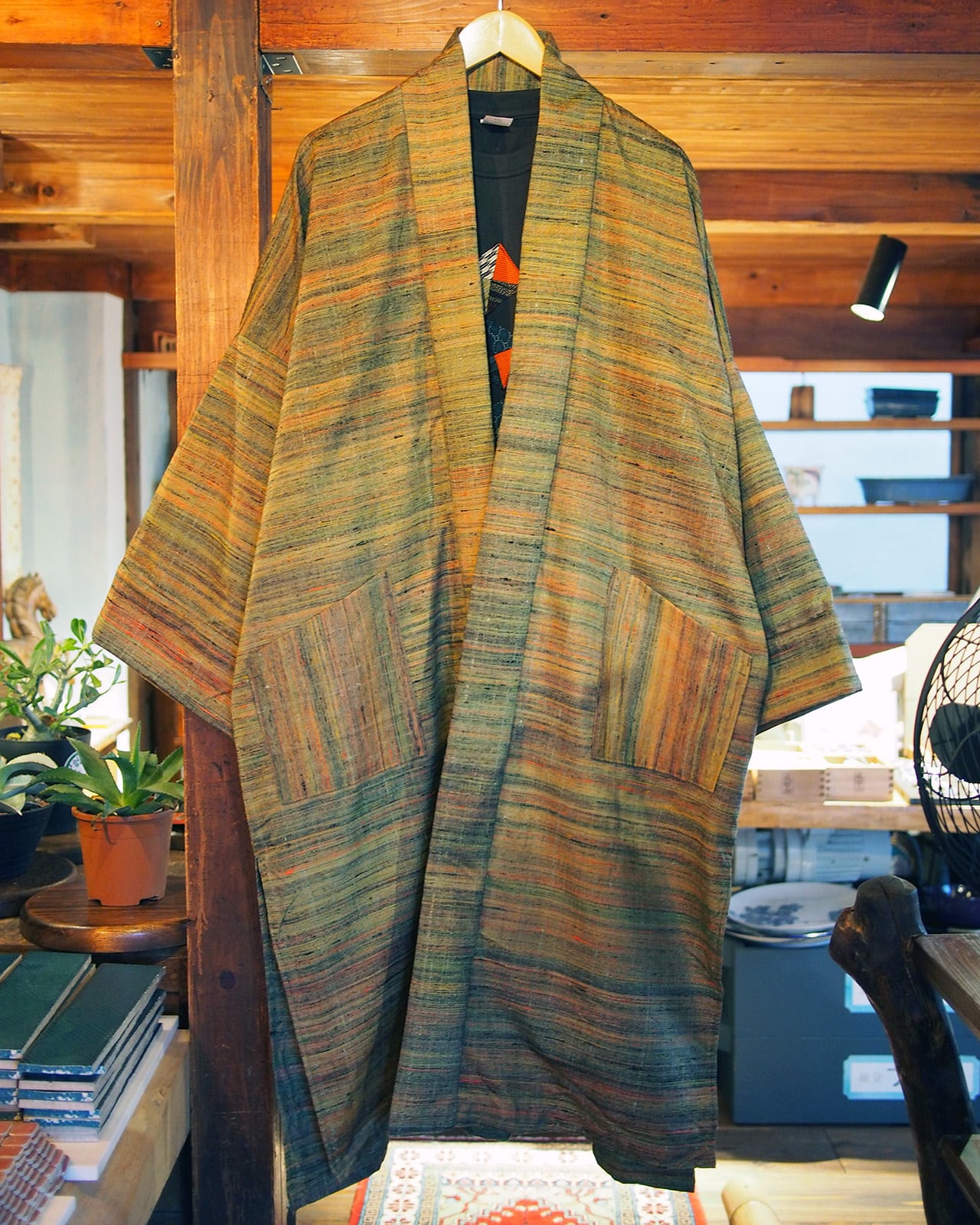 A kimono coat crafted from Tsumugi silk, woven with threads of many subtle colors.