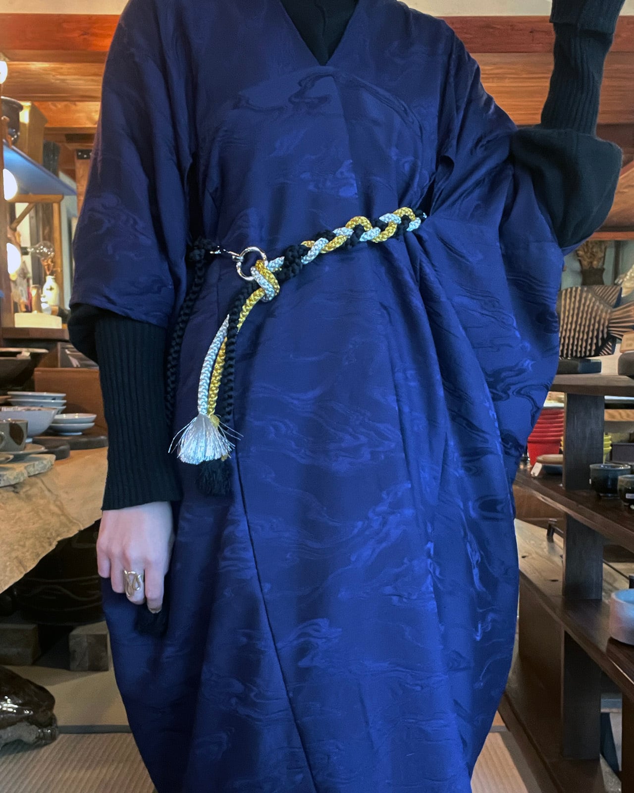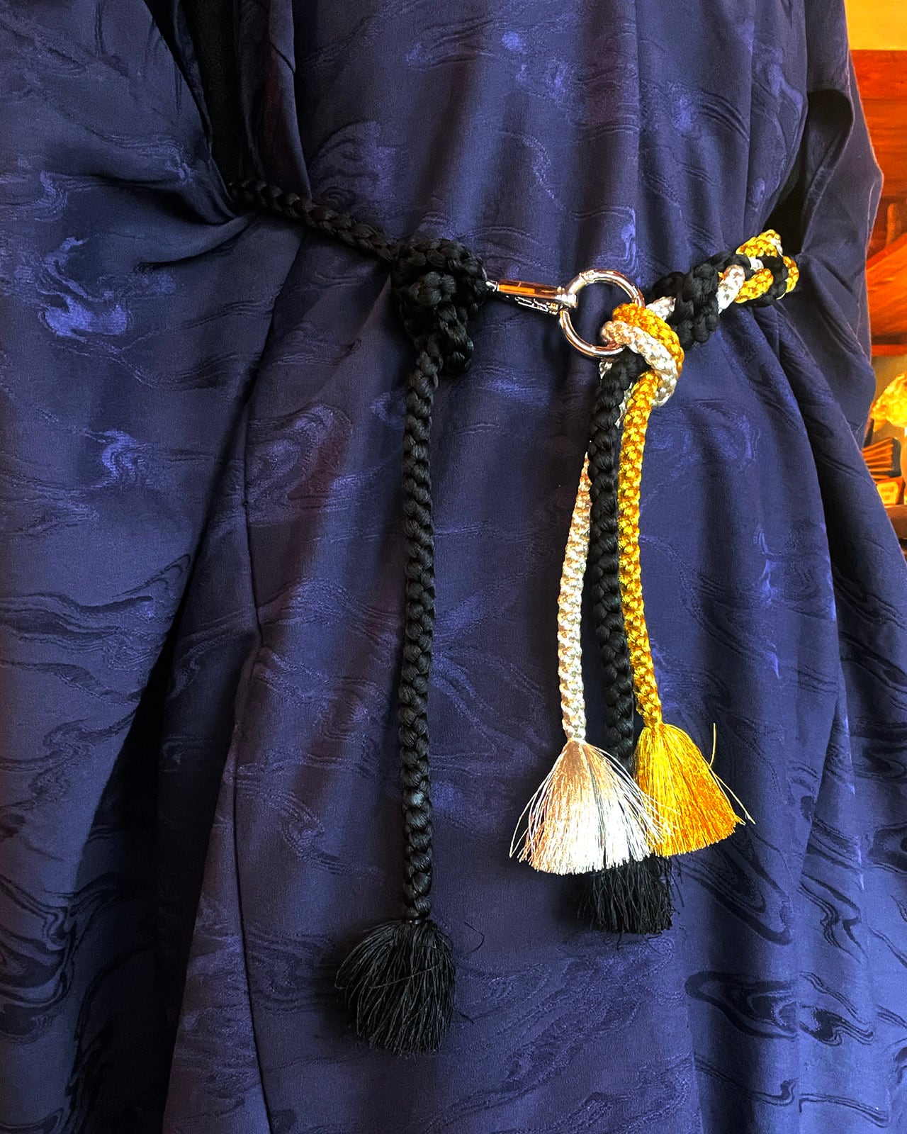 A multi-purpose strap created from traditional Japanese obi-jime cords. Wear it as a belt, phone strap, necklace, waist cord, or bag shoulder strap — a versatile accent for modern styling.