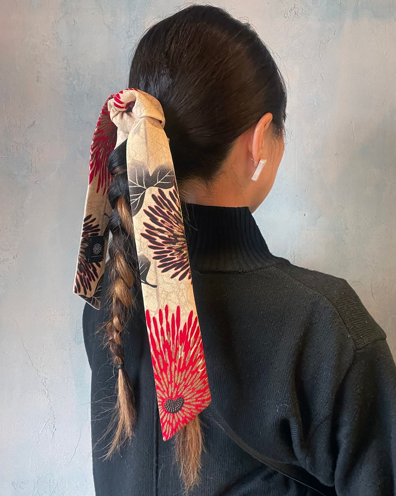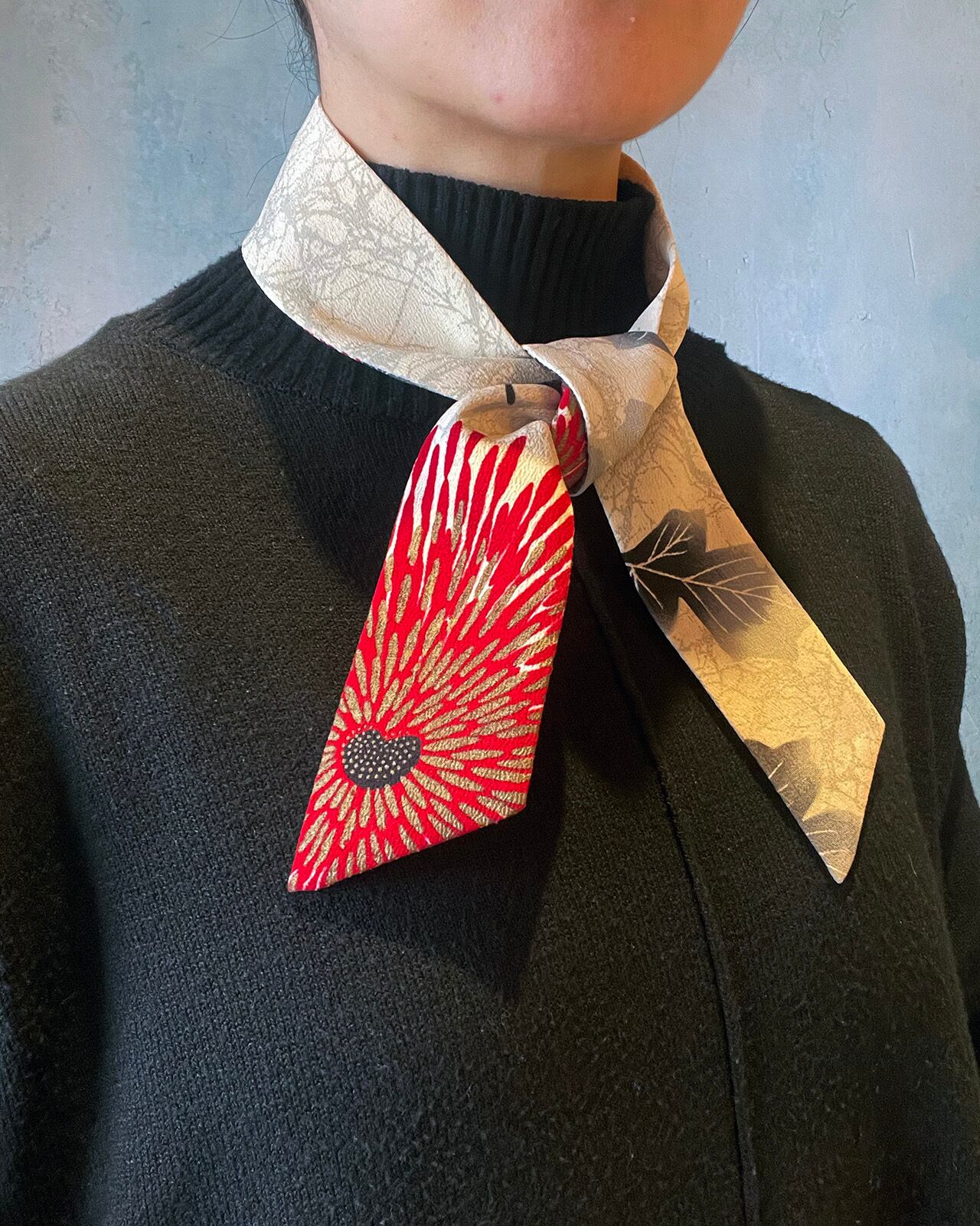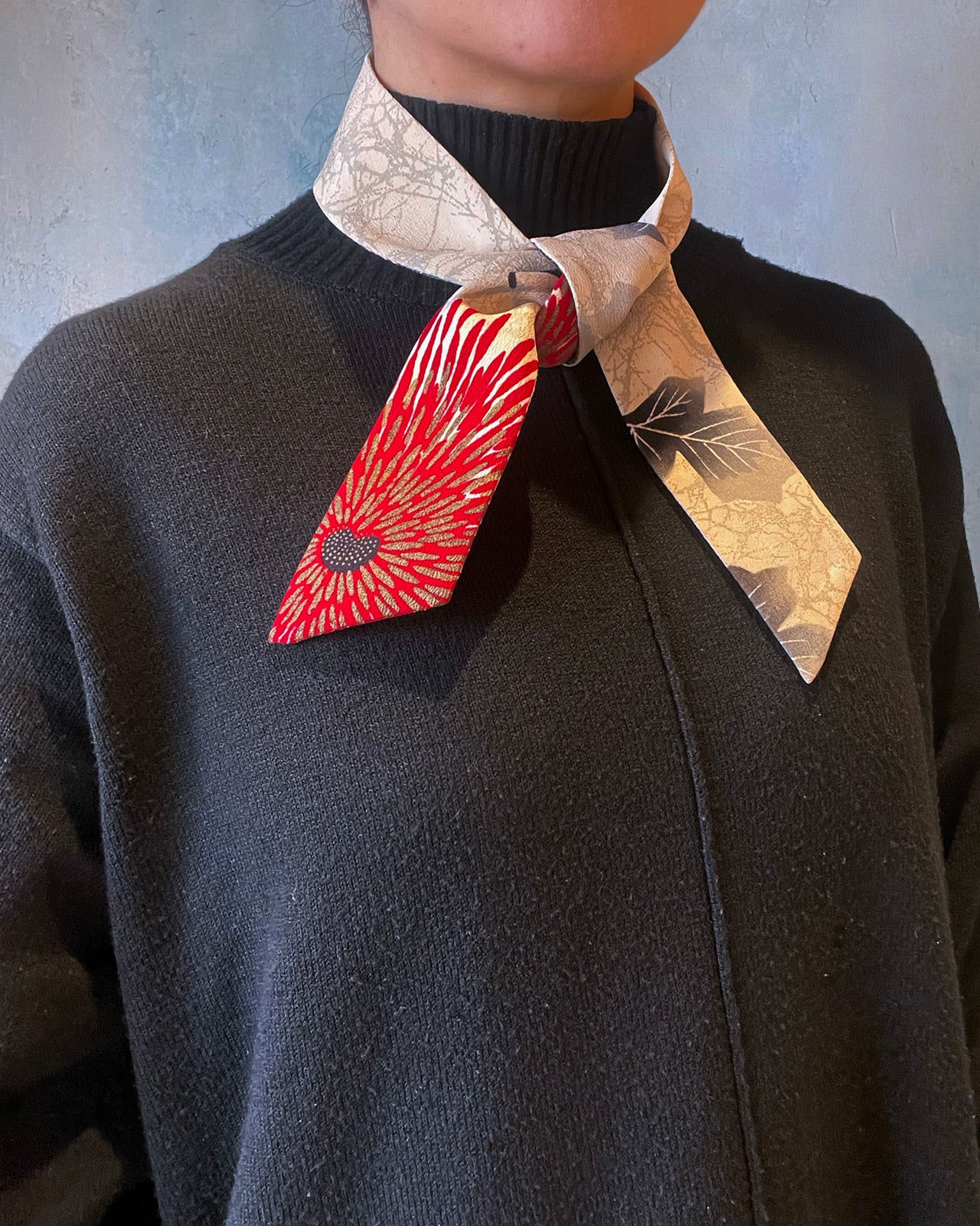 A genderless accessory created from WAFU, traditional Japanese kimono textiles. Wear it as a scarf, necktie, hair accessory, or bag accent. A wearable object that exists beyond trends.