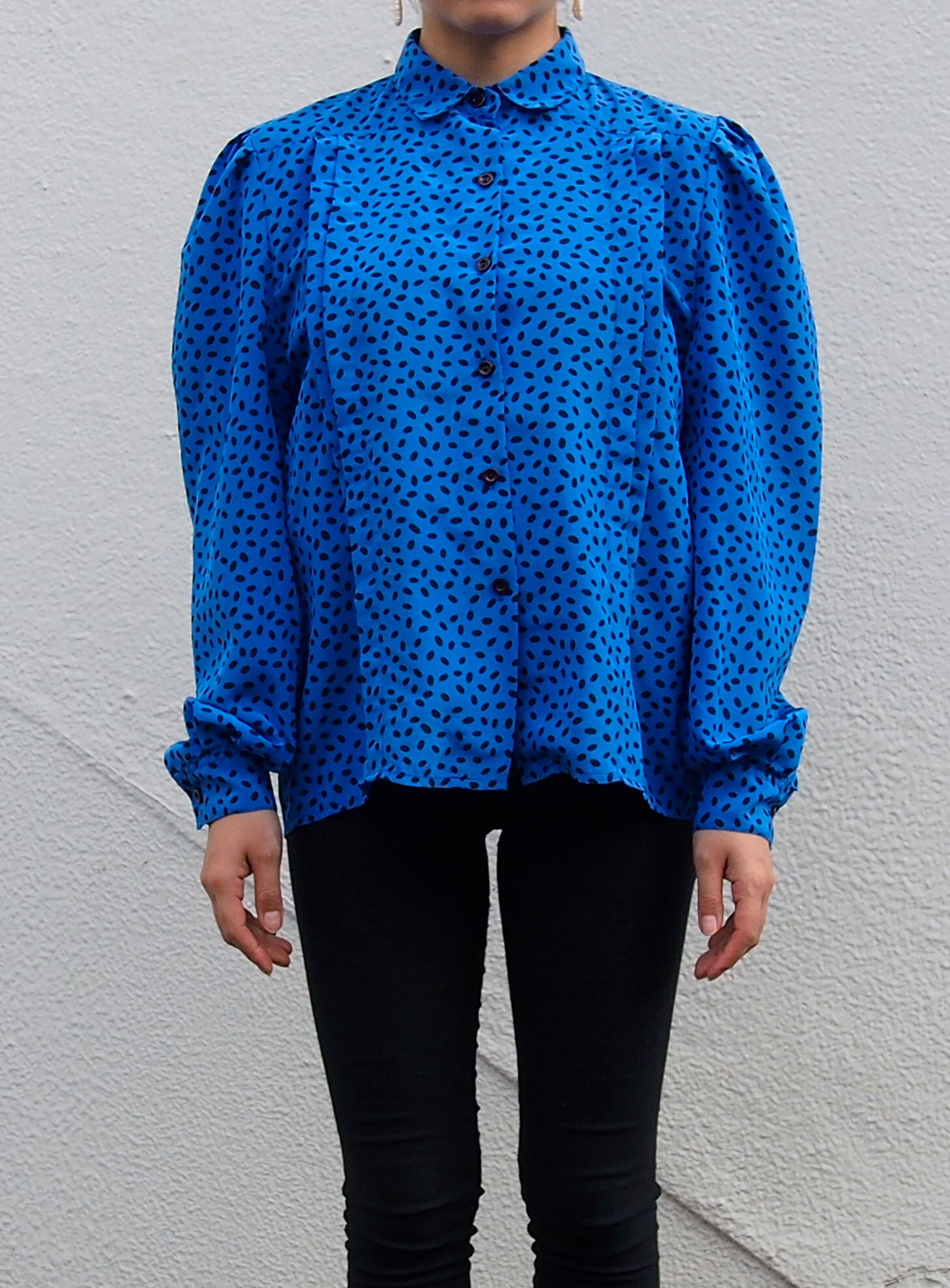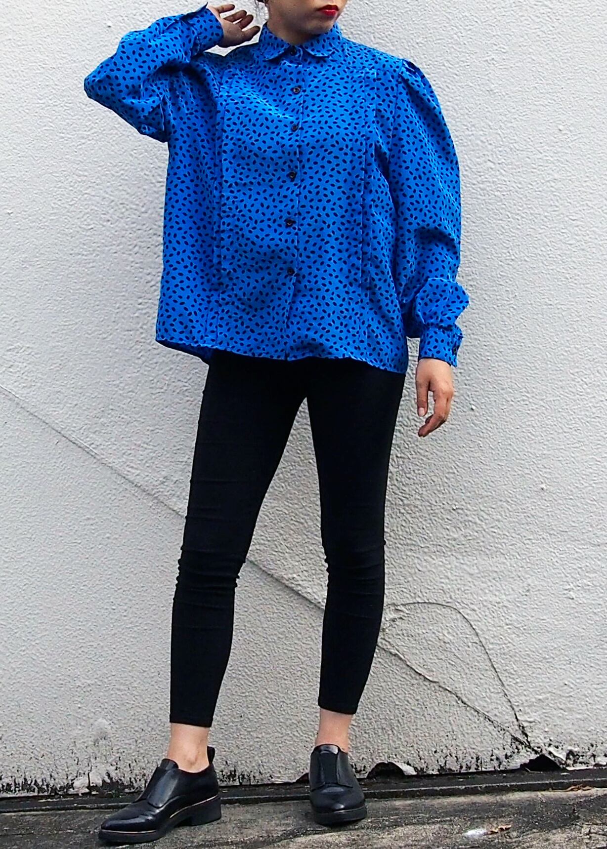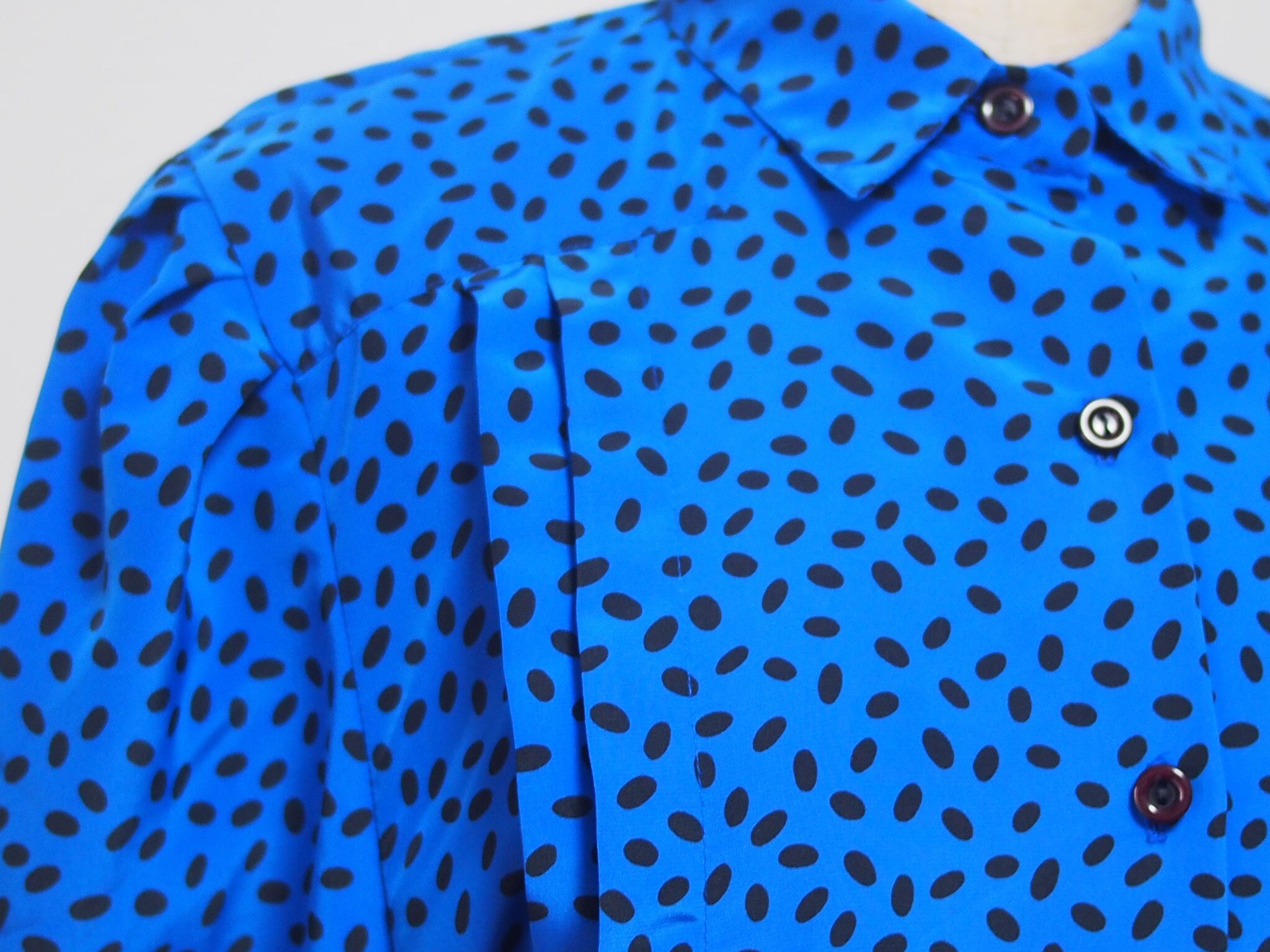 鮮かなブルーにポルカドットがモードな雰囲気を引き出してくれる一枚です。素材もサラッとしていて肌触りが良いです。大きめのパフスリーブもブラウスだから可愛く着こなせます。タックのデザイン等、シルエットにこだわった一枚となっております。