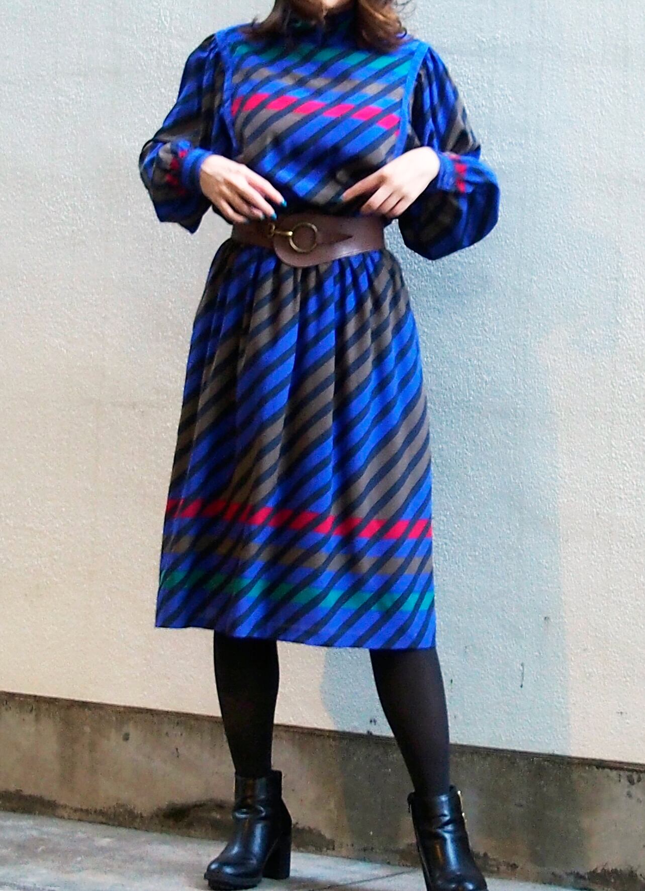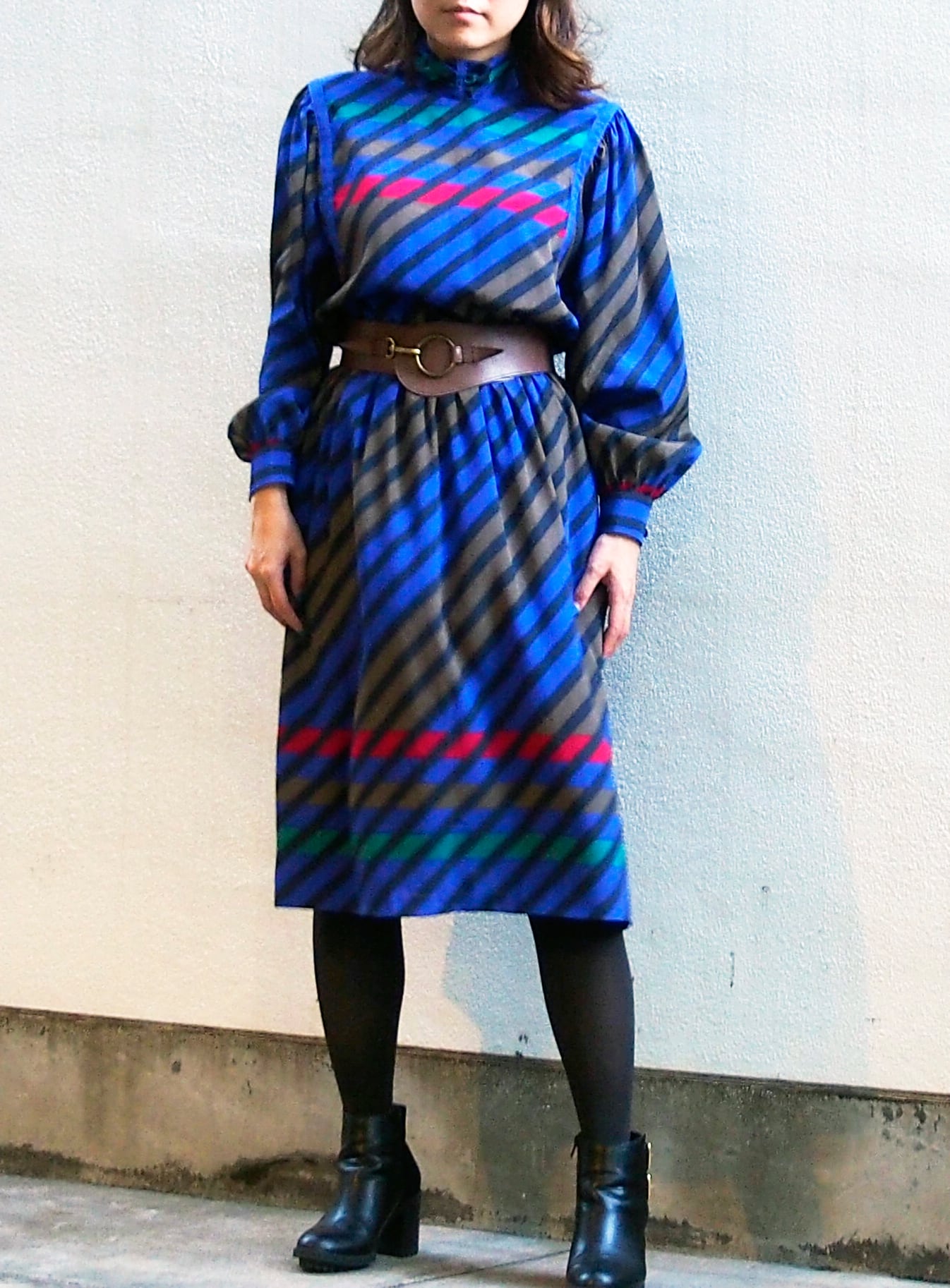 パープルとブラウンカラーのストライプが目を引く雰囲気のあるロングドレス。