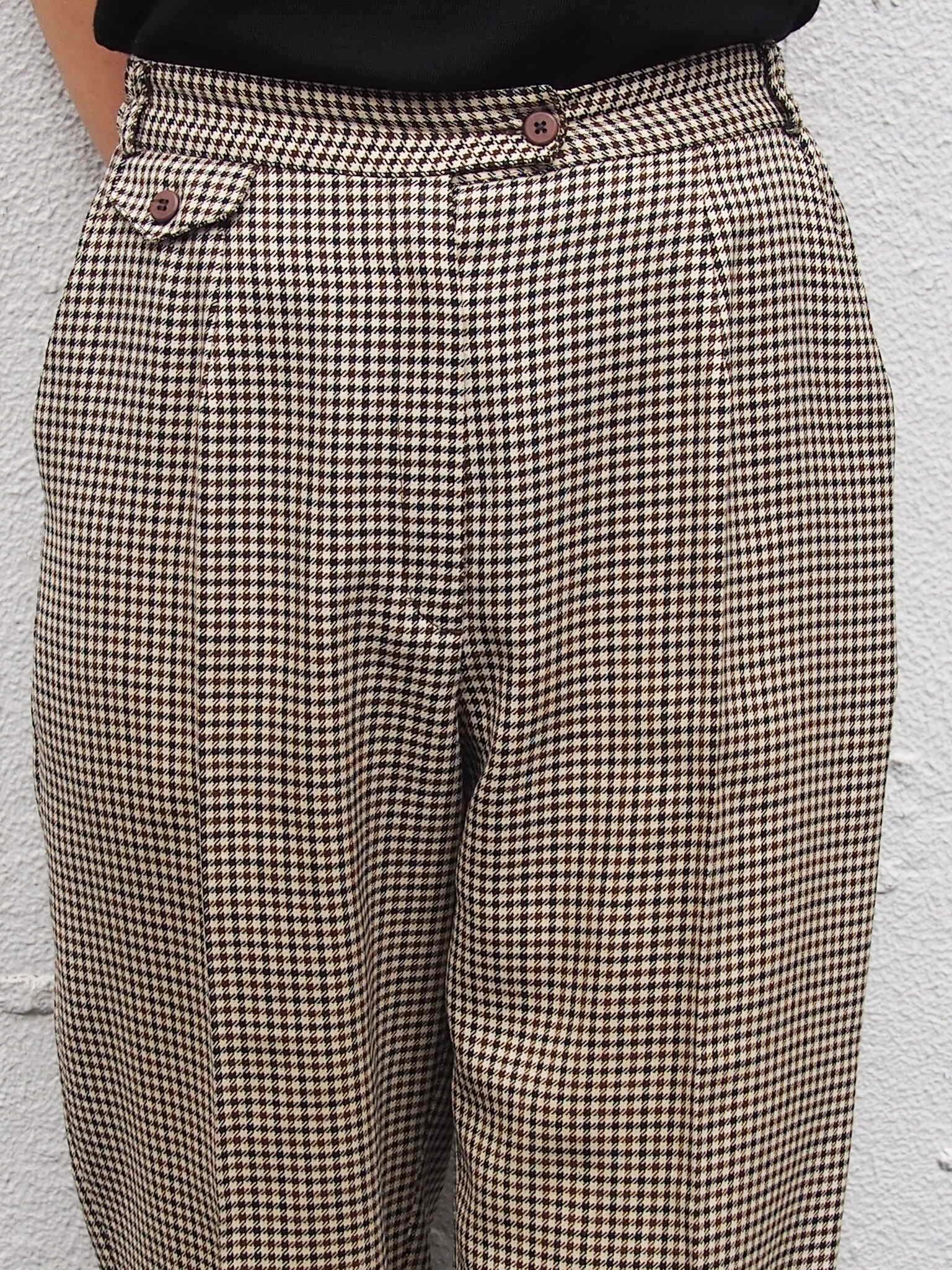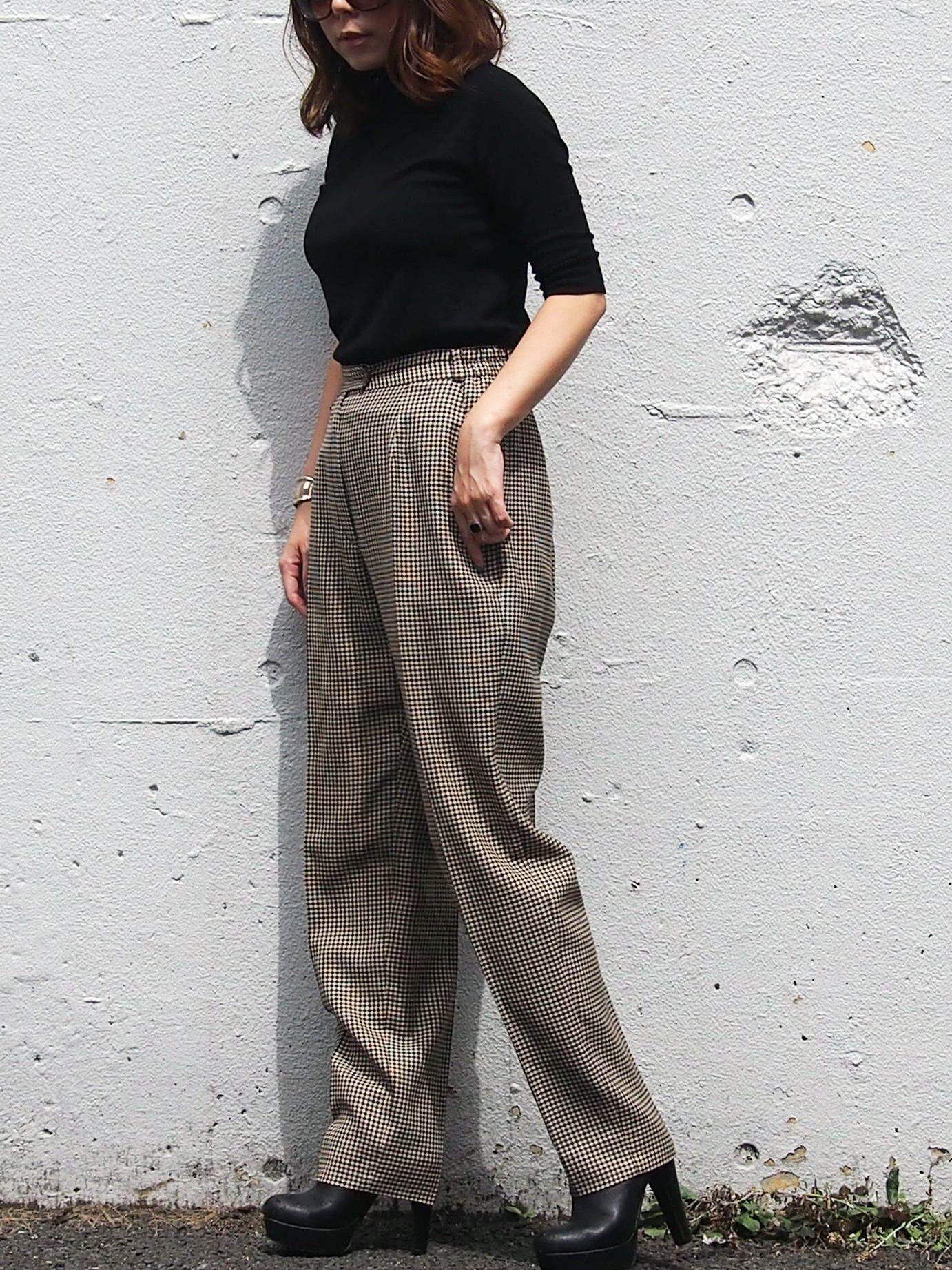 ブラウンカラーの細かい格子チェックなので、カジュアルにTシャツでも、ブラウスでも、大人な雰囲気で着こなせるパンツです。