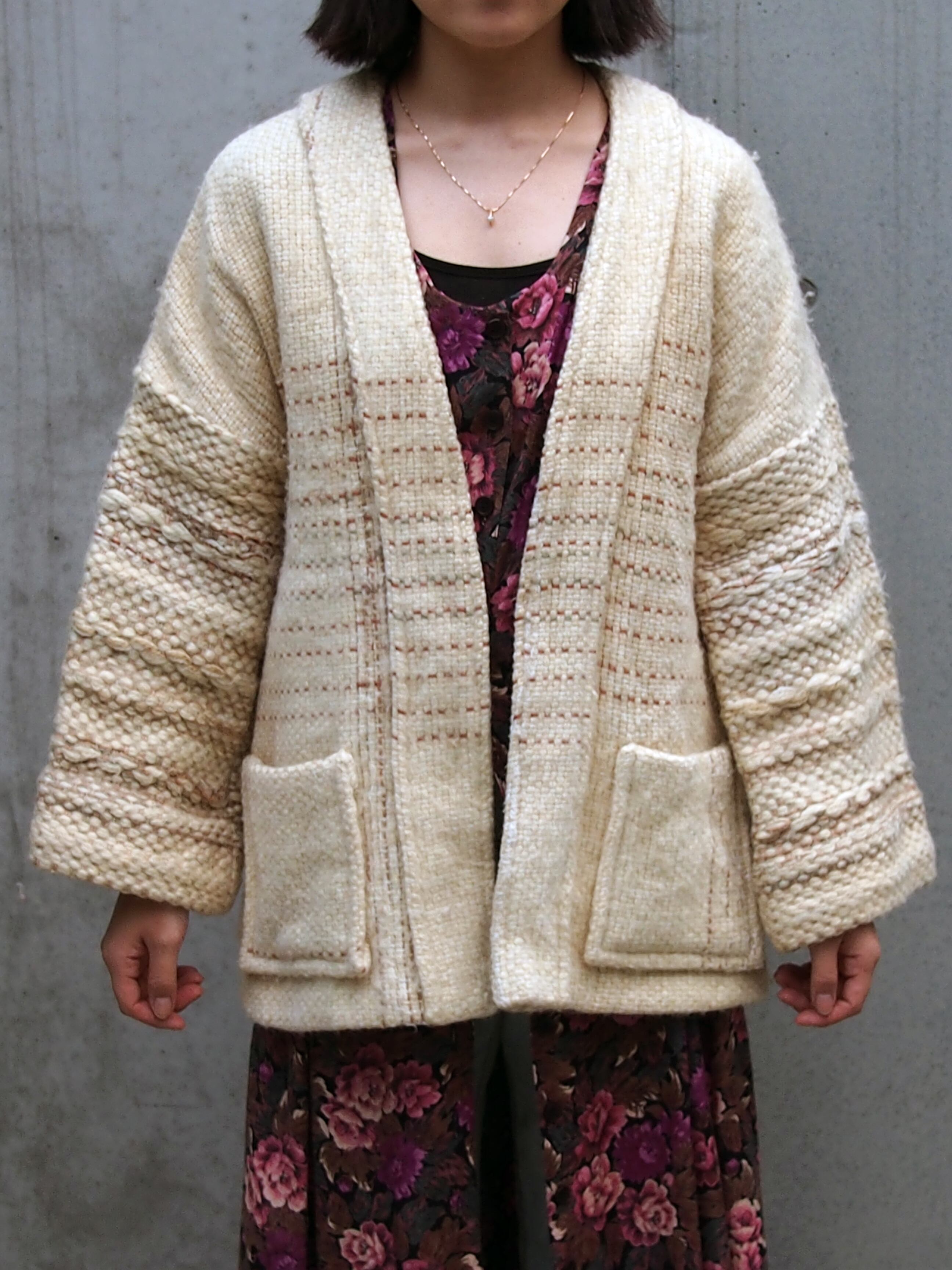ホワイトとオフホワイトベースのミックスニットあみガウンです。