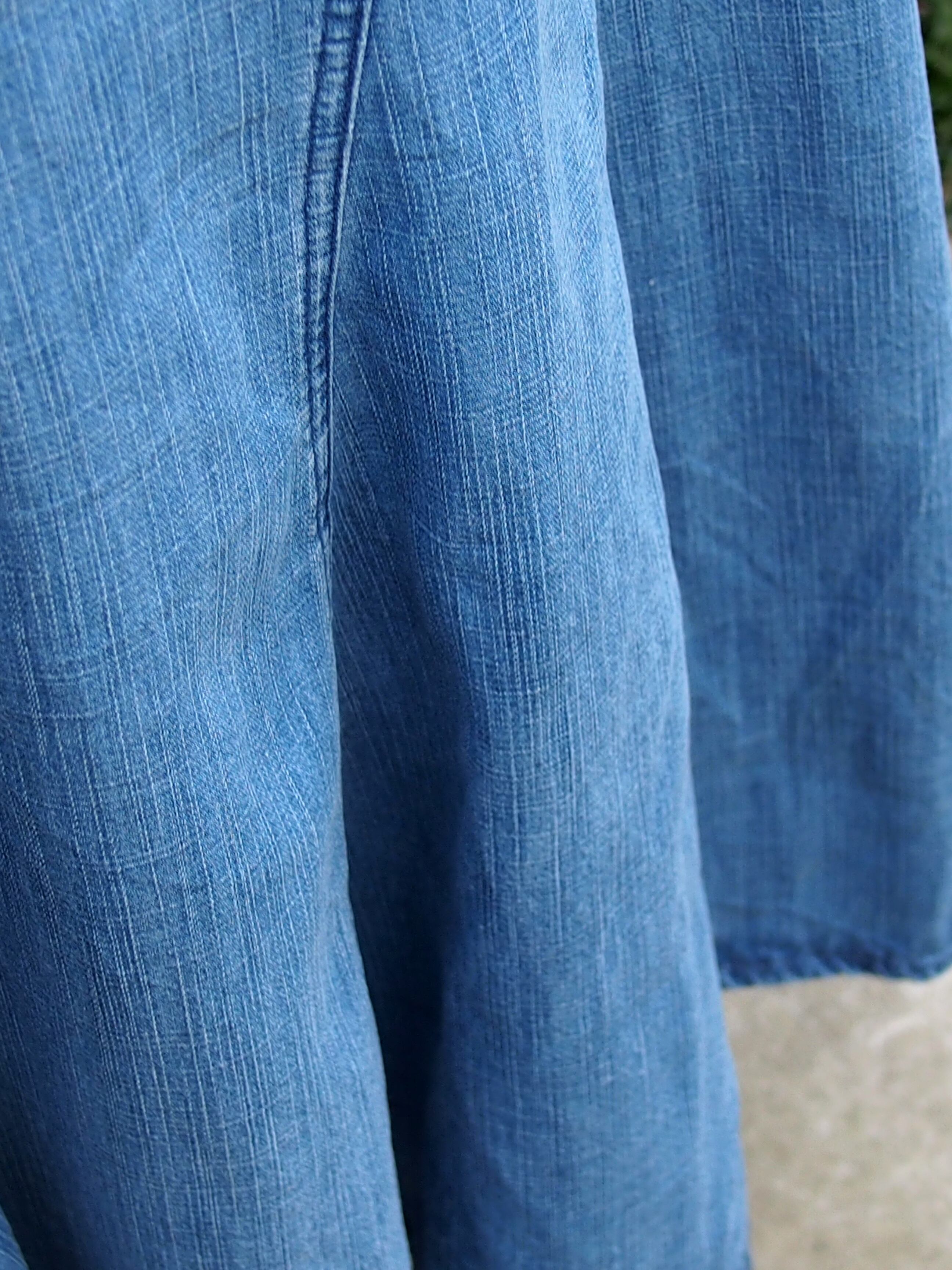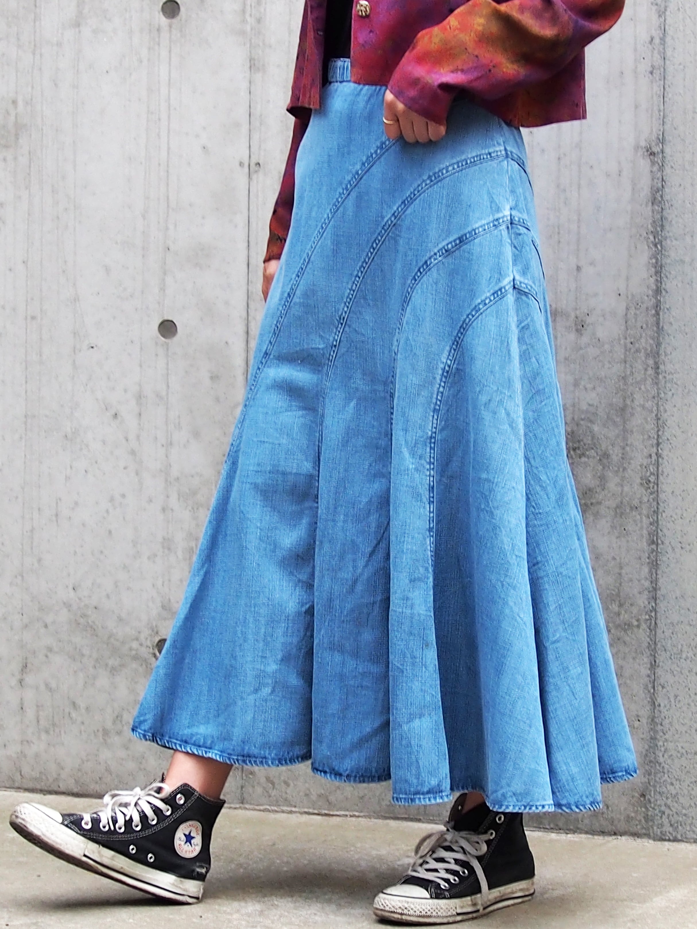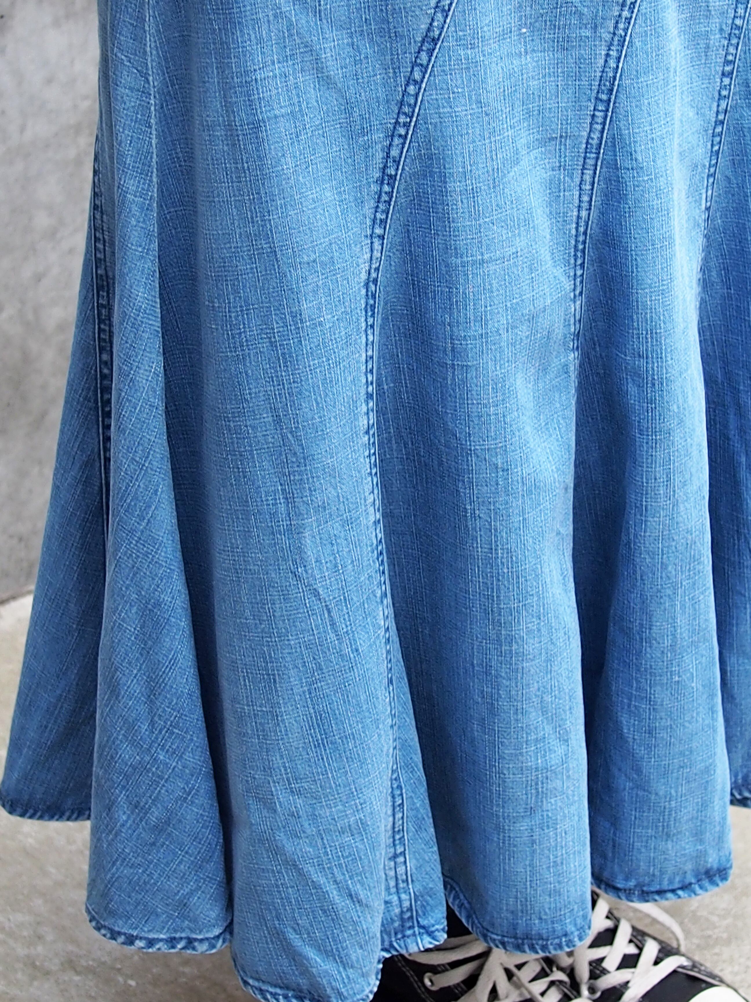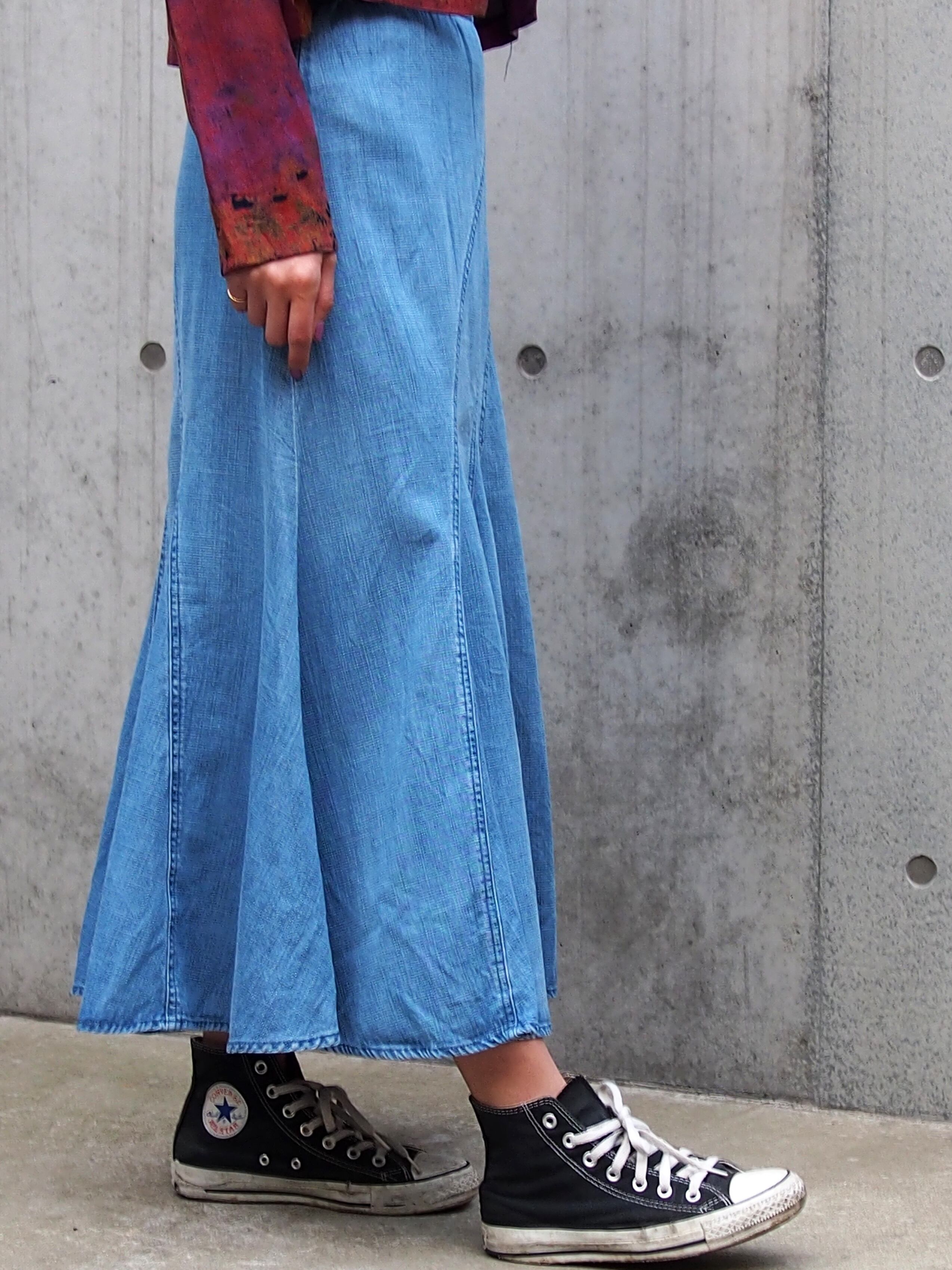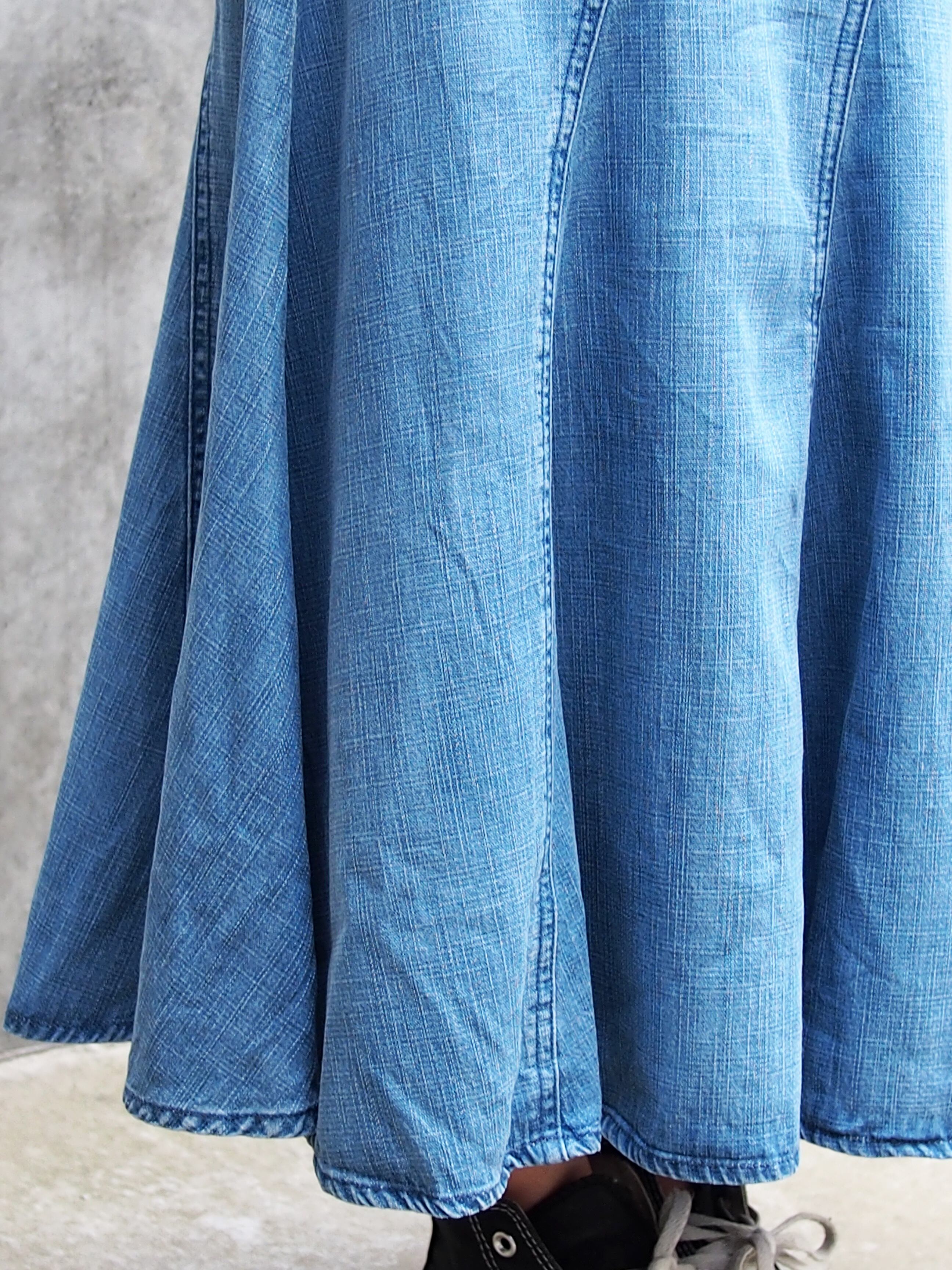 柔らかなデニム素材なのもまたポイントになり、動くとなびいた際のシルエットは女性の上品な雰囲気を漂わせます。