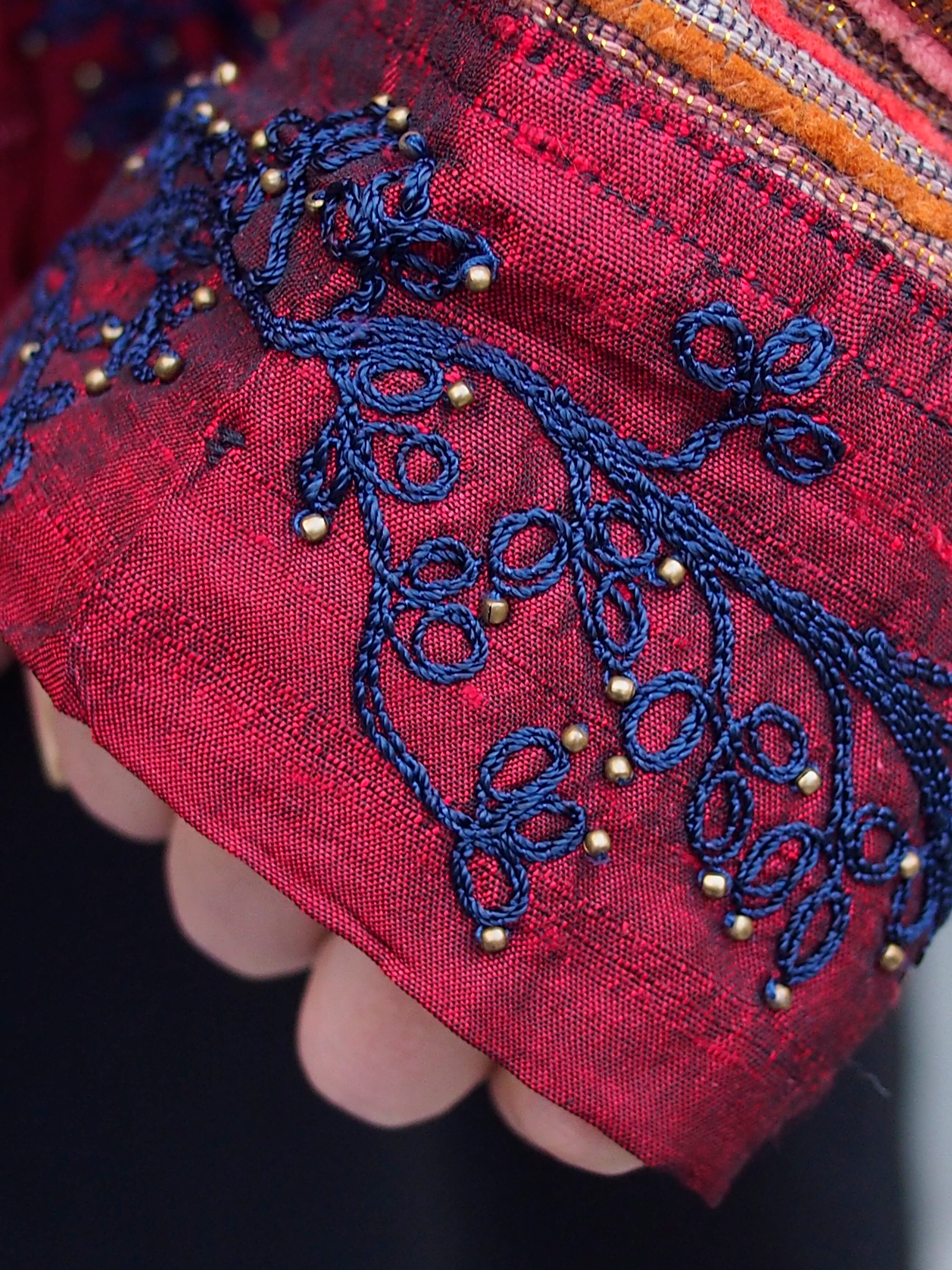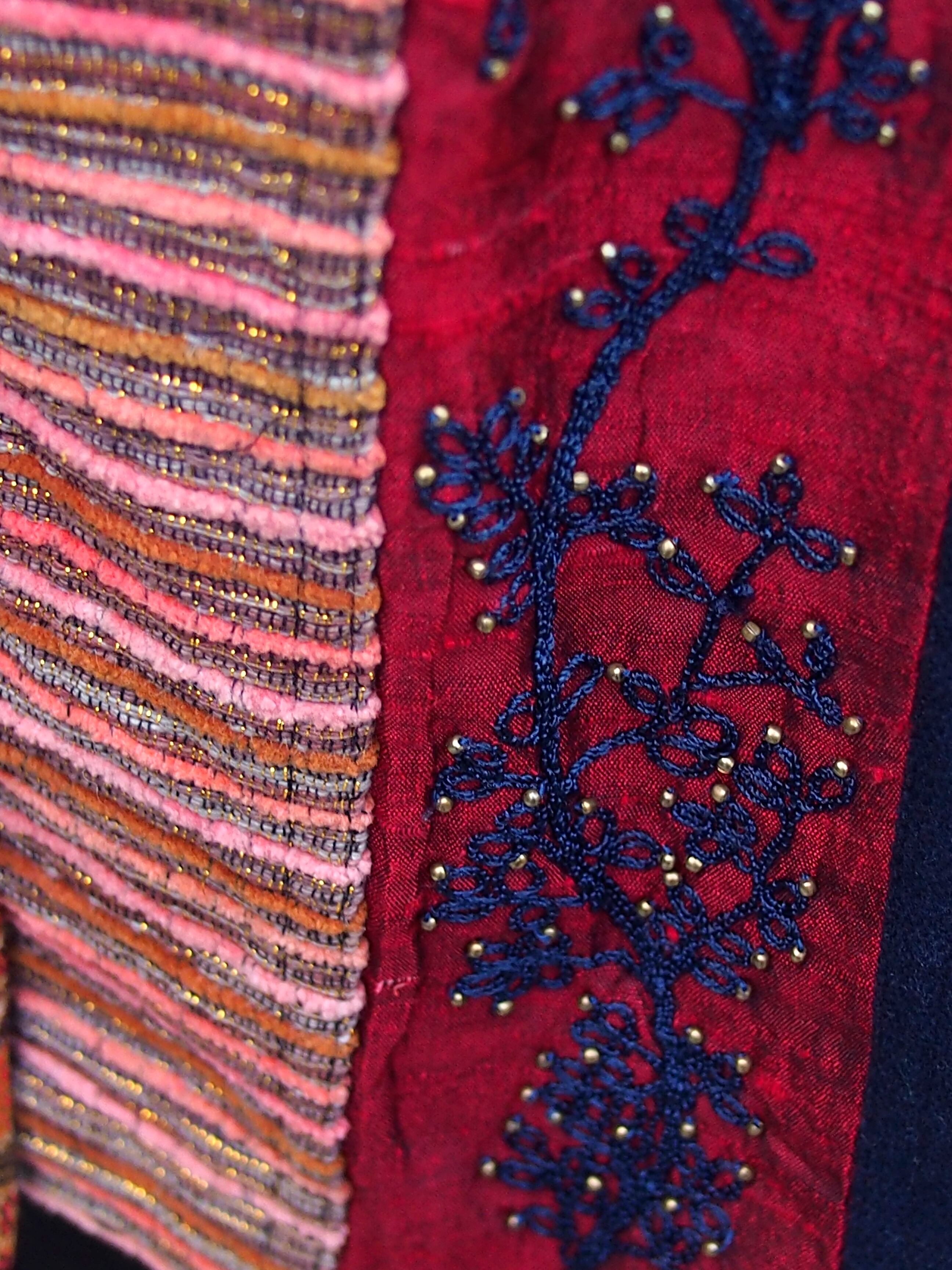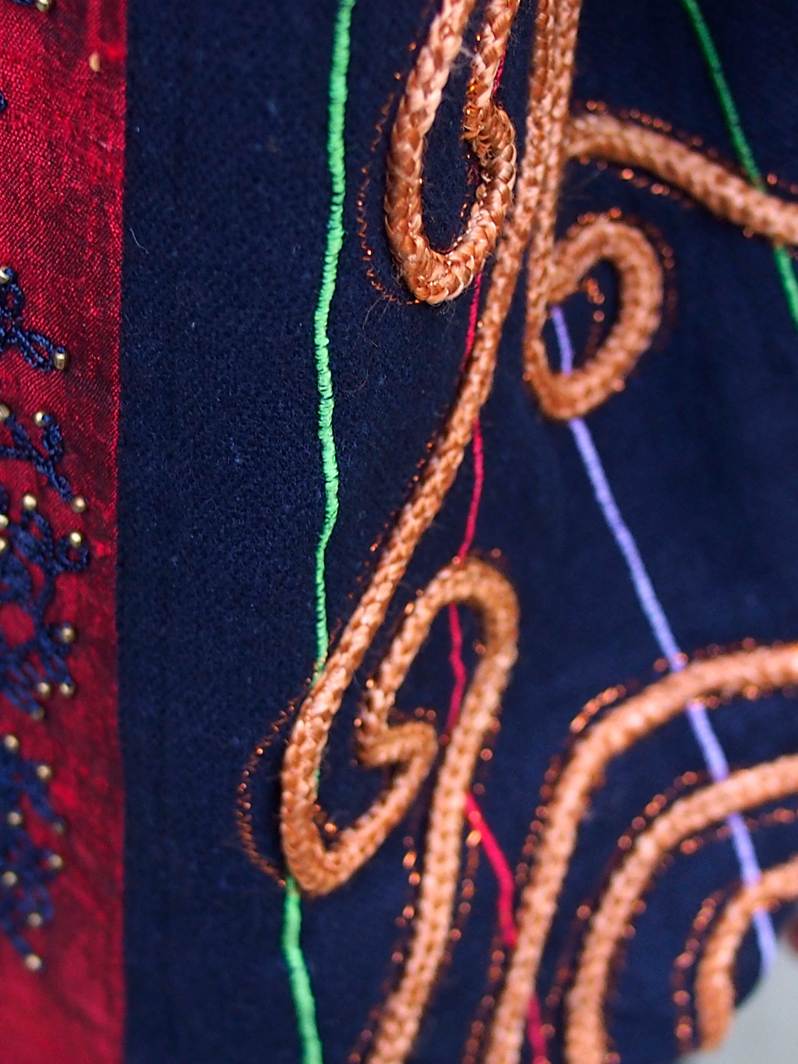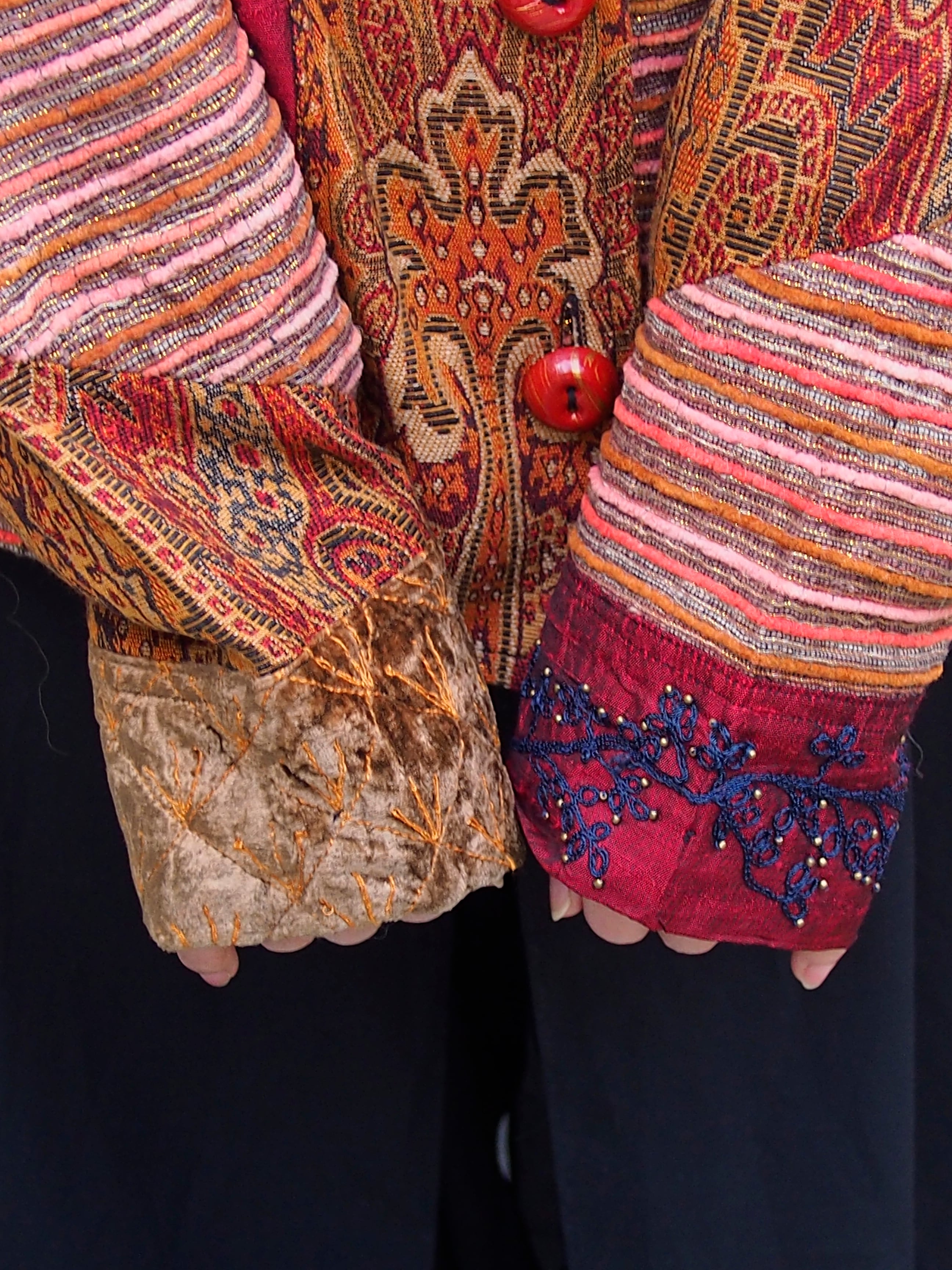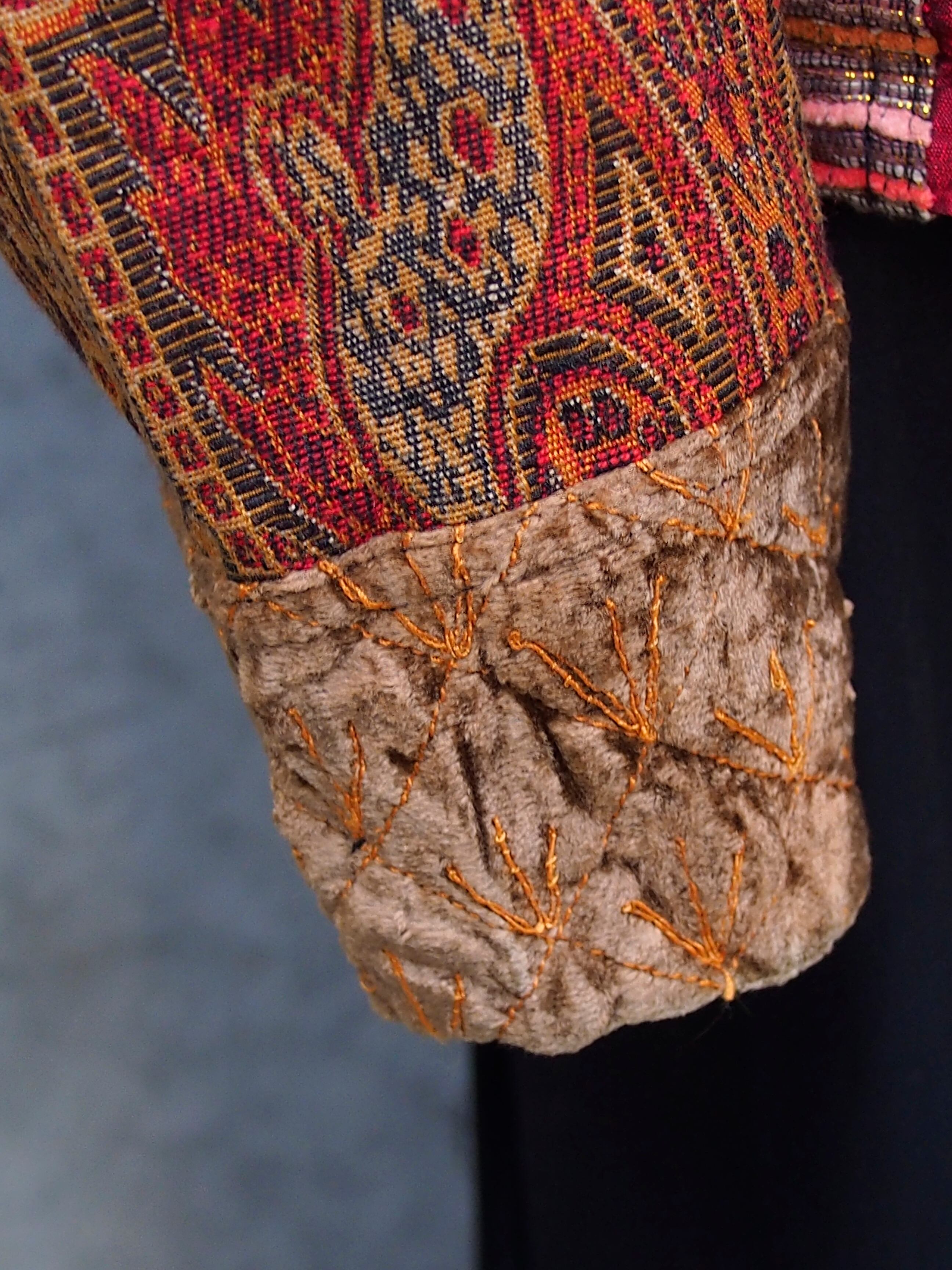 色々な素材の生地が使用されており、所々の刺繍とビジューモチーフのデザインが施されたジャケットです。