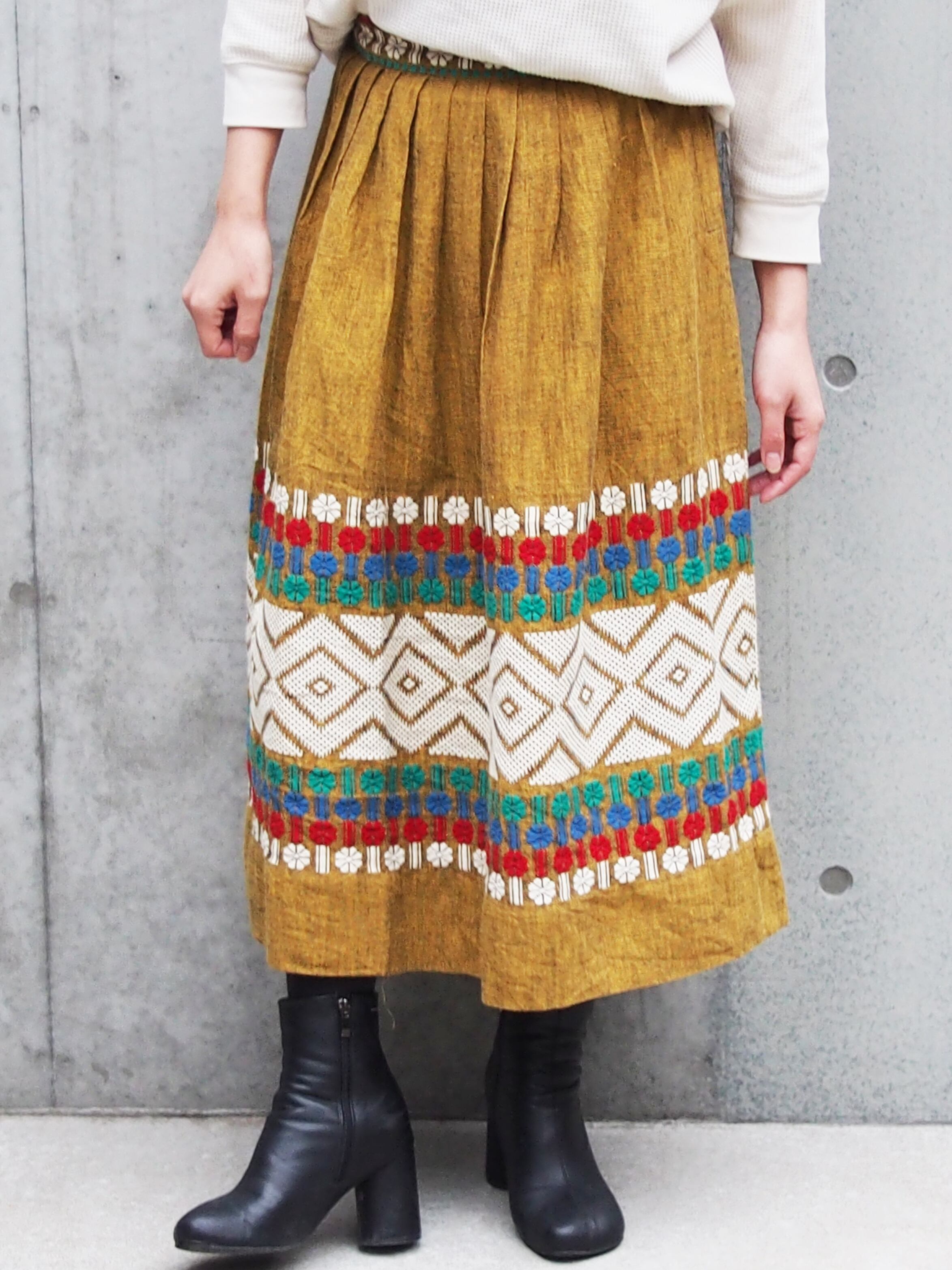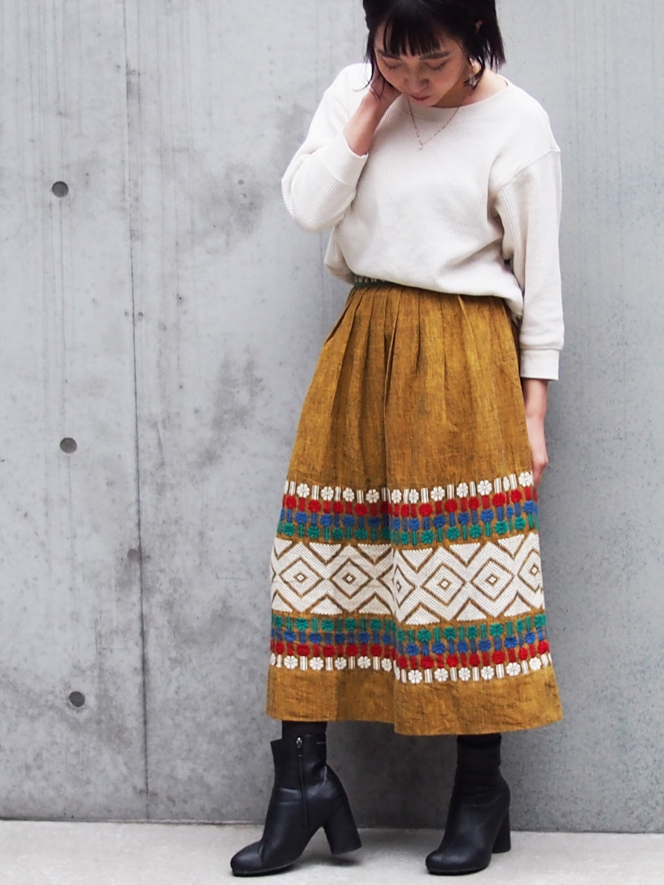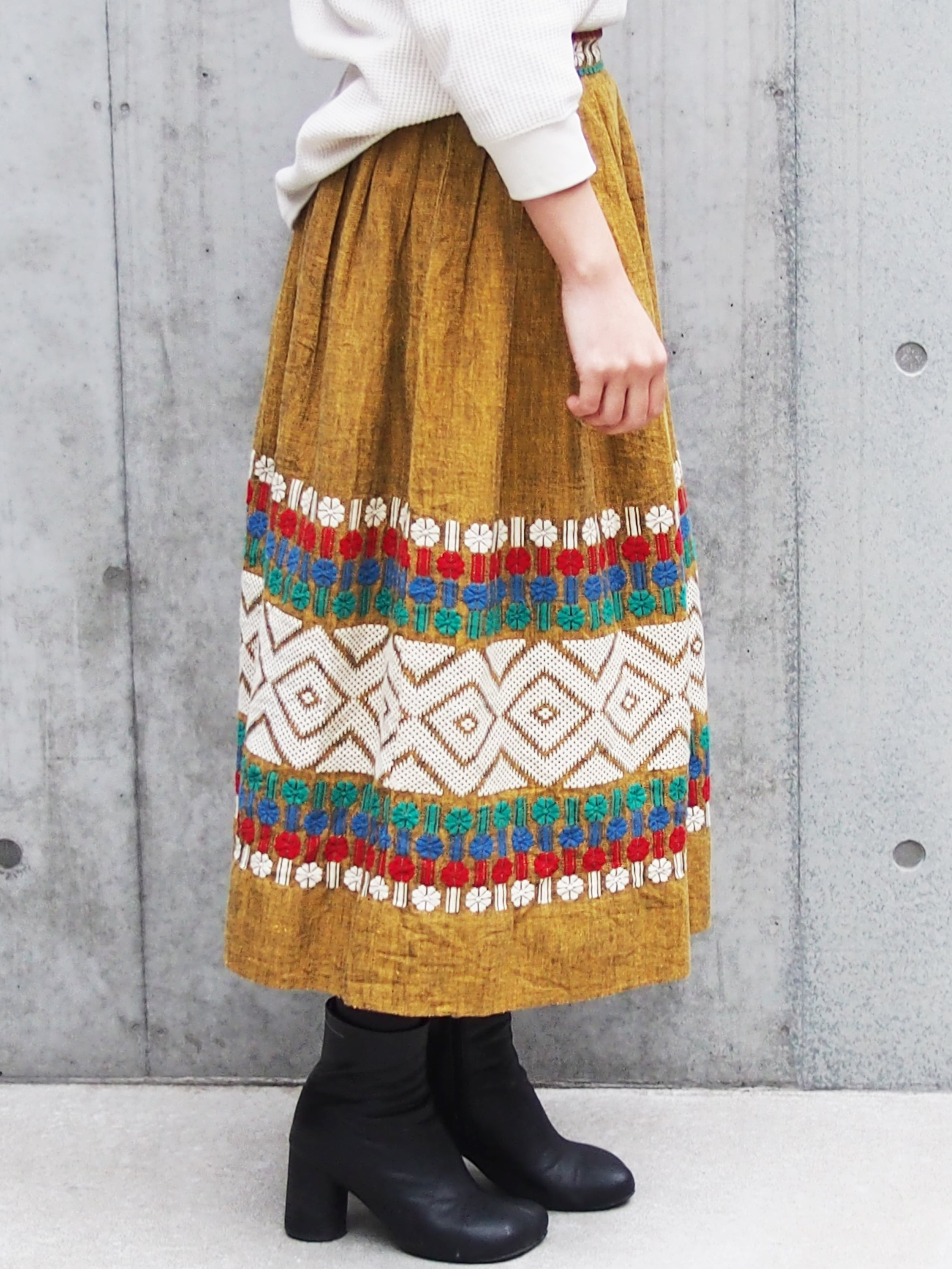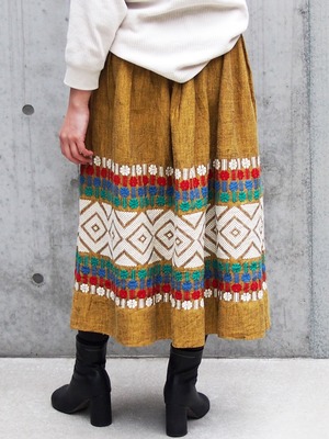 カラーのボヘミアン刺繍が目を引くボリュームスカート。
