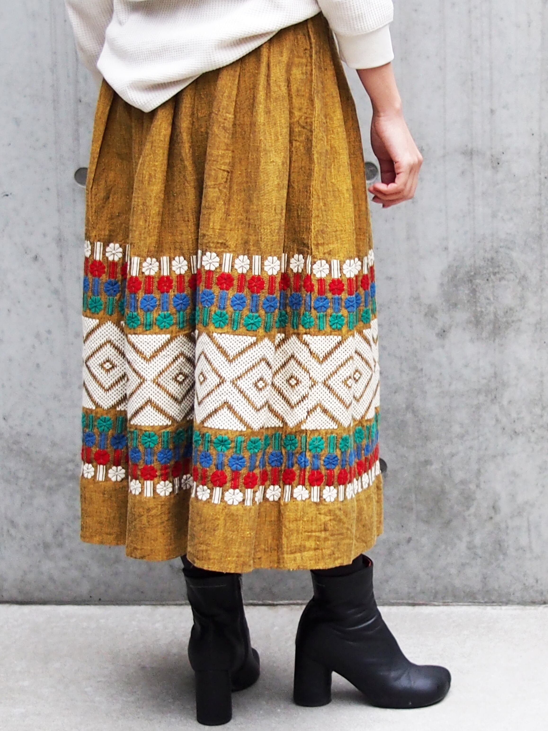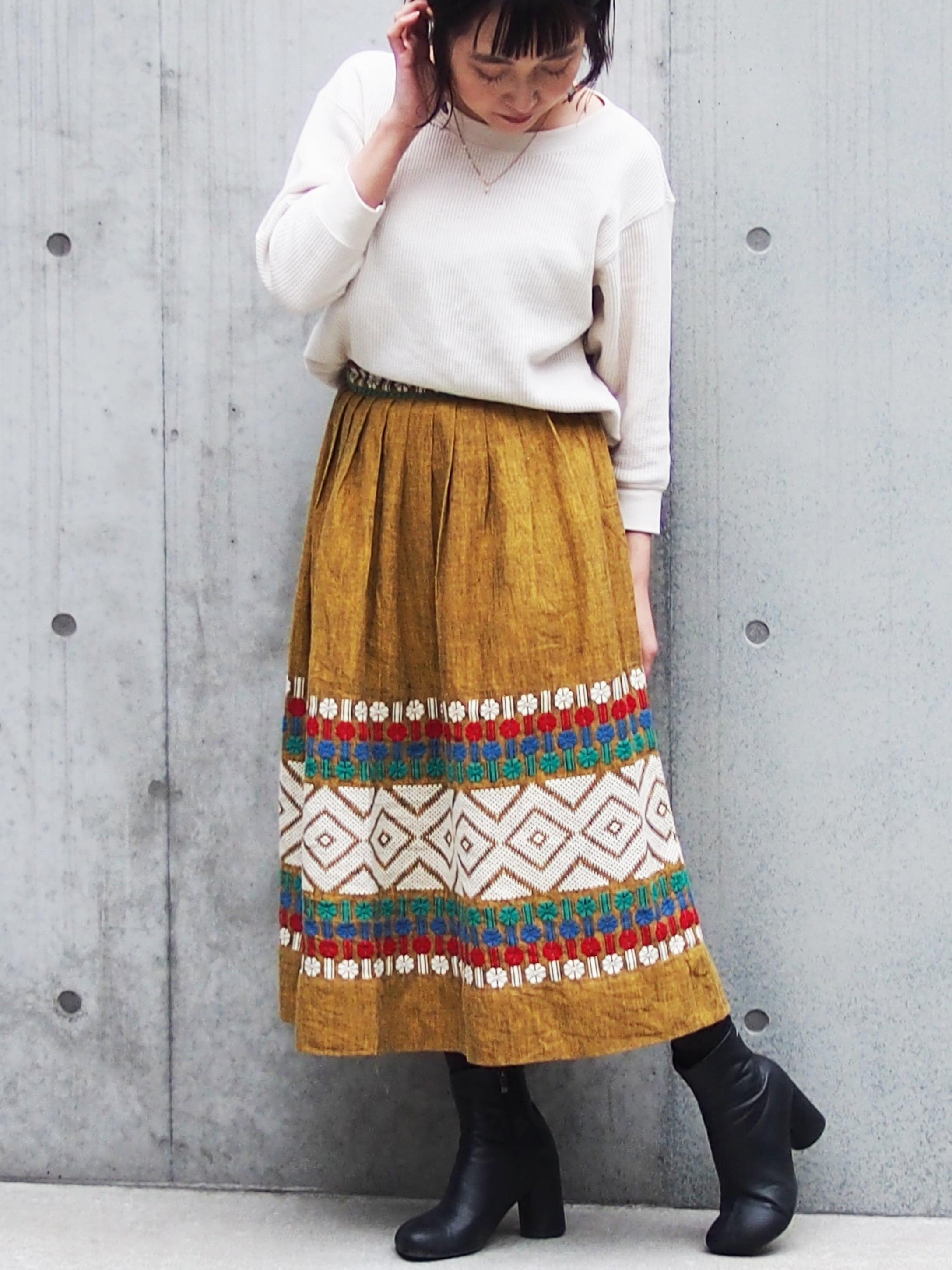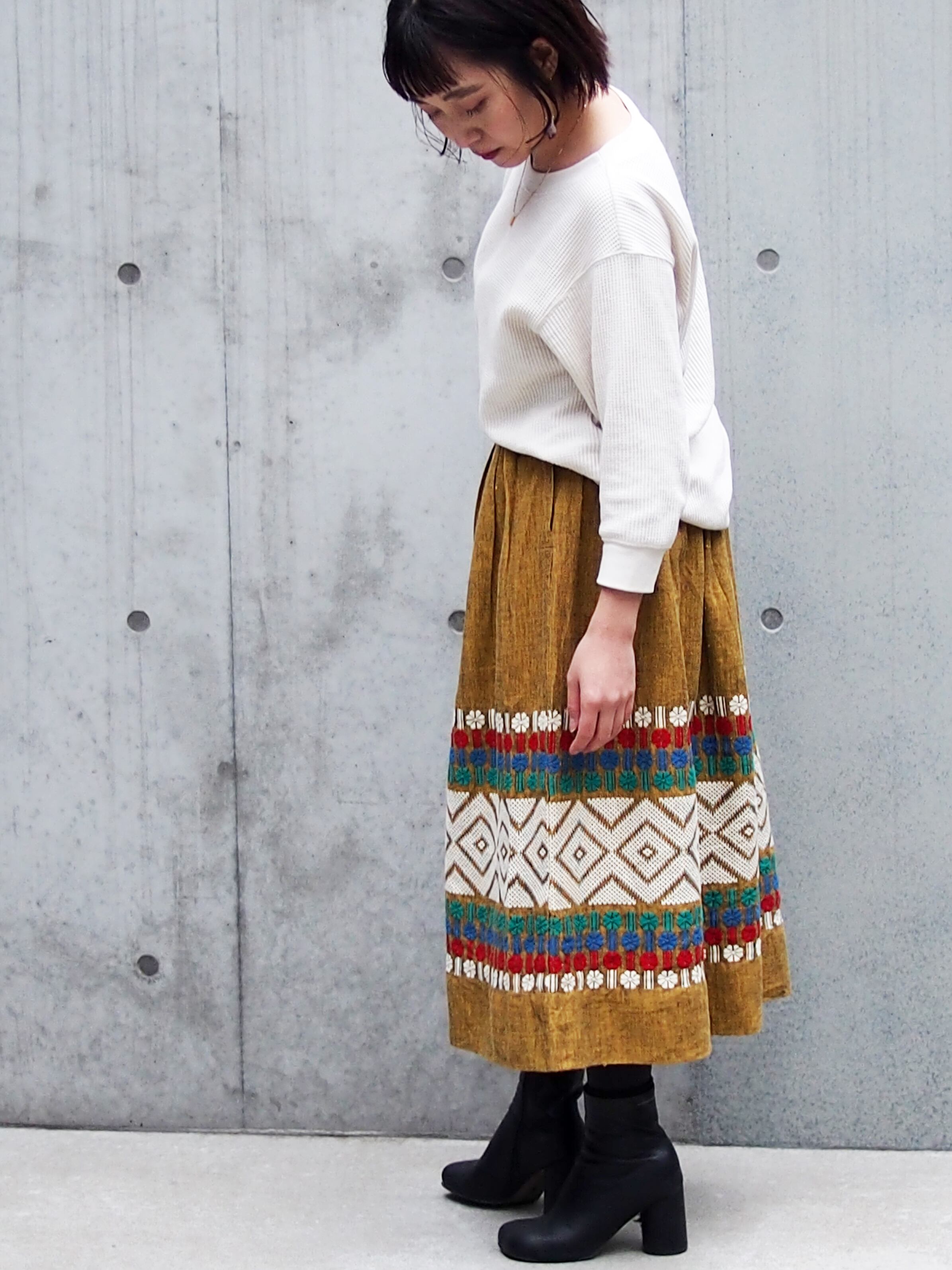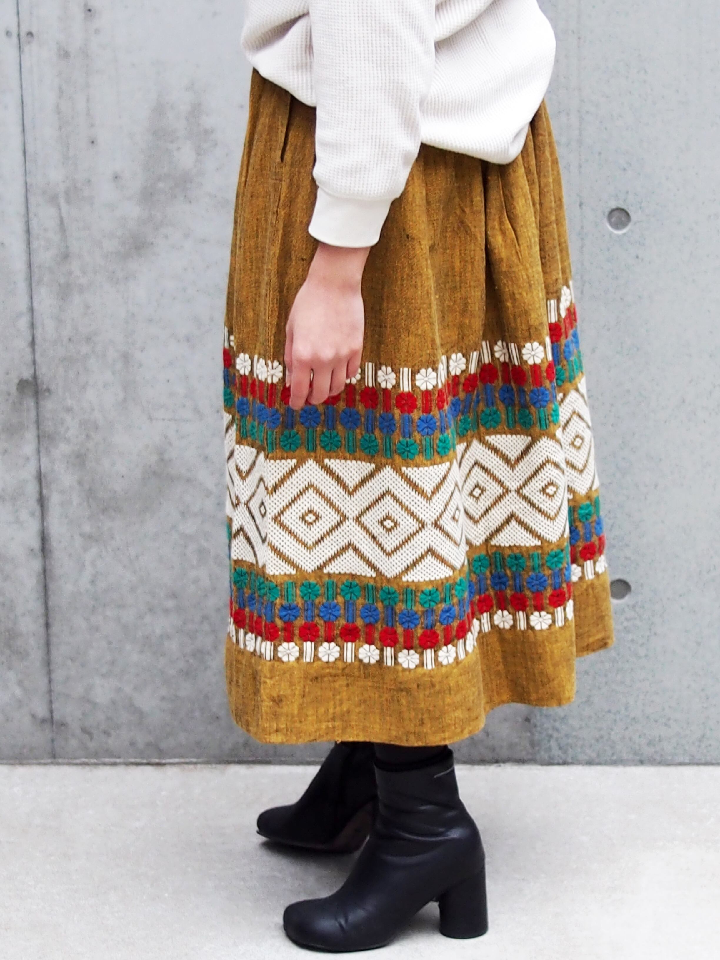 カラーのボヘミアン刺繍が目を引くボリュームスカート。