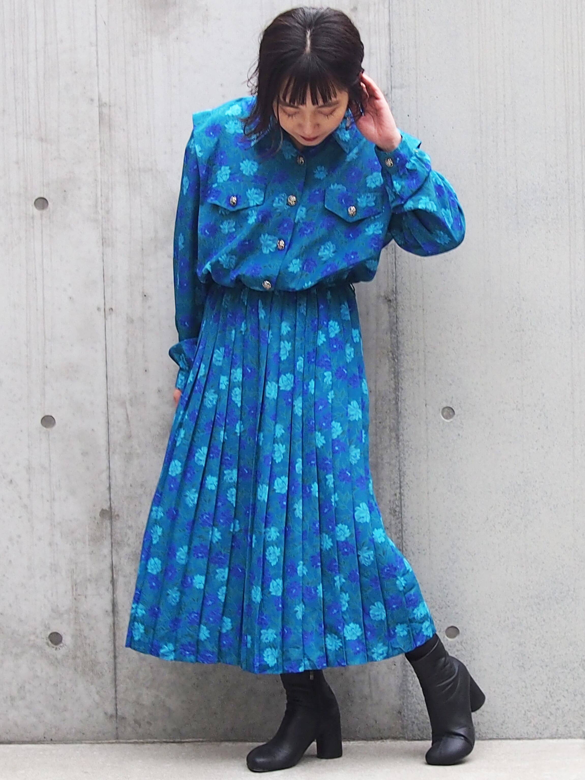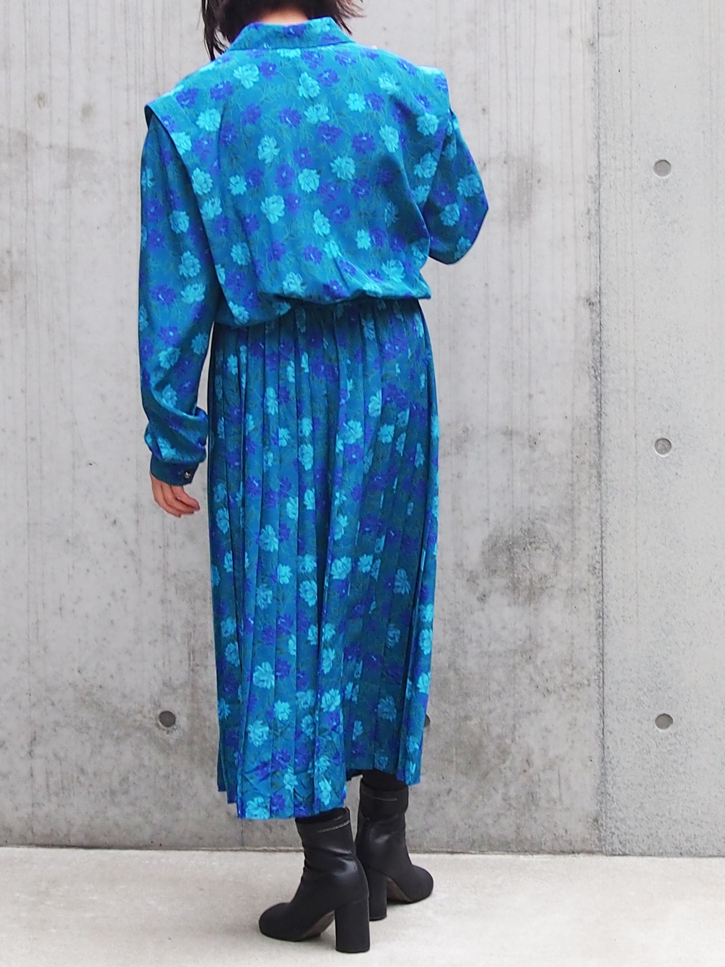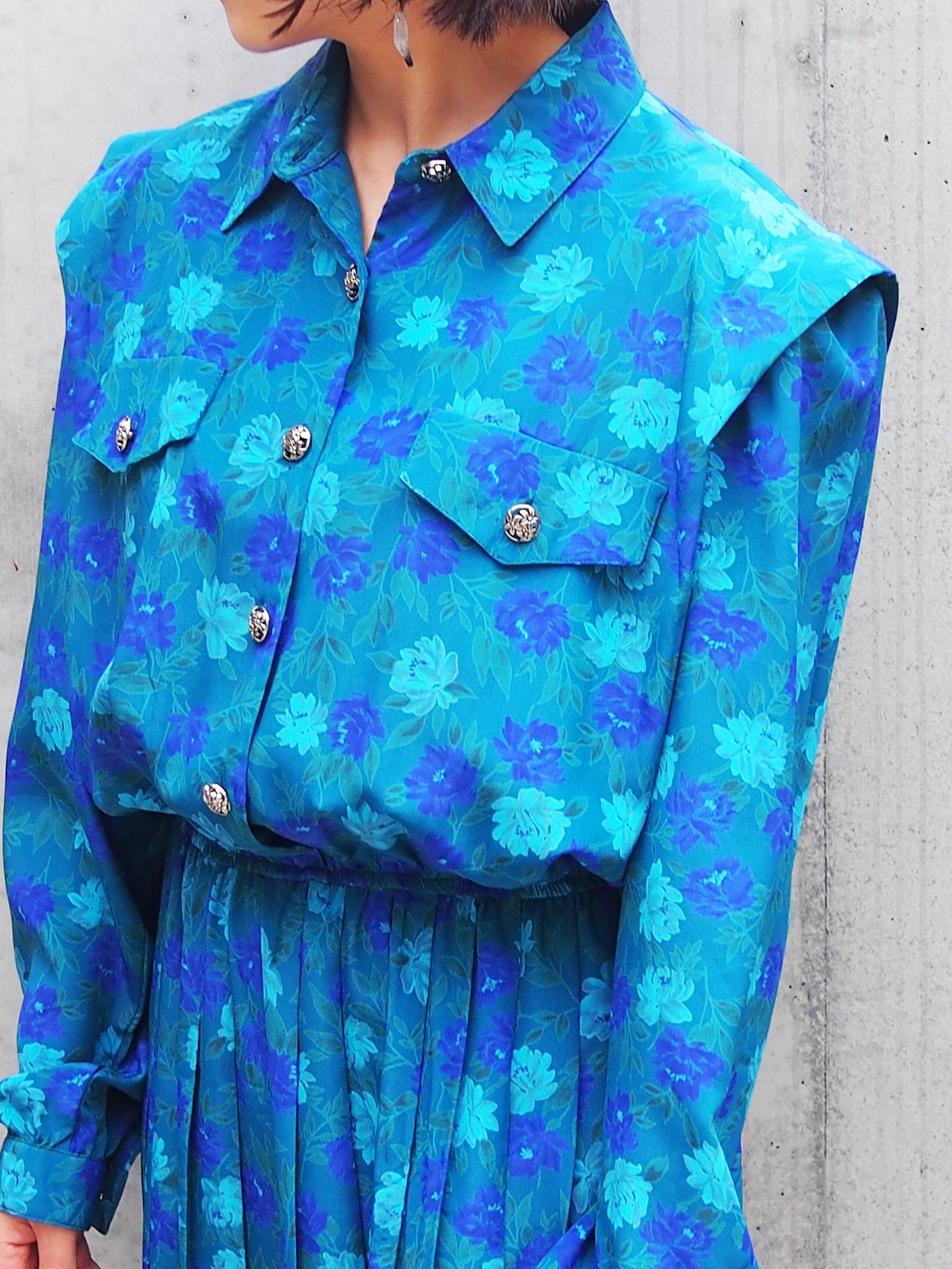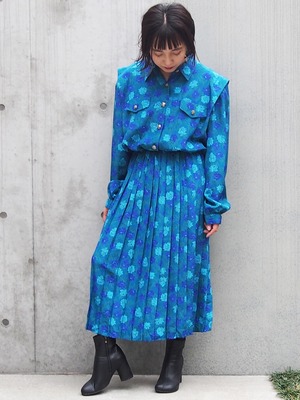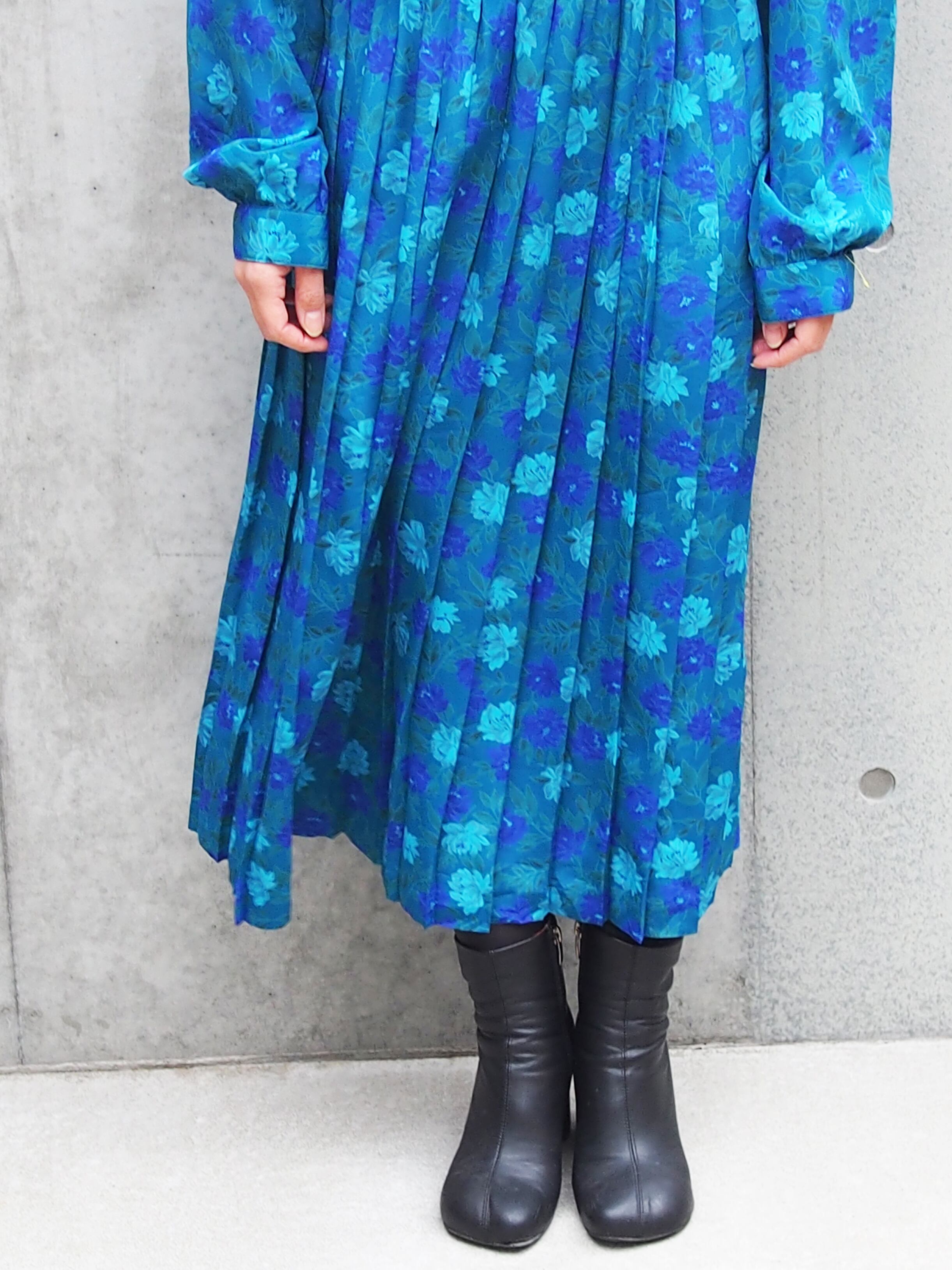 グリーンブルーベースの花柄が目を引くワンピース。