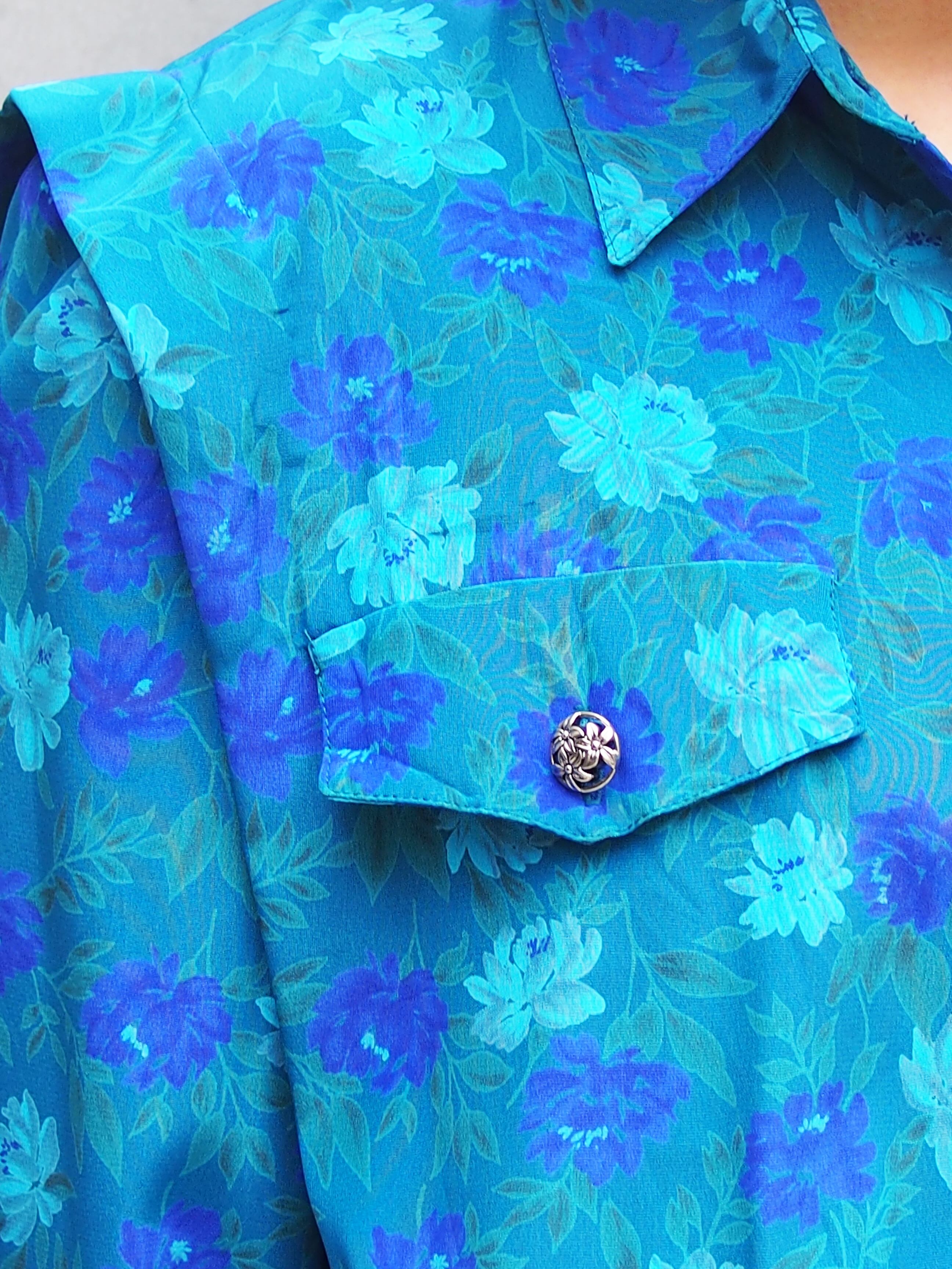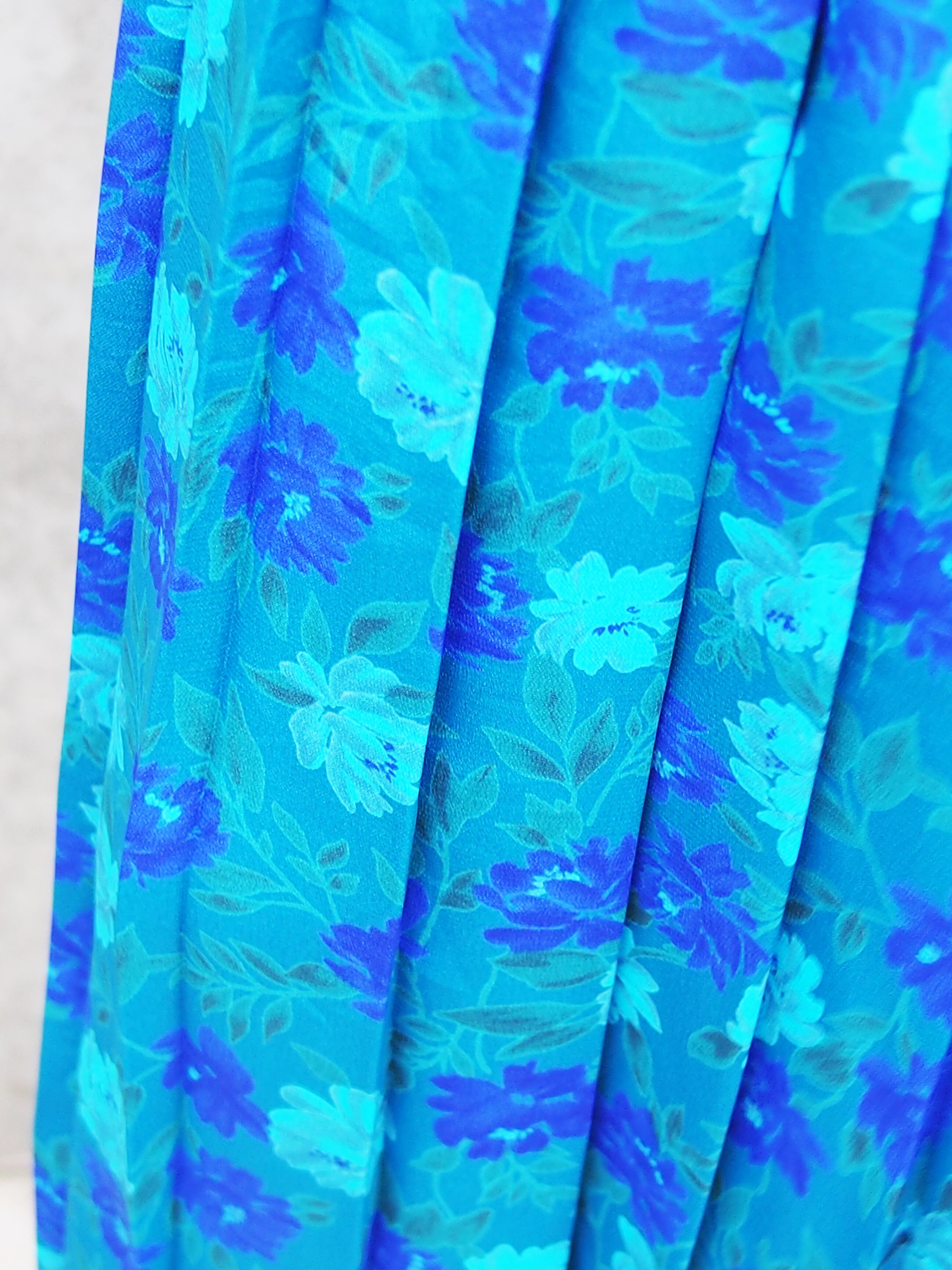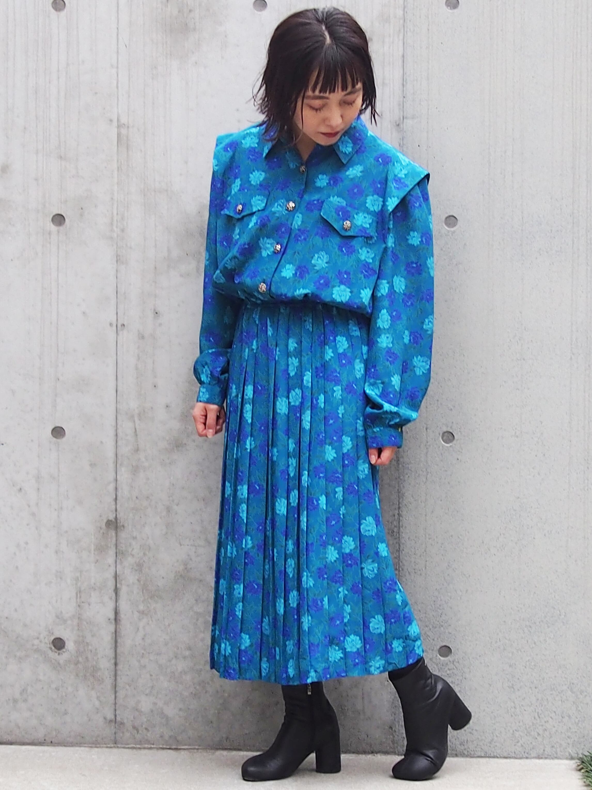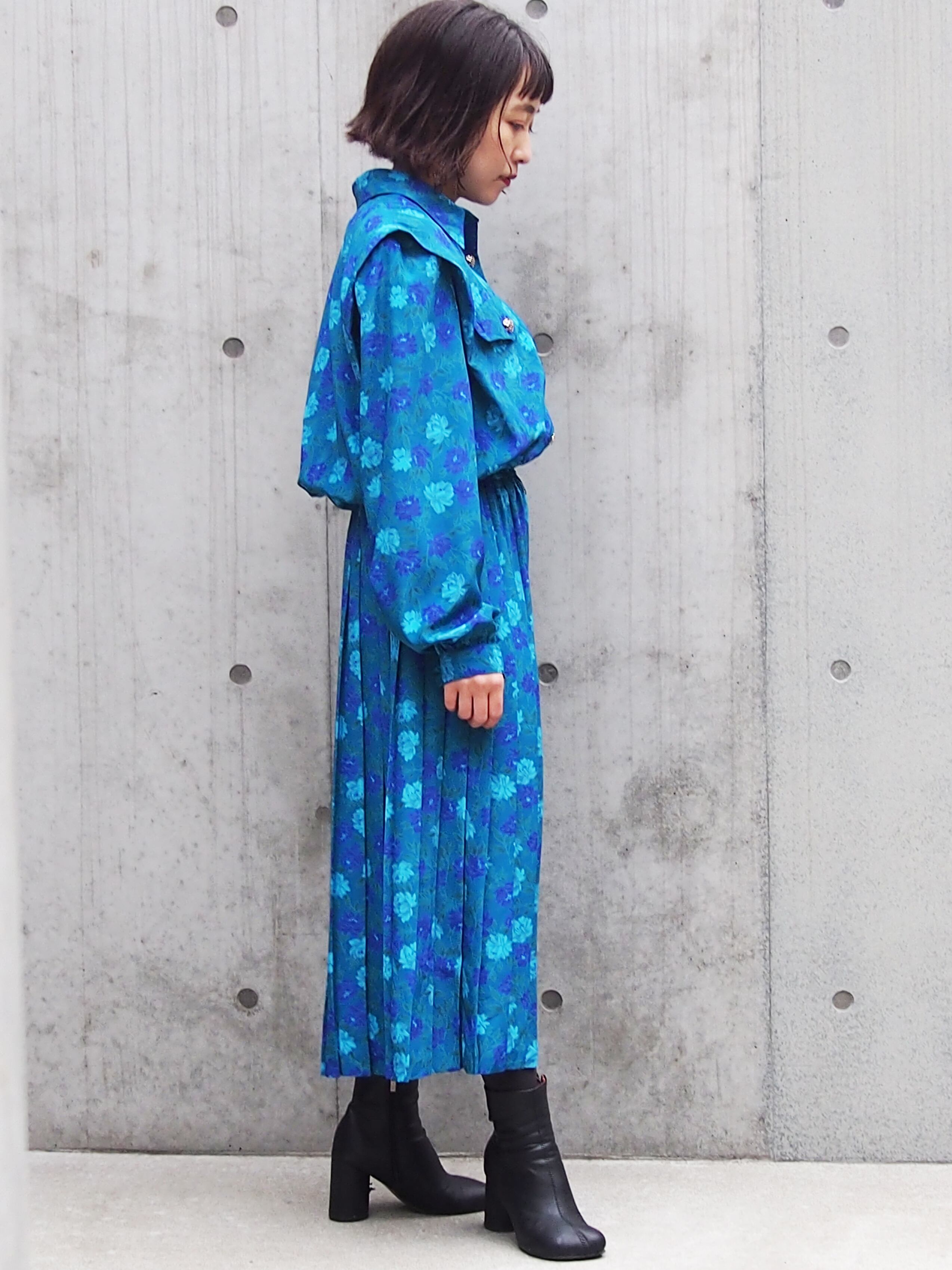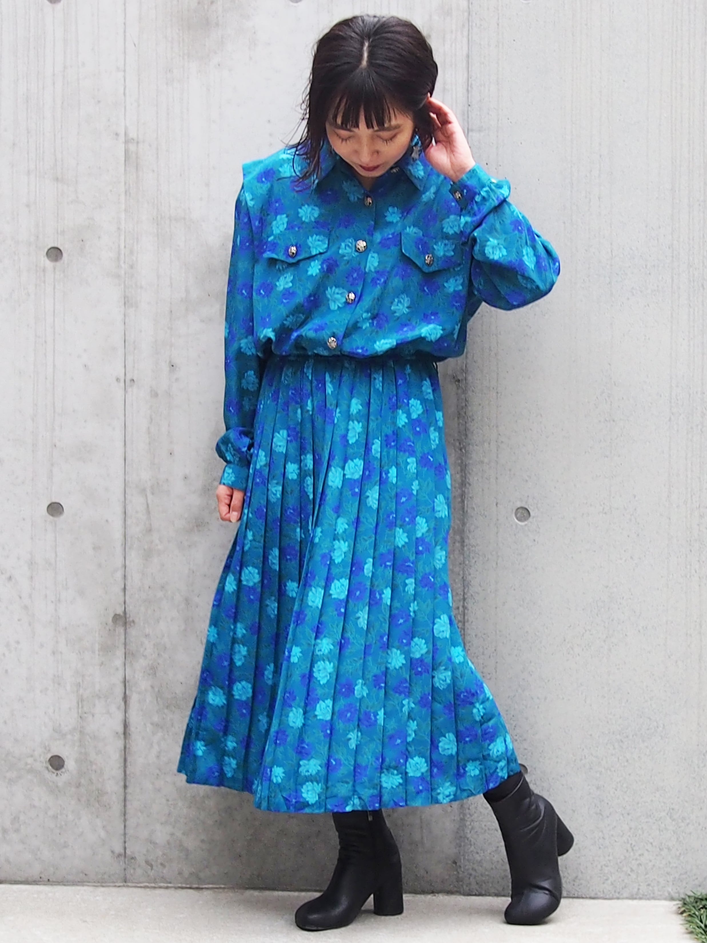 グリーンブルーベースの花柄が目を引くワンピース。