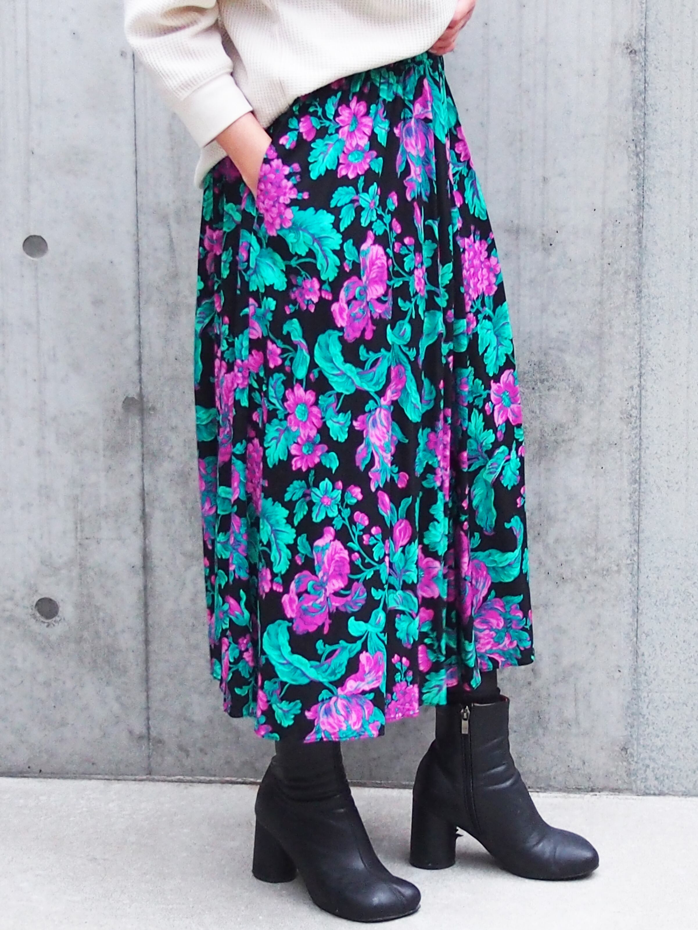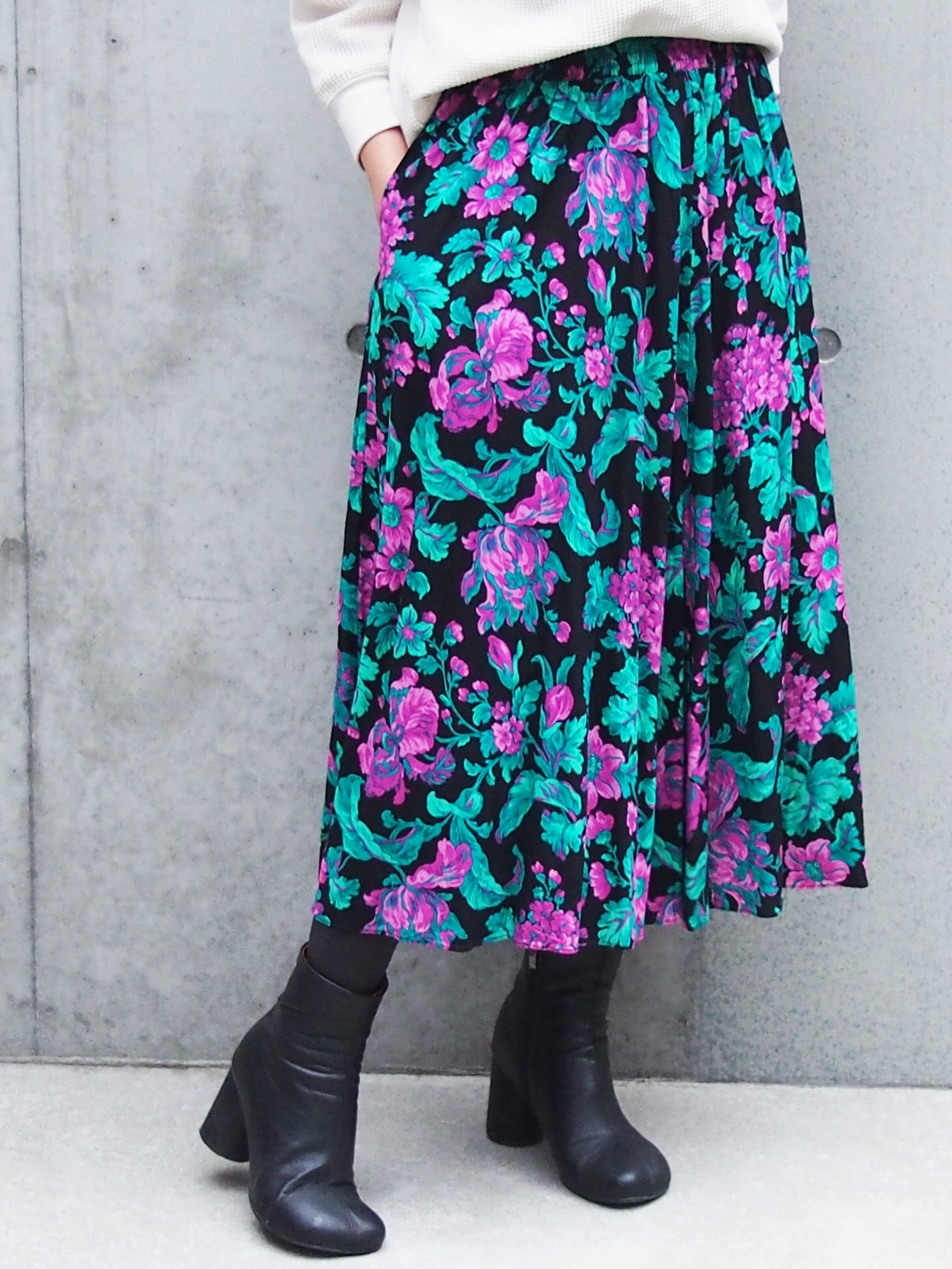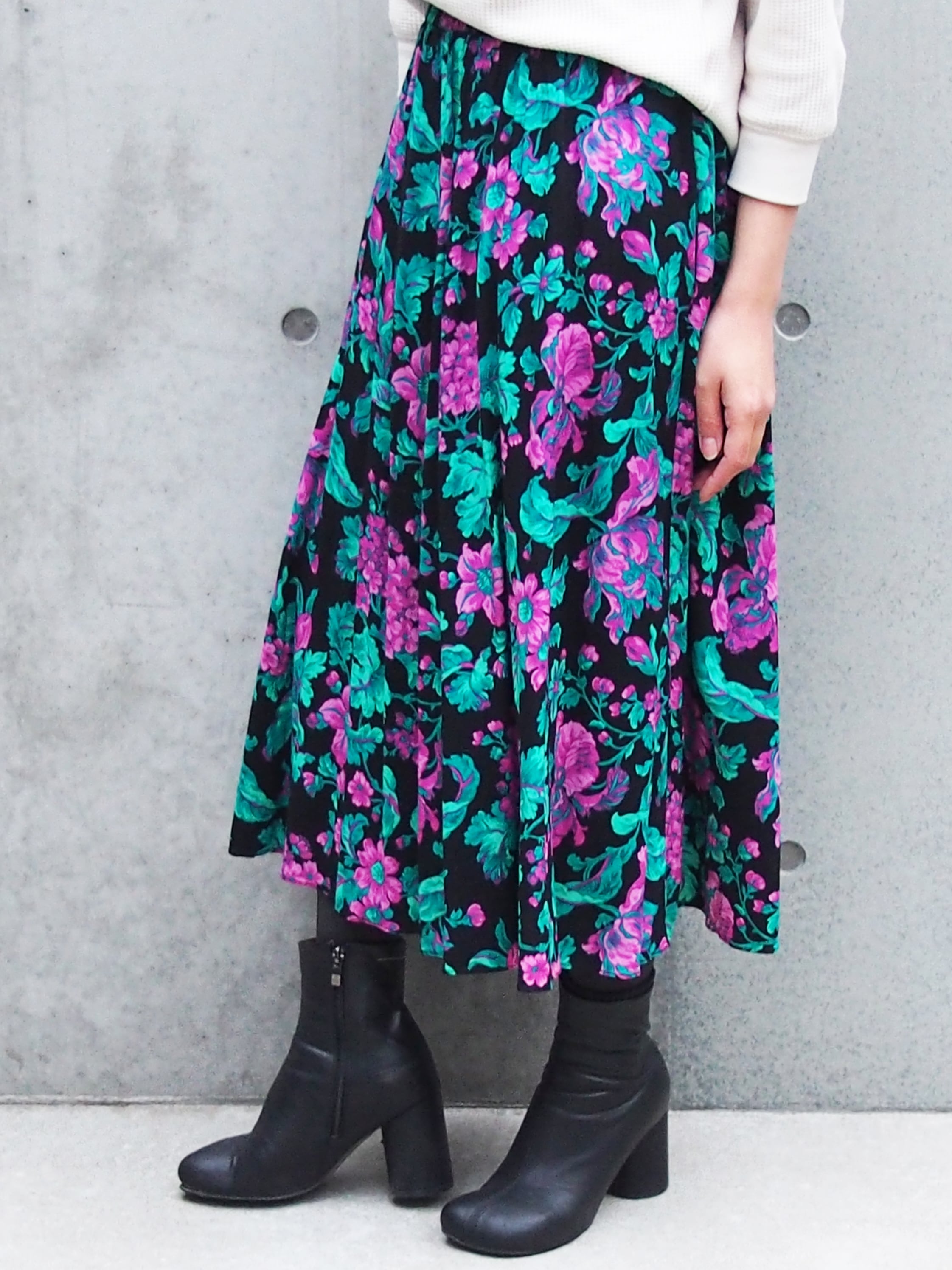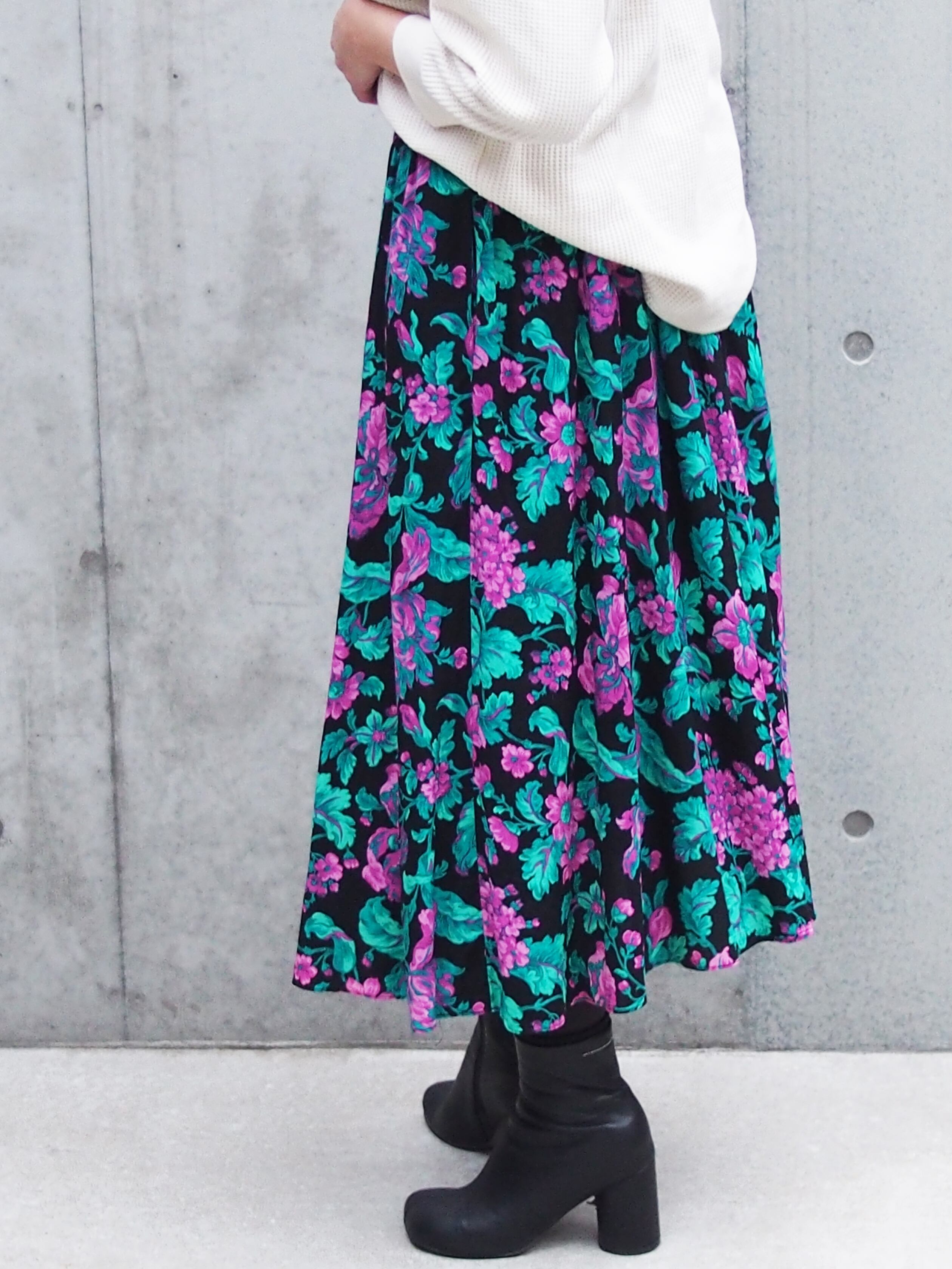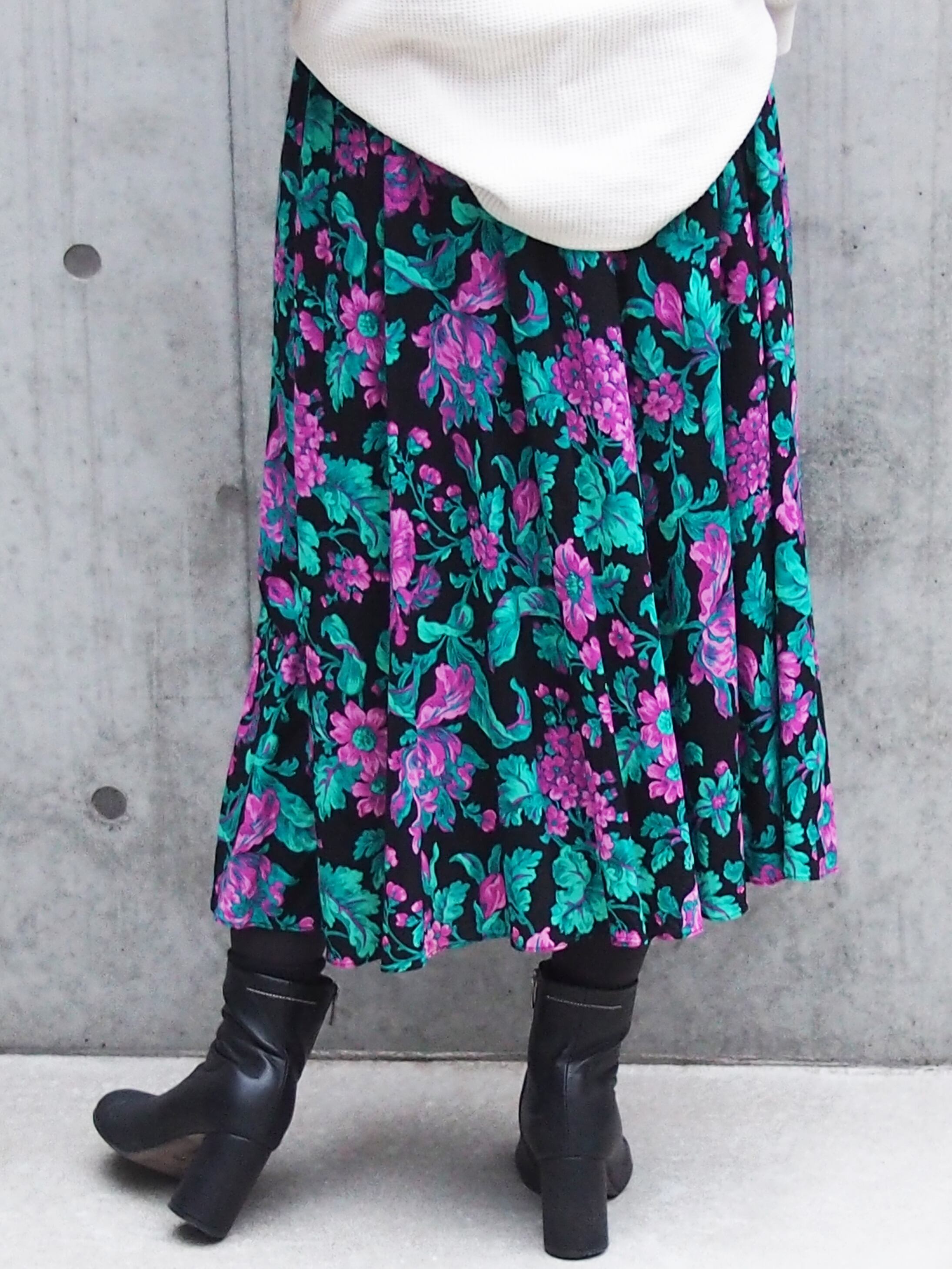 グリーンとピンクの花柄が目を引く、フレアースカートの入荷。