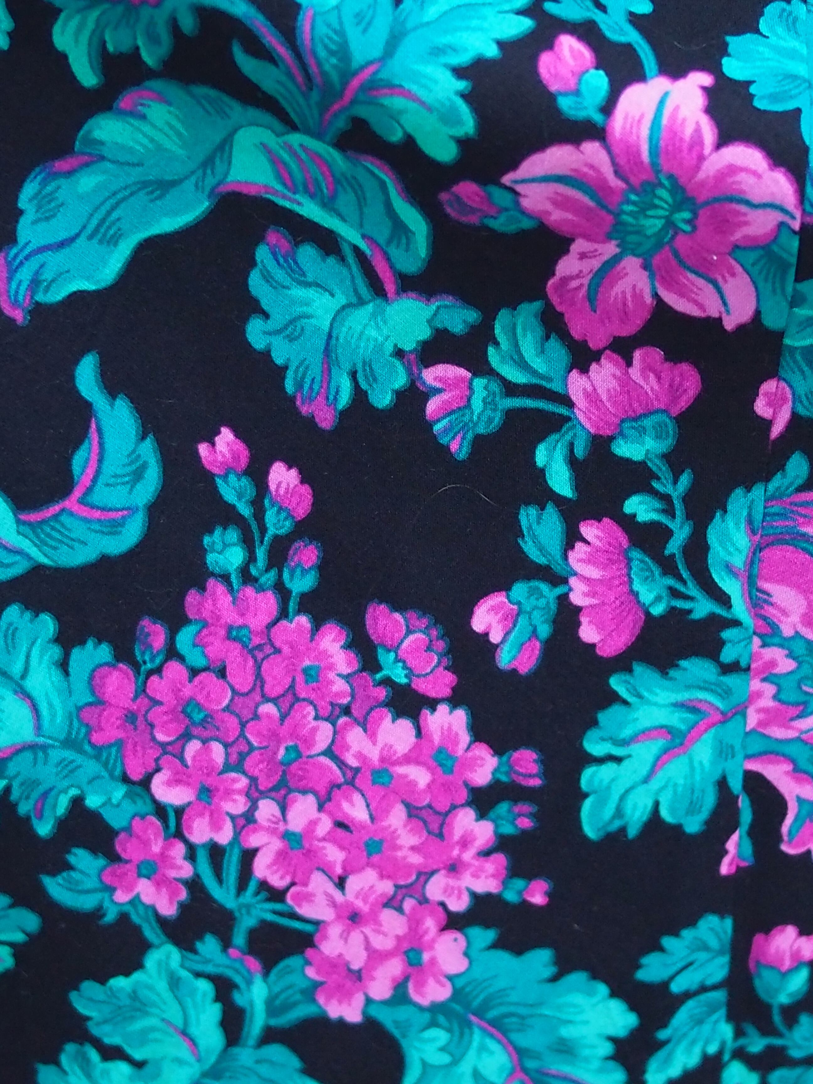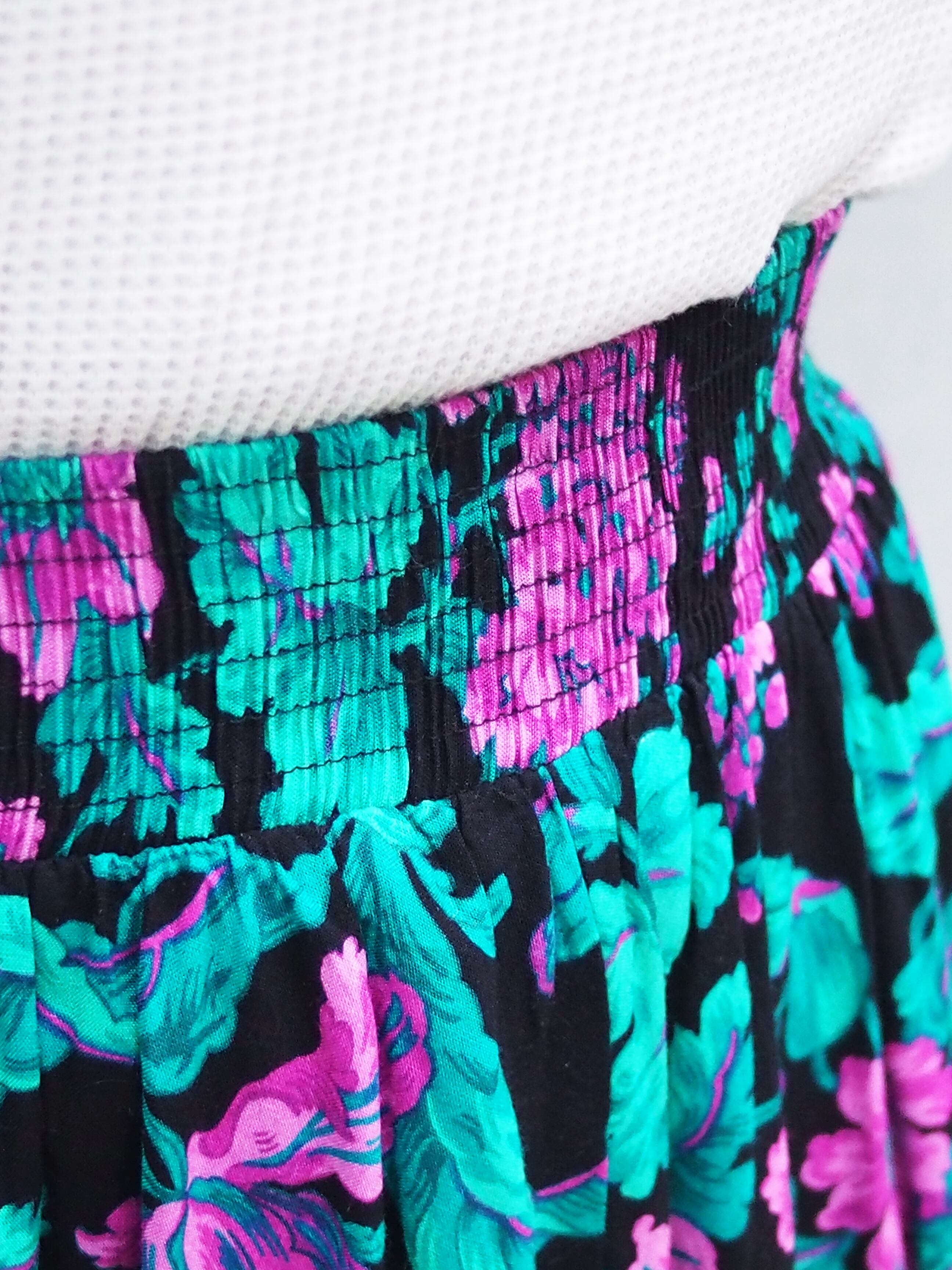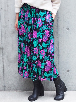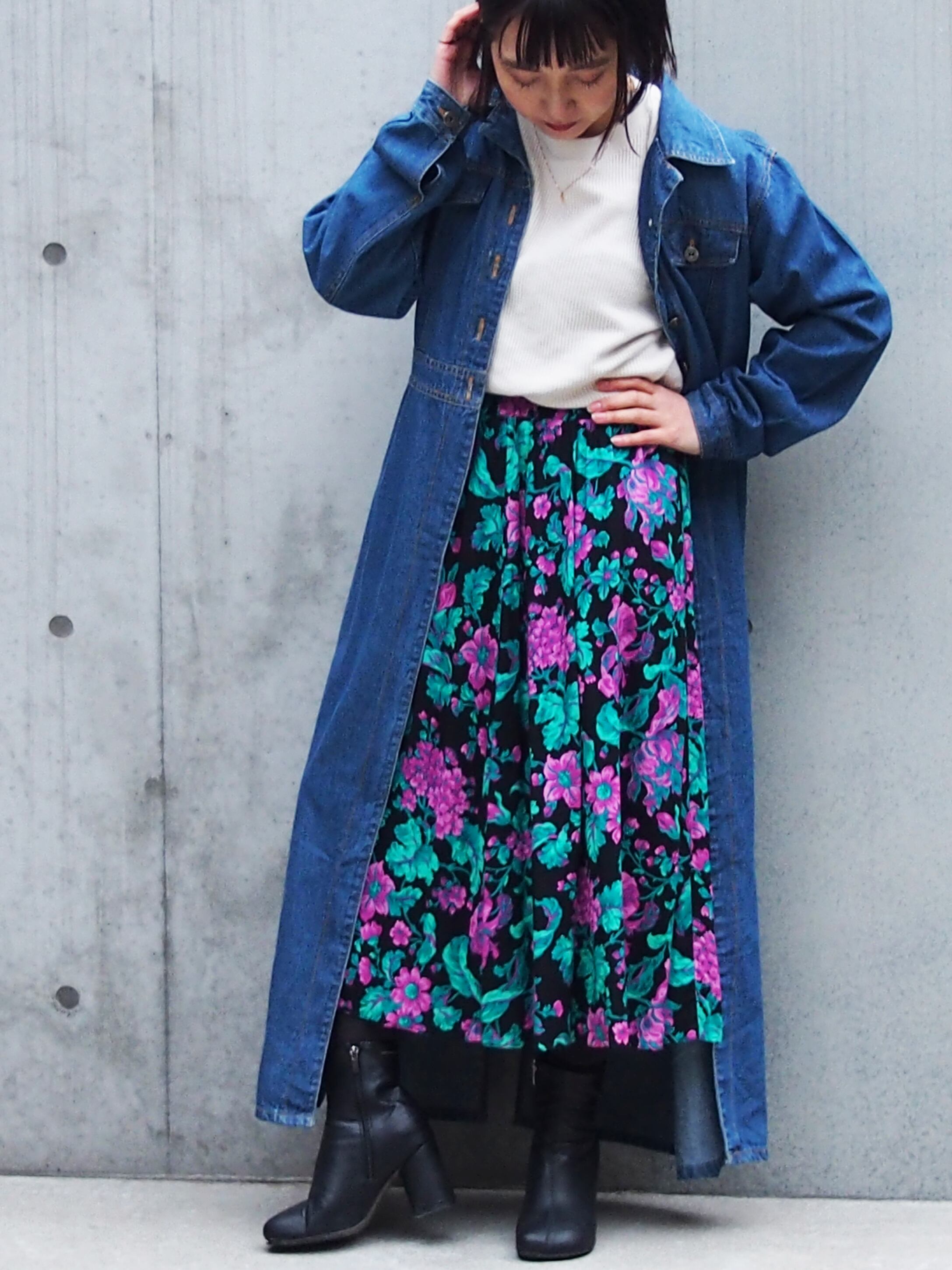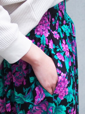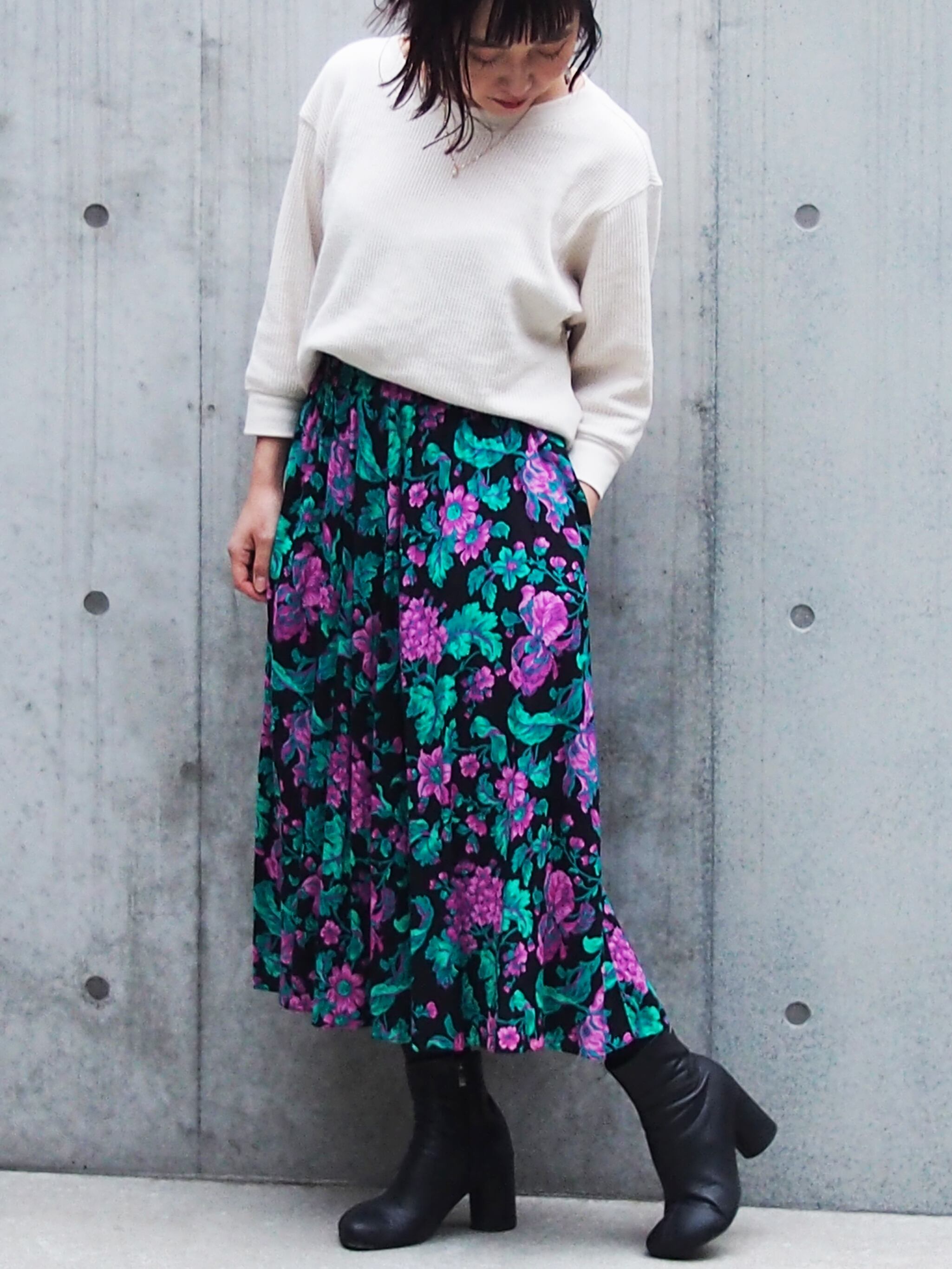 グリーンとピンクの花柄が目を引く、フレアースカートの入荷。