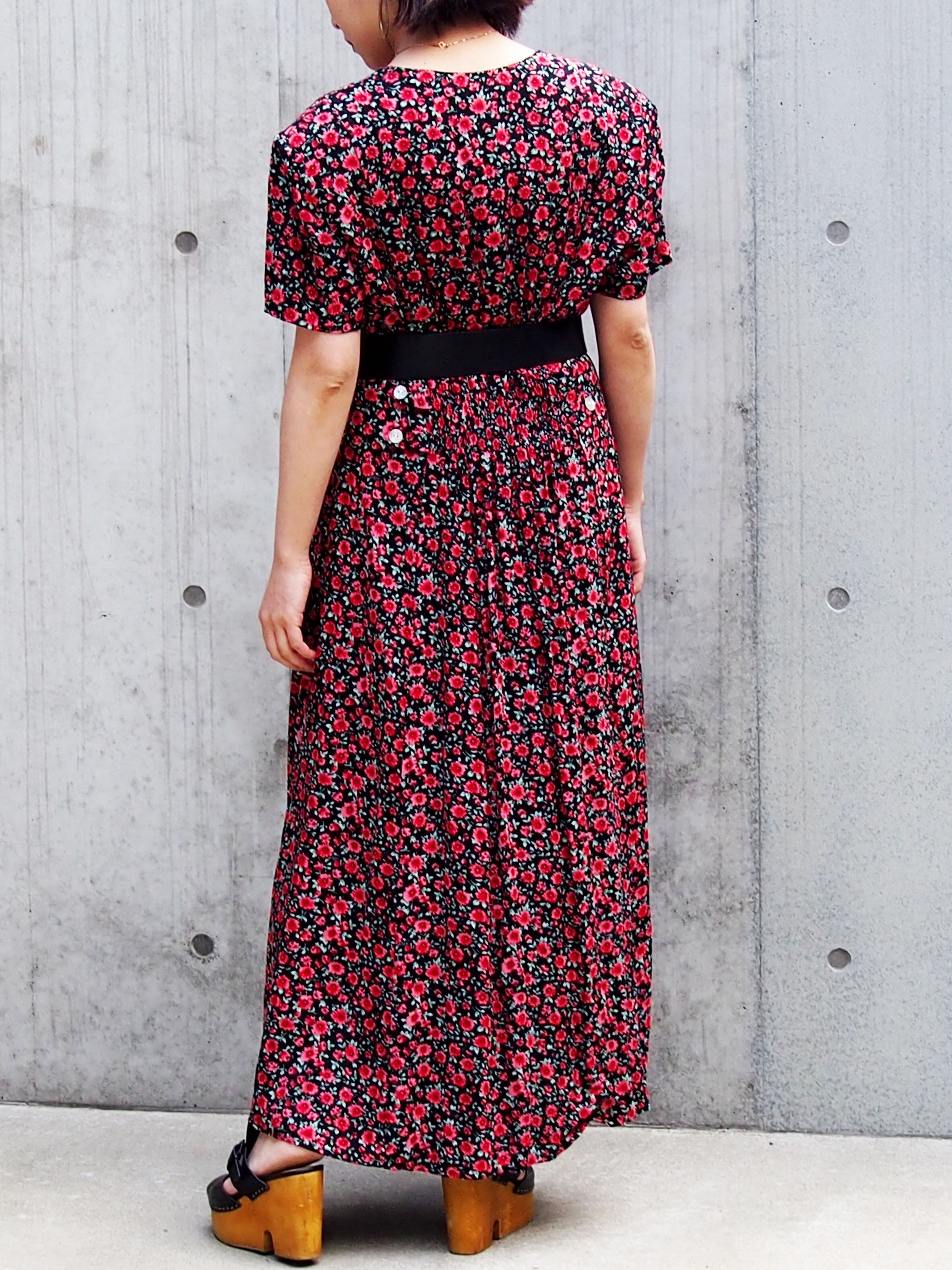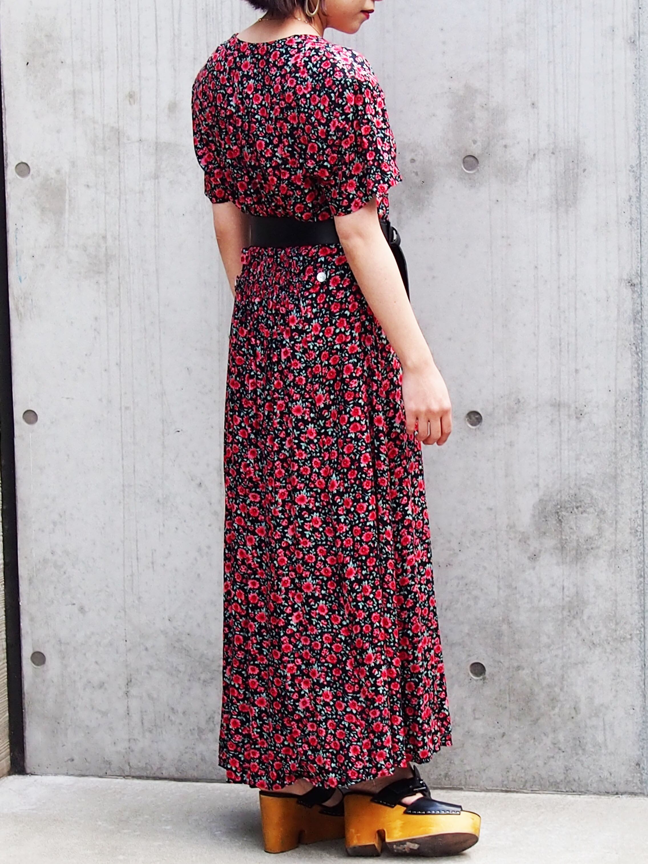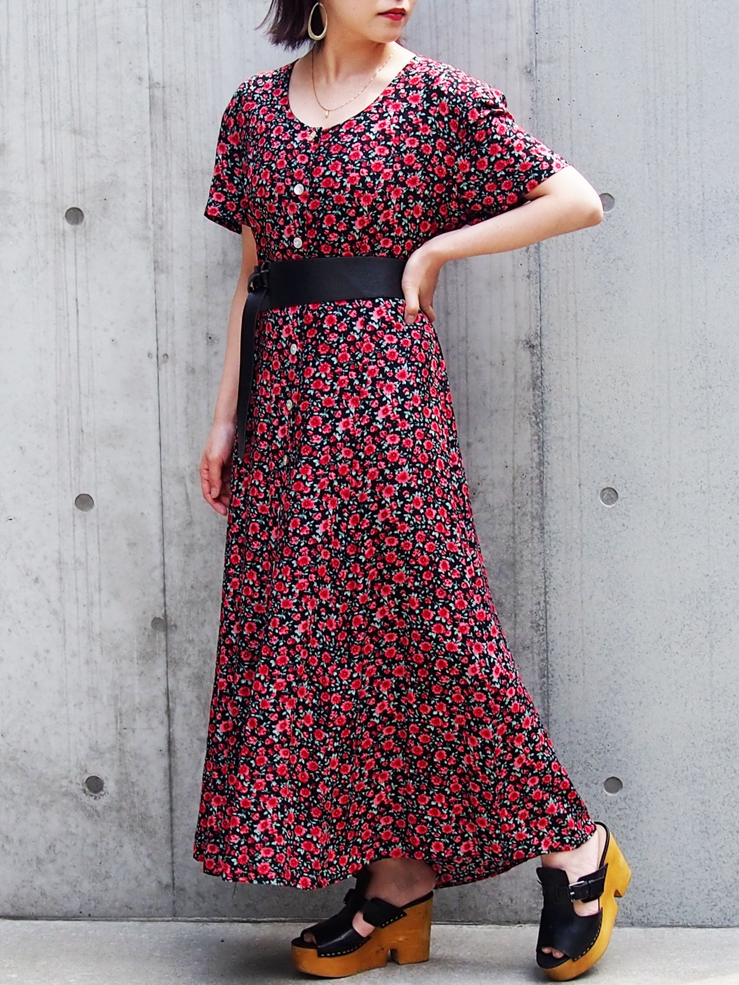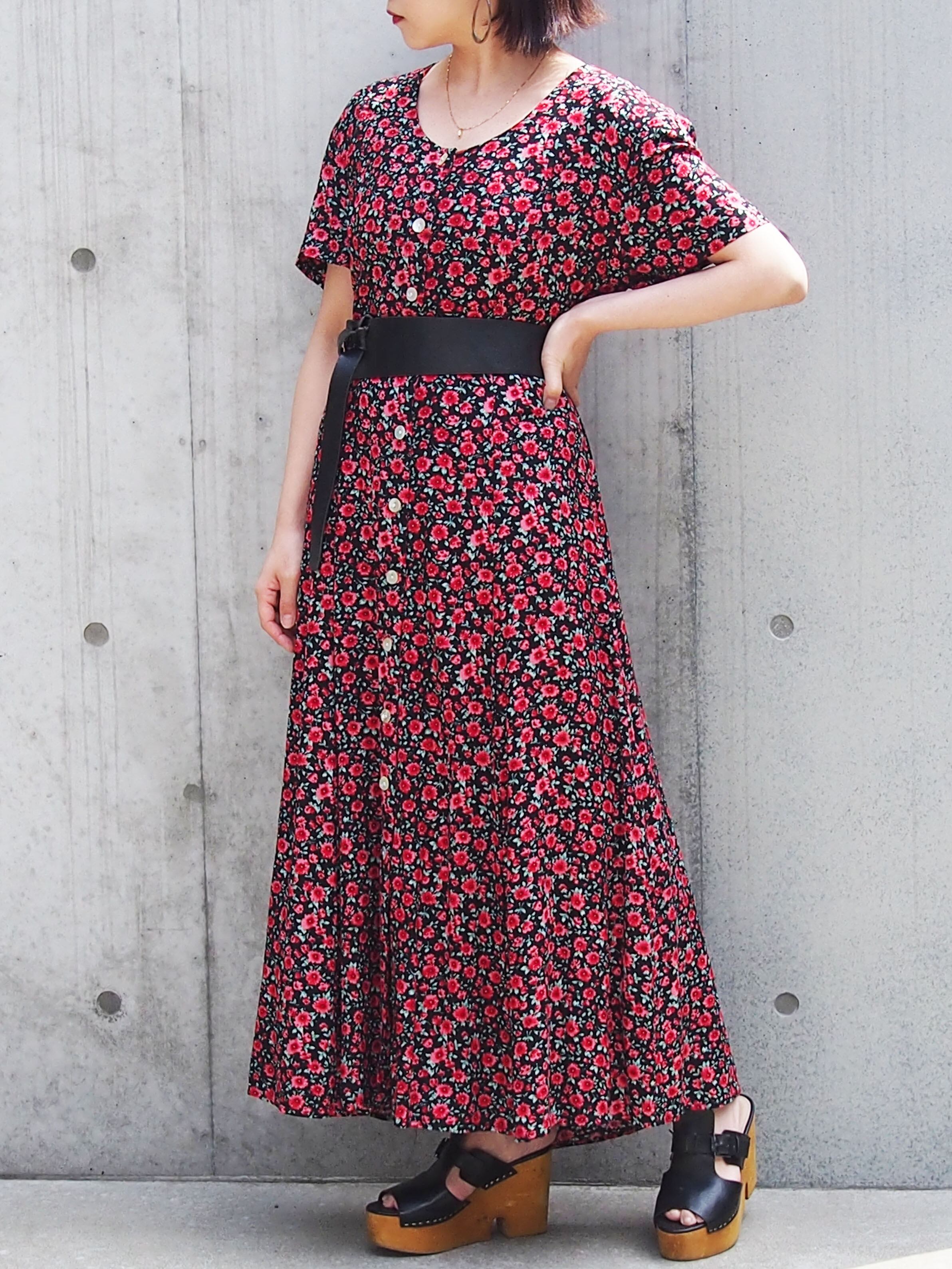 ブラックベースにレッドカラーの花柄が素敵なロングドレス。