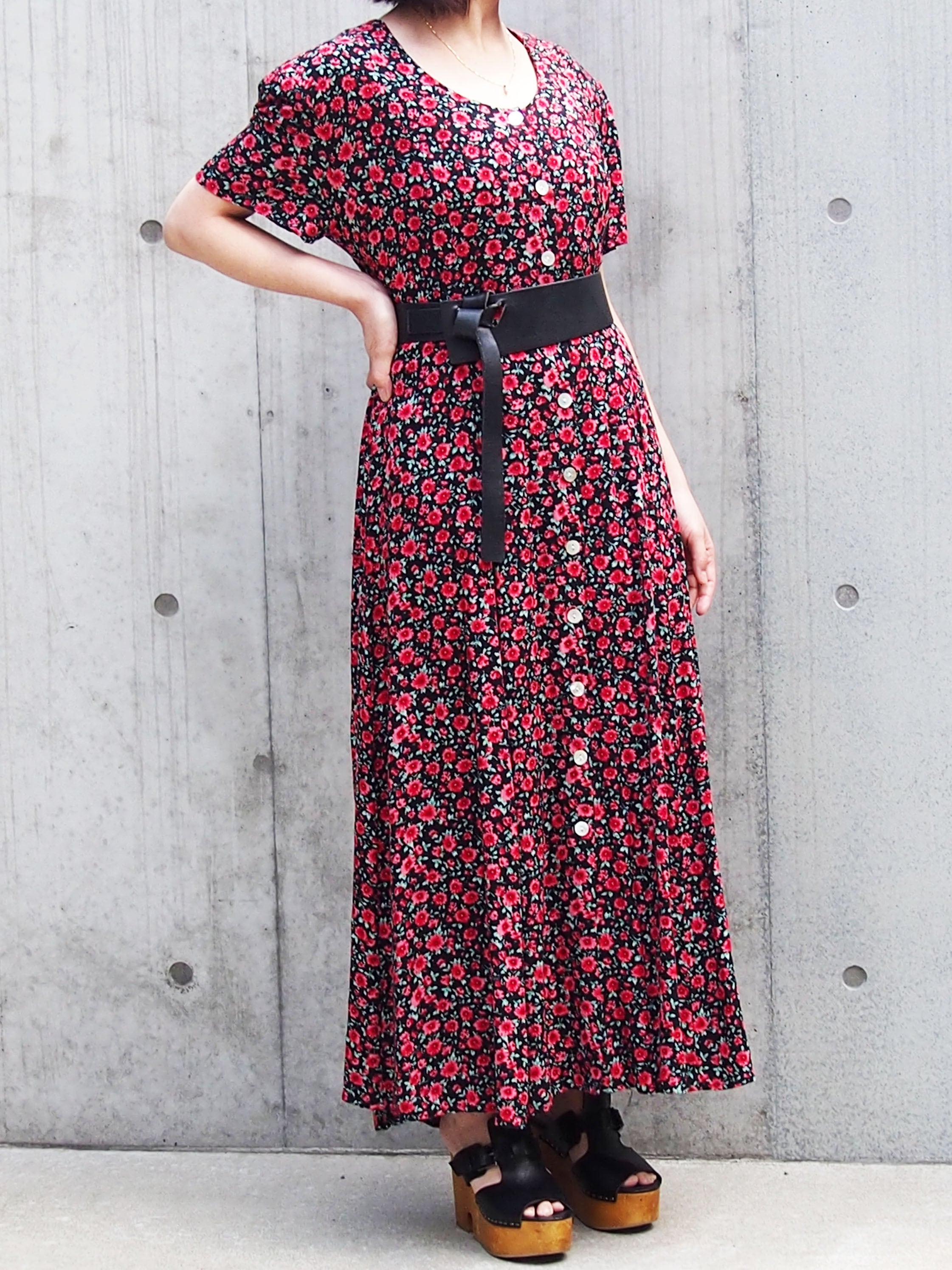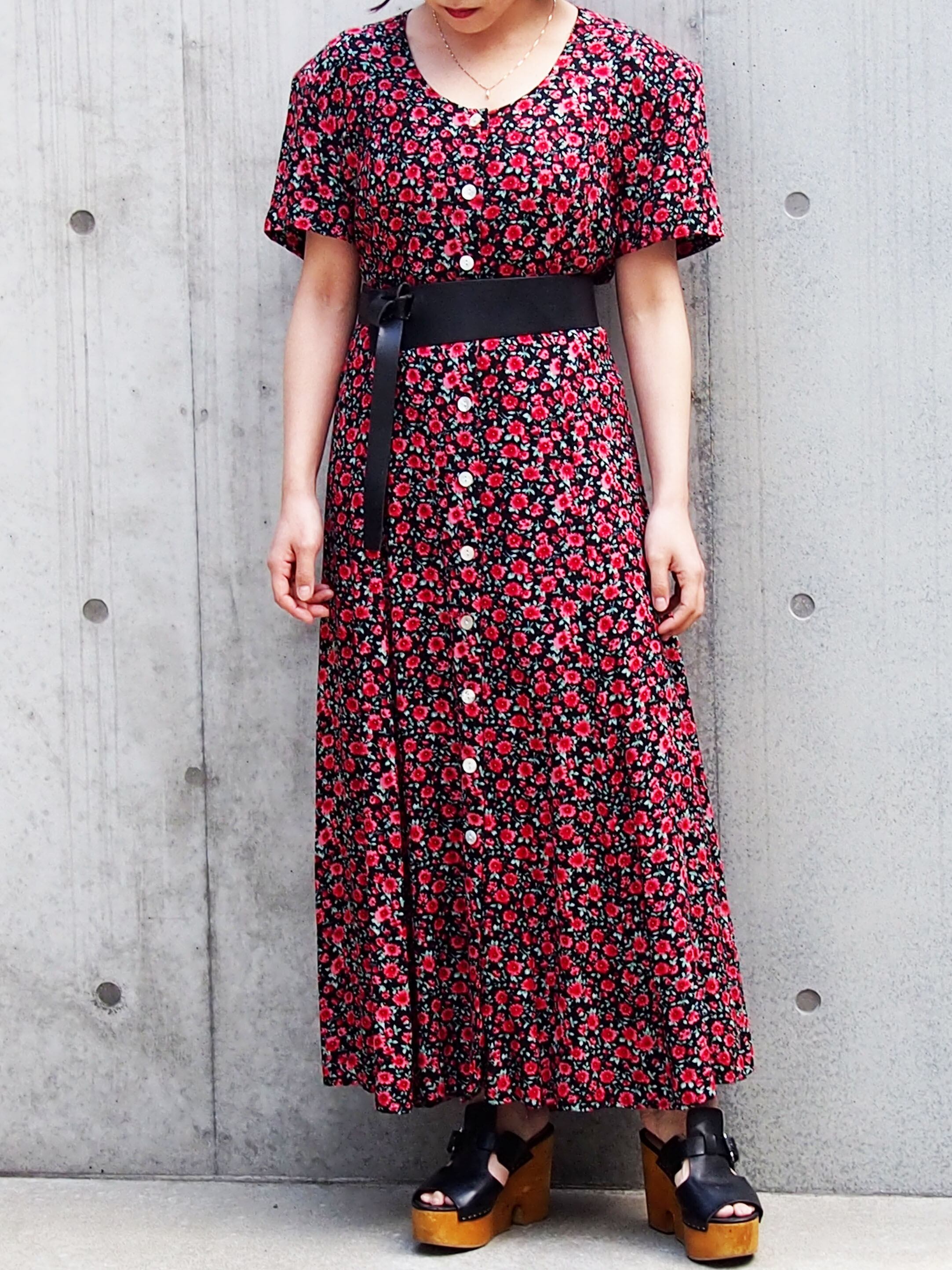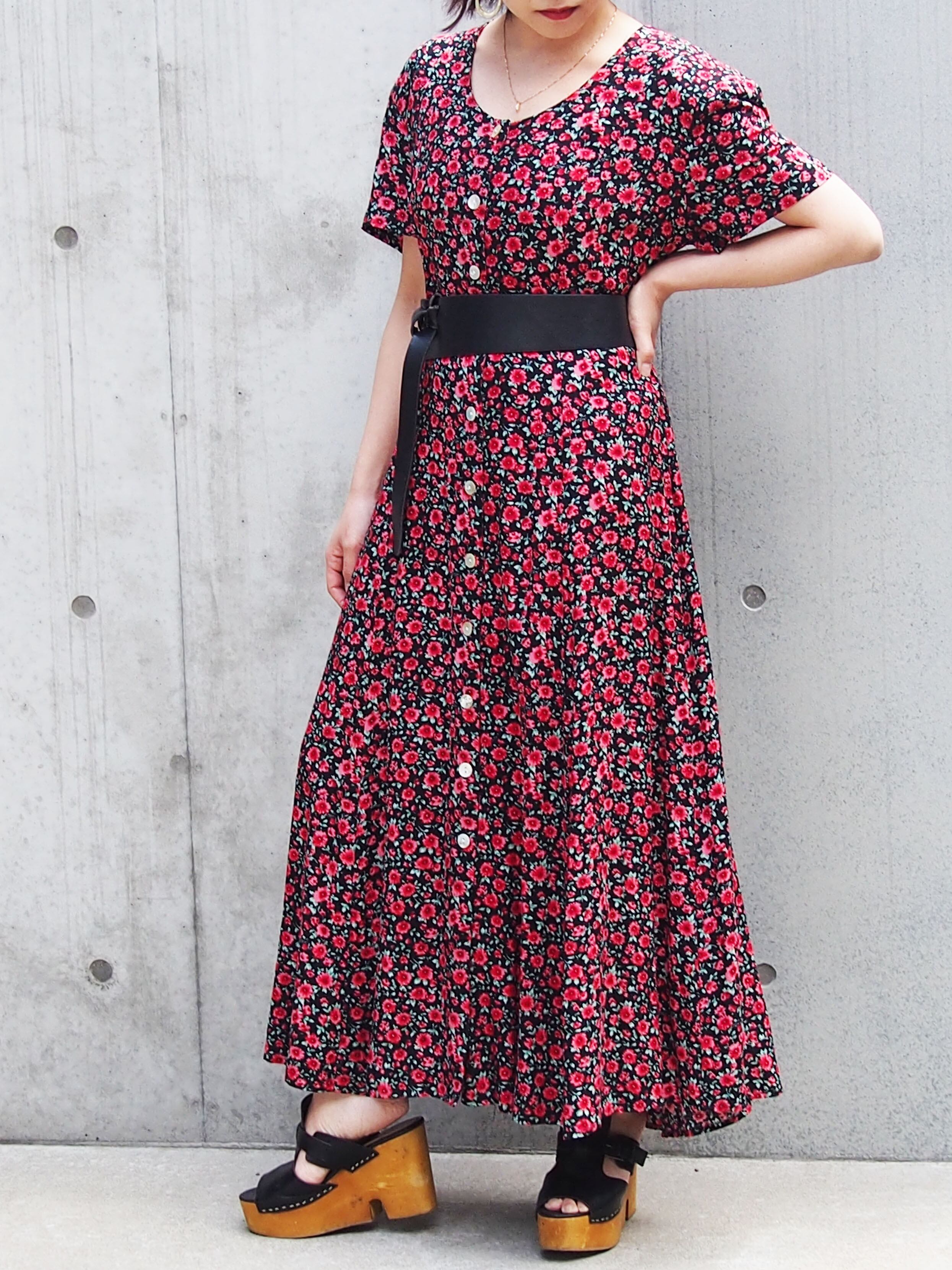 ブラックベースにレッドカラーの花柄が素敵なロングドレス。