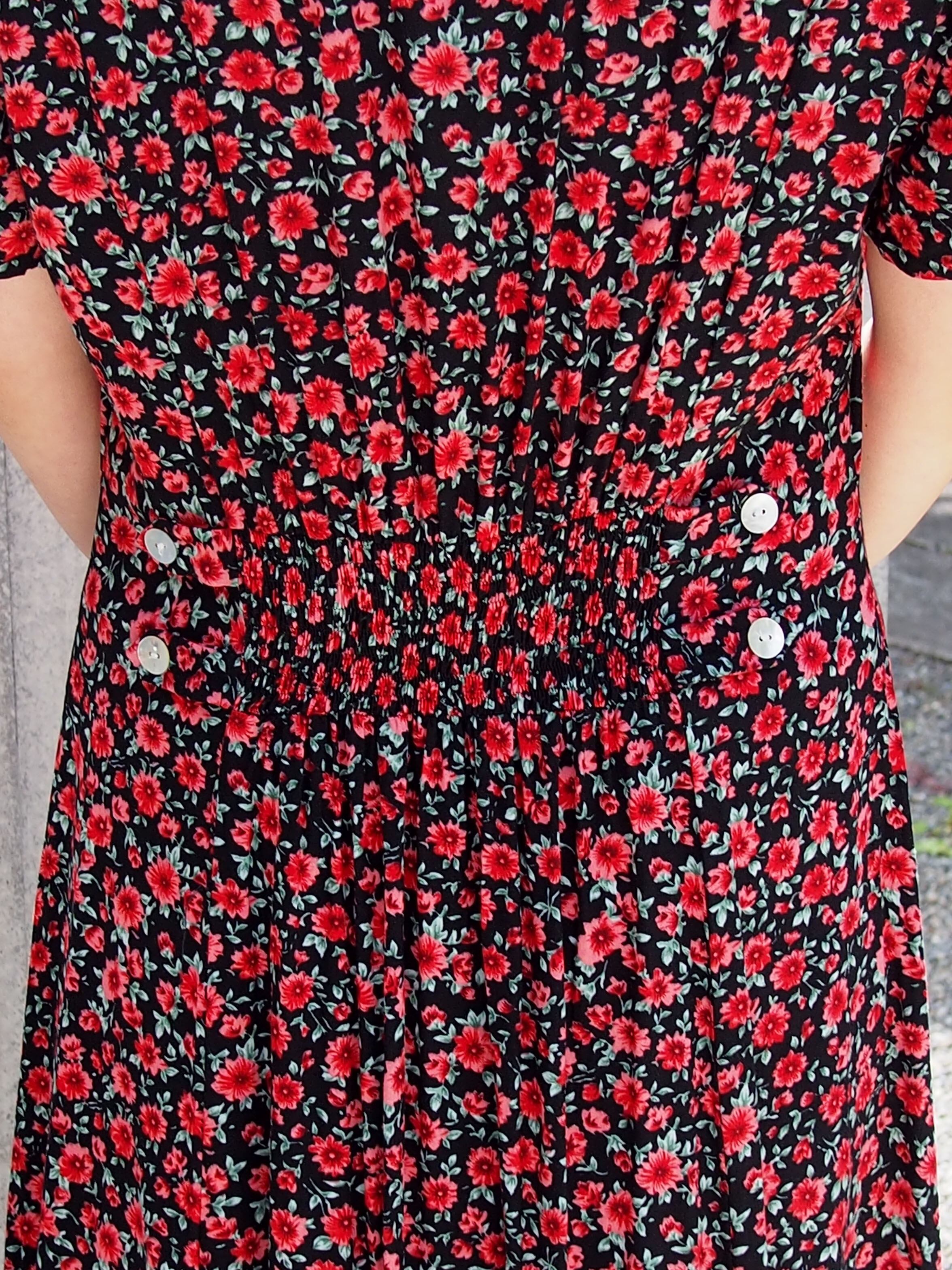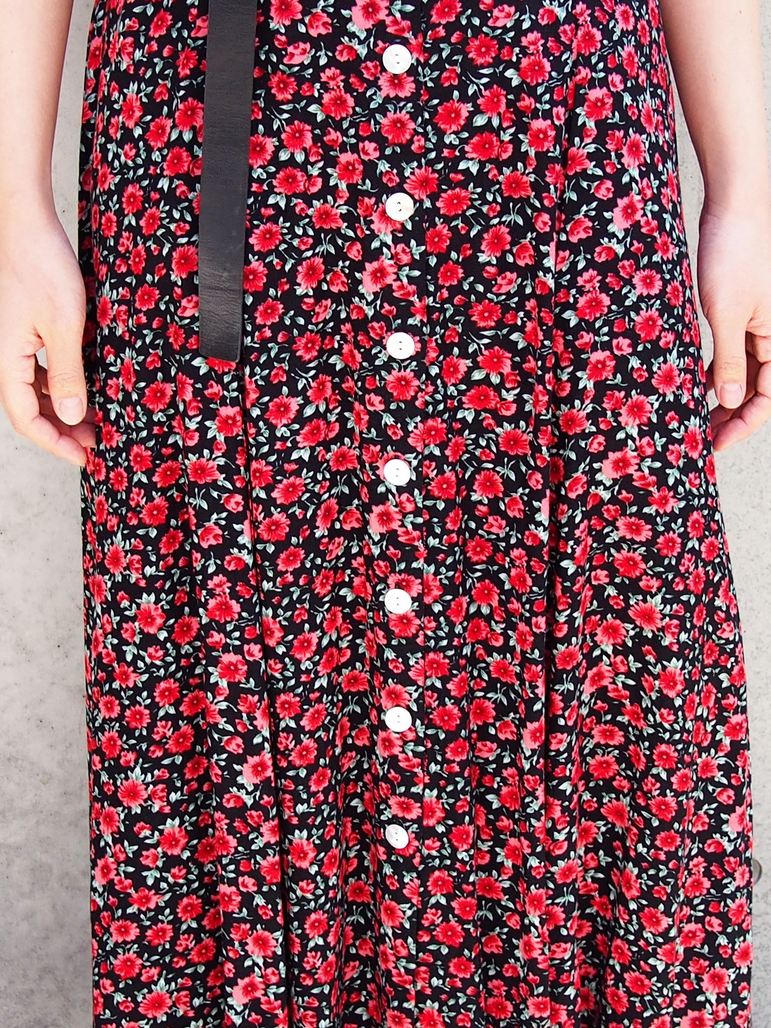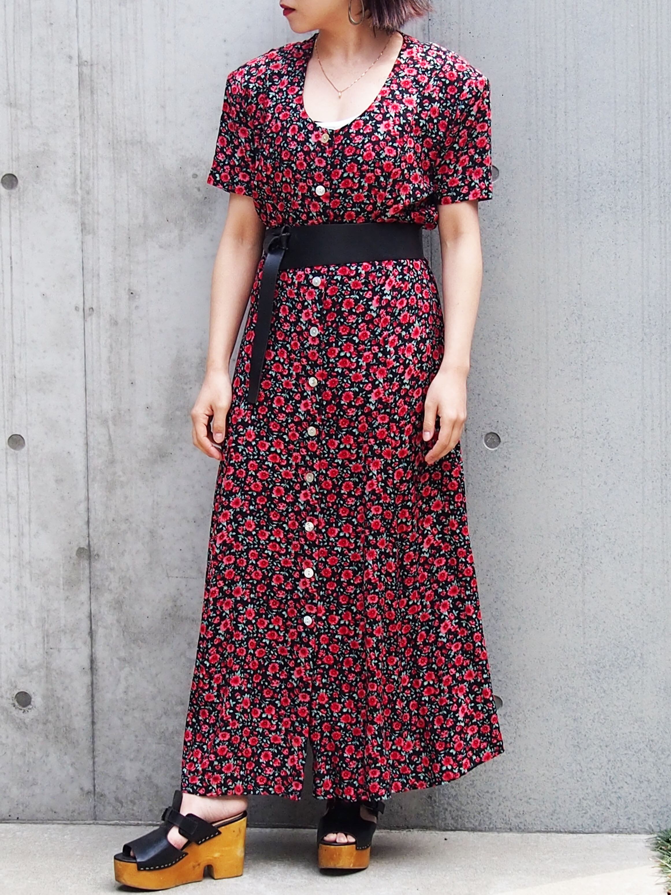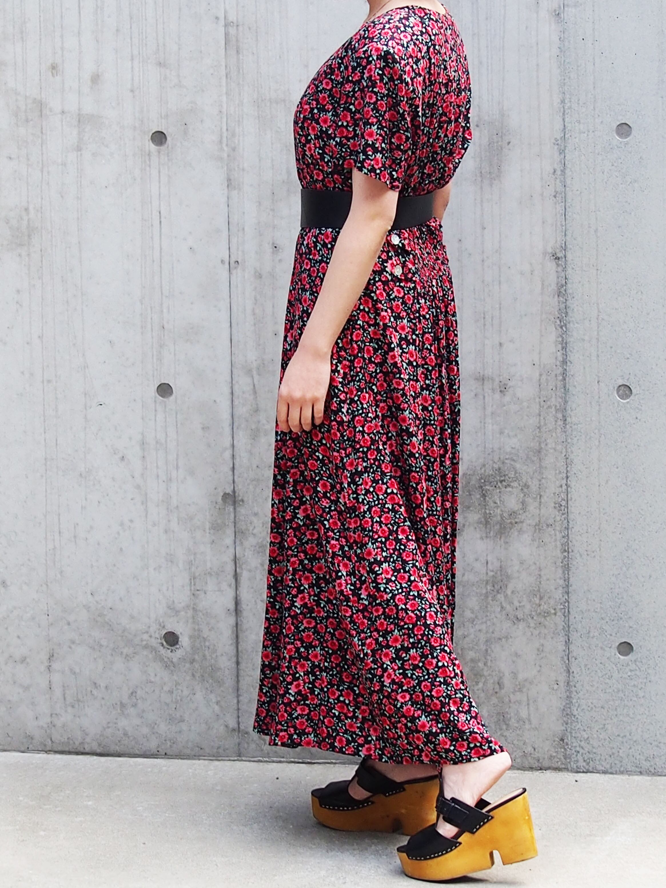 ブラックベースにレッドカラーの花柄が素敵なロングドレス。