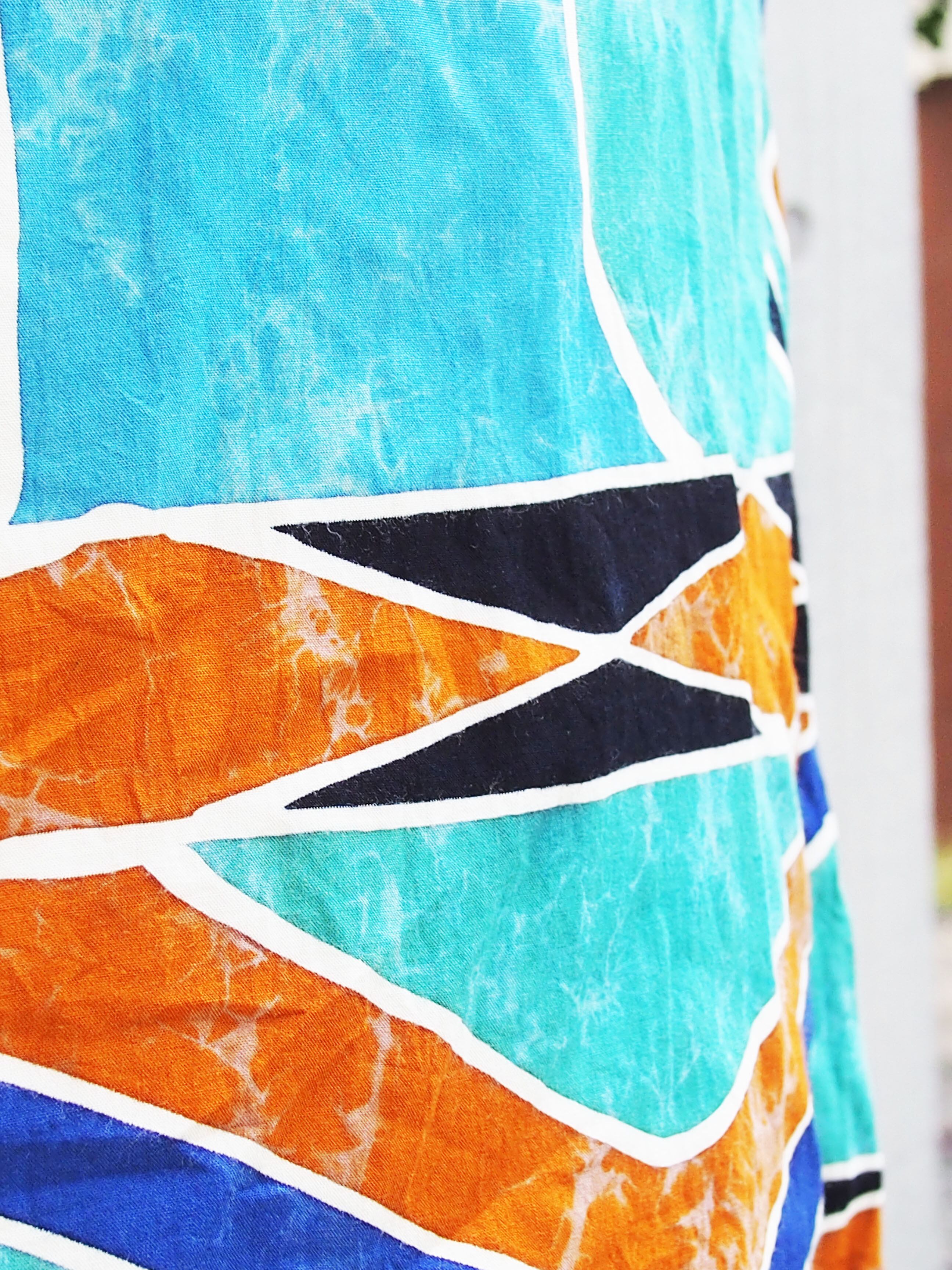 ブラウン系のエスニック柄が綺麗なブルーに映え、目を引きます。