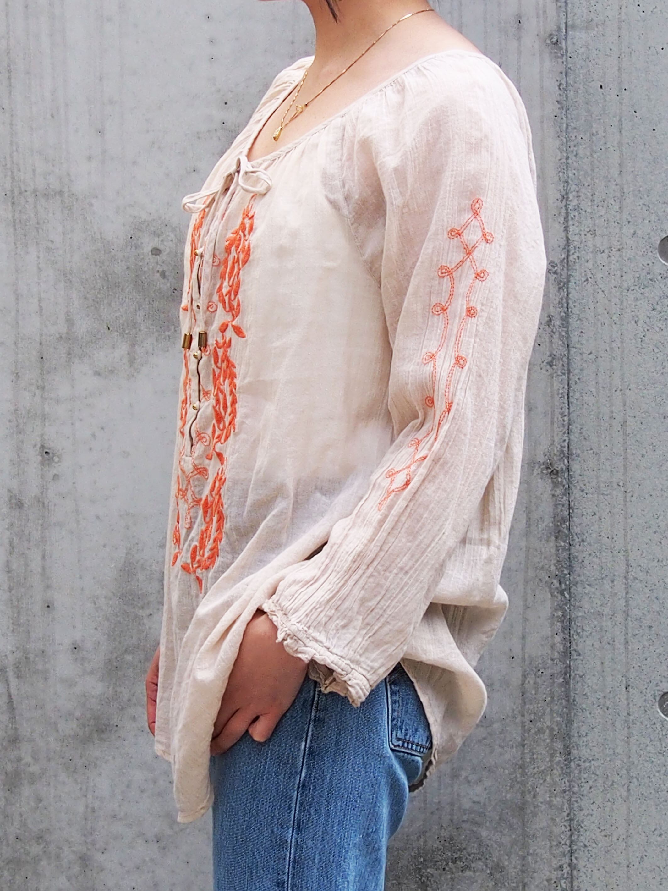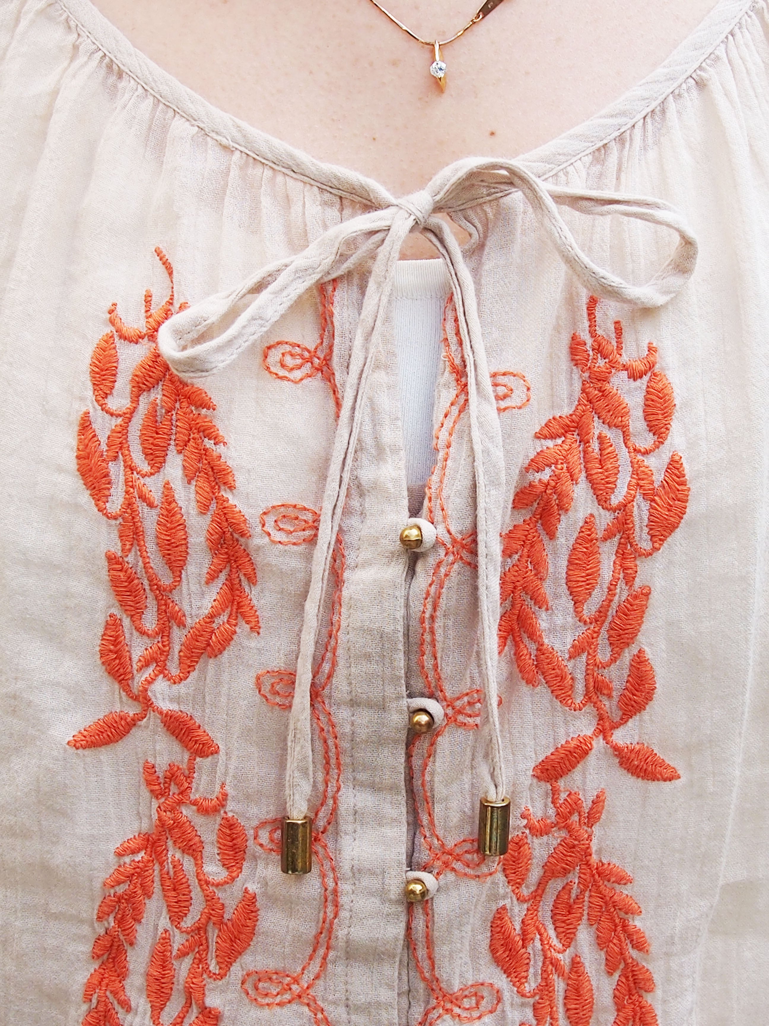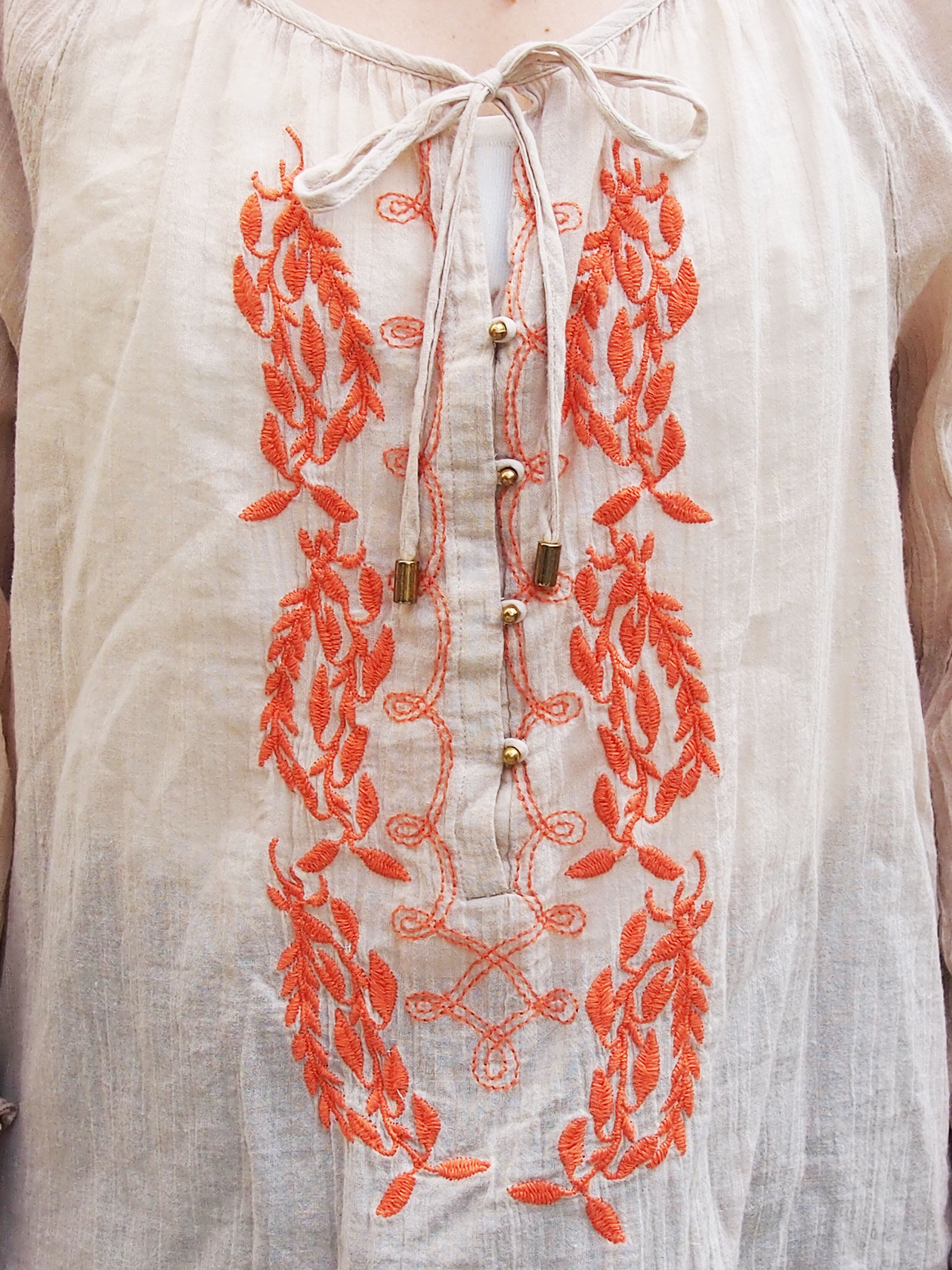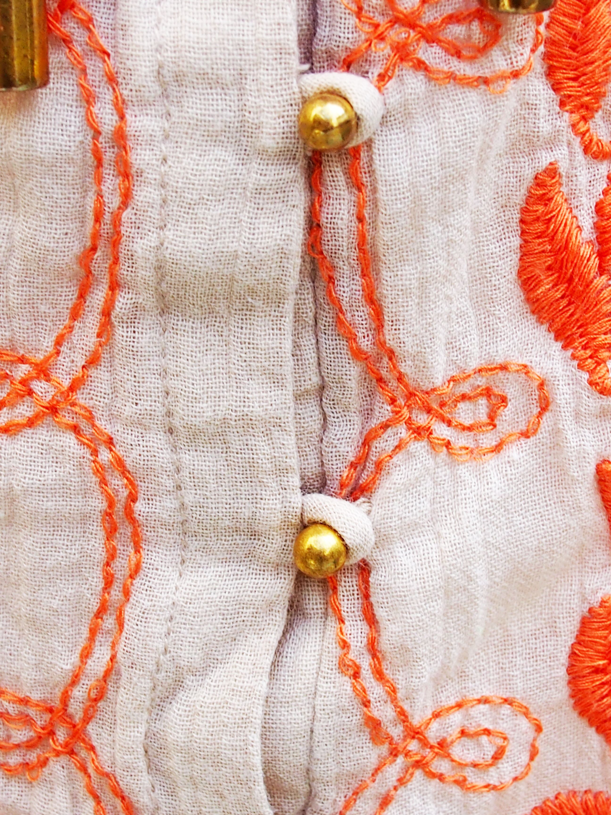オフホワイトのコットンに施された、オレンジの刺繍が目を引きます。