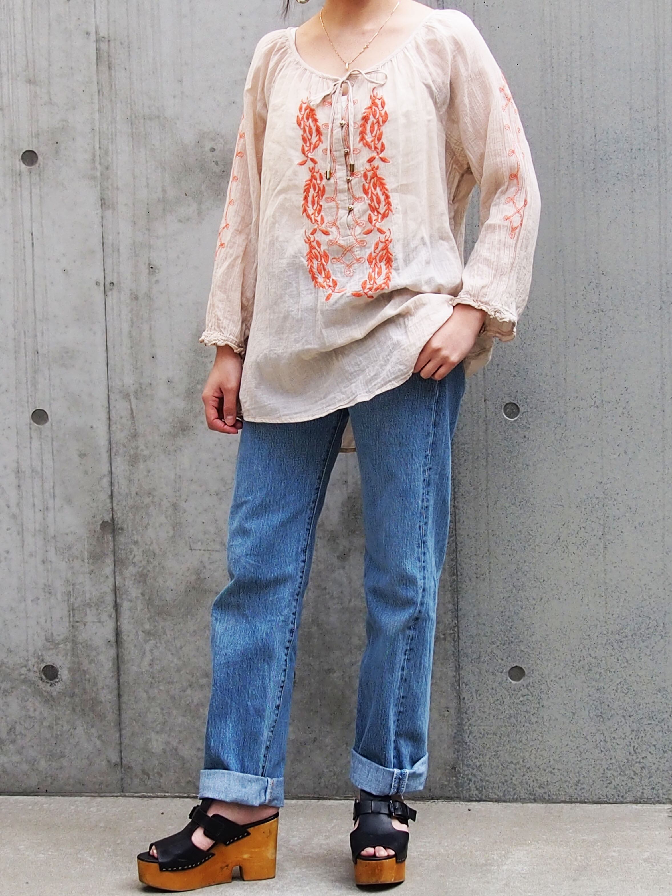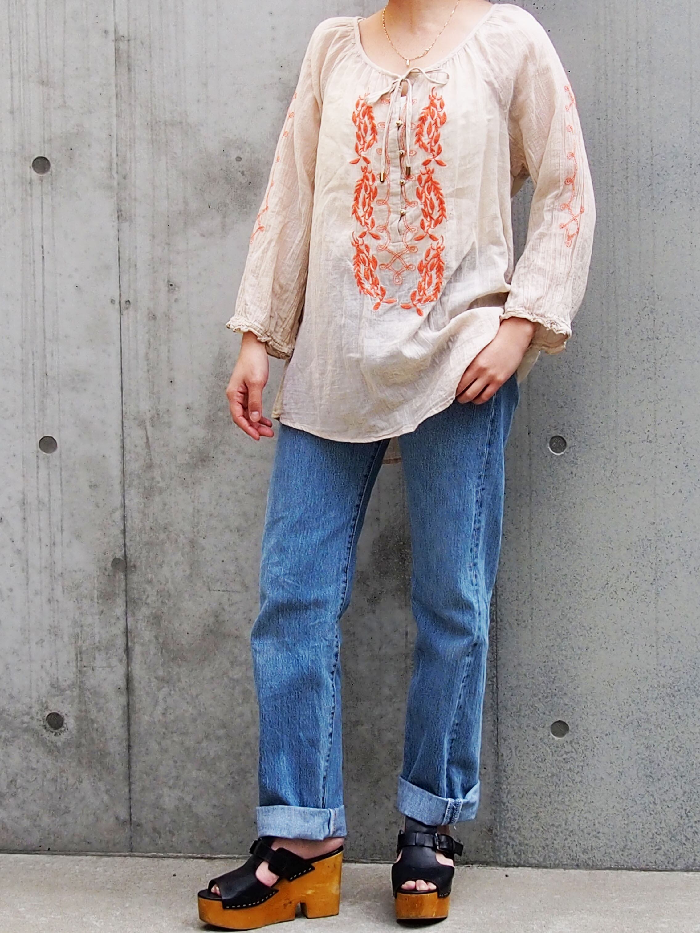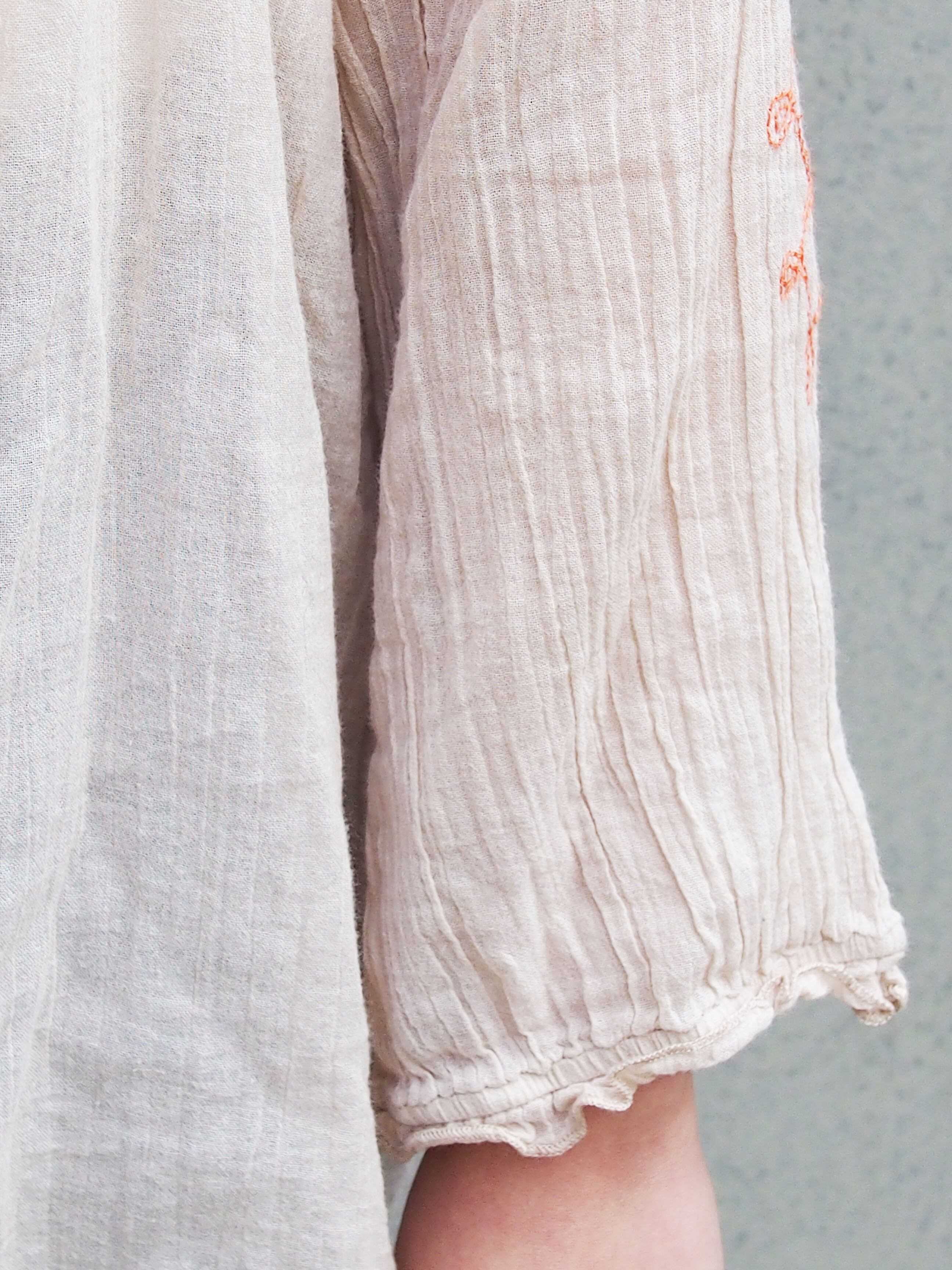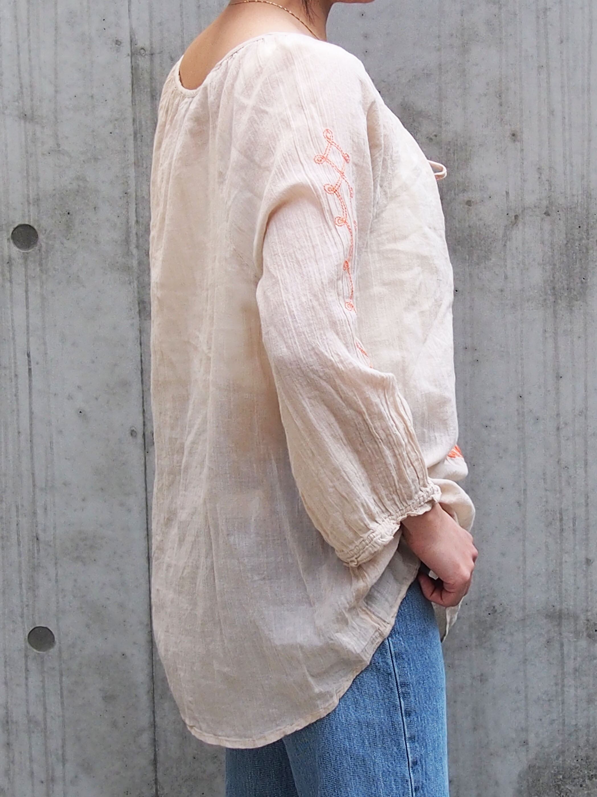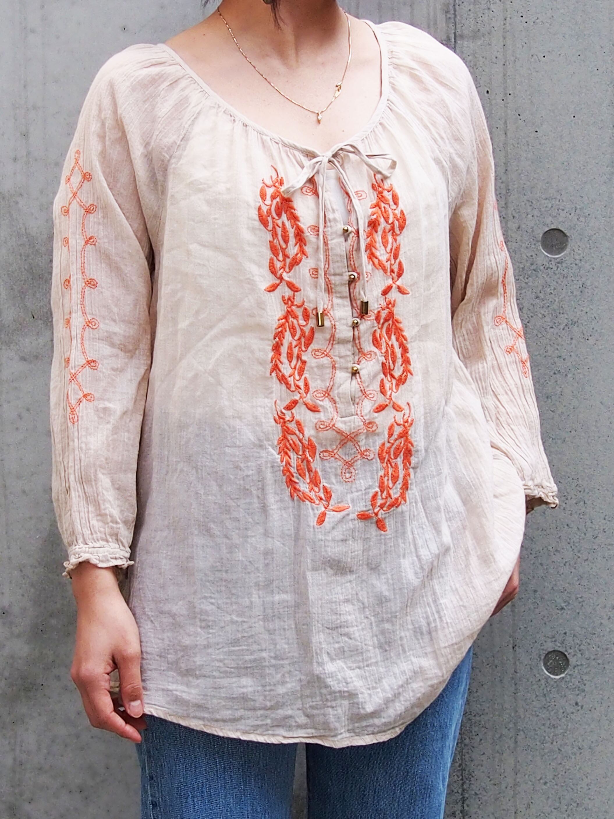 オフホワイトのコットンに施された、オレンジの刺繍が目を引きます。