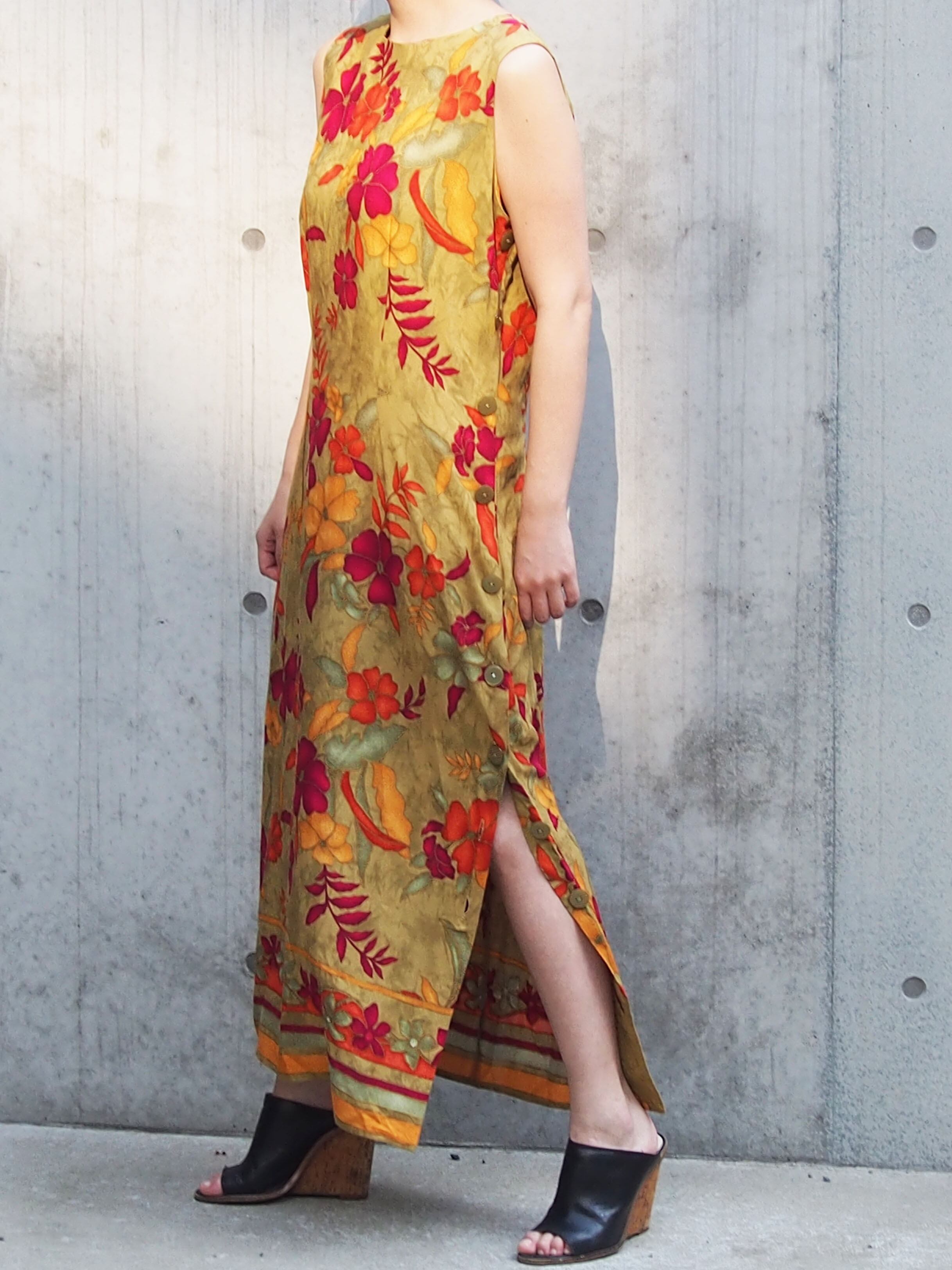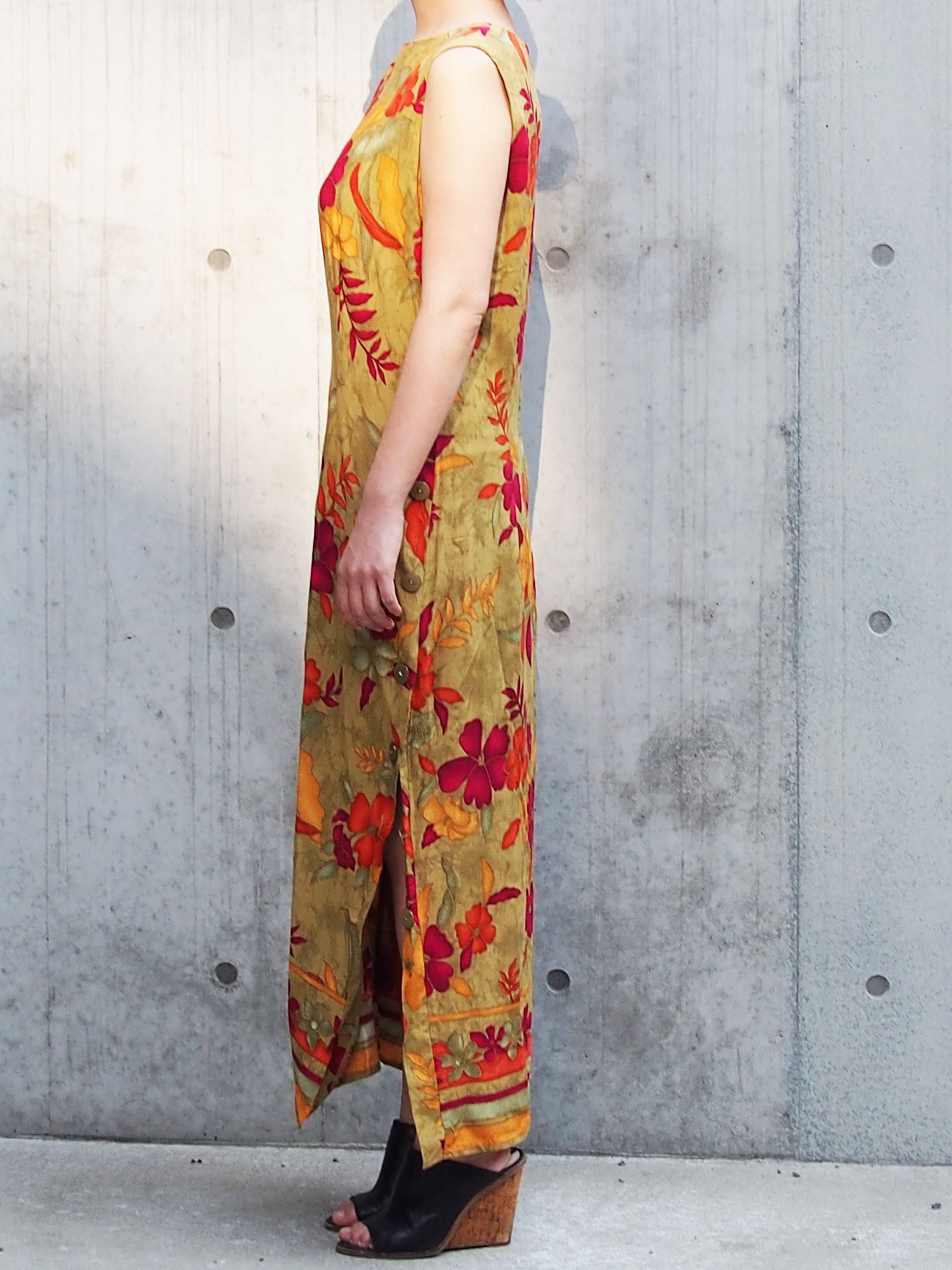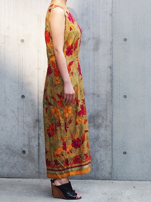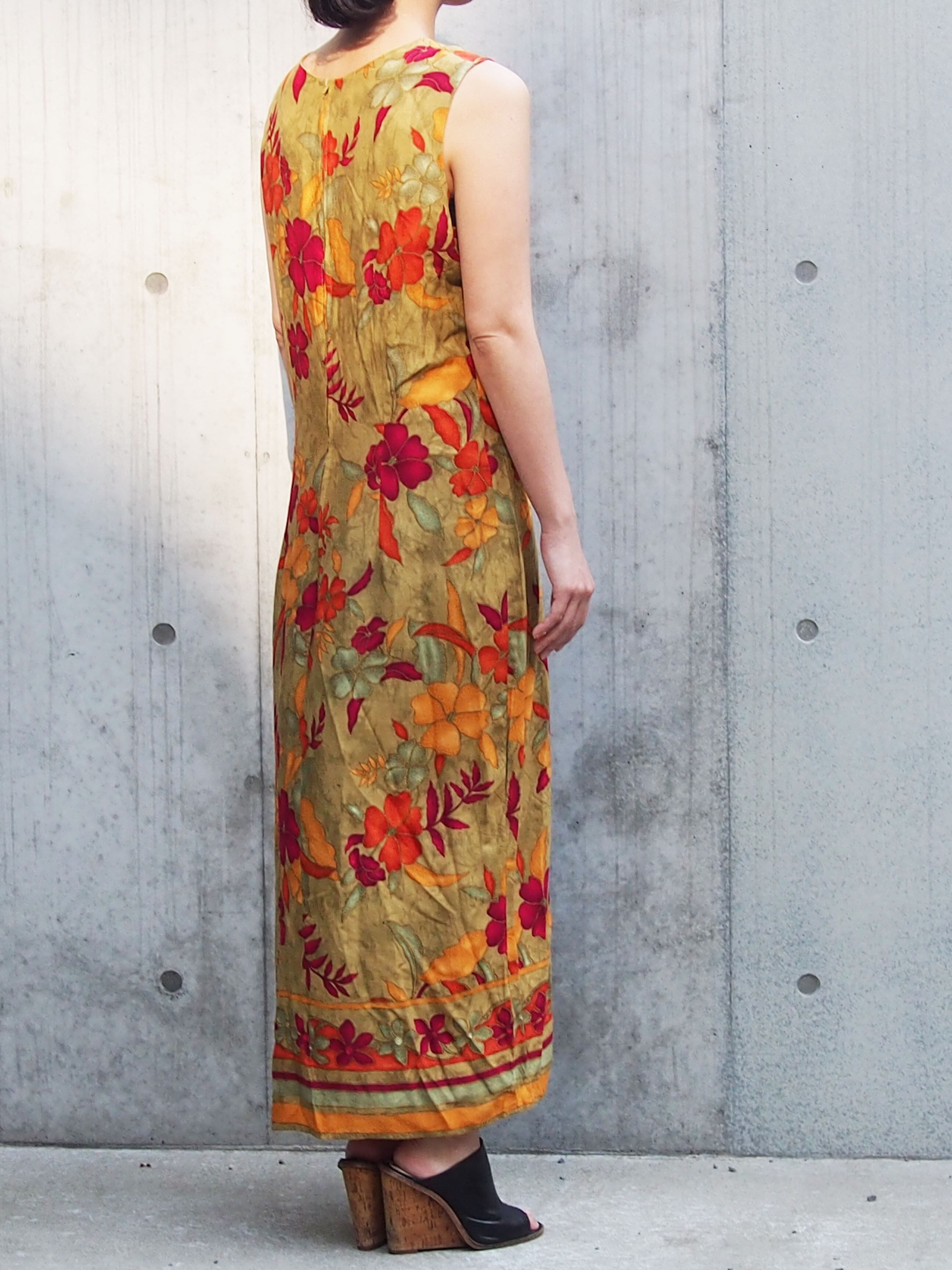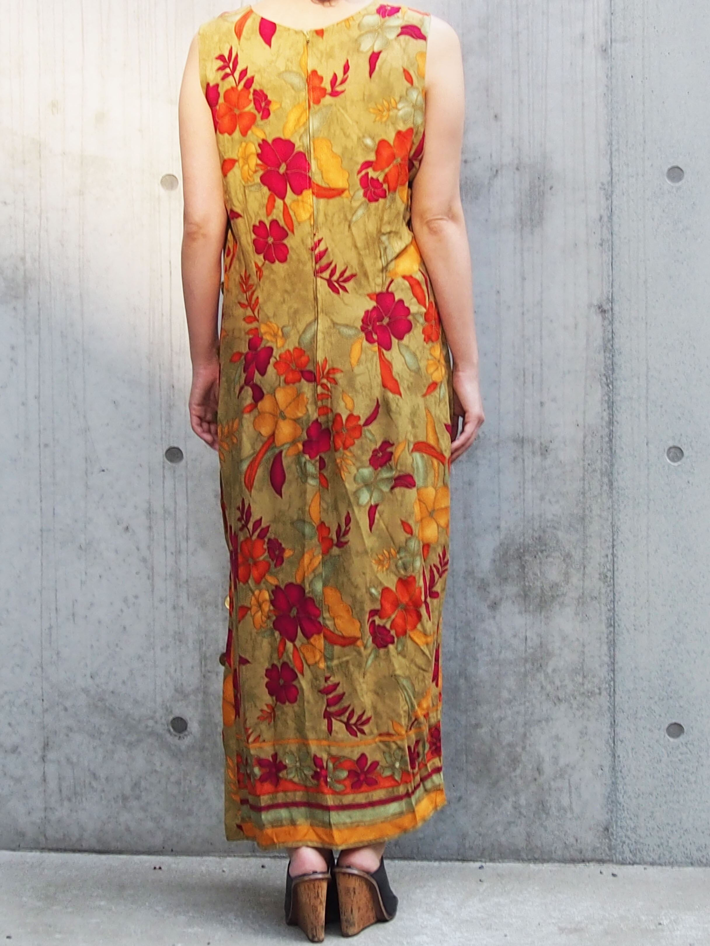 カーキのようなマスタードのような渋みのあるカラーに、花柄が映えるロングワンピースです。