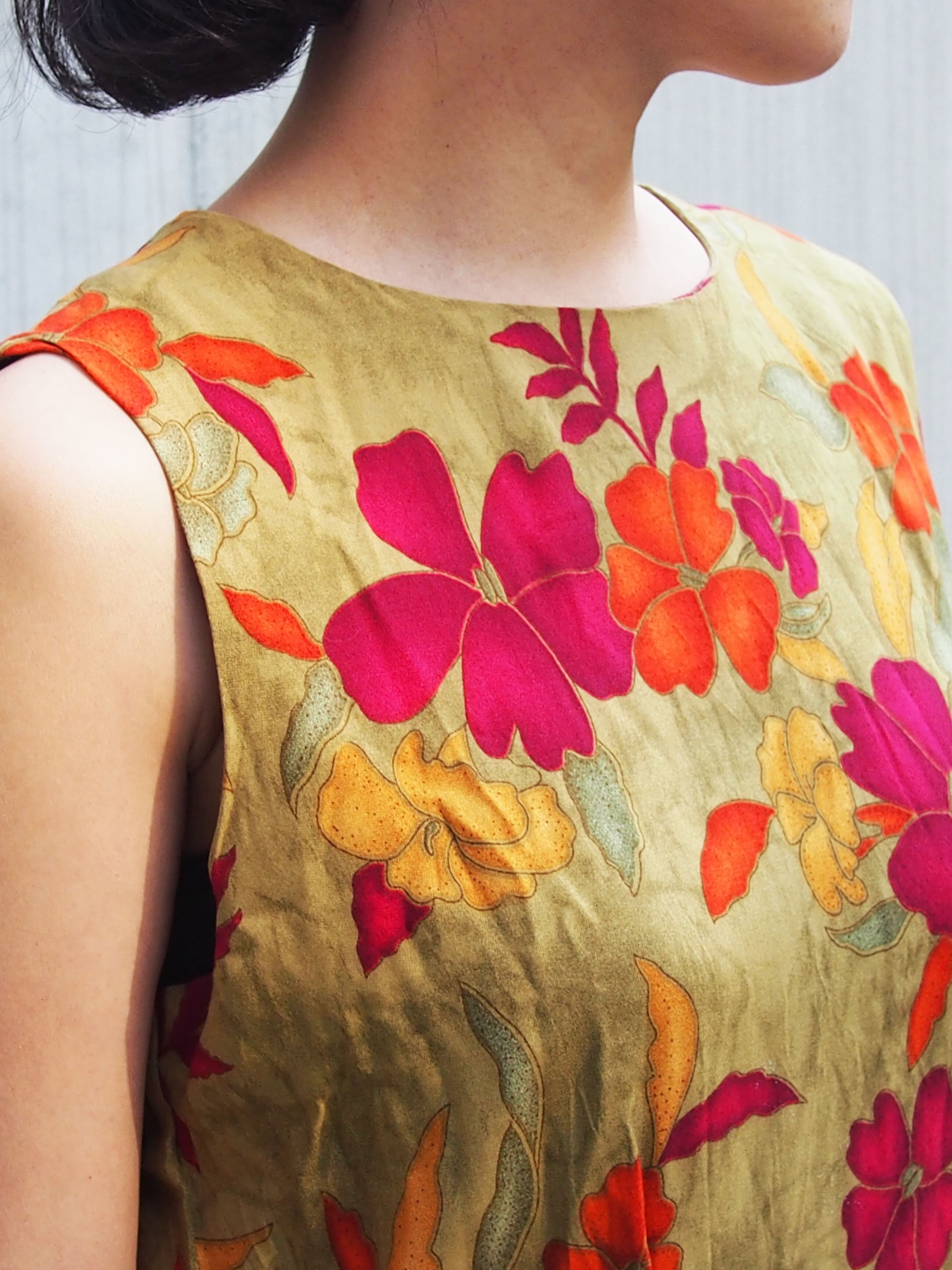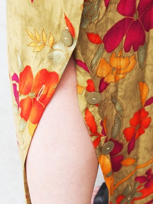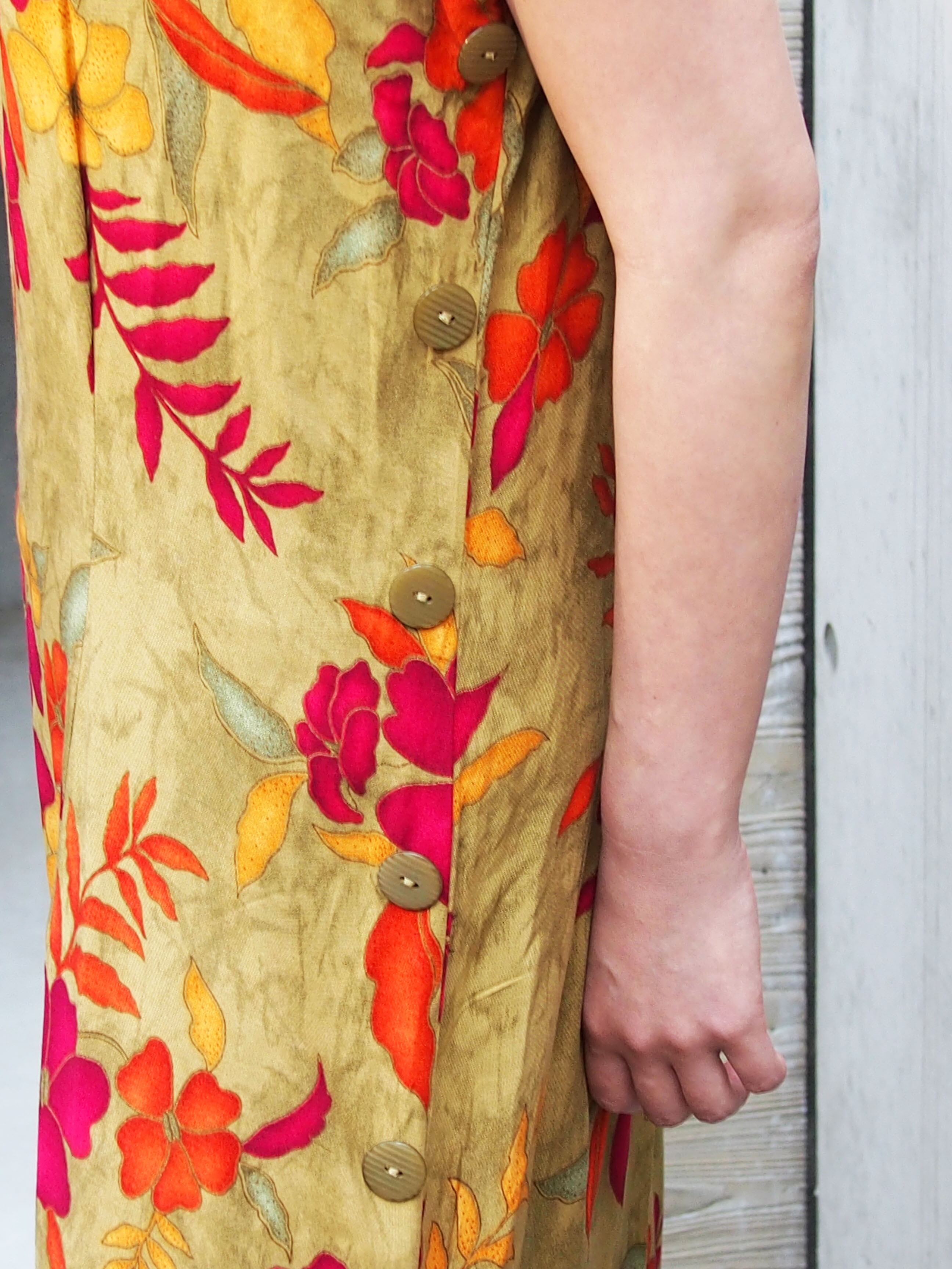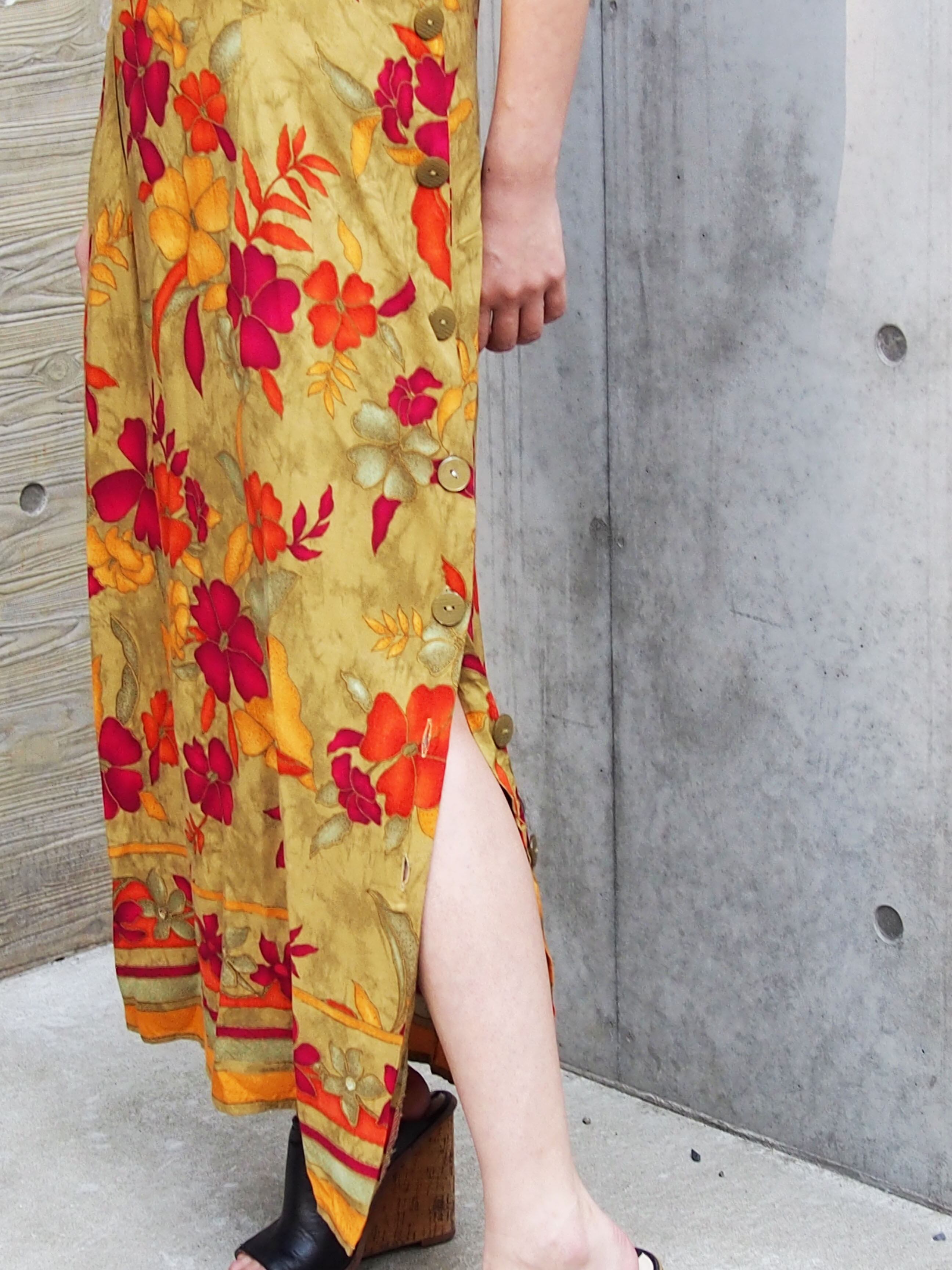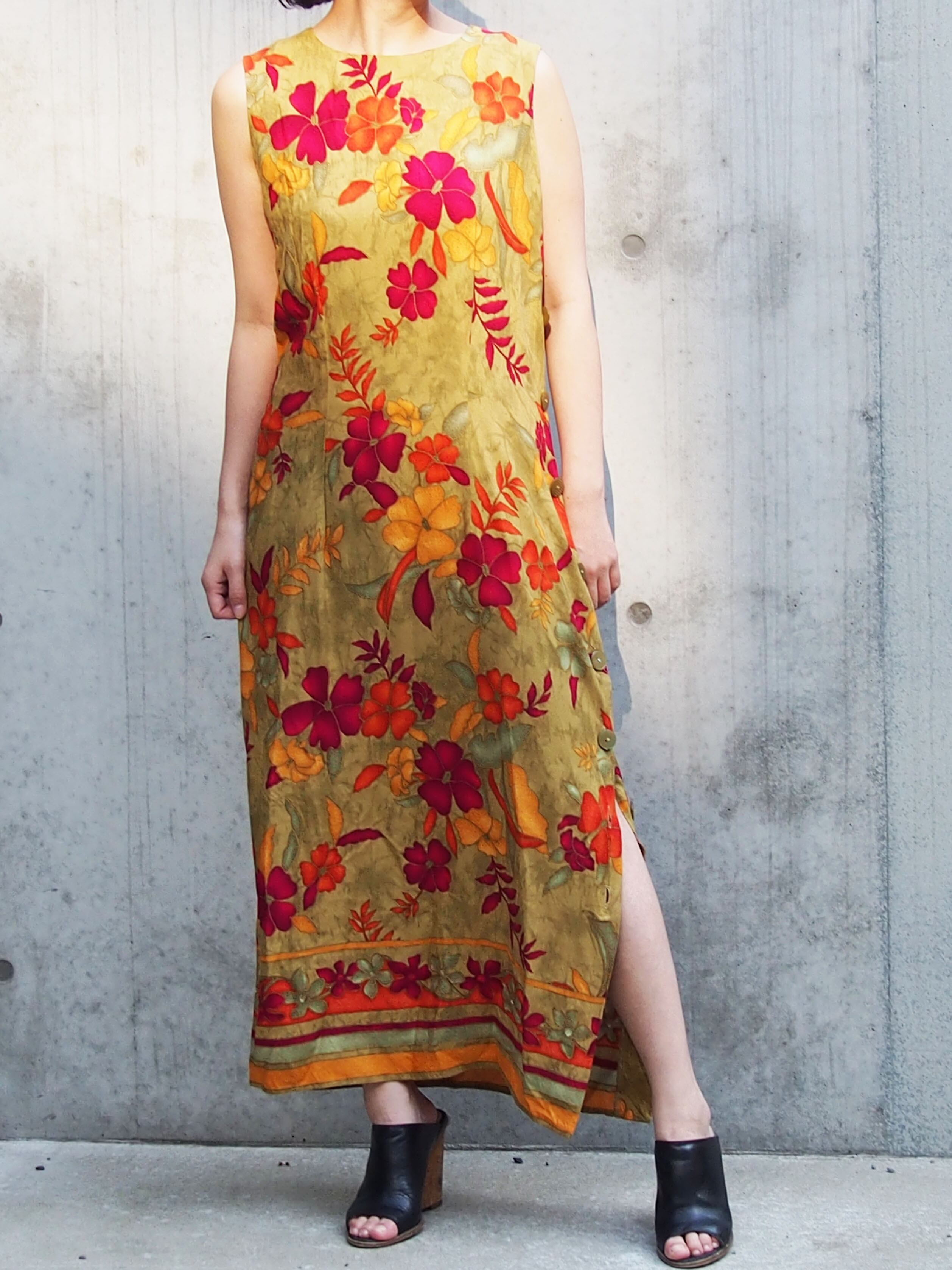 カーキのようなマスタードのような渋みのあるカラーに、花柄が映えるロングワンピースです。