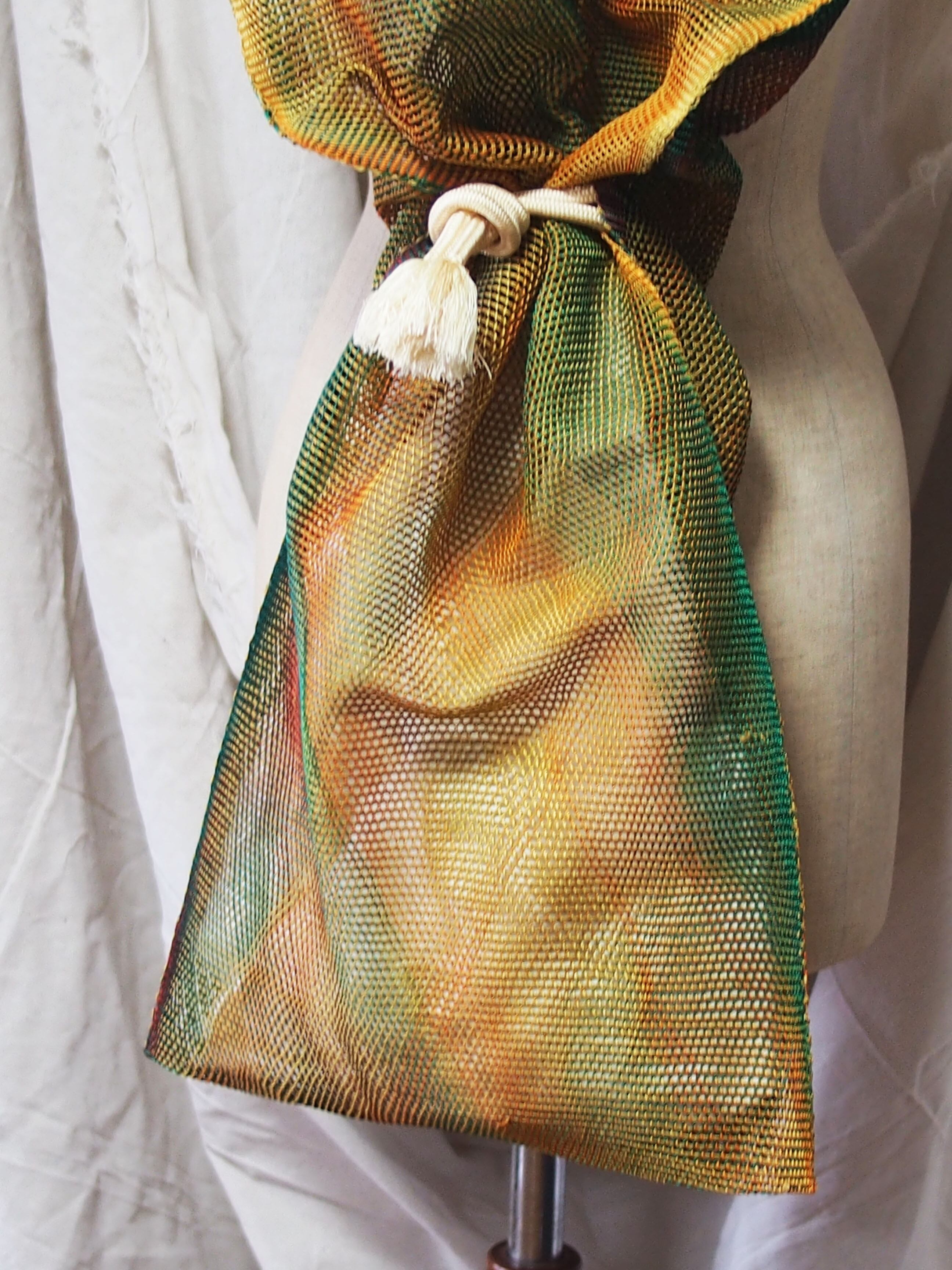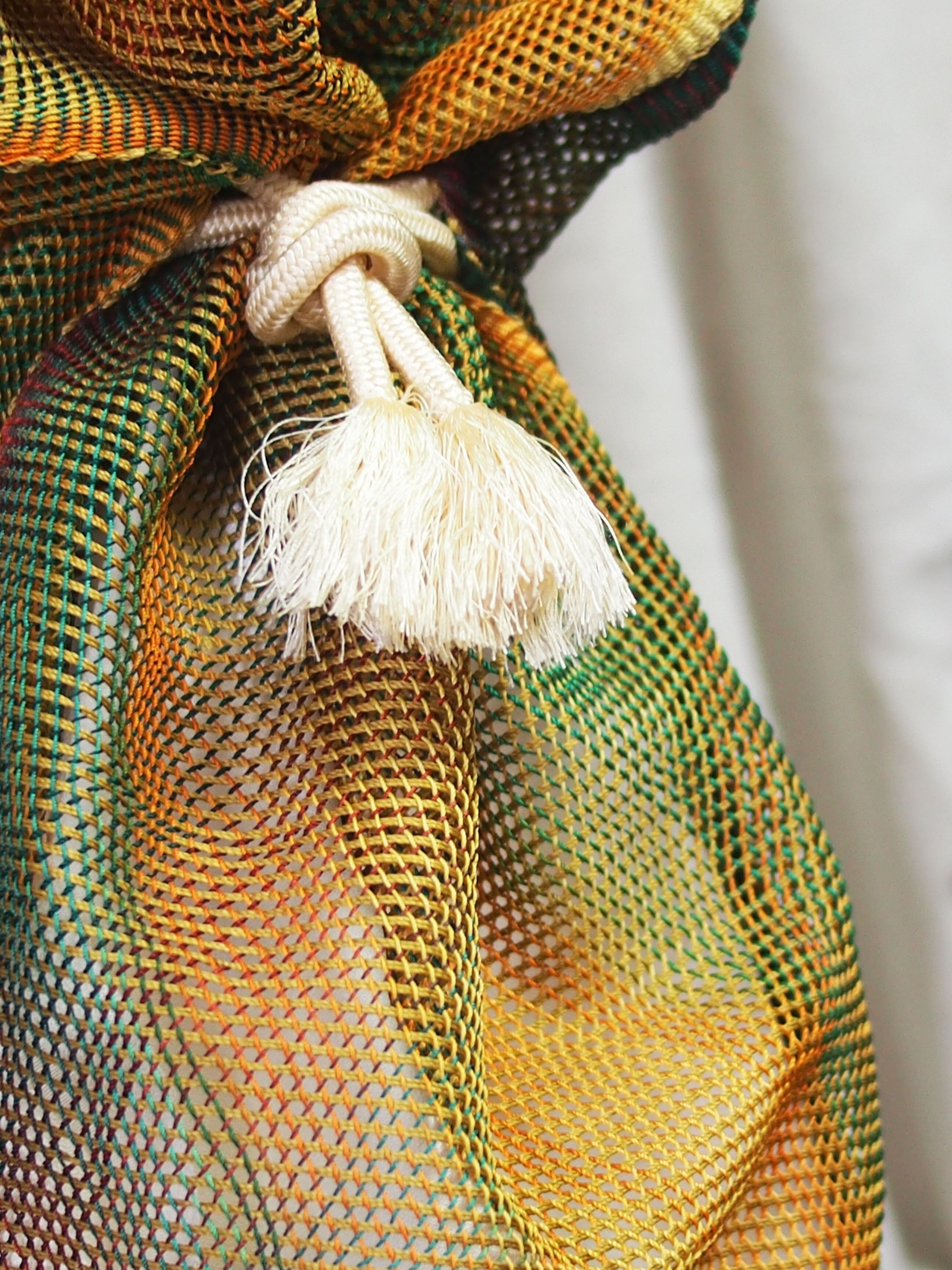 本体はメッシュ編み素材、持ち手は帯締めを使用した、A4サイズが入る実用性のある巾着バッグ。ショルダーとしても使用可能2WAYタイプ。