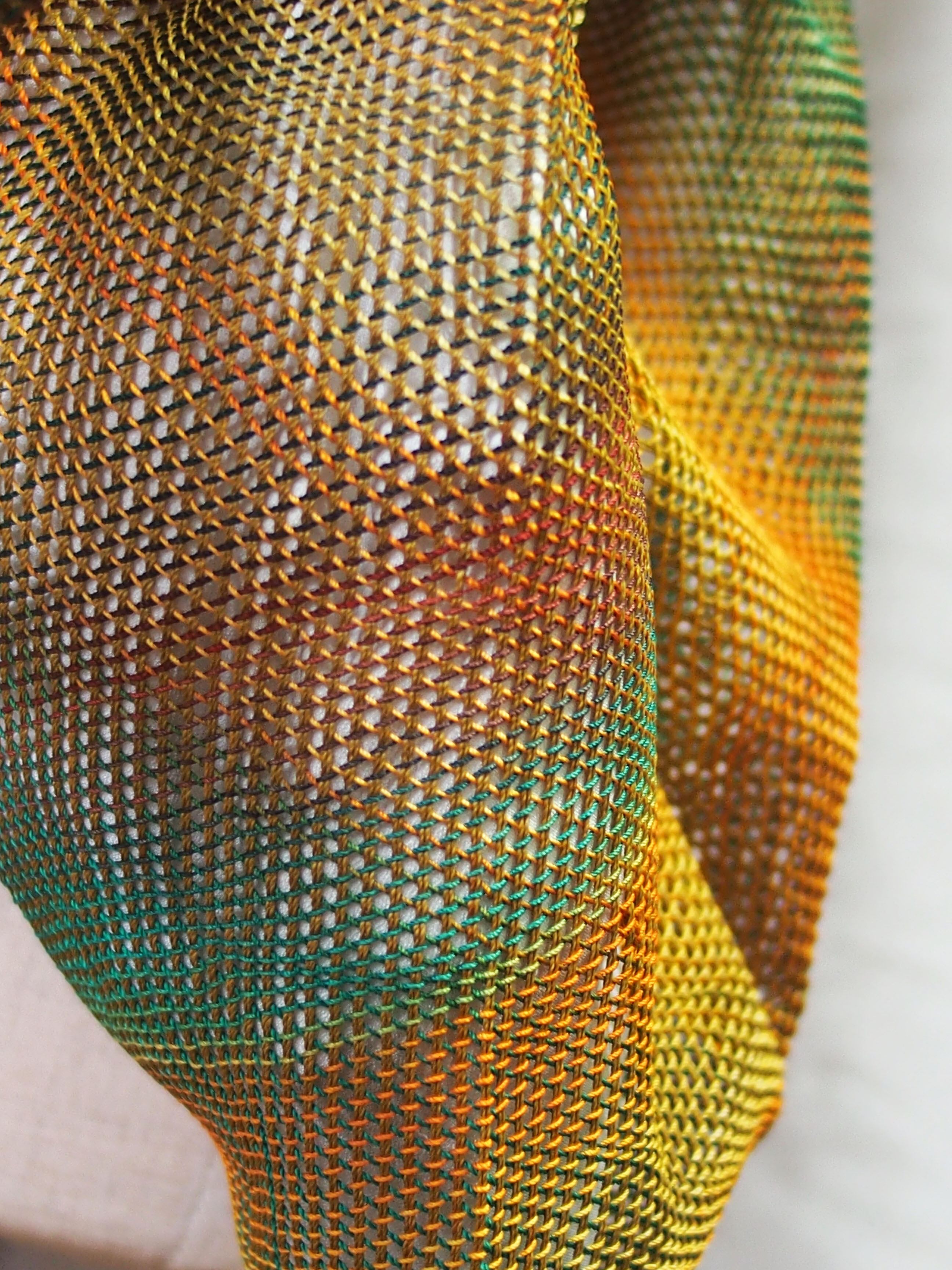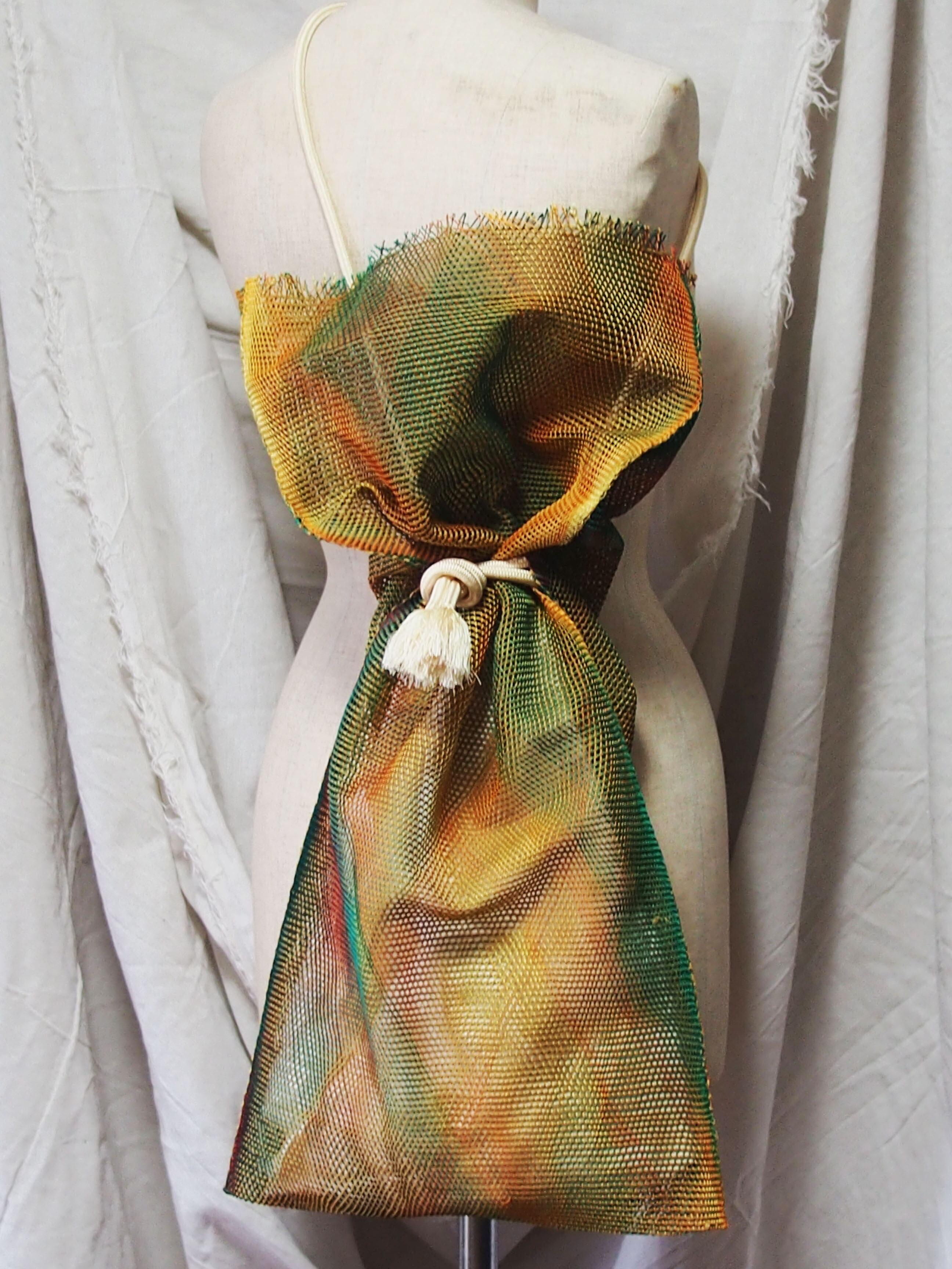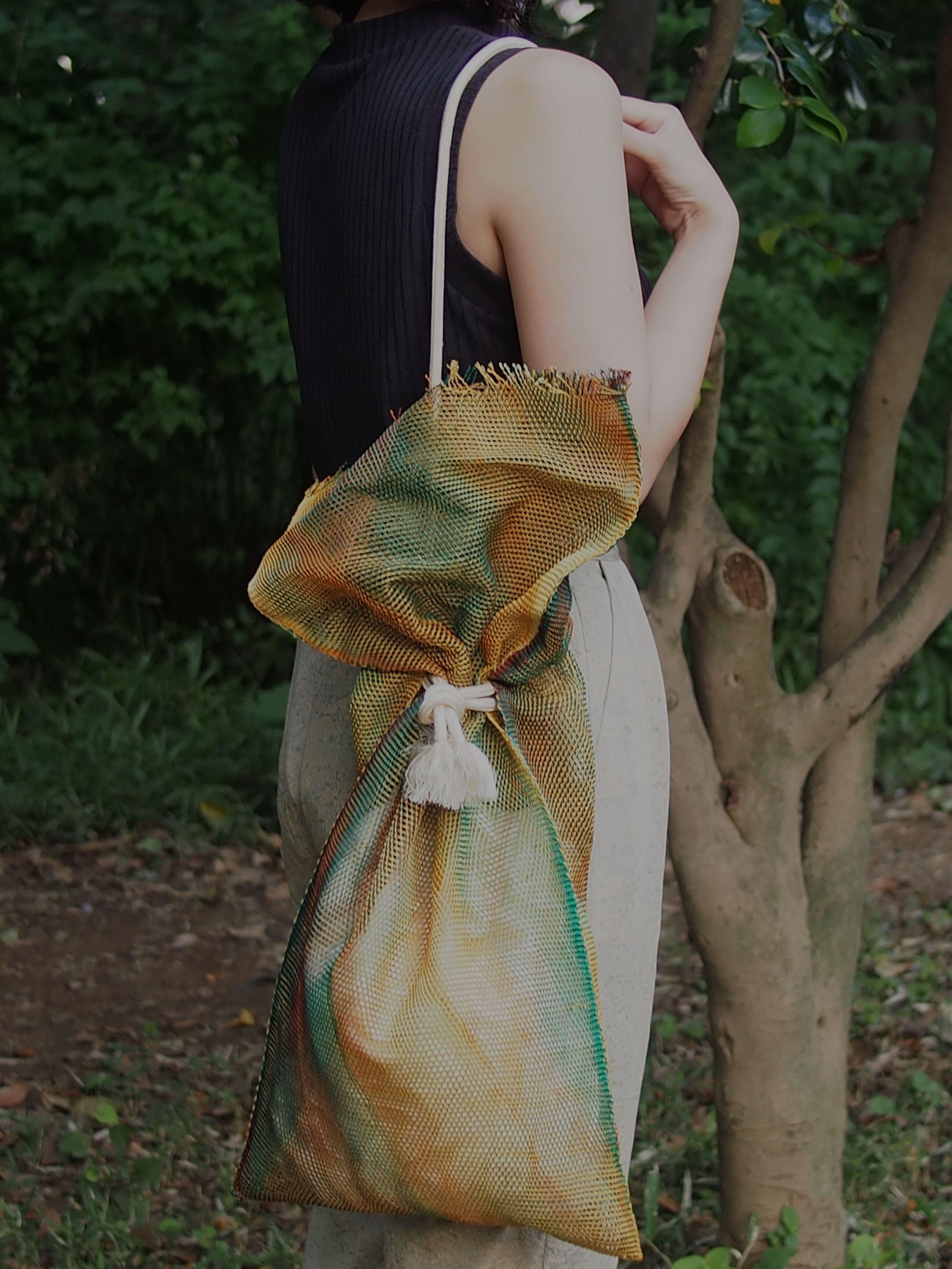 メッシュの素材感と巾着型、また持ち手の素材感が、一点物の雰囲気を漂わせます。