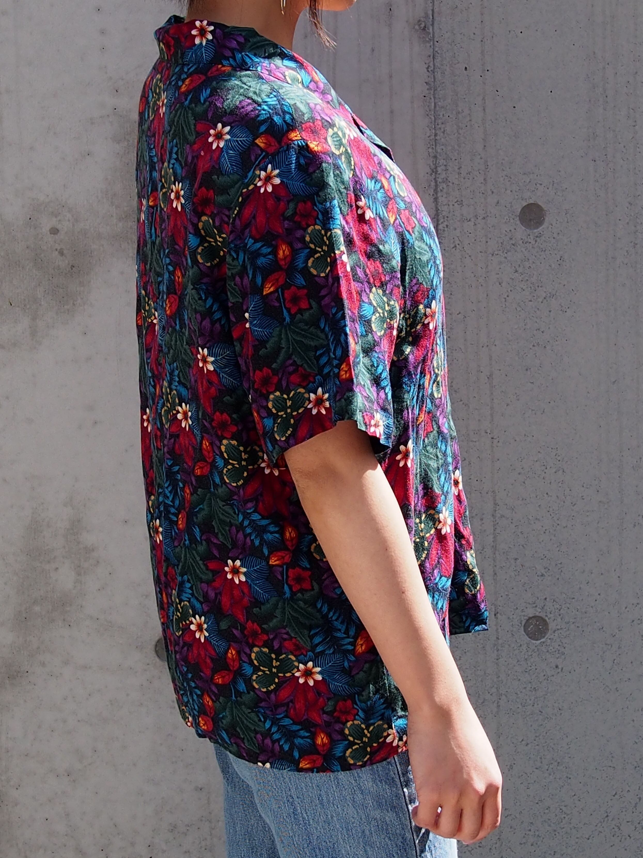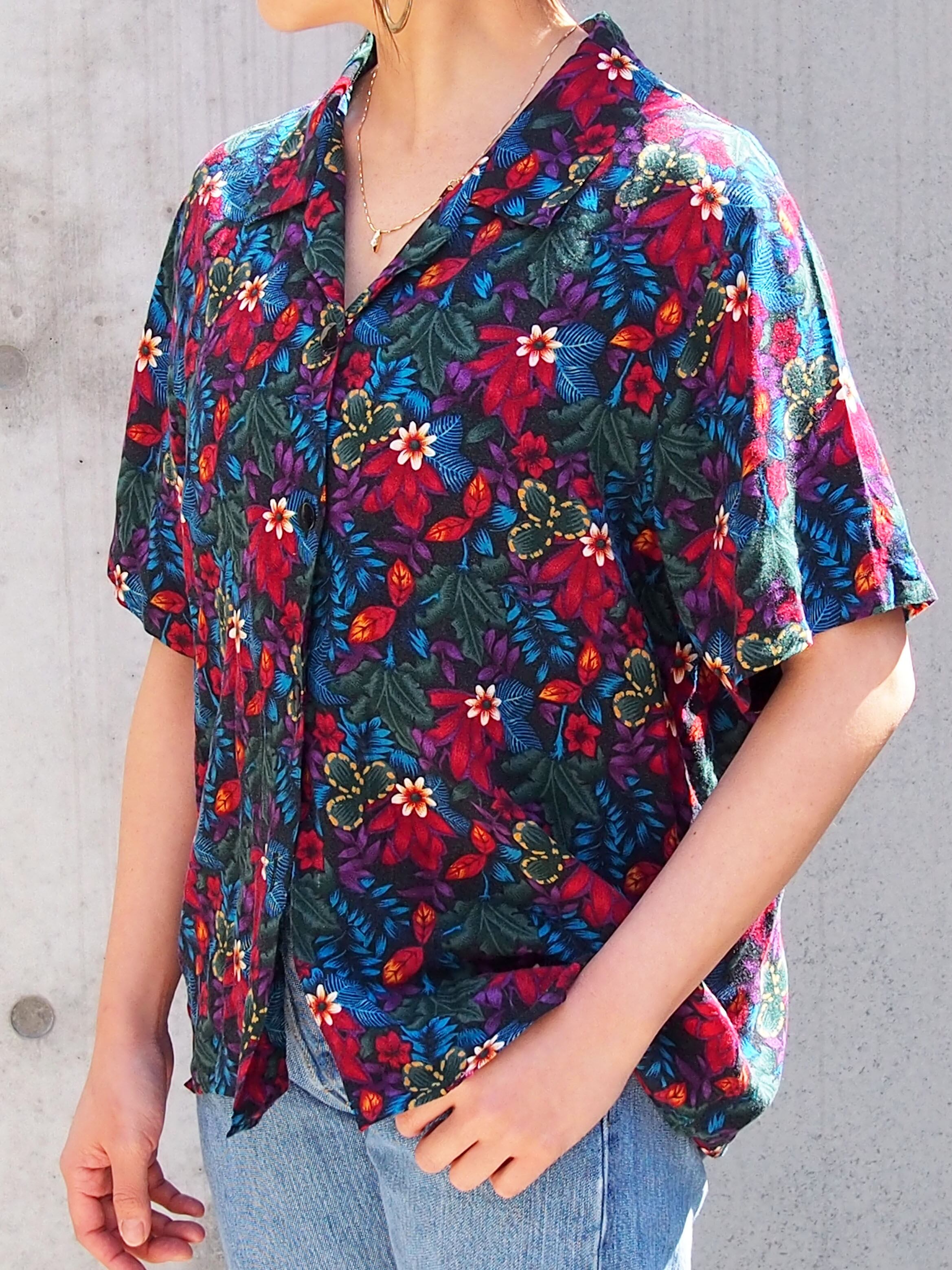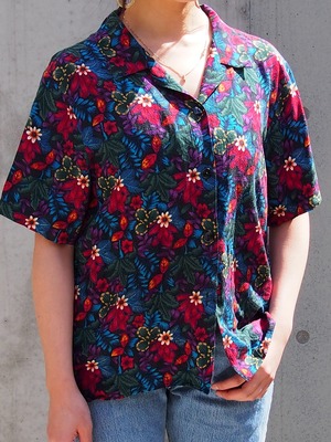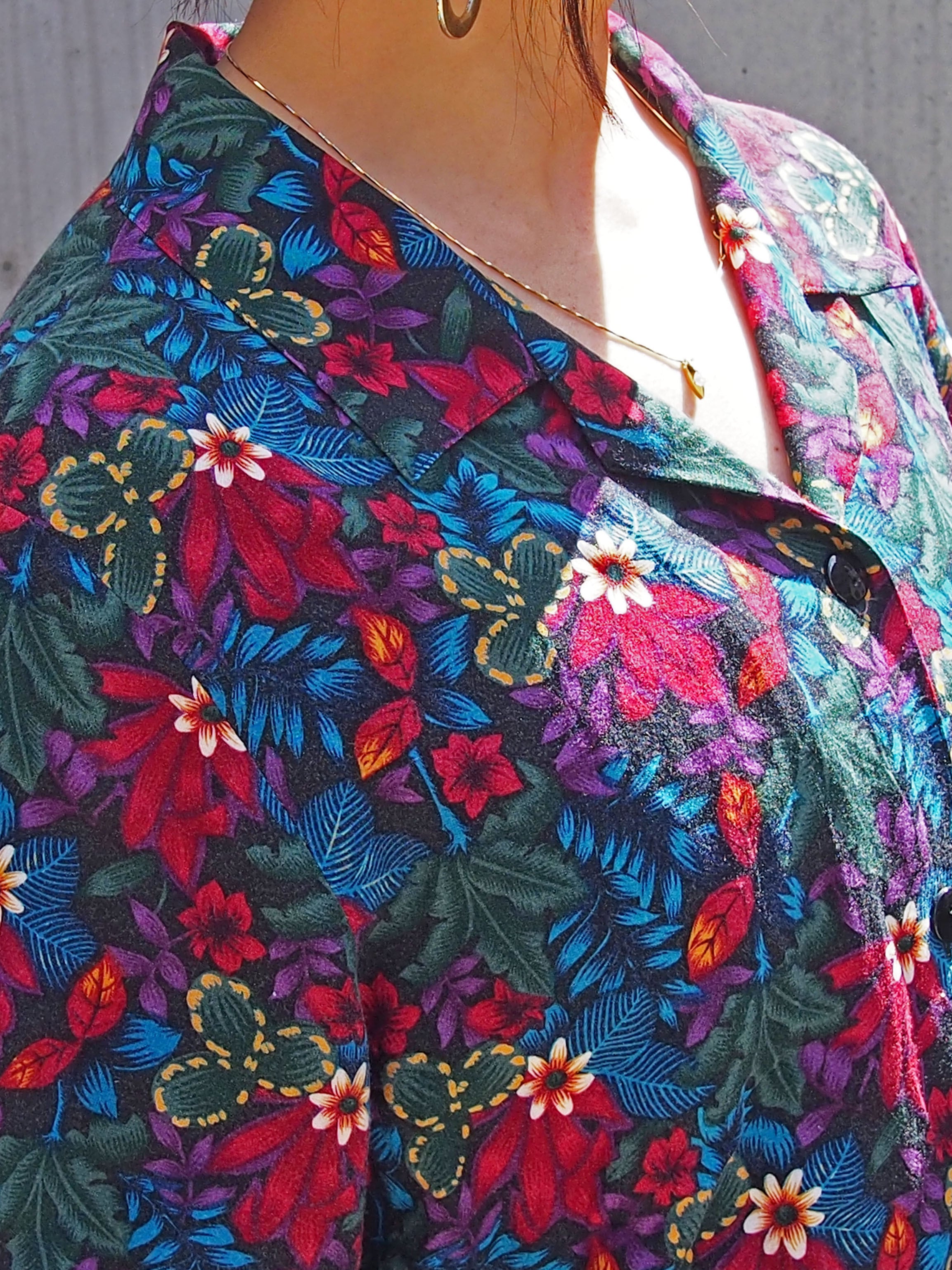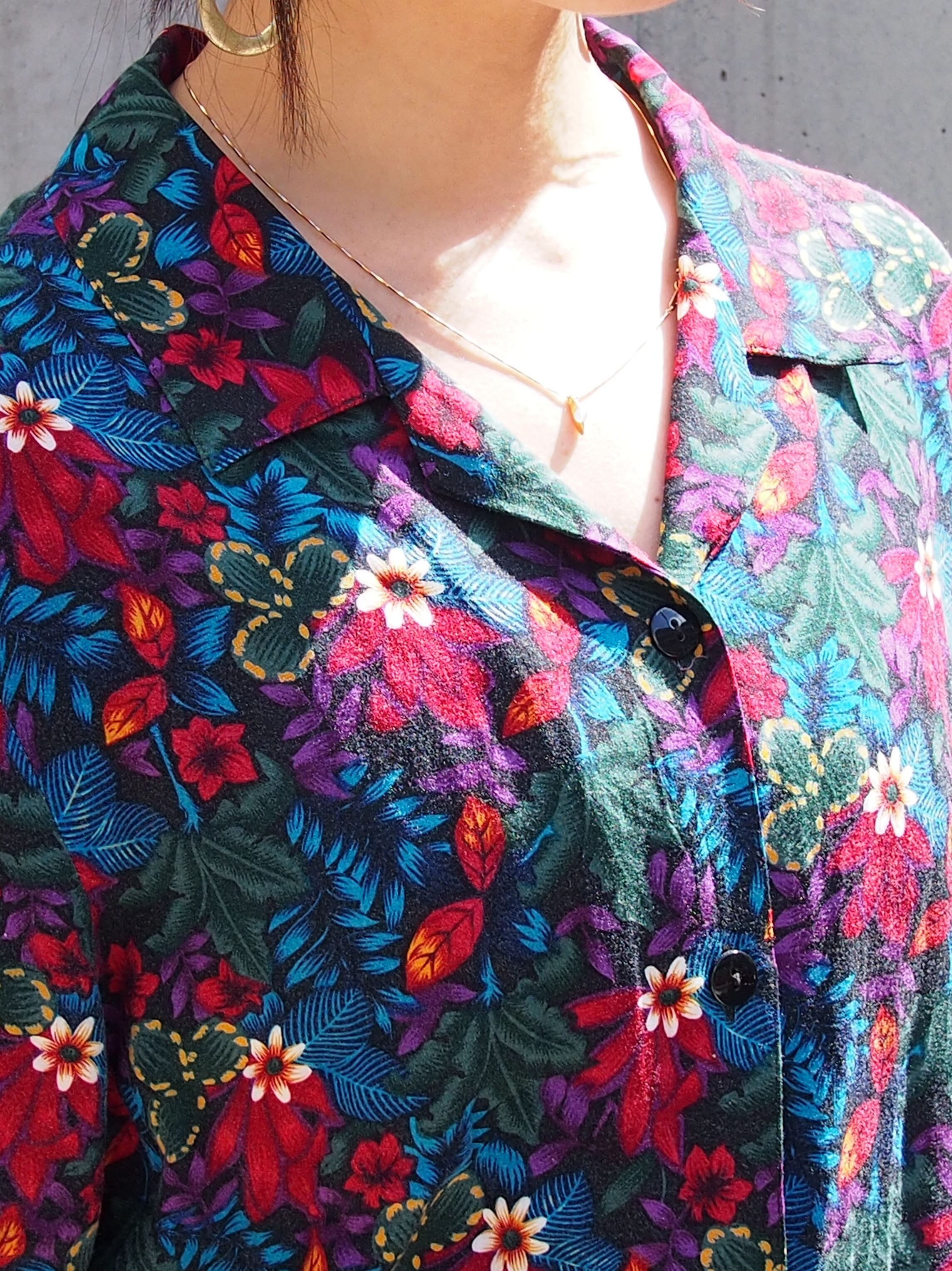 トロピカルな花柄が目を引くブラウスの入荷です。