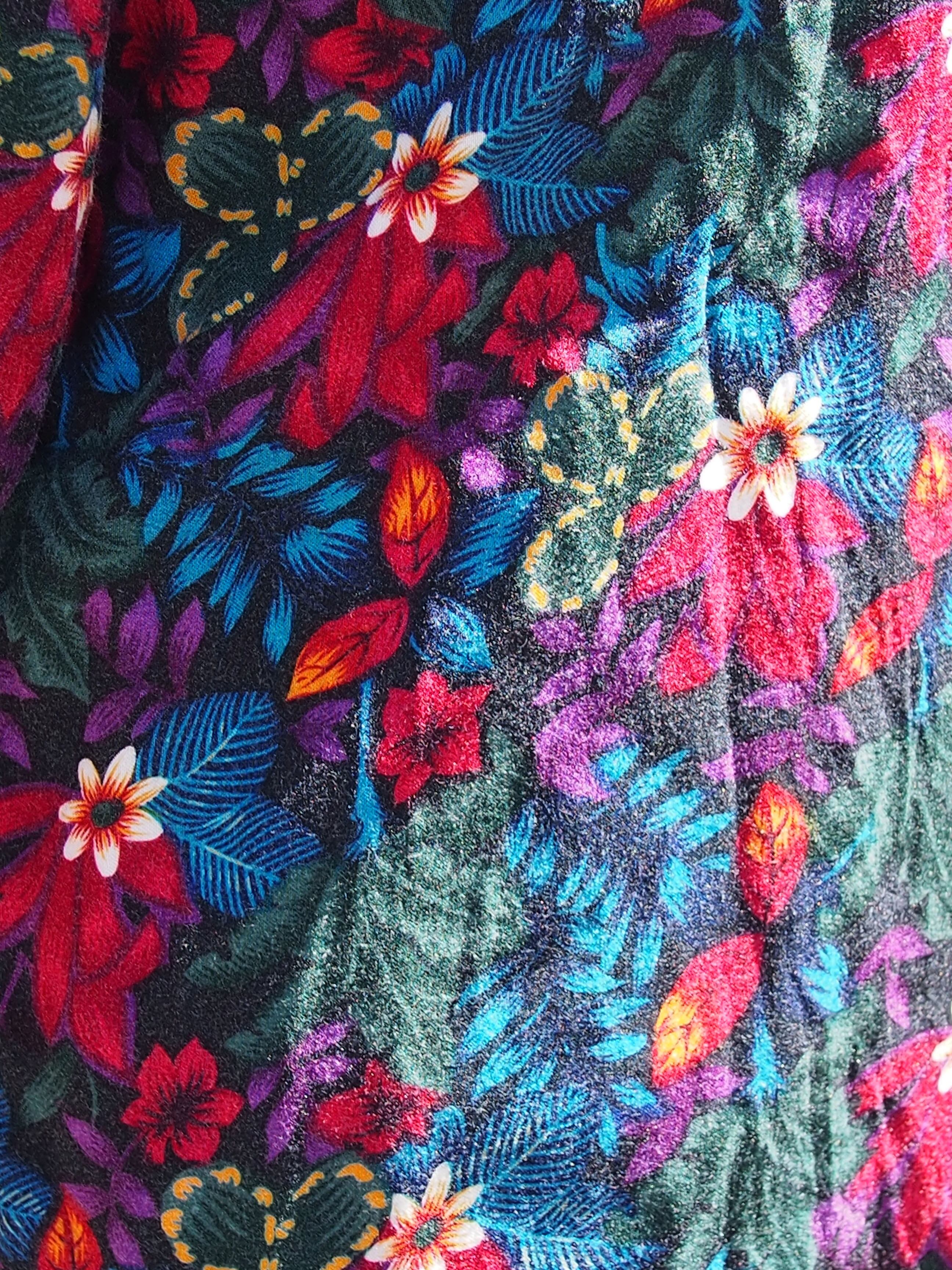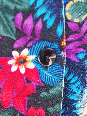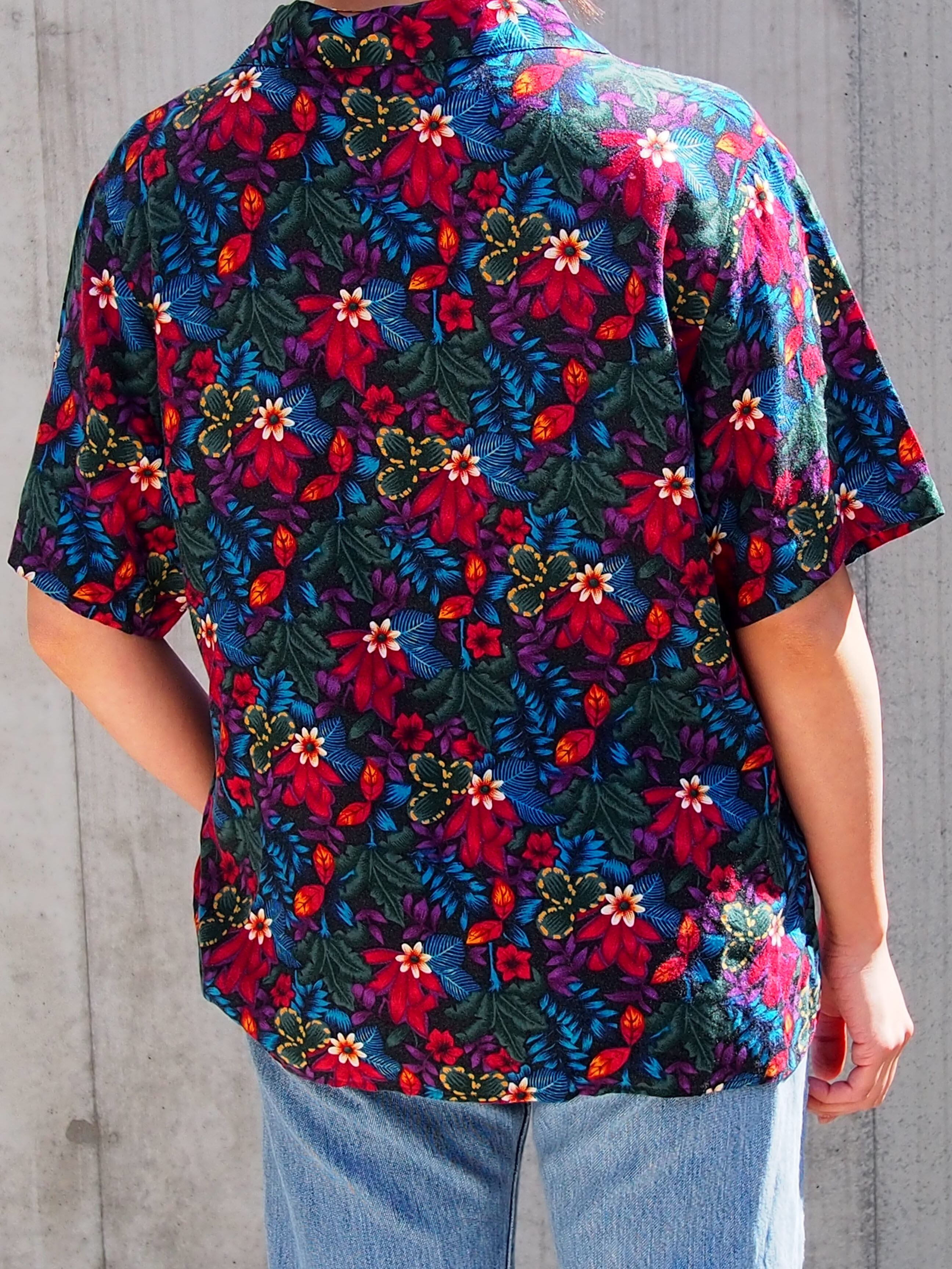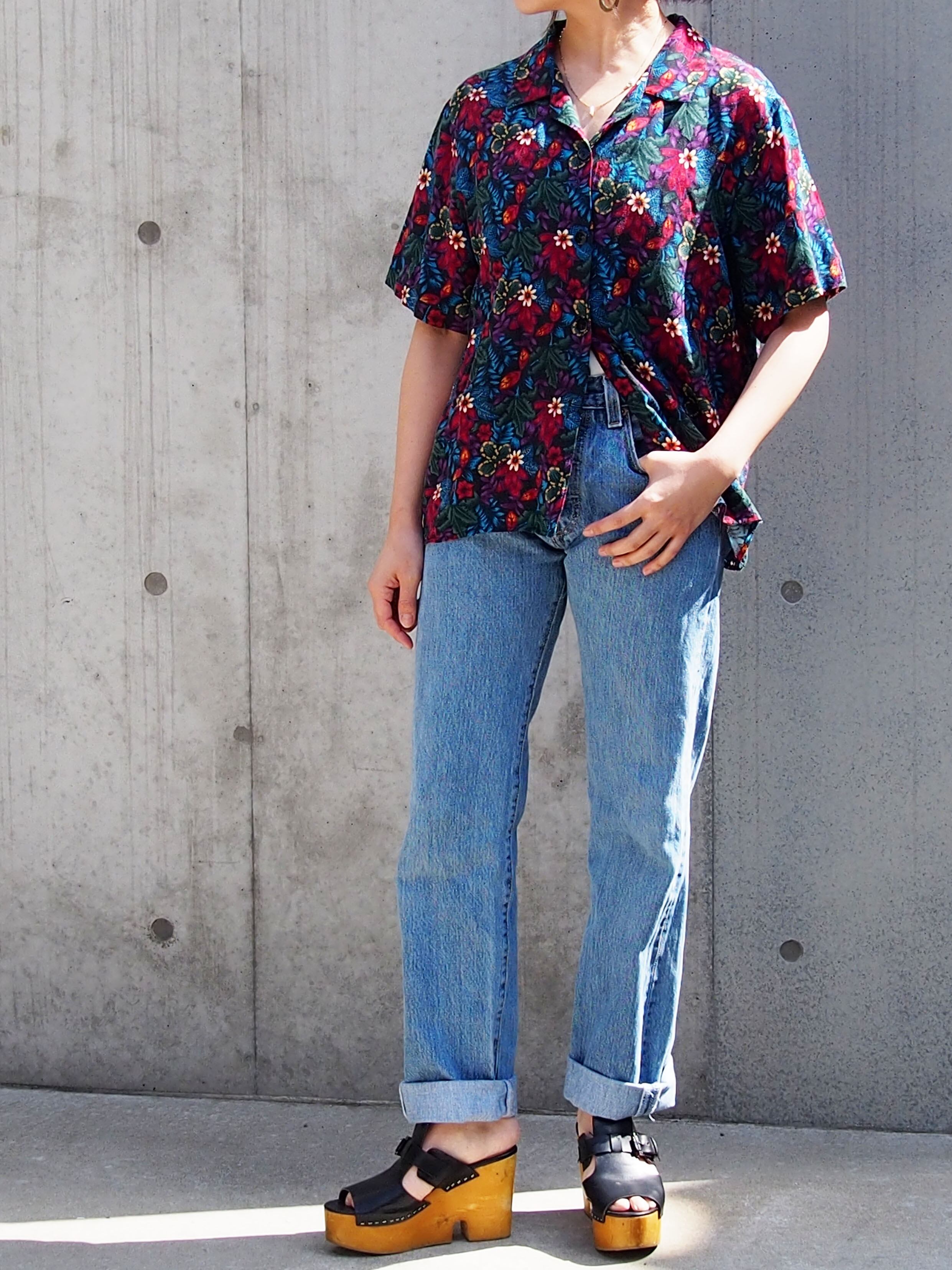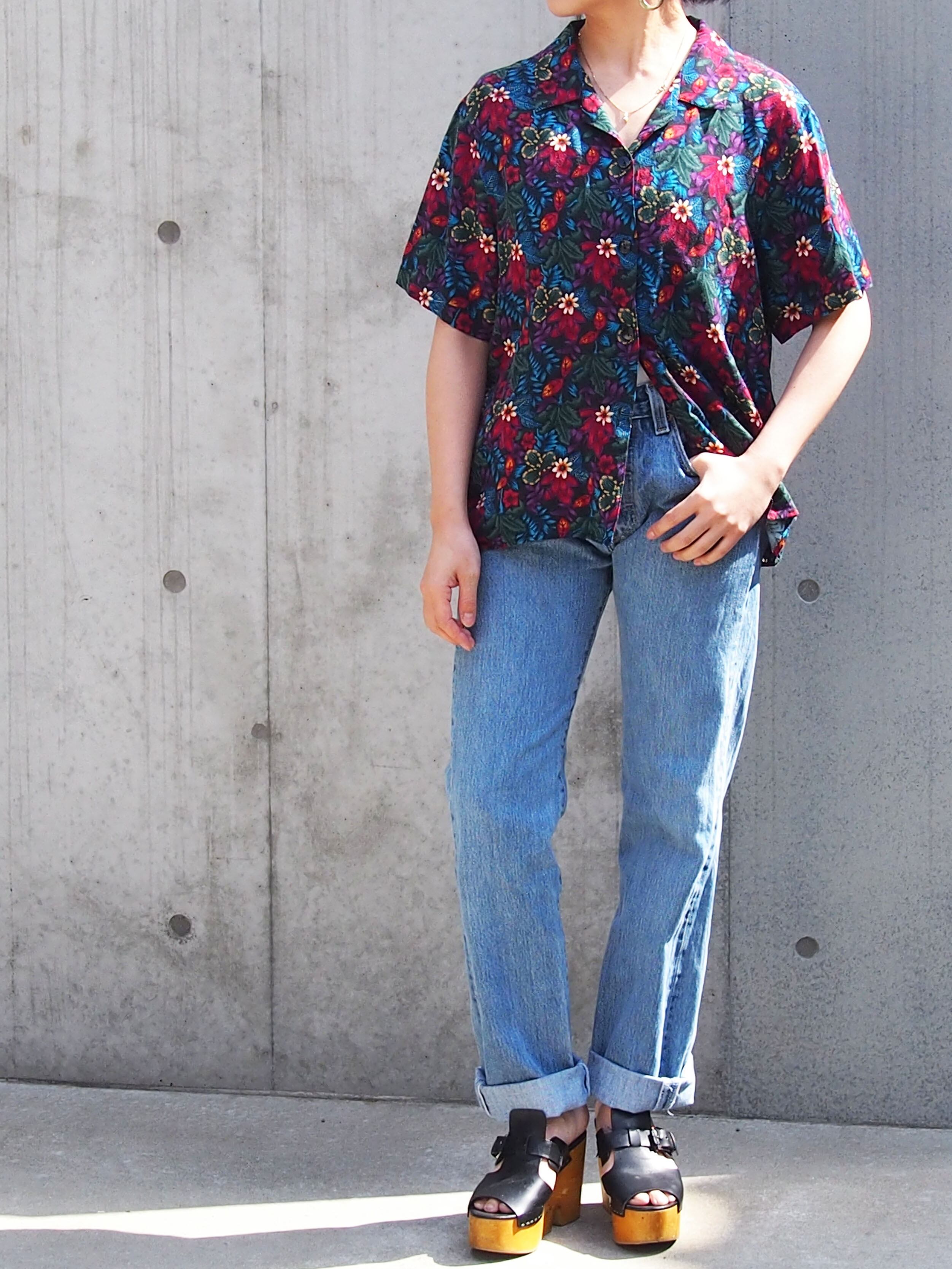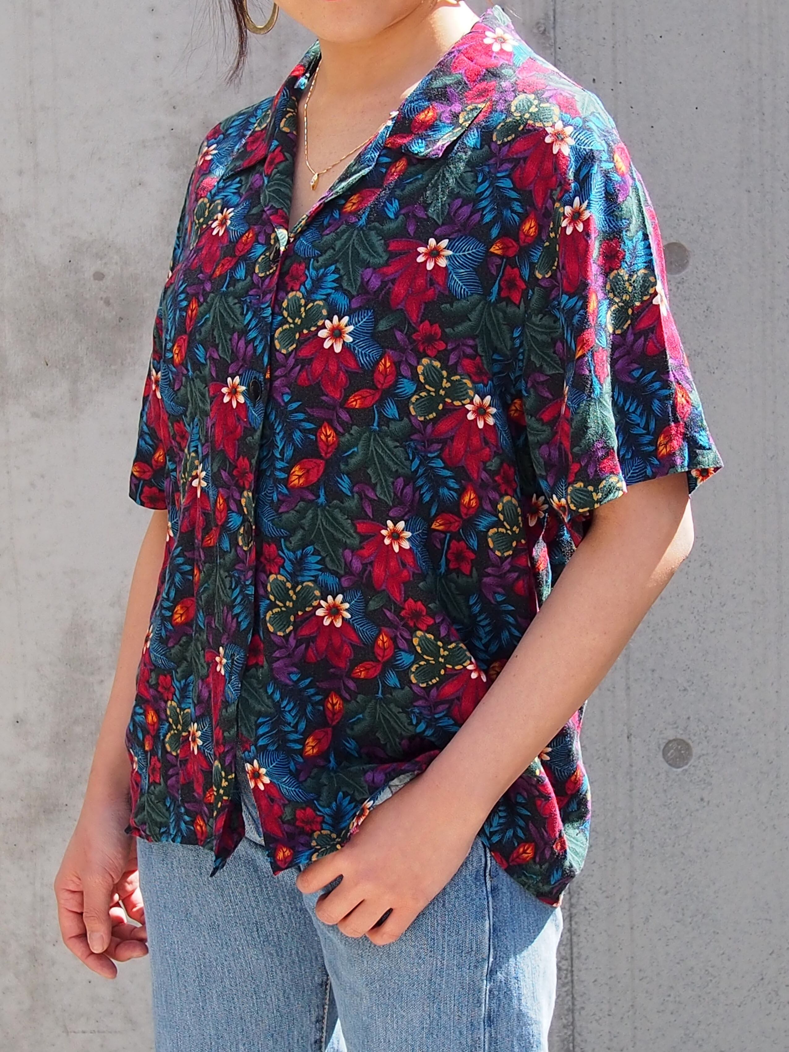 トロピカルな花柄が目を引くブラウスの入荷です。