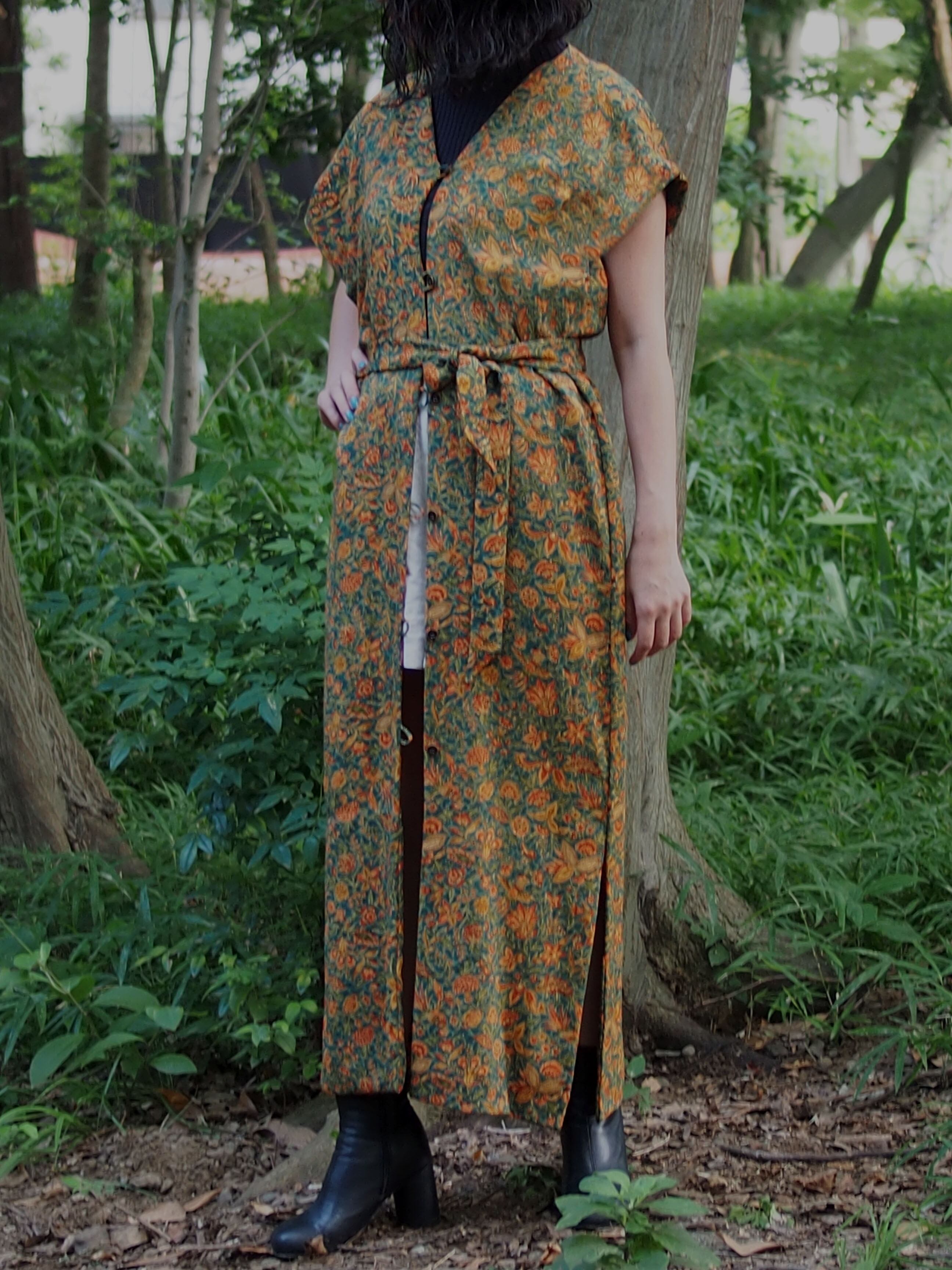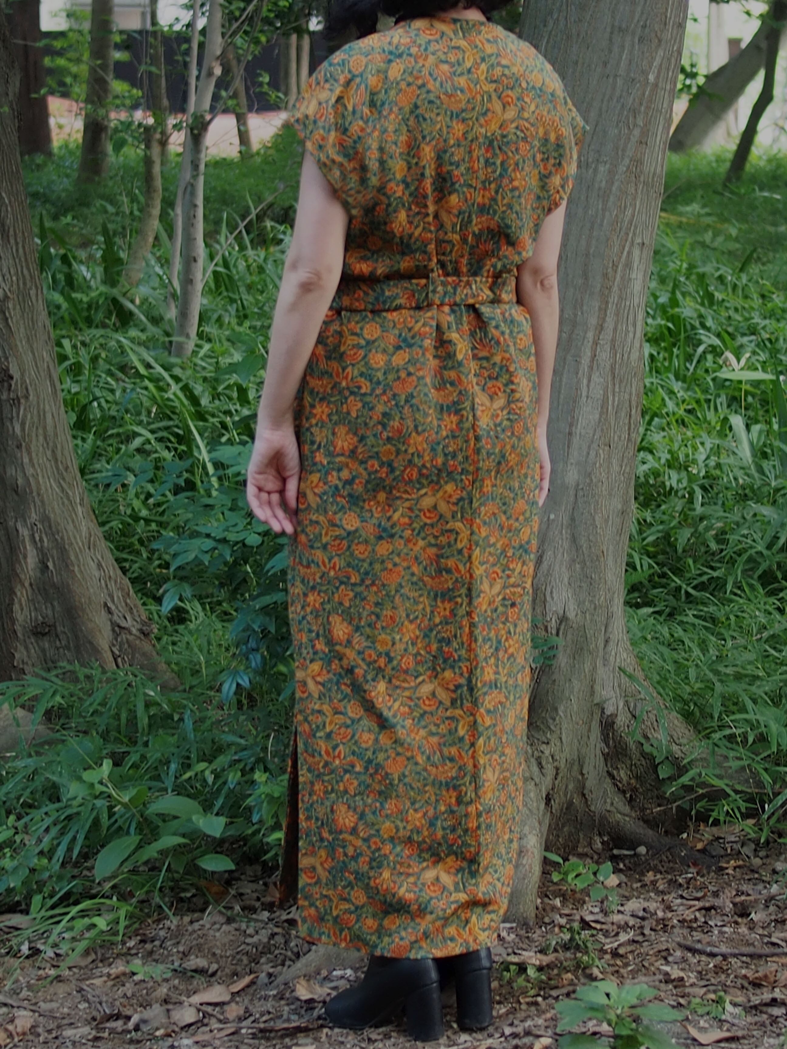 グリーンとイエローの柄生地がとても映え、柔らかなさらっとした素材感もワンピースとして着心地抜群です。