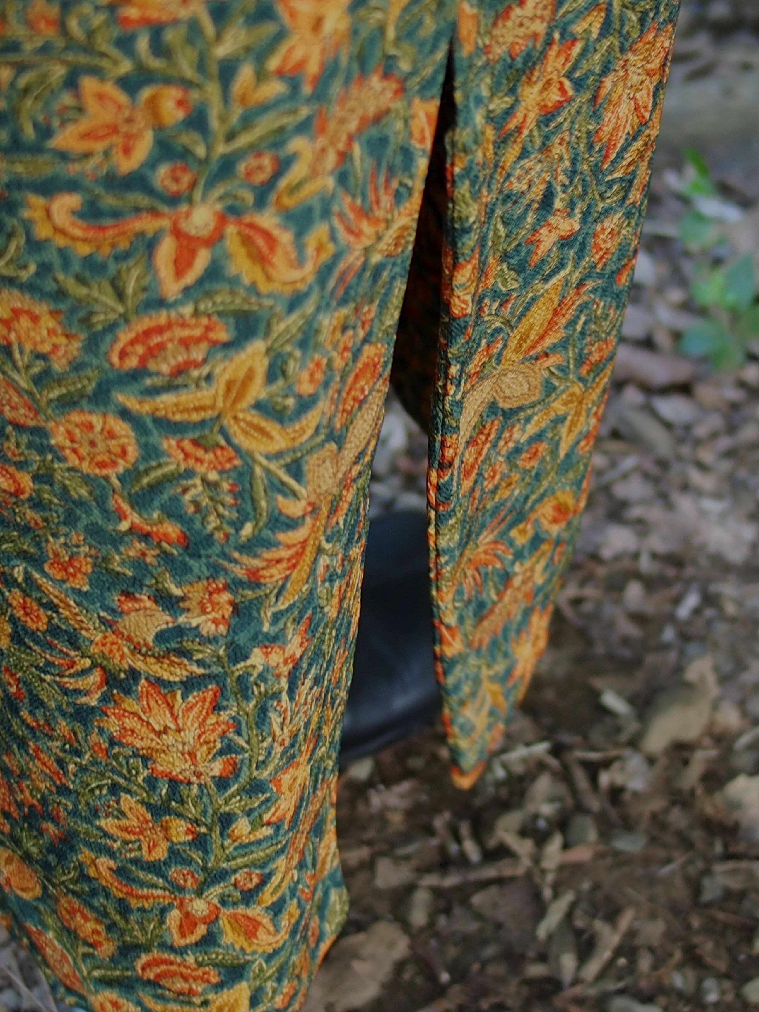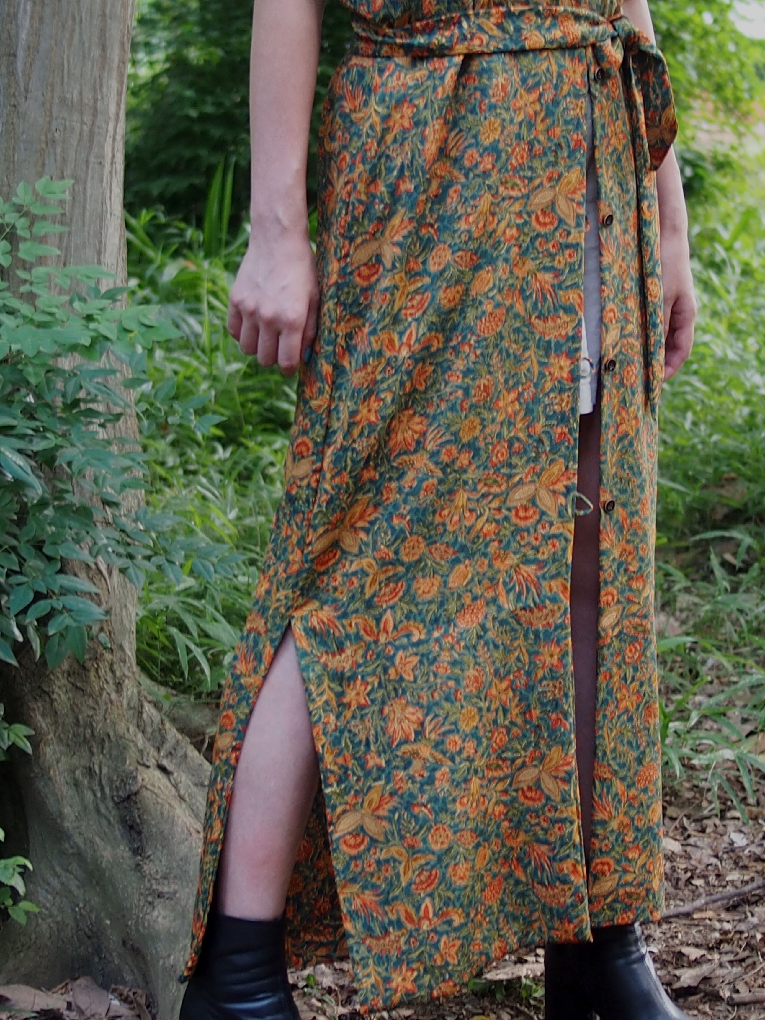 着物生地をたっぷり使用した、花柄ロングドレス。