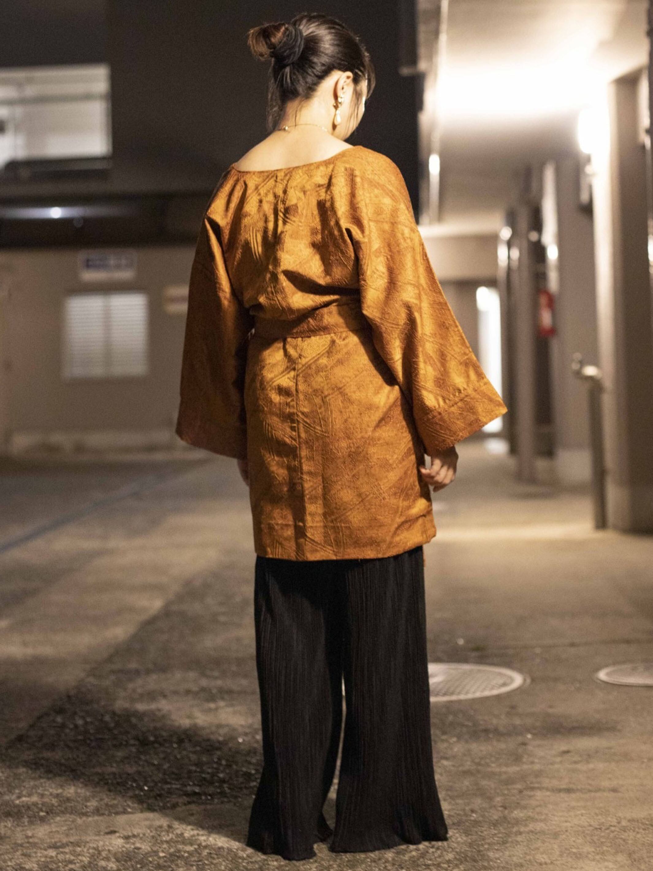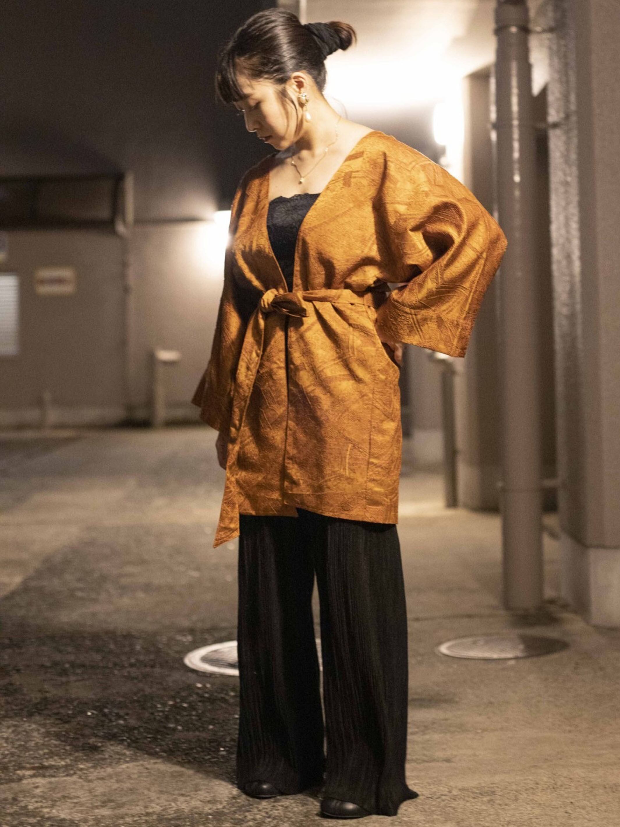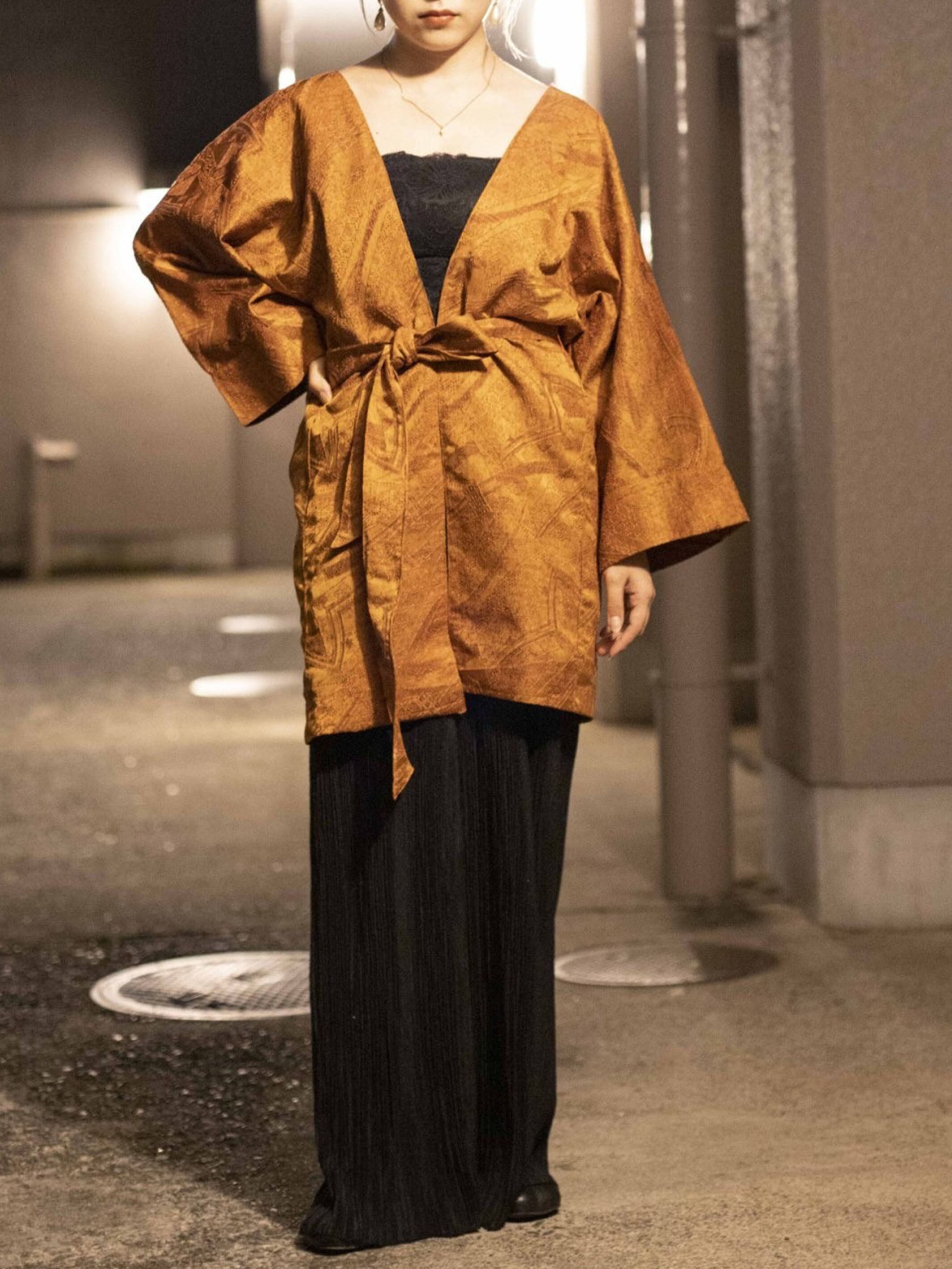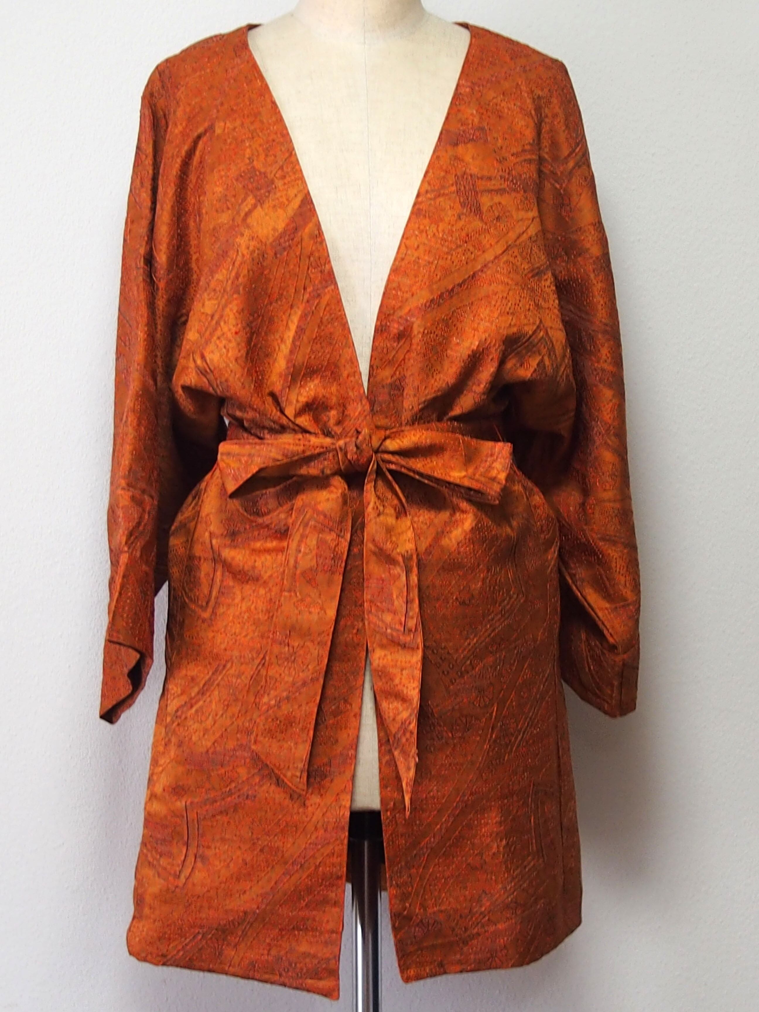 刺繍の入ったオレンジのしっかりと張りのある少し光沢がかった生地がとても目を引きます。