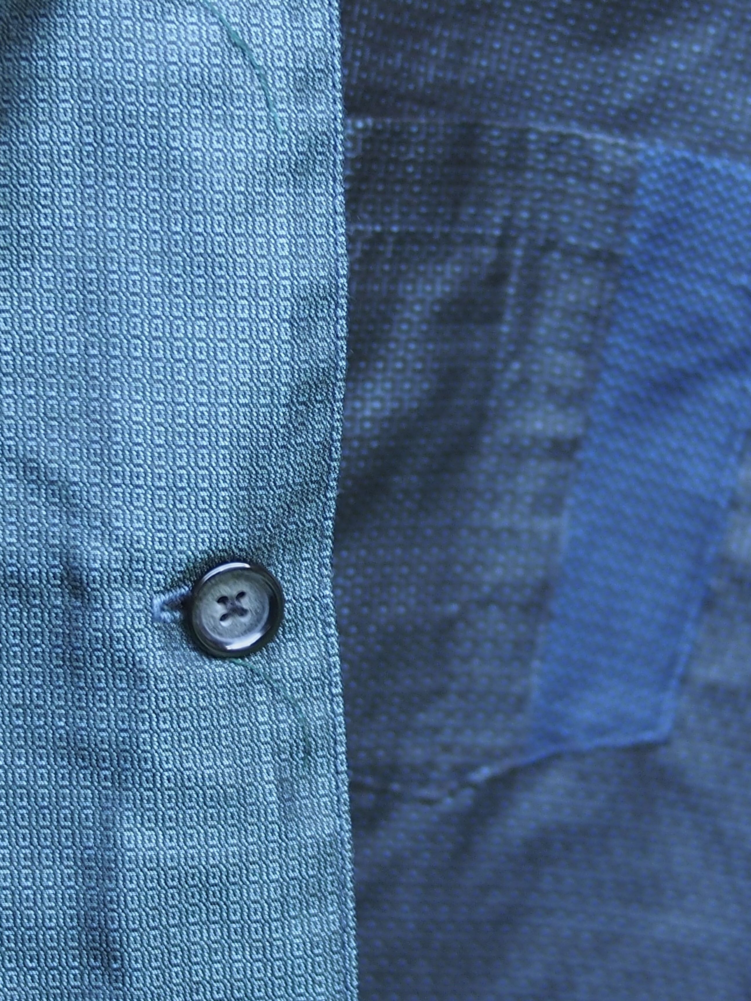 3パターンのシルク着物生地を使用した、贅沢な上質なパッチワークシャツ。