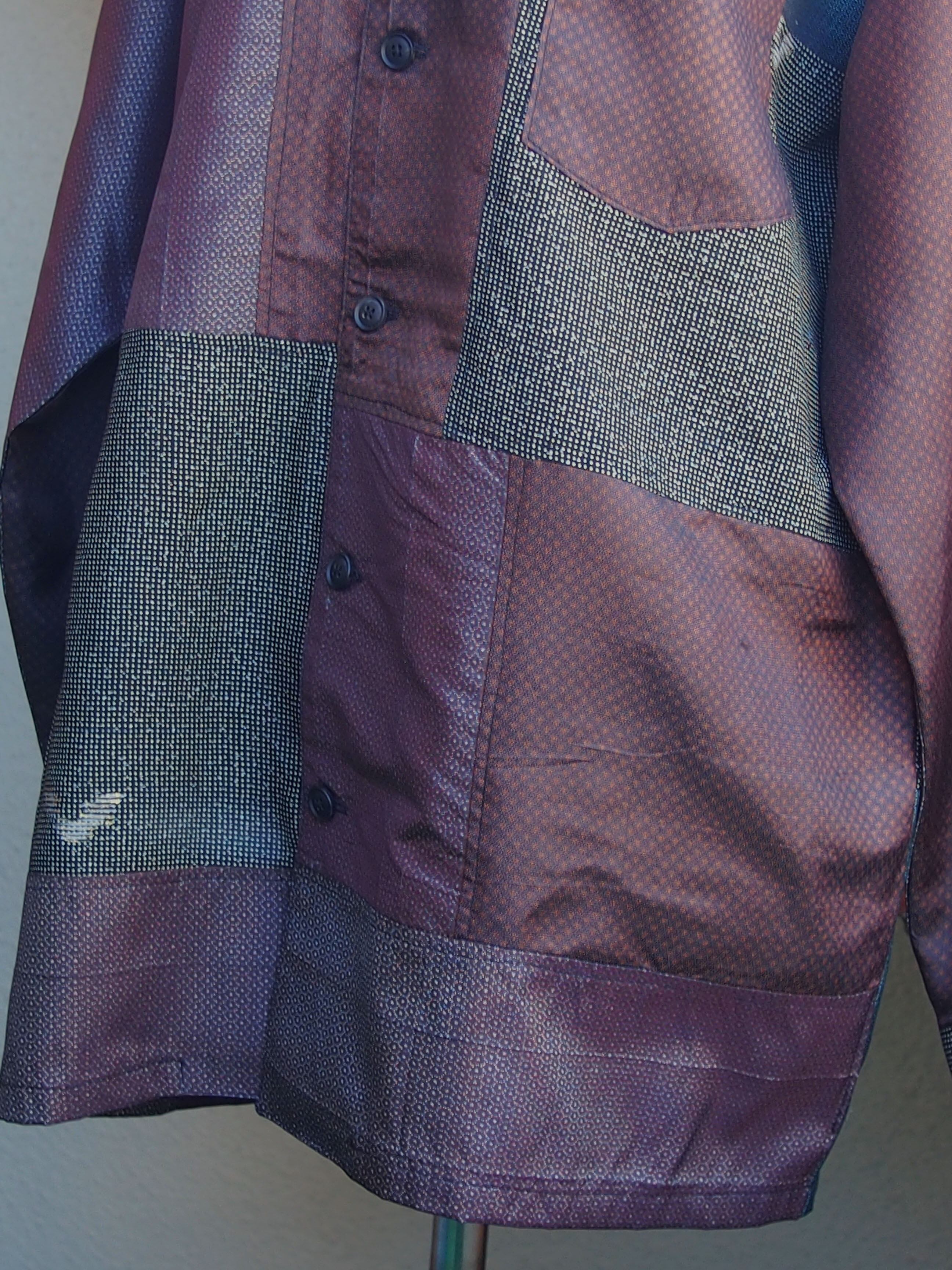 カラーはワインレッド・ブラックの生地をベースに、グリーン・ブラウン系カラーを使用しております。オーバーシャツのルーズなシルエットはご好評いただいており、今回は襟元デザインをステンカラーにて制作しております。