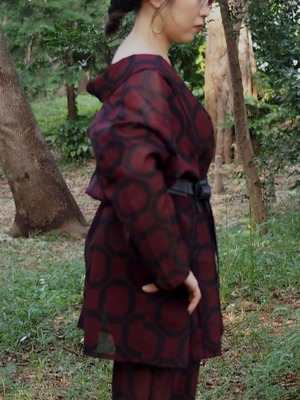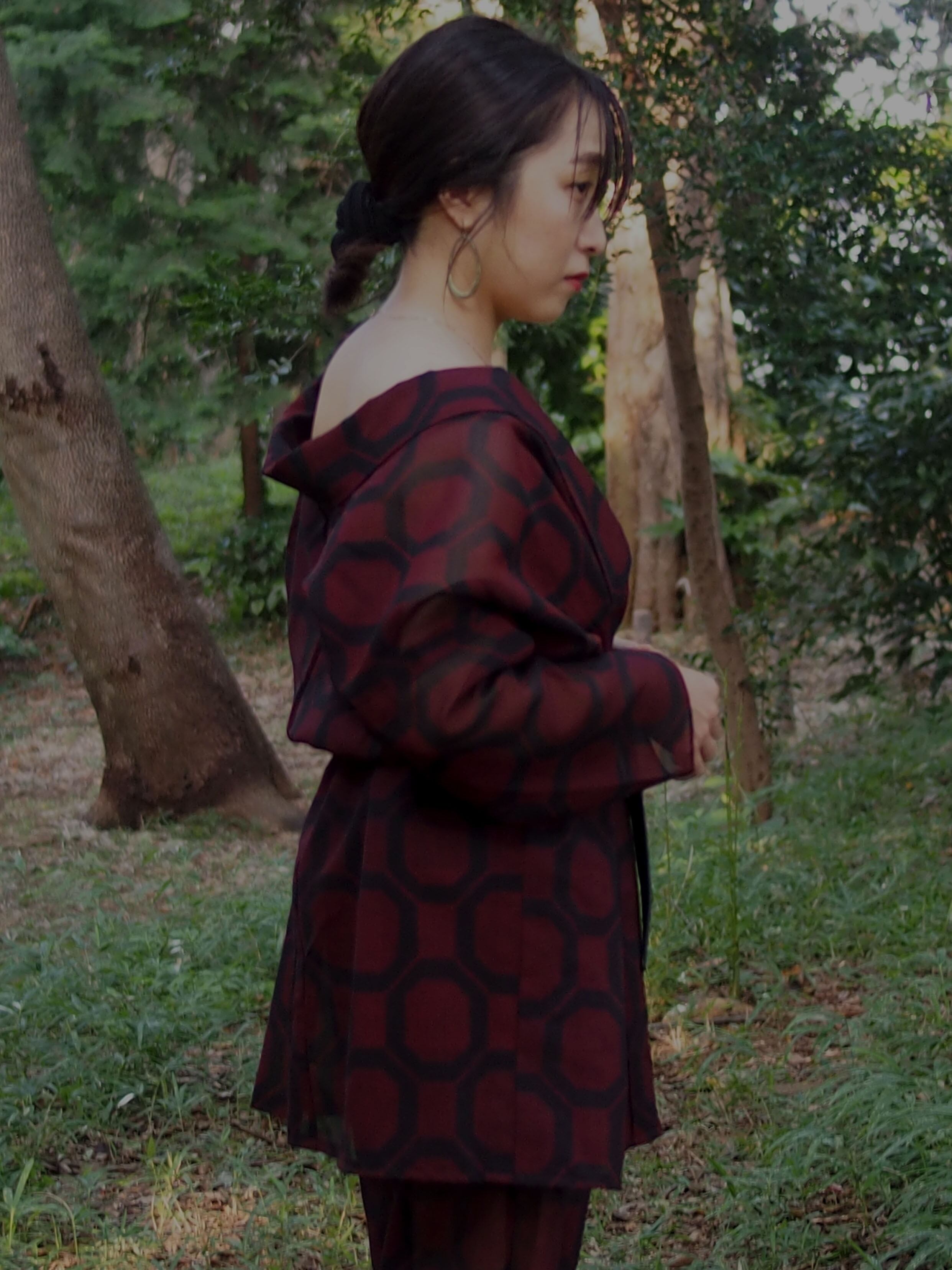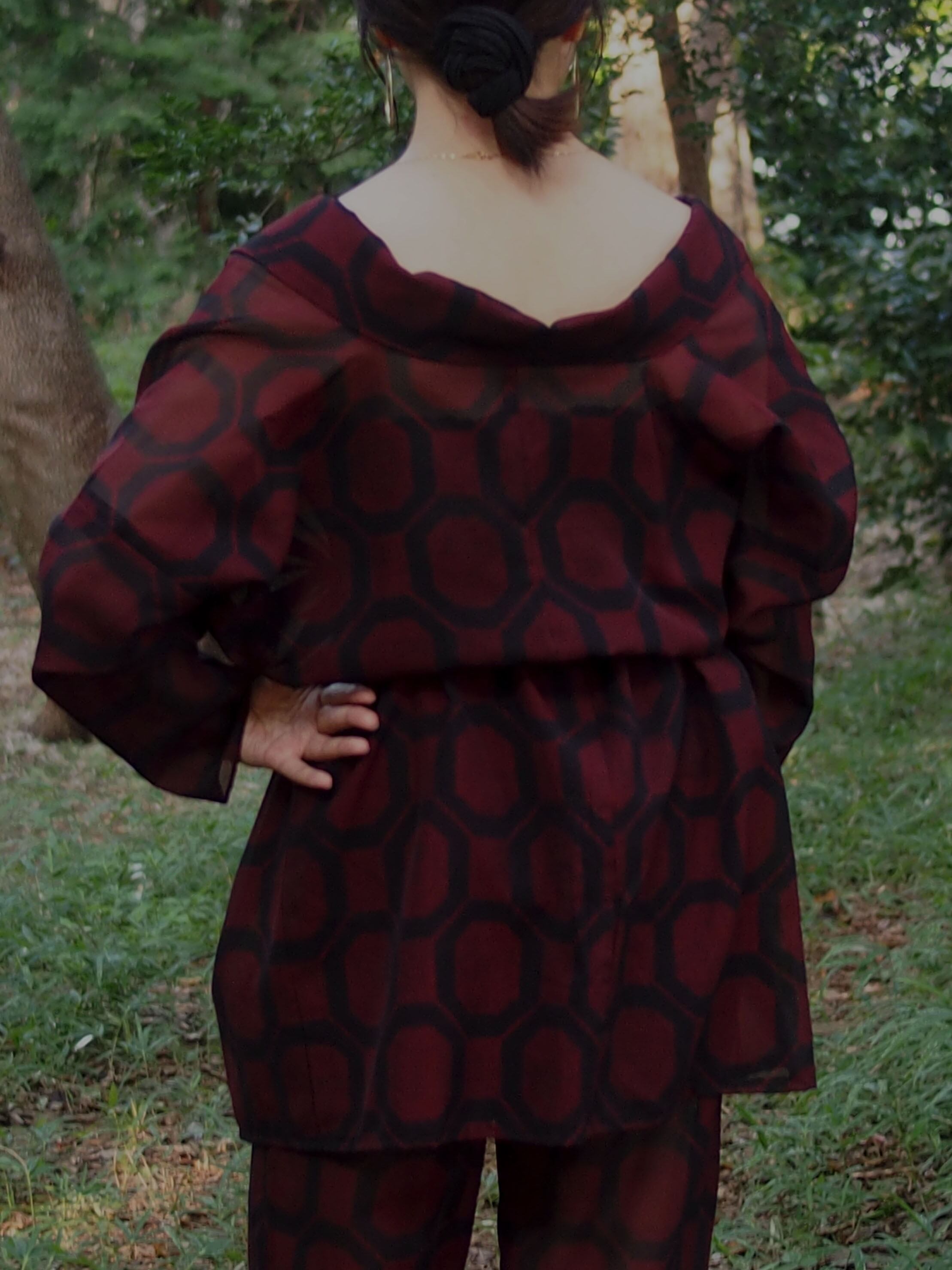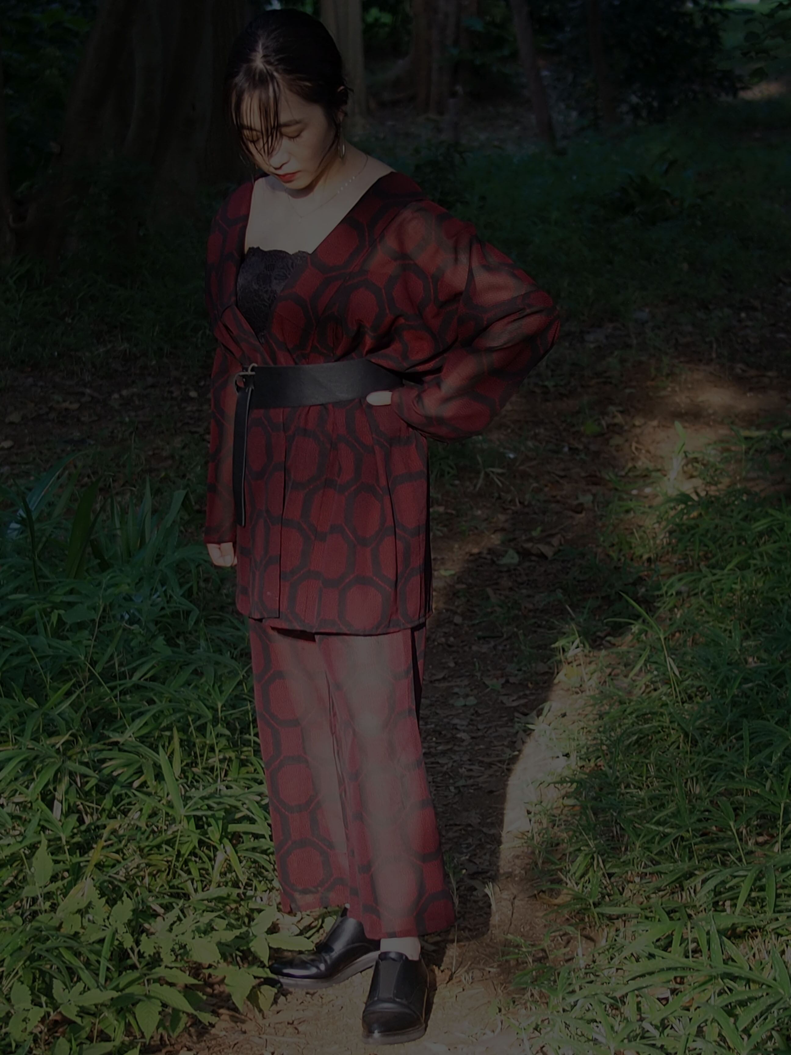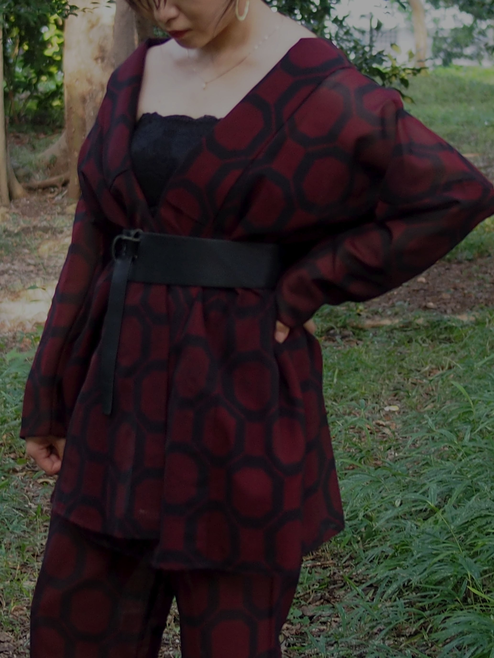 ワインレッドに大判の柄生地がシースルーに透け、なんとも素敵で深みのあるヴィンテージ感を漂わせます。モードな雰囲気で着こなせるお洒落な一枚です。